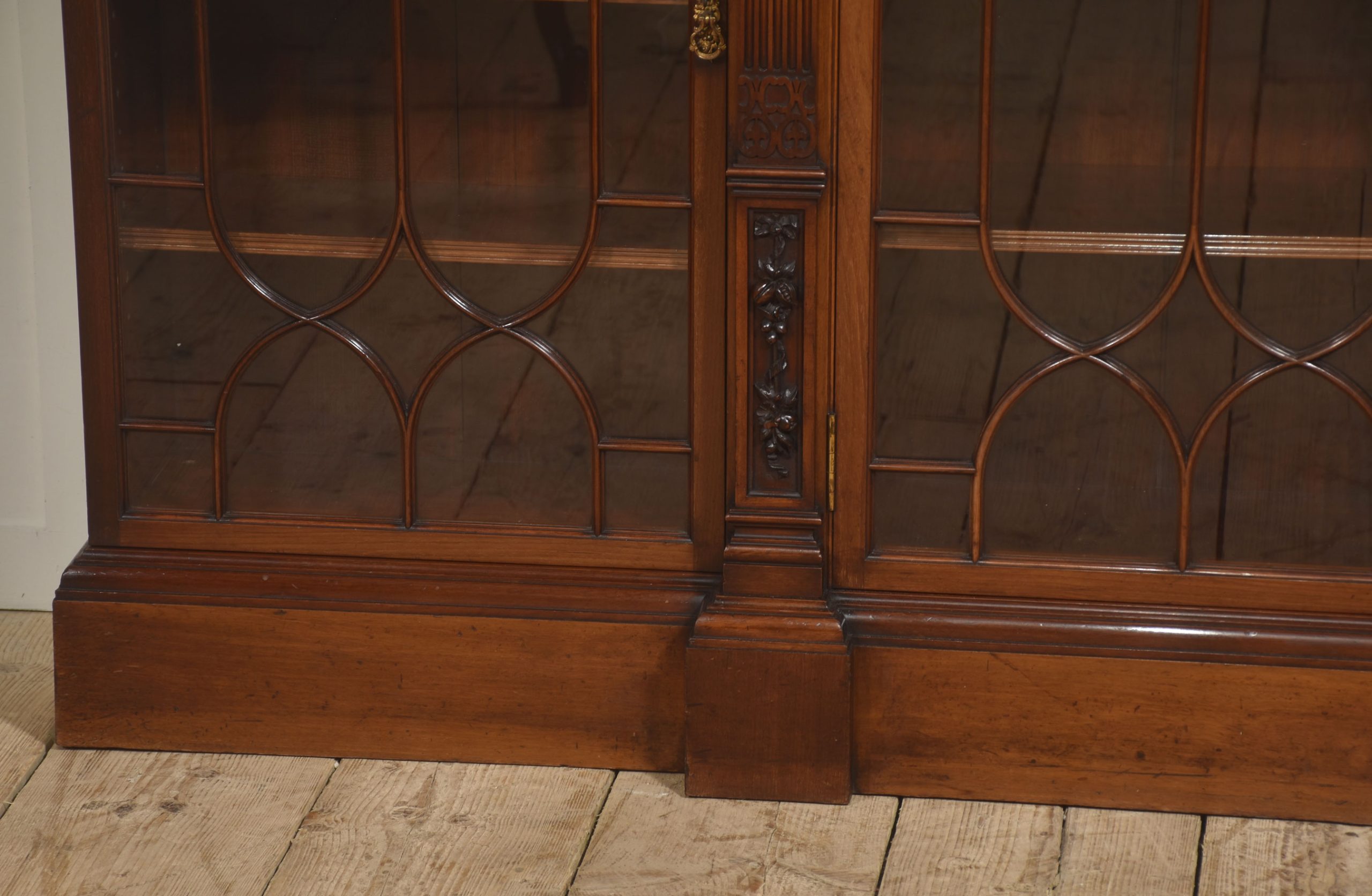 The upper section is fitted with five glazed doors, each framed with finely shaped astragal glazing bars forming elegant intersecting oval and arch motifs. These decorative mullions lend the piece a distinctive visual rhythm while allowing a clear view of the interior shelving. The doors open smoothly on brass hinges and are finished with small decorative brass handles, providing access to spacious shelving within. Inside, the cabinet is lined in warm mahogany with multiple adjustable shelves, offering generous storage for books, decorative objects, or collections. The interior retains the same rich tone as the exterior, enhancing the overall sense of craftsmanship and continuity.