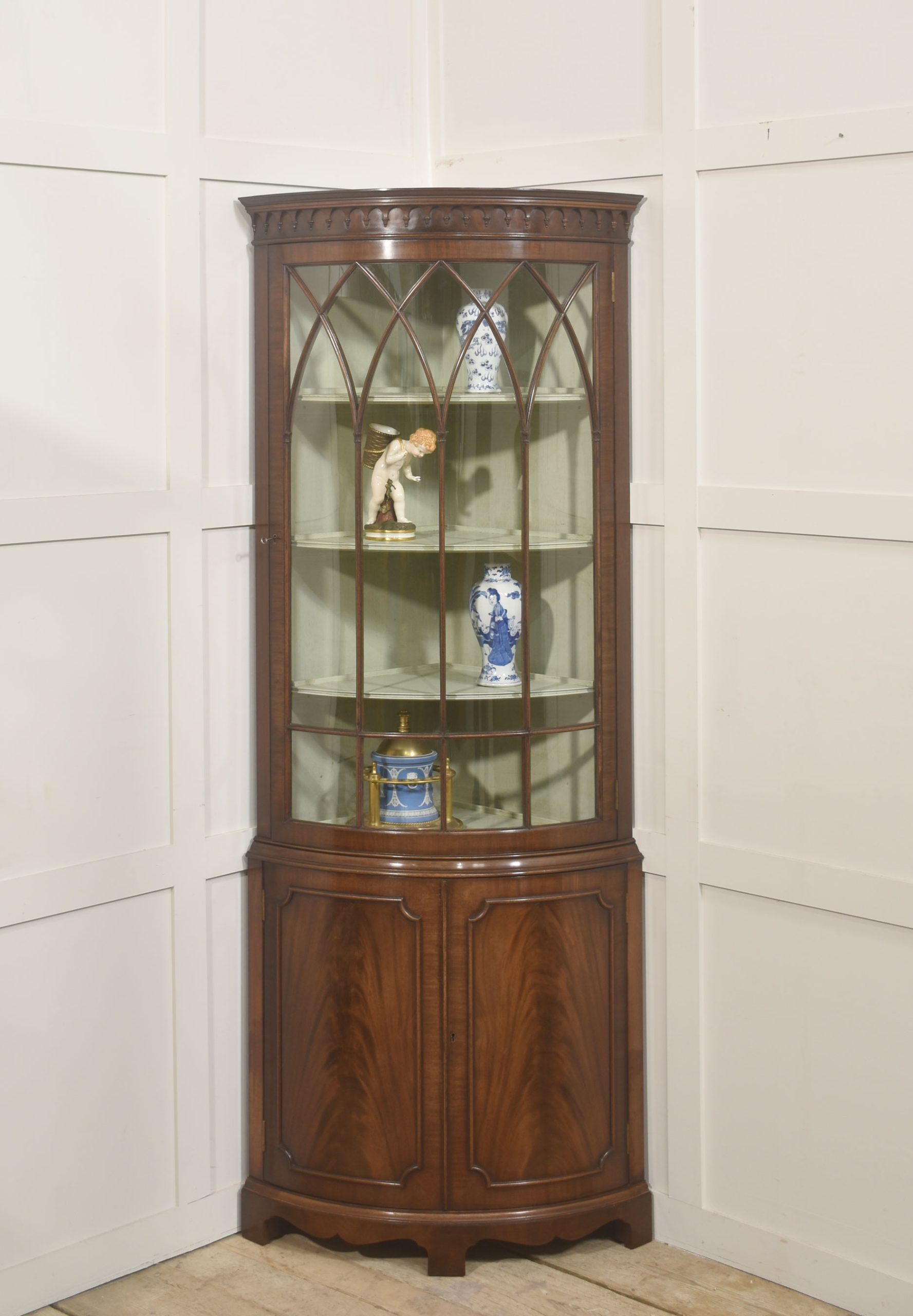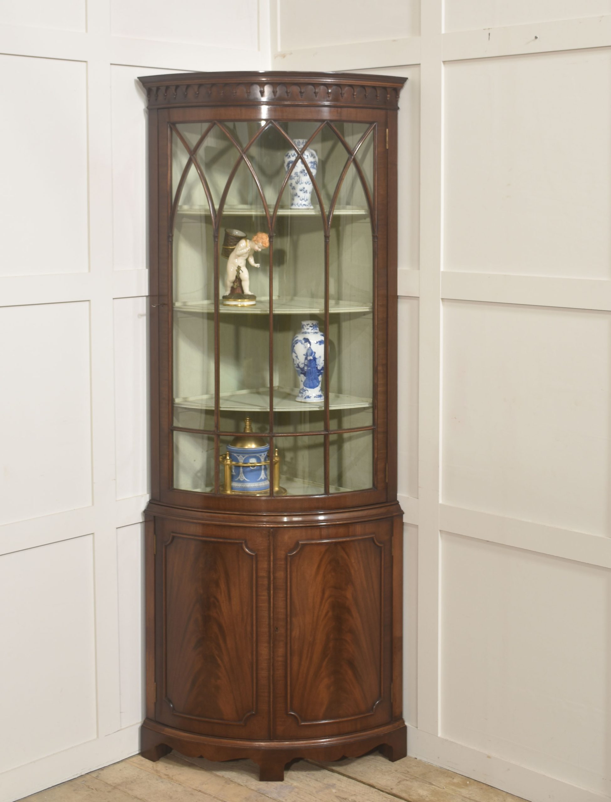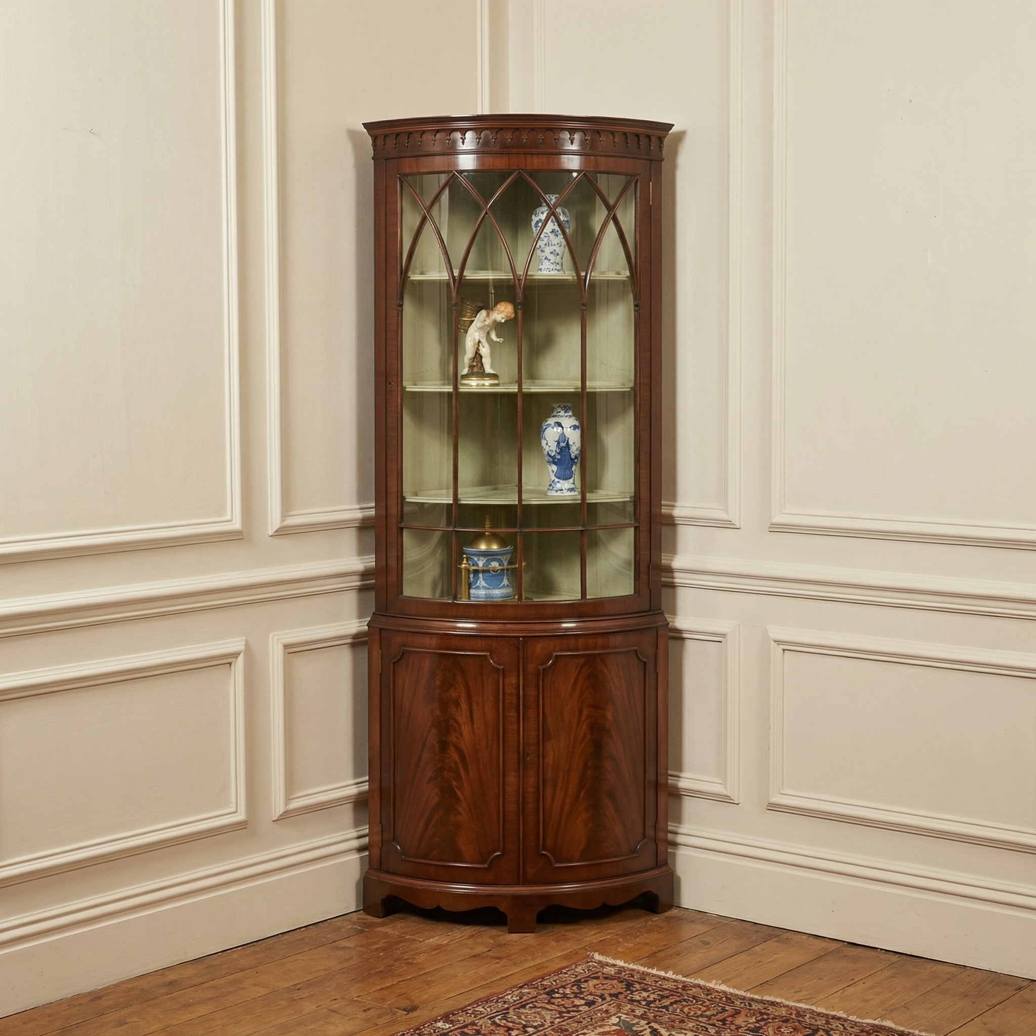 The upper section is distinguished by its bowed glazed door, framed with slender astragal glazing bars arranged in a series of intersecting pointed arches, lending a subtle Gothic influence within an otherwise classical Georgian revival form. Above, a moulded cornice with a carved dentil frieze provides a crisp visual termination and reinforces the cabinet’s traditional character. The interior of the display compartment is finished in a soft contrasting tone, enhancing light reflection and allowing porcelain, glassware, or decorative objects to be viewed clearly. Three shaped corner shelves provide graduated display levels within the curved front.
