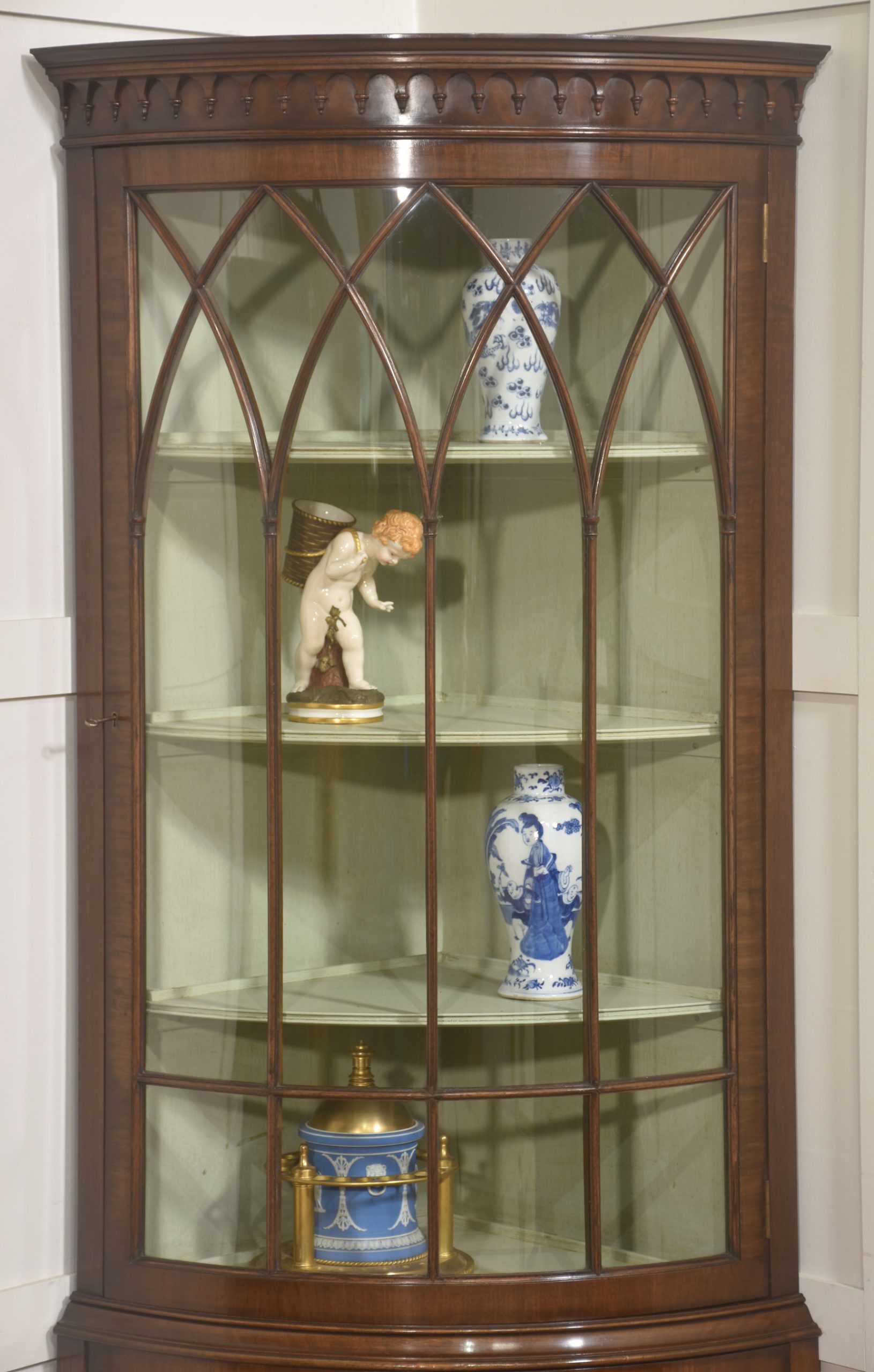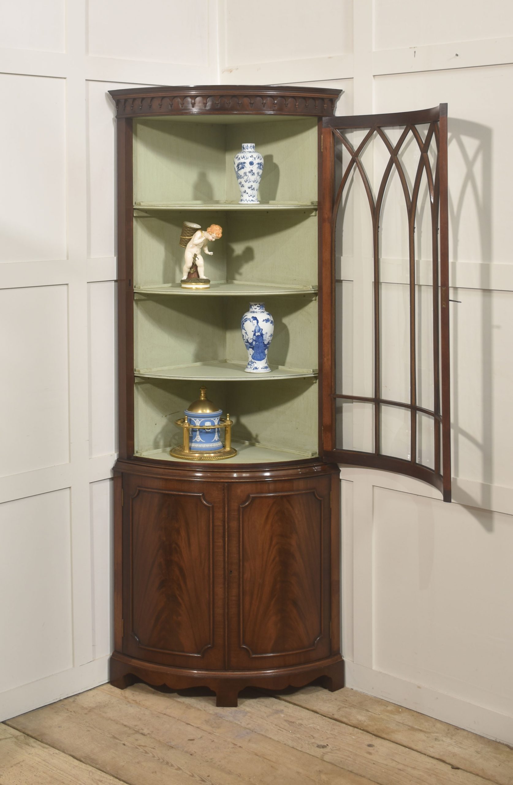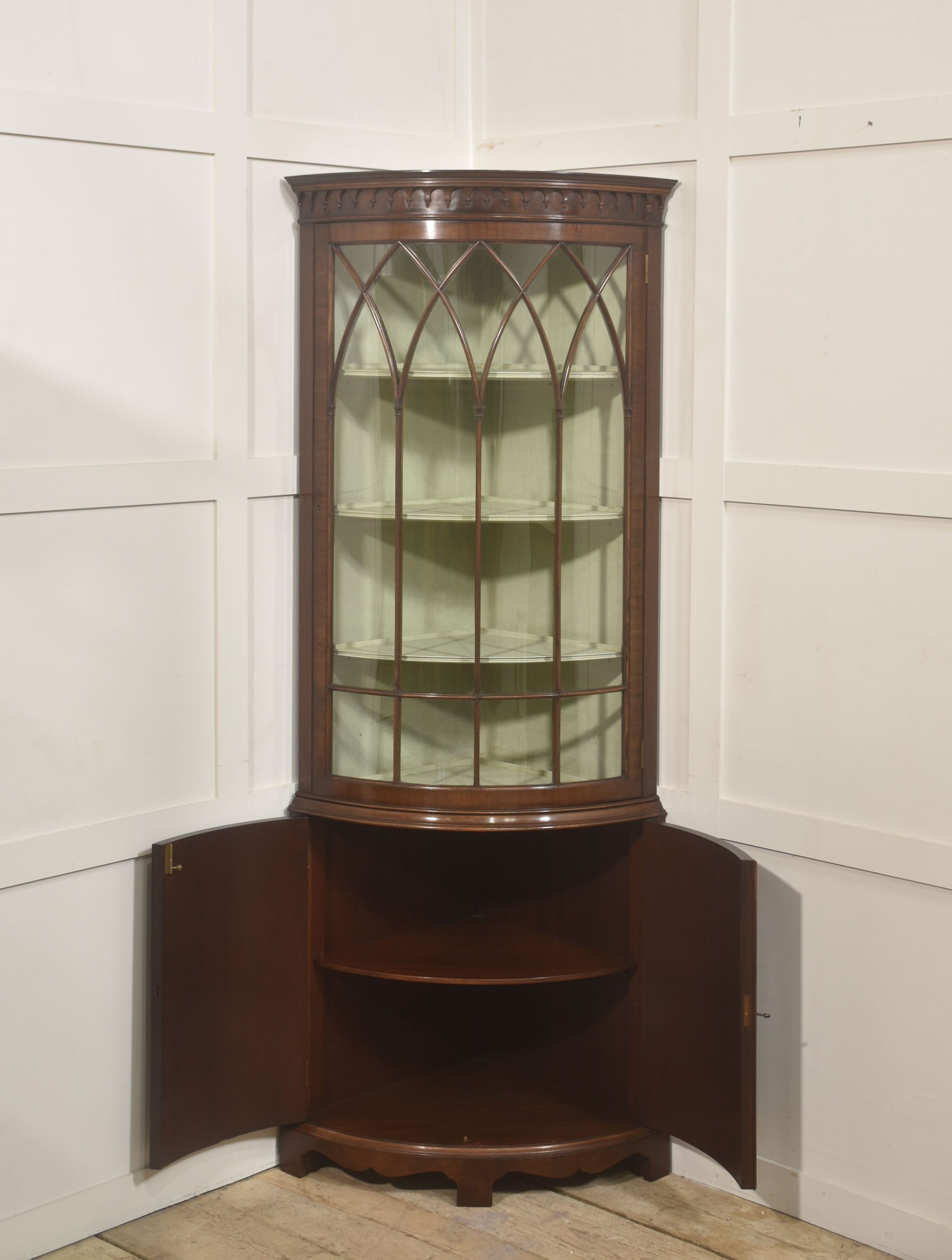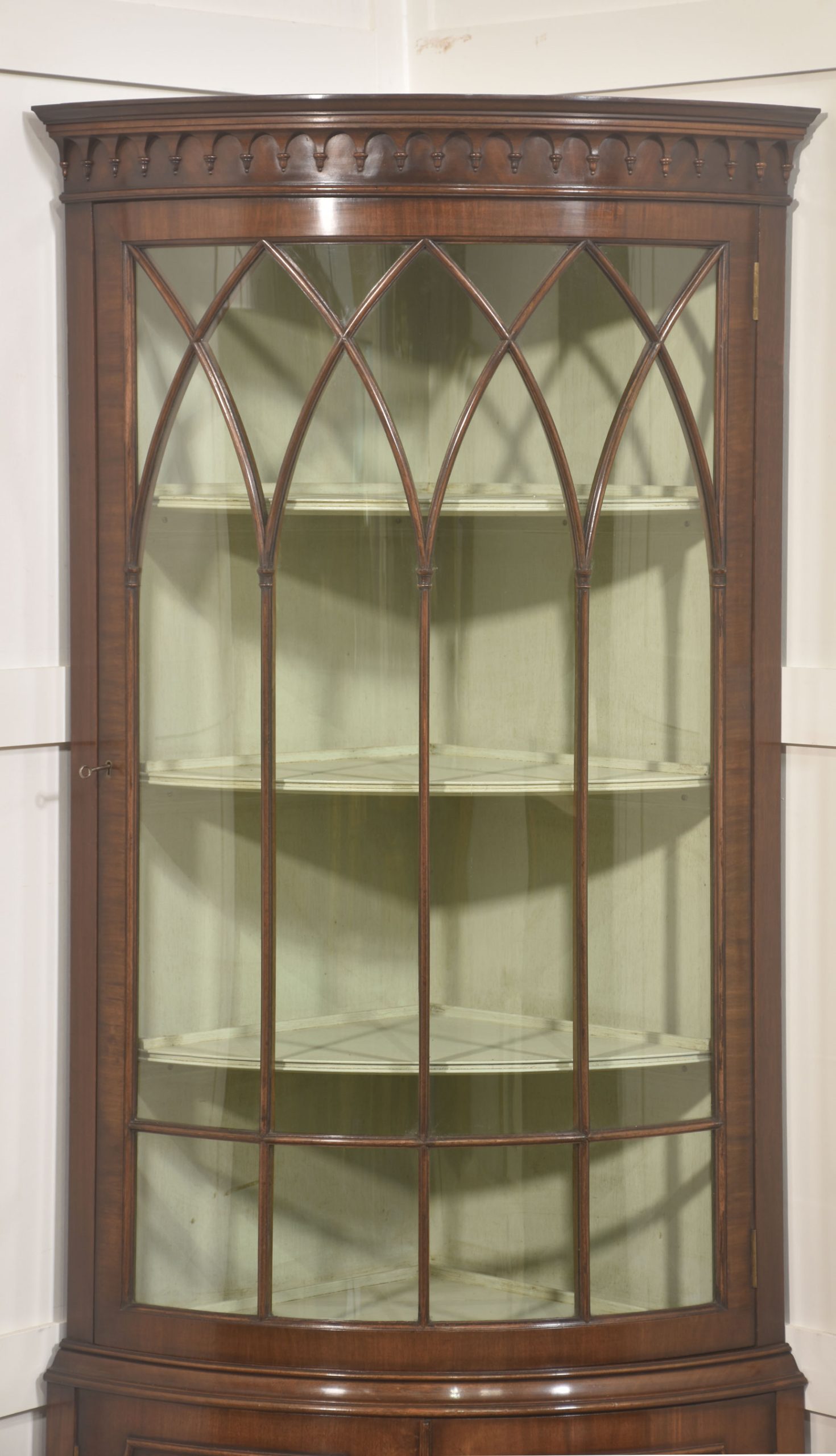 The upper section is distinguished by its bowed glazed door, framed with slender astragal glazing bars arranged in a series of intersecting pointed arches, lending a subtle Gothic influence within an otherwise classical Georgian revival form. Above, a moulded cornice with a carved dentil frieze provides a crisp visual termination and reinforces the cabinet’s traditional character. The interior of the display compartment is finished in a soft contrasting tone, enhancing light reflection and allowing porcelain, glassware, or decorative objects to be viewed clearly. Three shaped corner shelves provide graduated display levels within the curved front.
