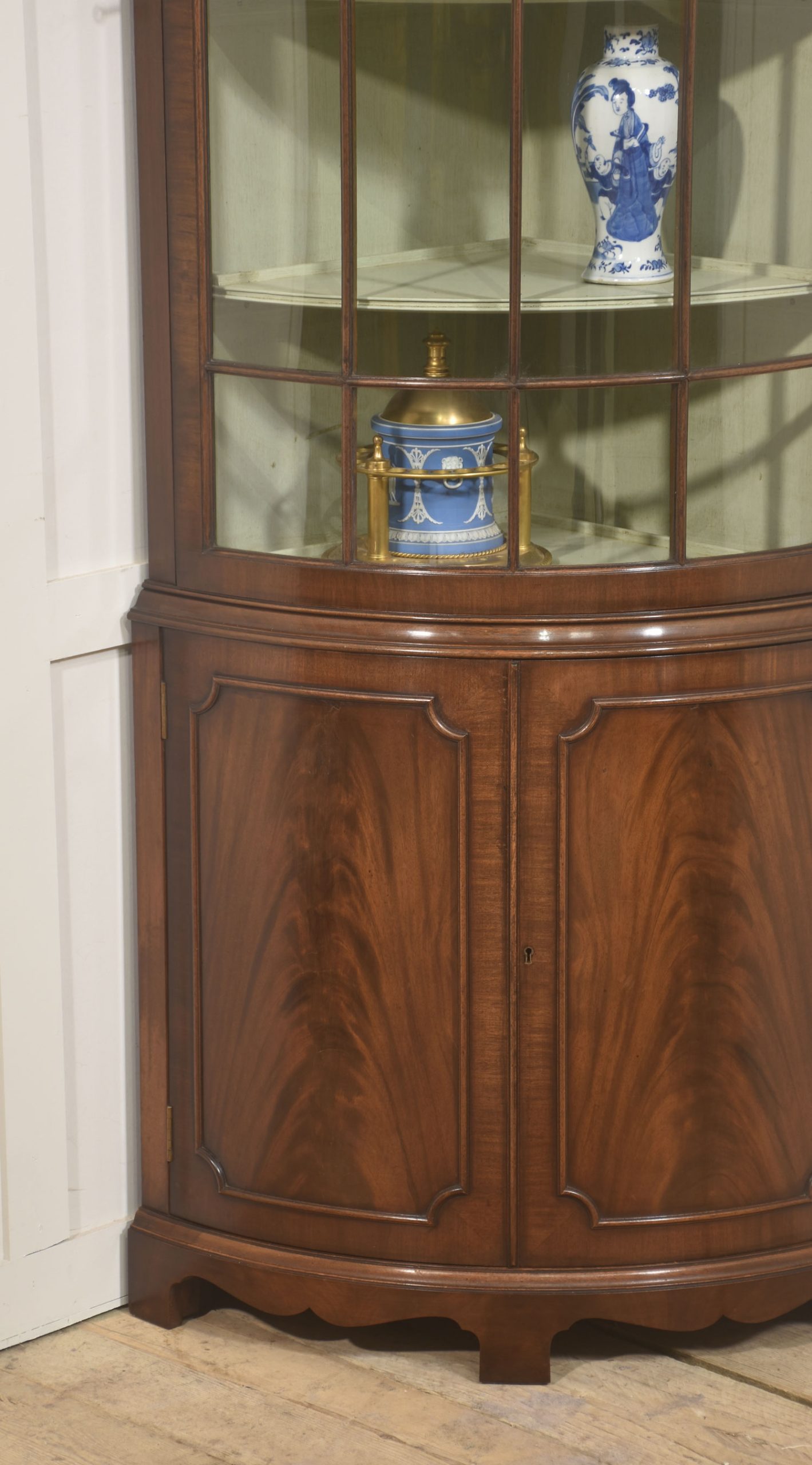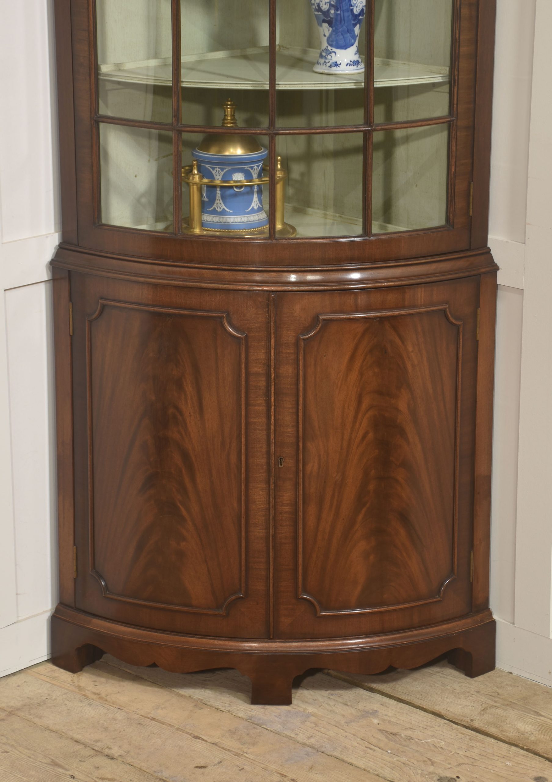 This finely proportioned Georgian-style corner cabinet is crafted in richly figured mahogany and designed to fit neatly into a right-angled corner, offering both elegant display space and practical enclosed storage. The cabinet is formed in two sections, with a serpentine glazed upper display case set above a panelled lower cupboard, creating a balanced and architectural silhouette.