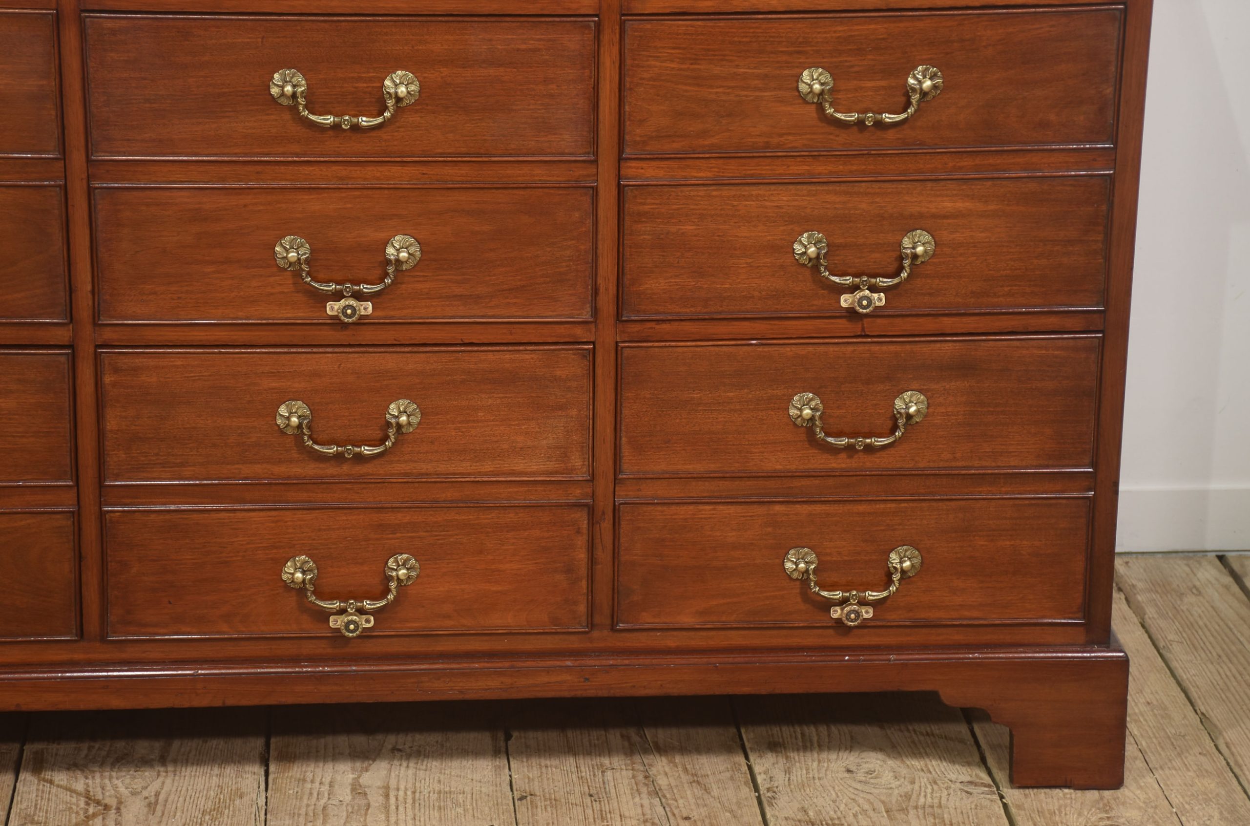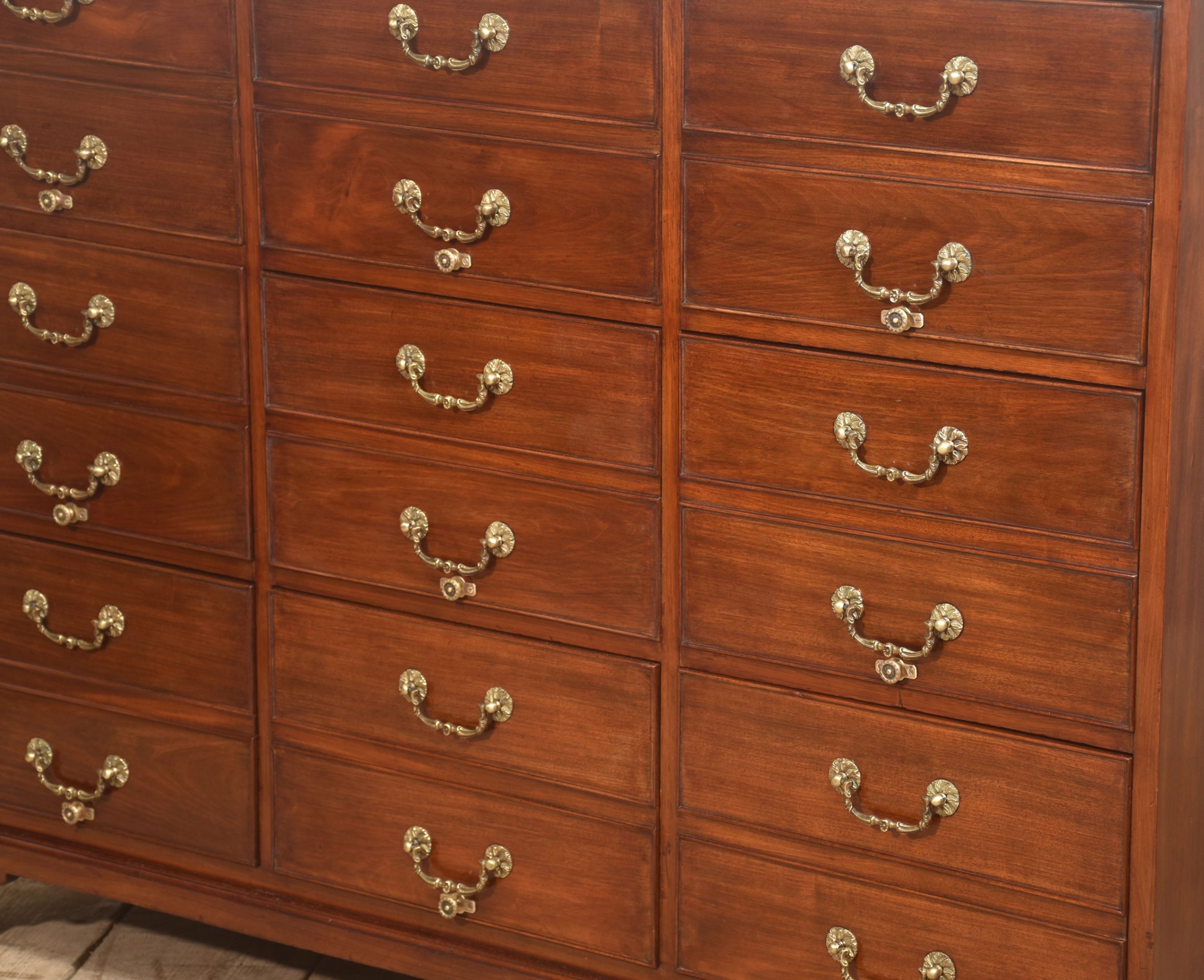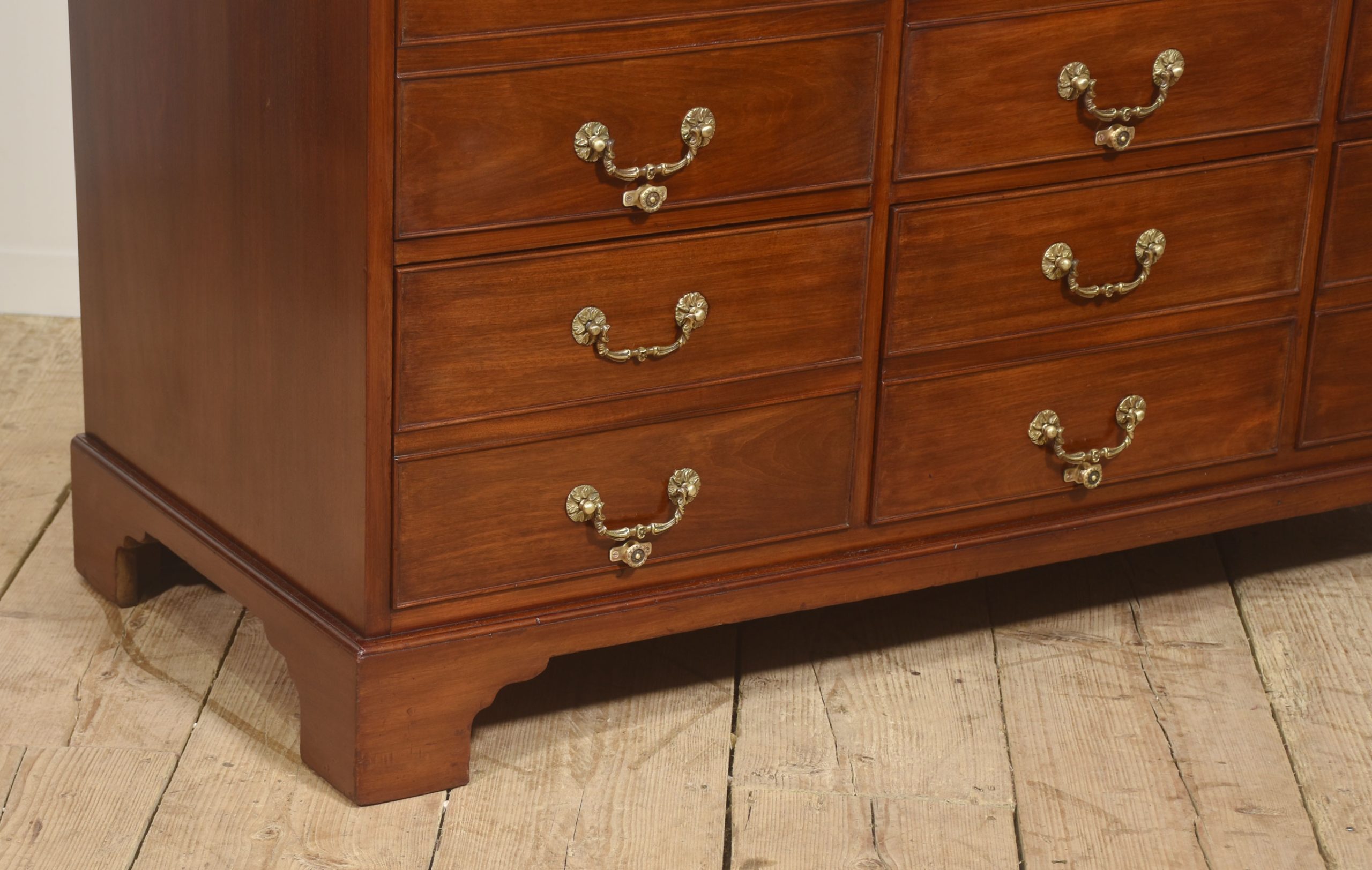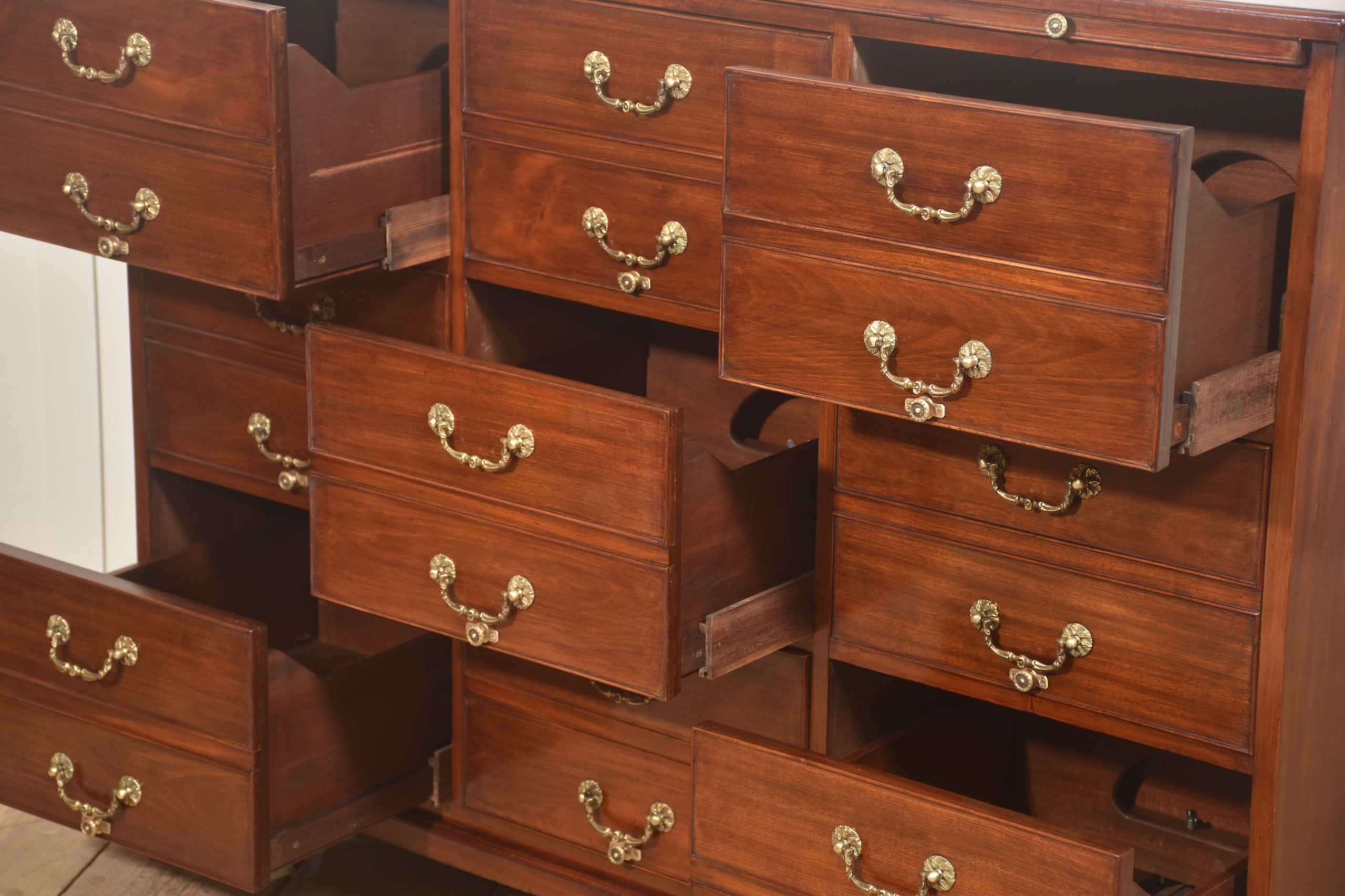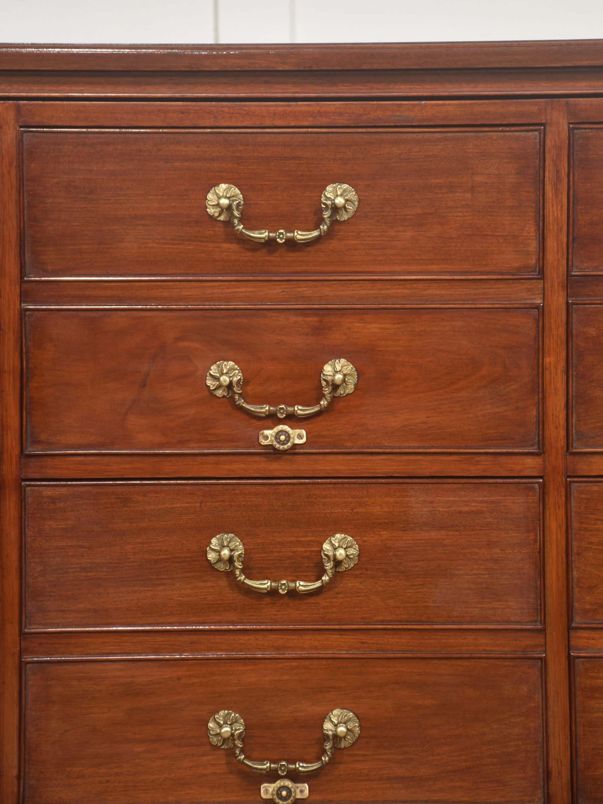 The drawer configuration consists of nine drawers set in three vertical banks of three, offering generous and well-organised storage capacity. Each drawer front is panelled and edged with fine cockbeading, fitted with brass swan-neck handles mounted on decorative rosette backplates, the brasswork displaying a warm, mellow patina that complements the depth and tone of the mahogany. The drawers are evenly proportioned and precisely aligned, demonstrating careful cabinetmaking and attention to symmetry.
