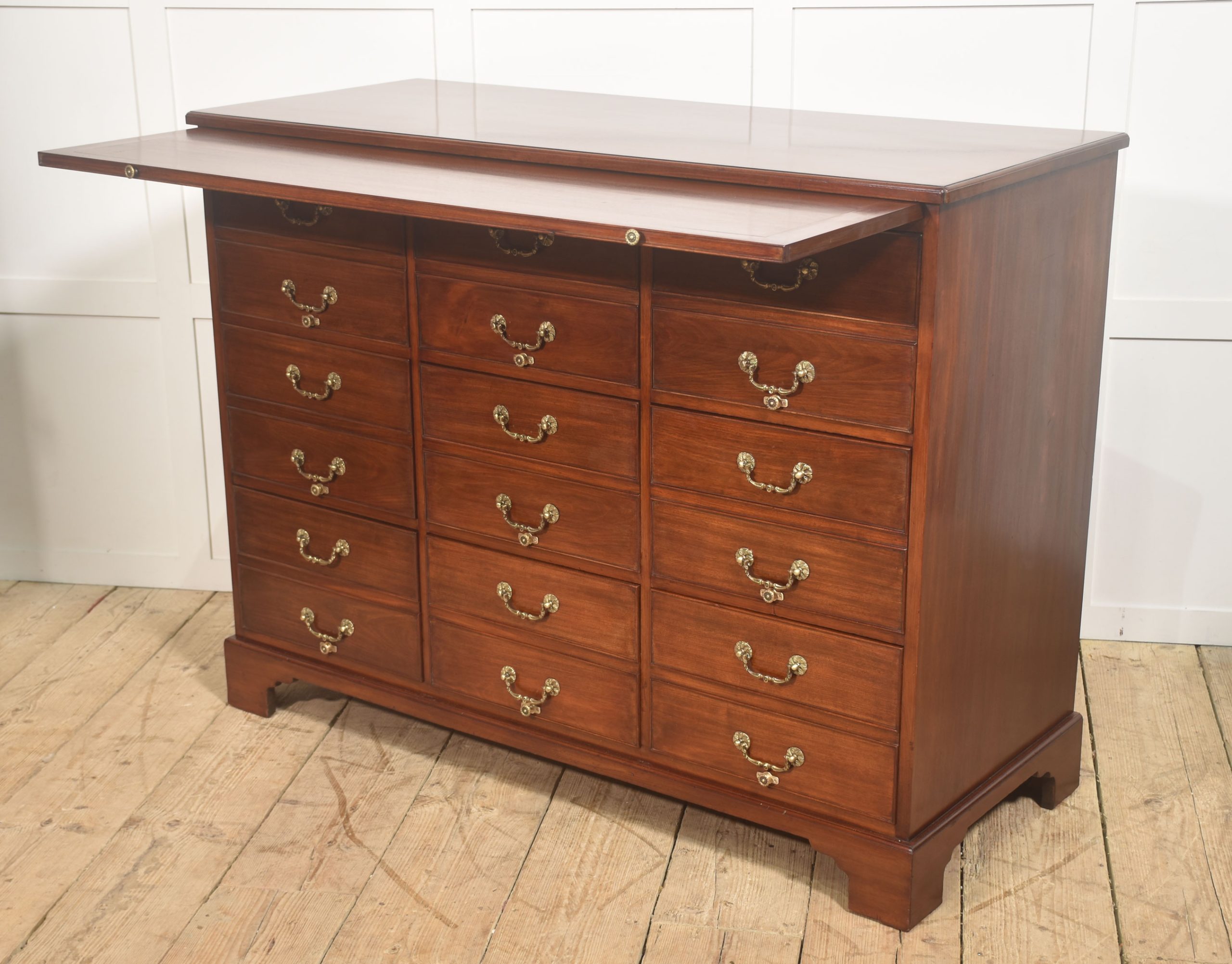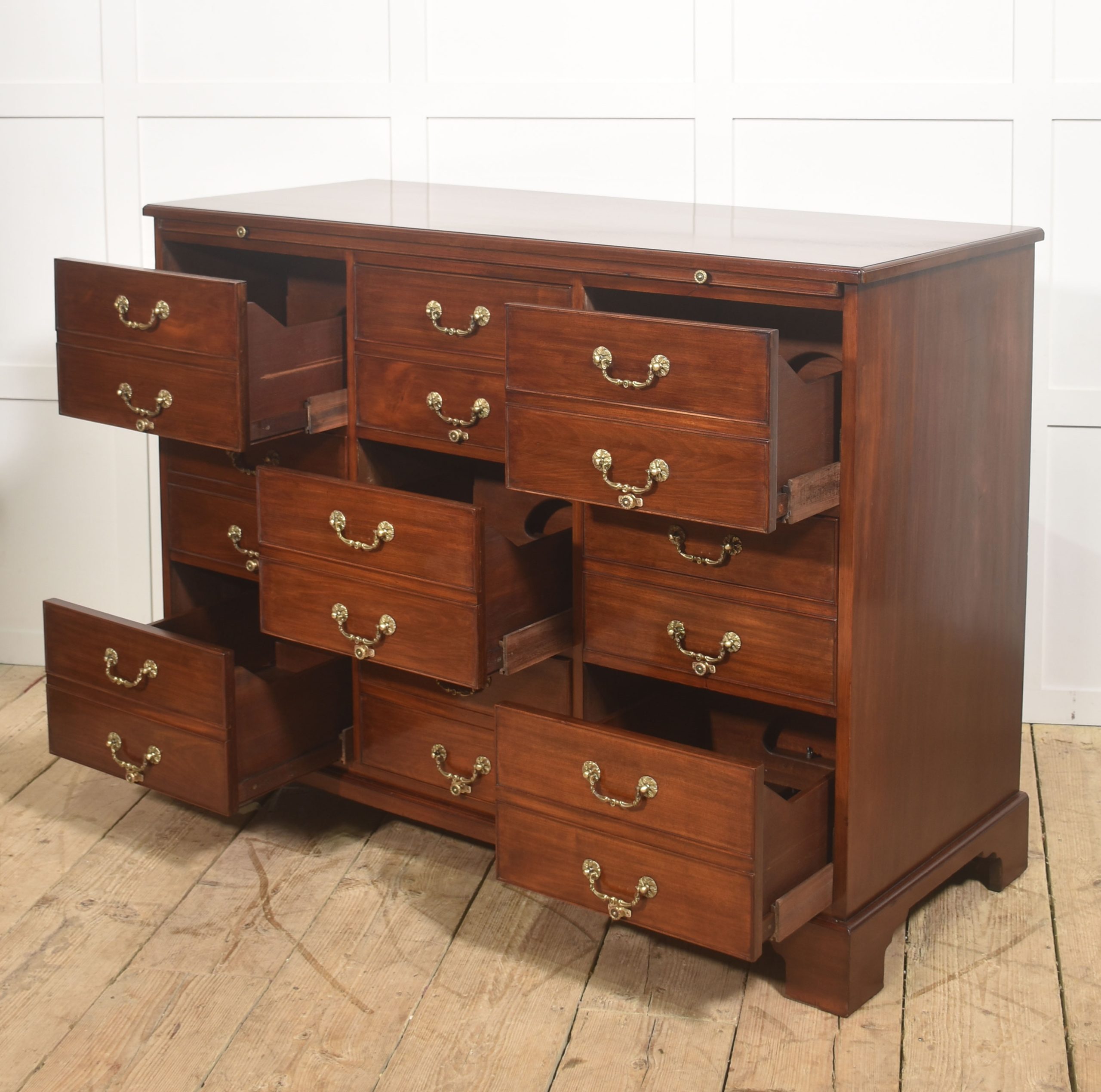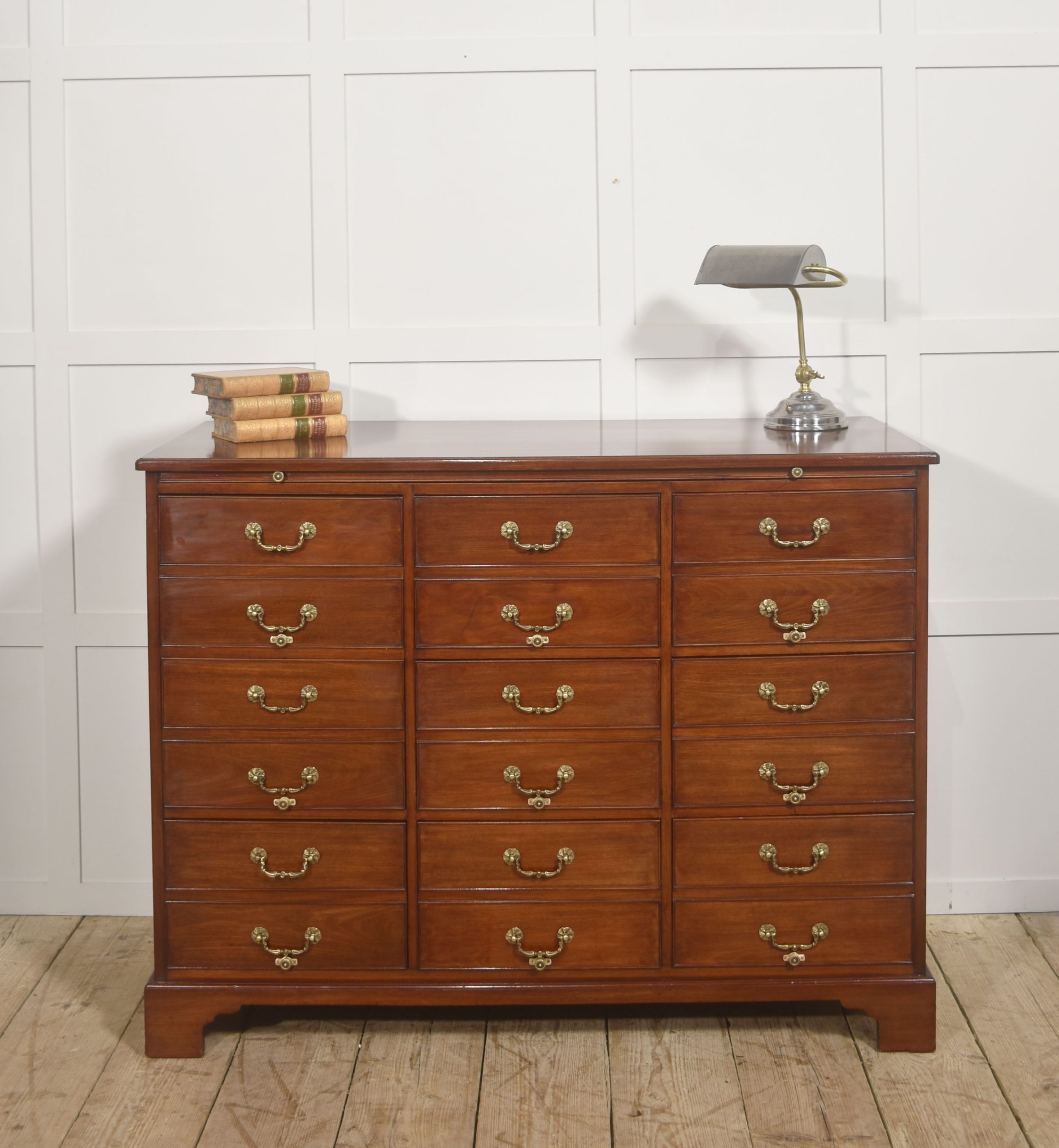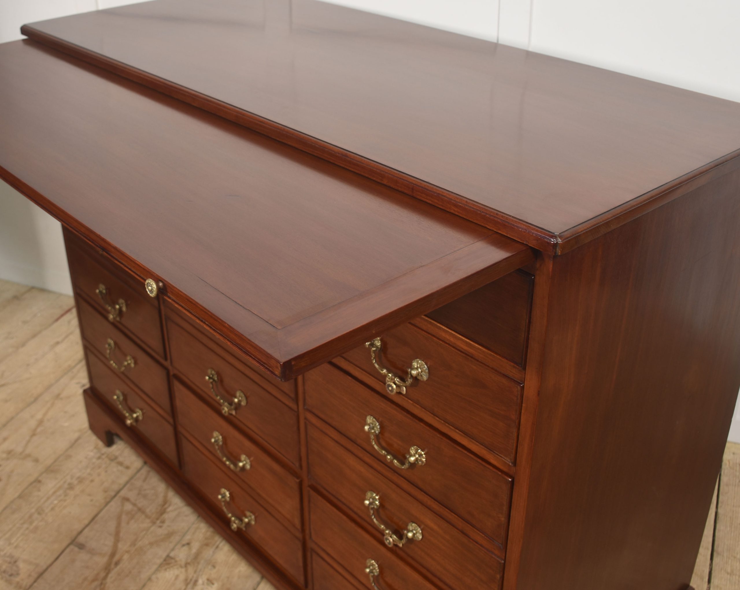 A substantial and finely crafted mahogany filing cabinet of impressive scale and restrained classical design, the rectangular top with a moulded edge and rich, even polish above a well-balanced arrangement of nine drawers. Concealed directly beneath the top is a pull-out brushing-in slide, smoothly operating and neatly integrated within the upper section. The slide provides a practical auxiliary surface suitable for writing or sorting documents and, when closed, sits flush within the moulded framework, maintaining the clean architectural lines of the cabinet.