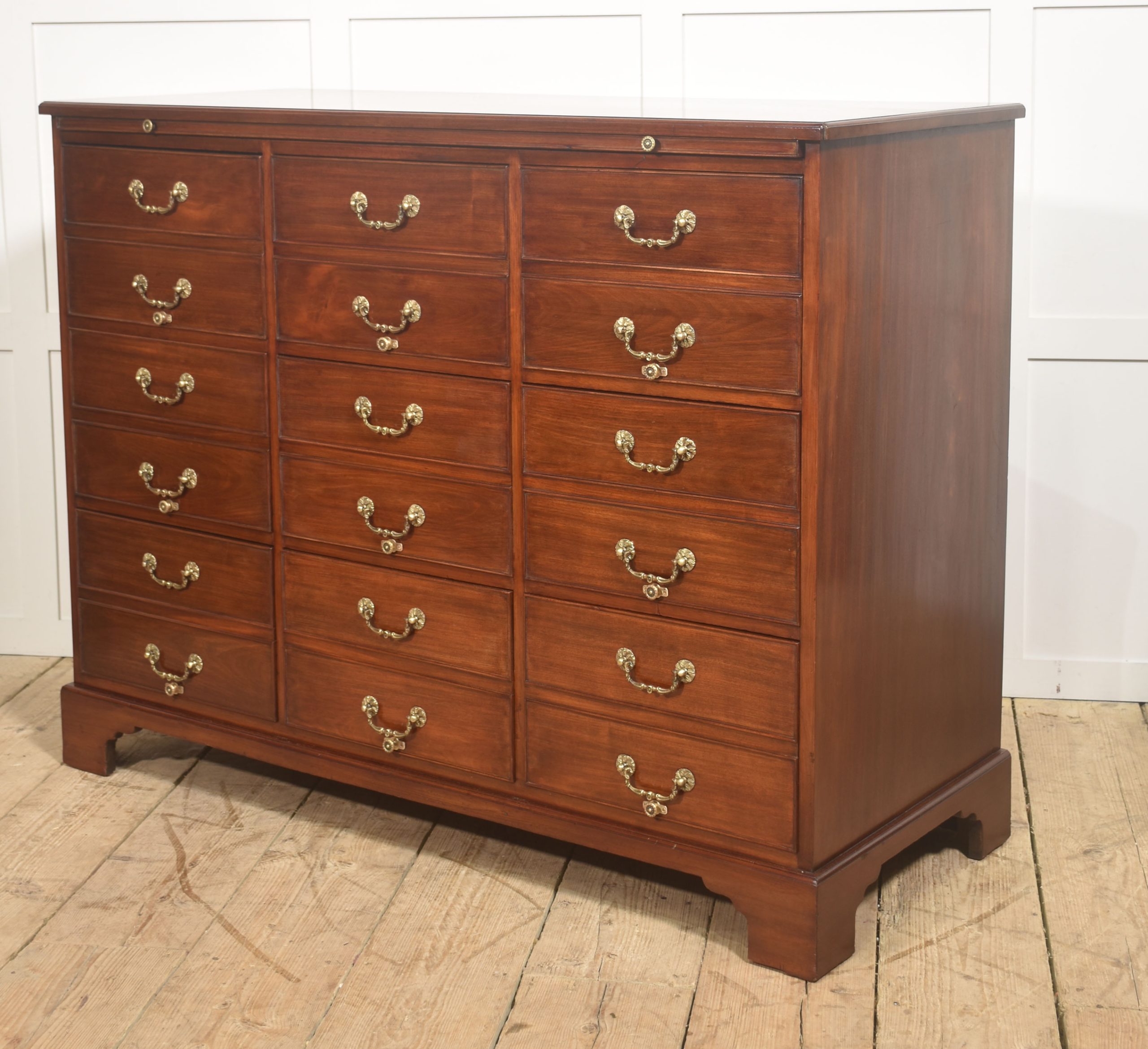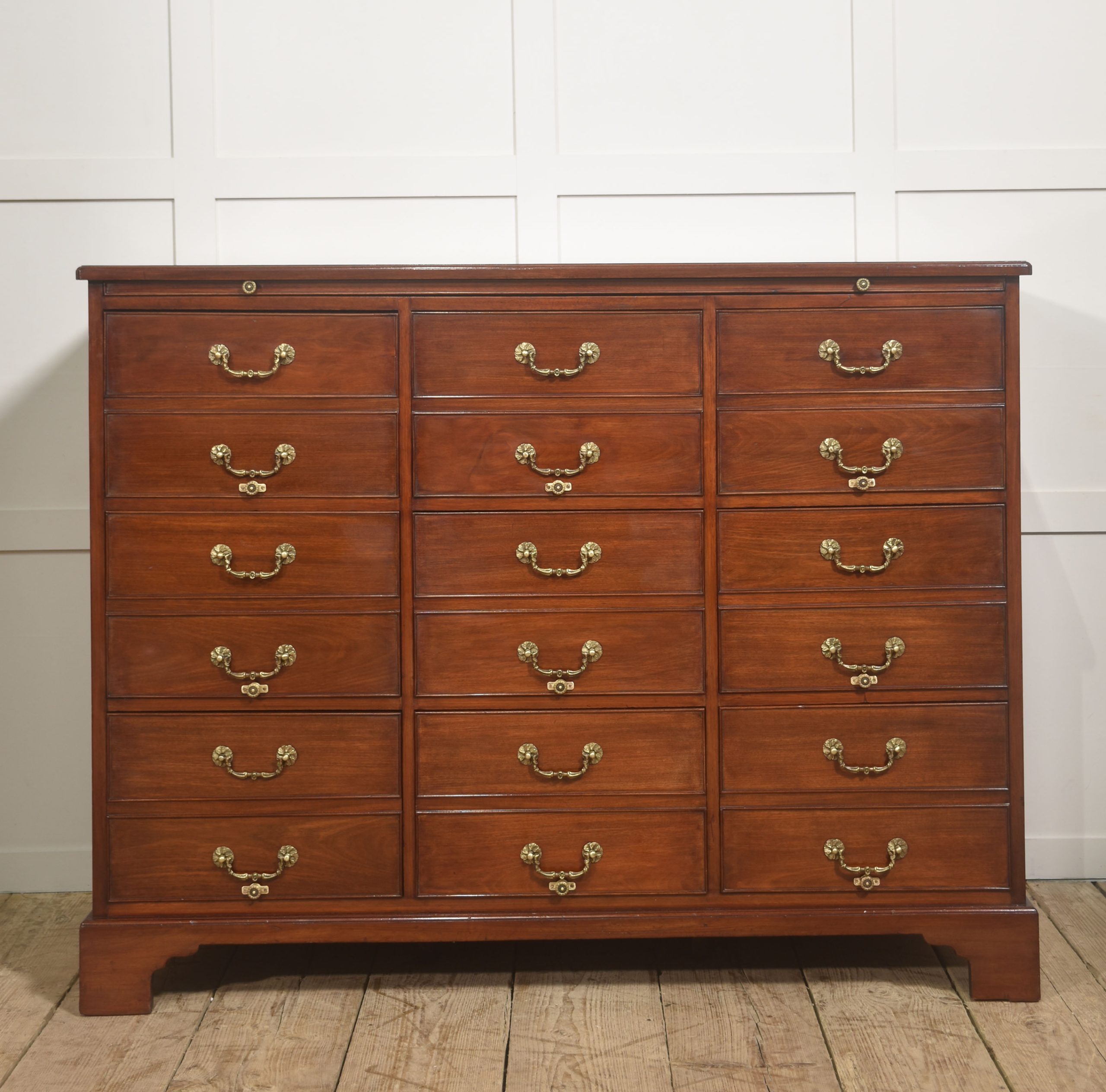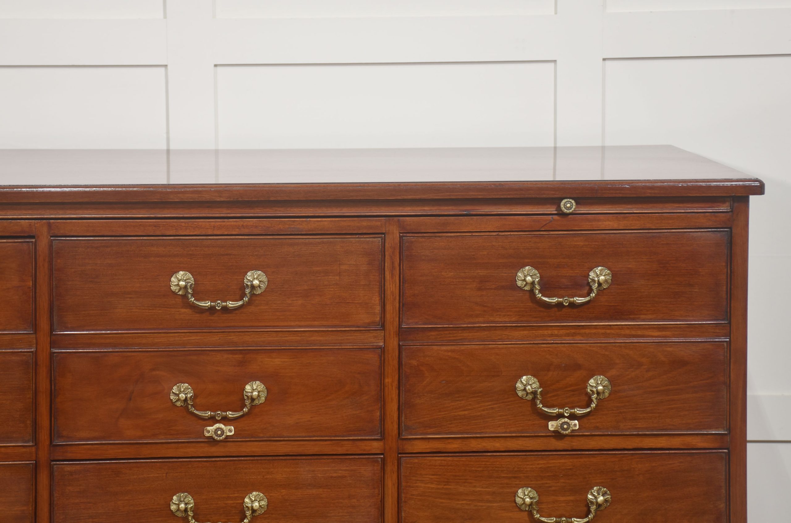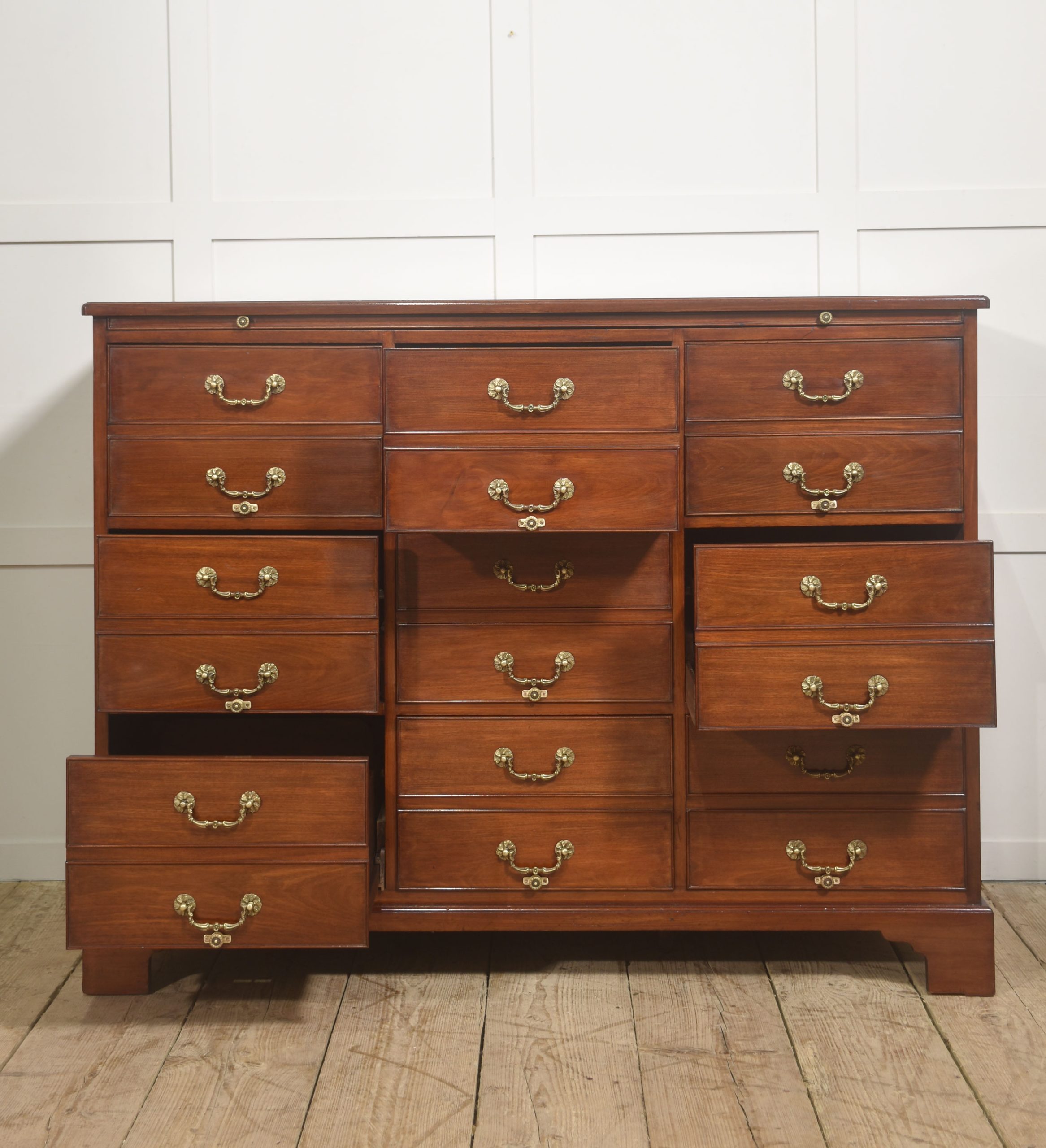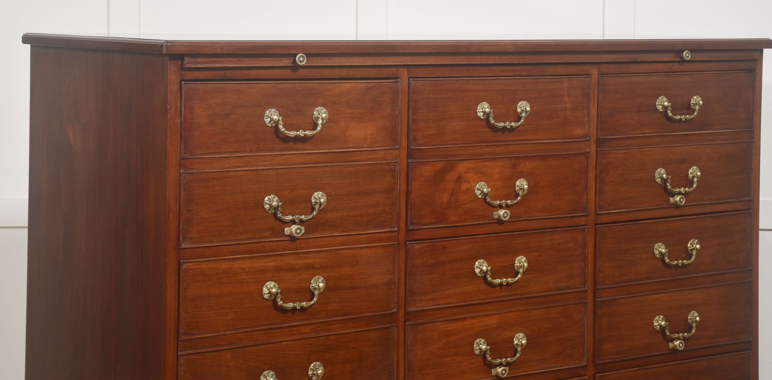 A substantial and finely crafted mahogany filing cabinet of impressive scale and restrained classical design, the rectangular top with a moulded edge and rich, even polish above a well-balanced arrangement of nine drawers. Concealed directly beneath the top is a pull-out brushing-in slide, smoothly operating and neatly integrated within the upper section. The slide provides a practical auxiliary surface suitable for writing or sorting documents and, when closed, sits flush within the moulded framework, maintaining the clean architectural lines of the cabinet.