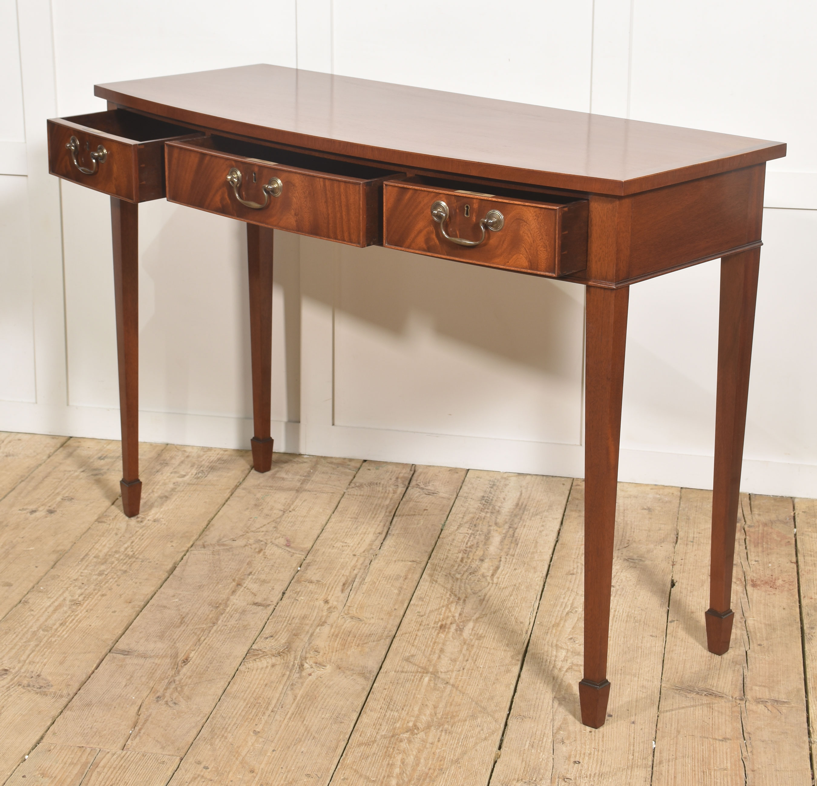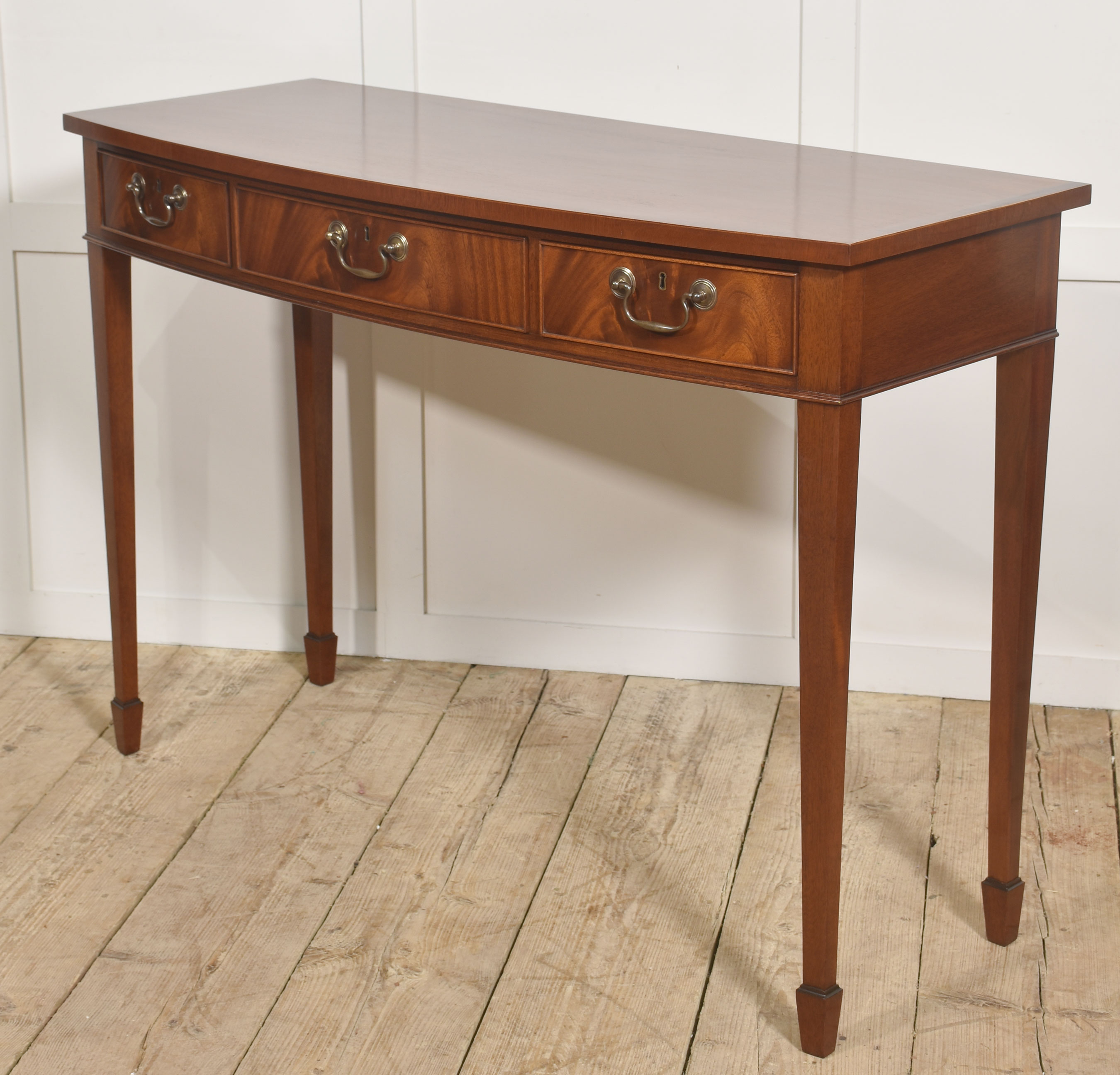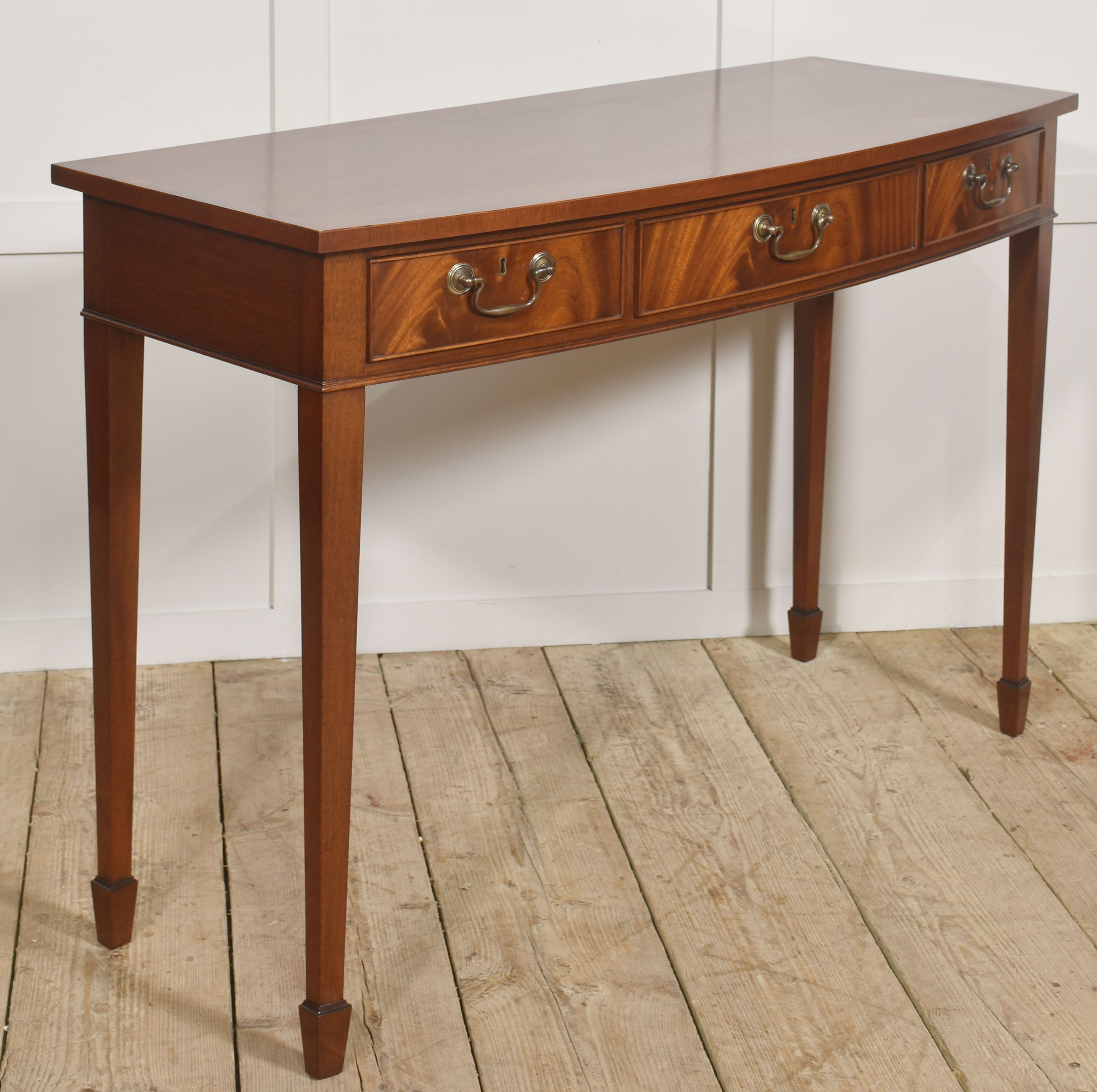 A fine and elegant mahogany console table of classic Georgian inspiration, the rectangular top with a subtle satin sheen and well-figured grain, above a frieze fitted with three graduated drawers. Each drawer is finely constructed and retains its original style brass swan-neck handles and escutcheons, lending a pleasing period character. The drawer fronts display particularly attractive flame mahogany figuring, framed by delicate cockbeading.