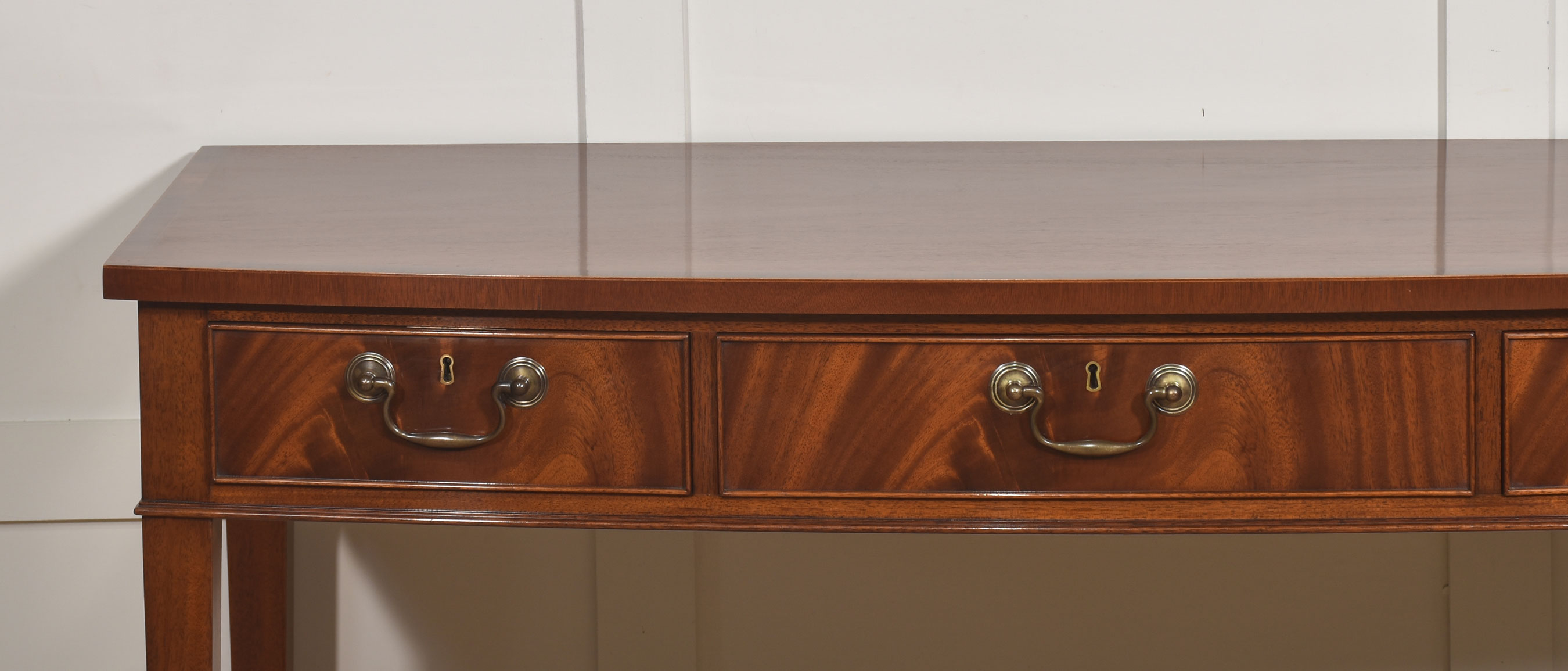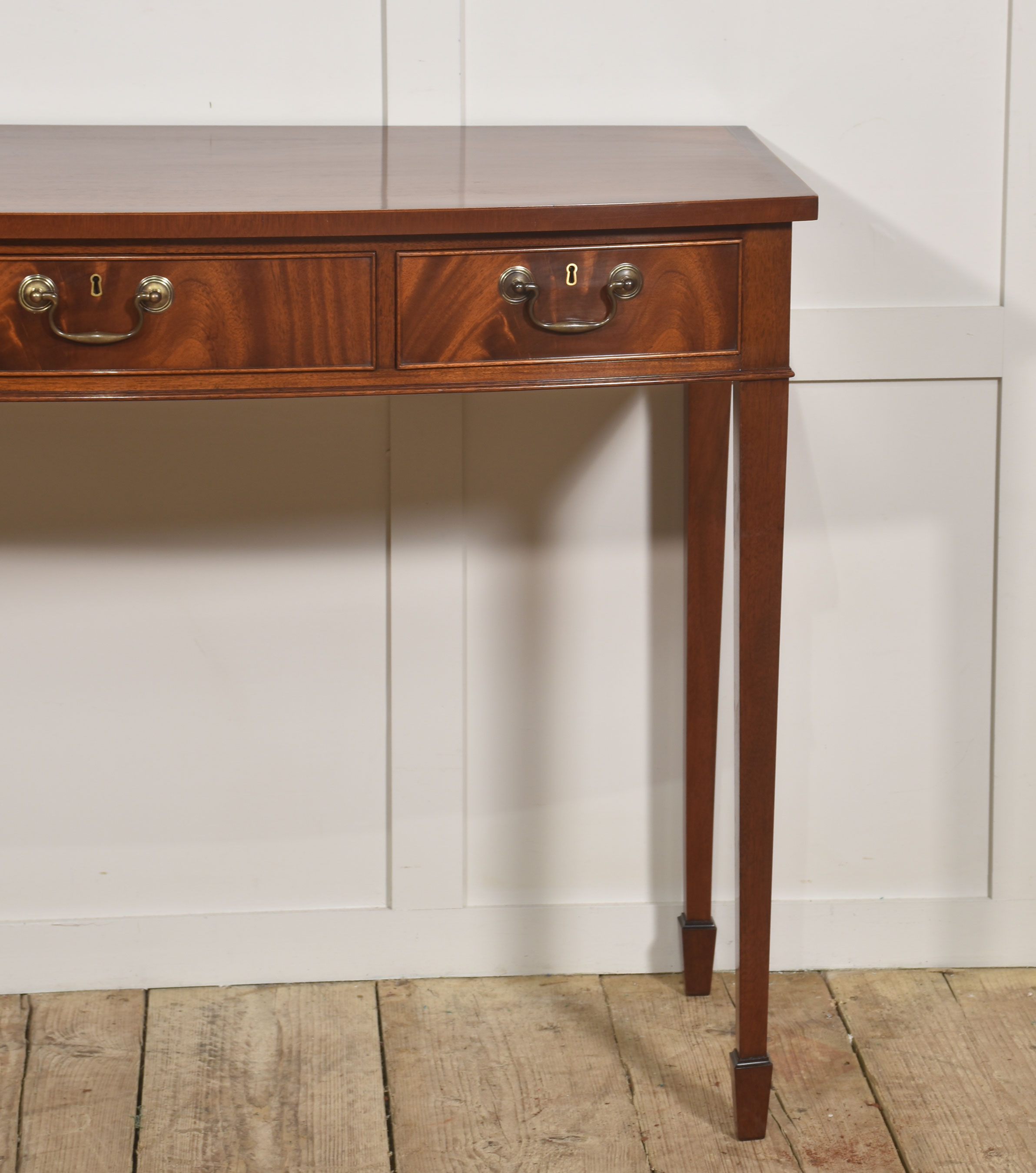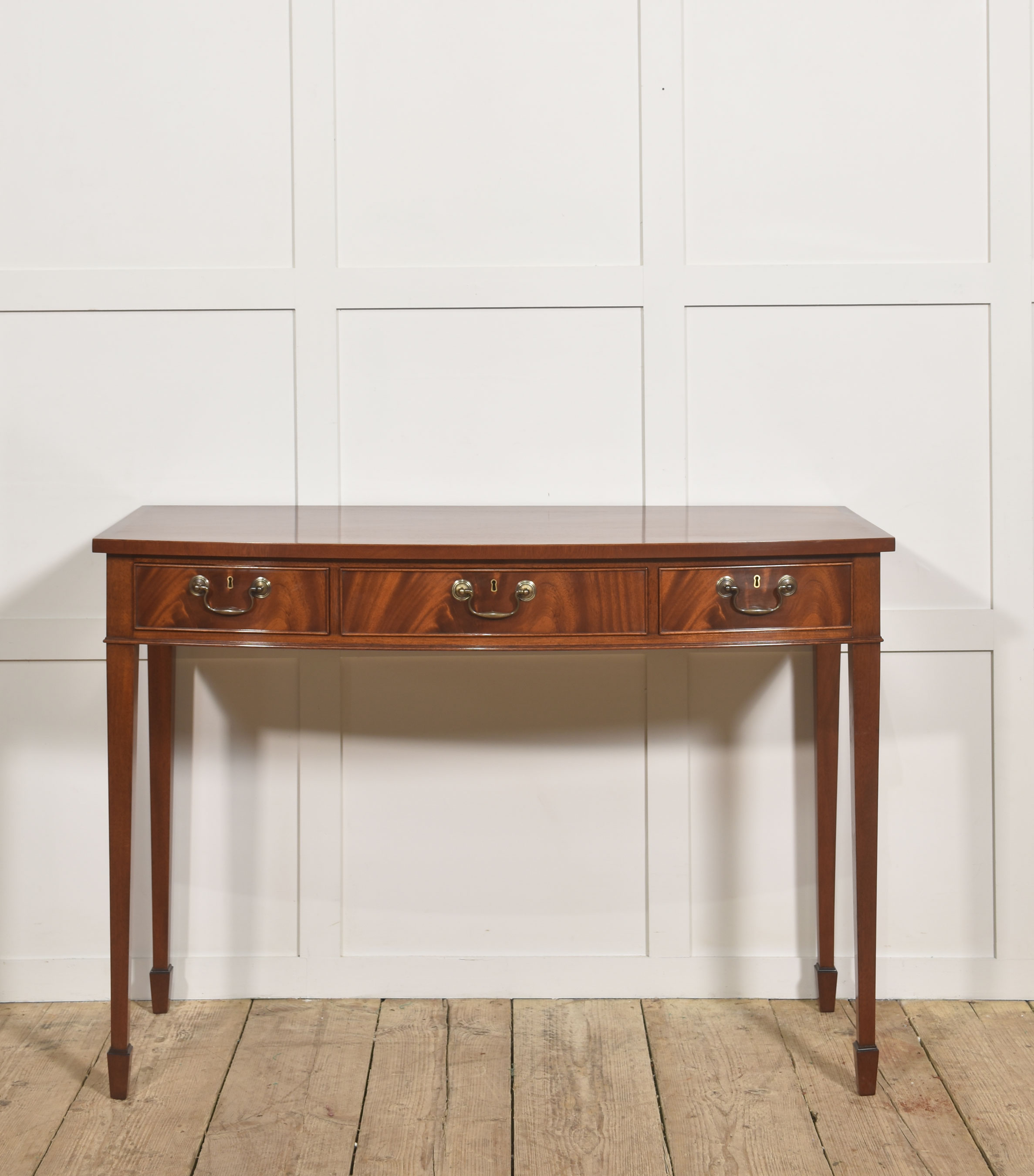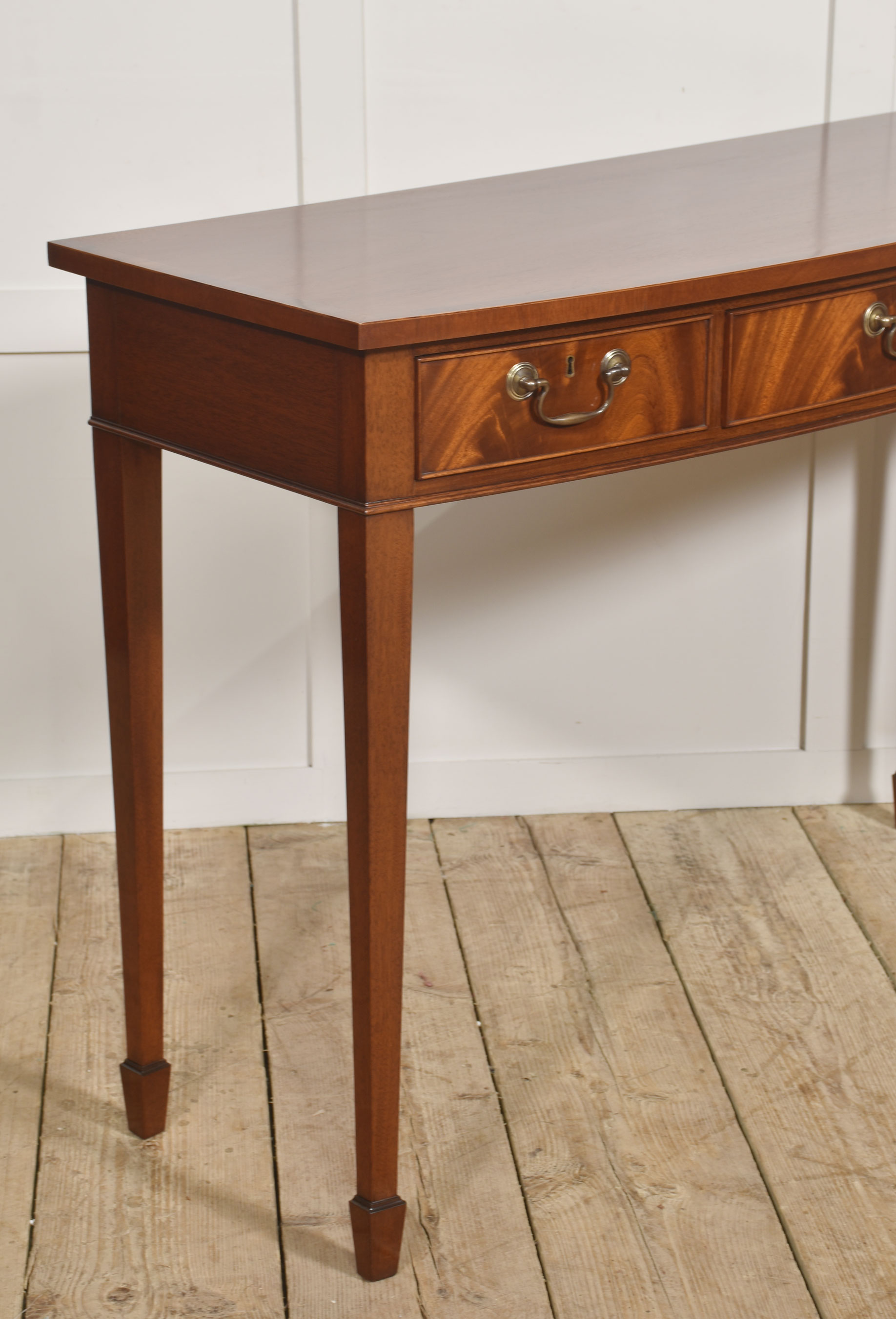 A fine and elegant mahogany console table of classic Georgian inspiration, the rectangular top with a subtle satin sheen and well-figured grain, above a frieze fitted with three graduated drawers. Each drawer is finely constructed and retains its original style brass swan-neck handles and escutcheons, lending a pleasing period character. The drawer fronts display particularly attractive flame mahogany figuring, framed by delicate cockbeading.