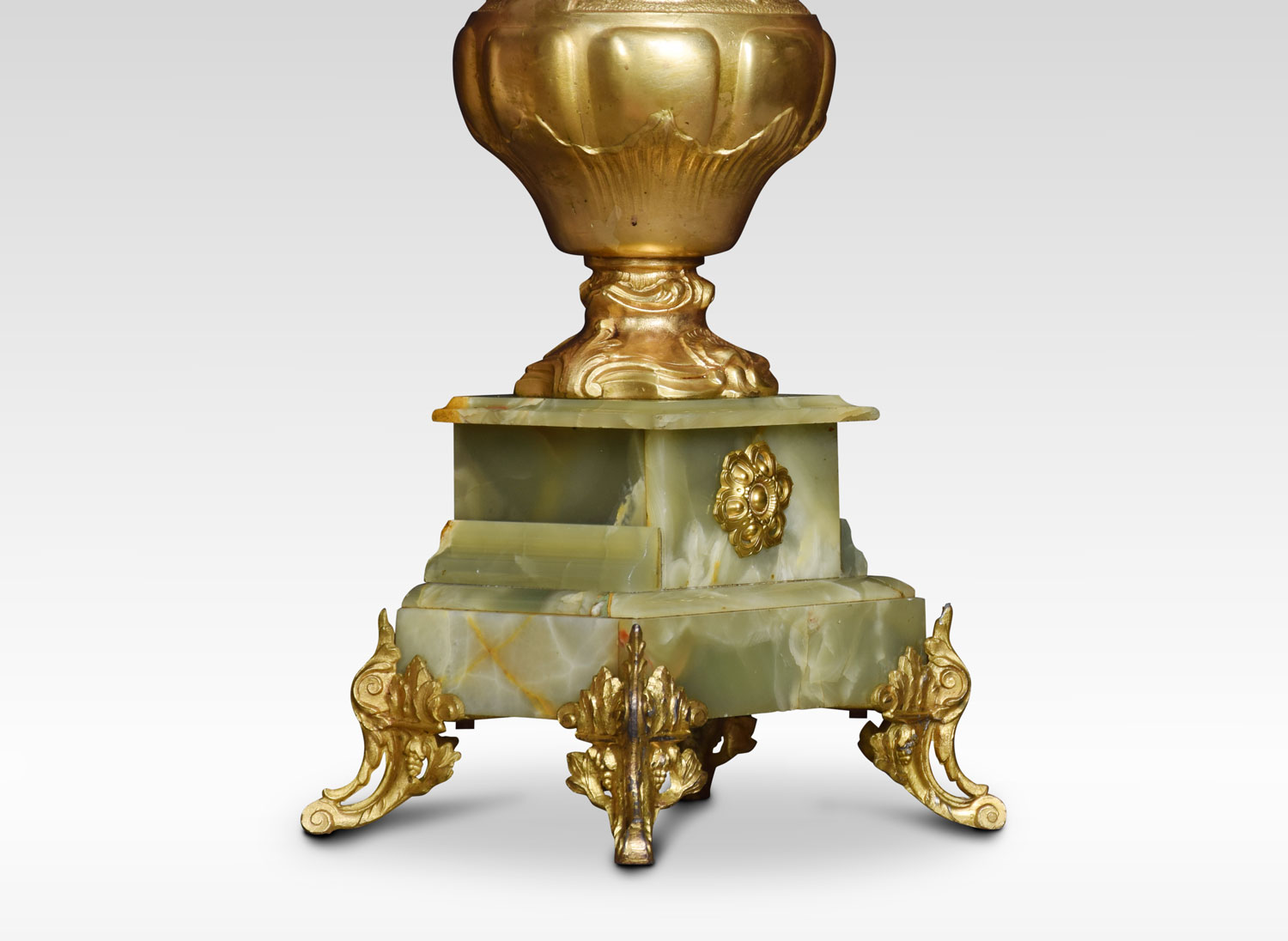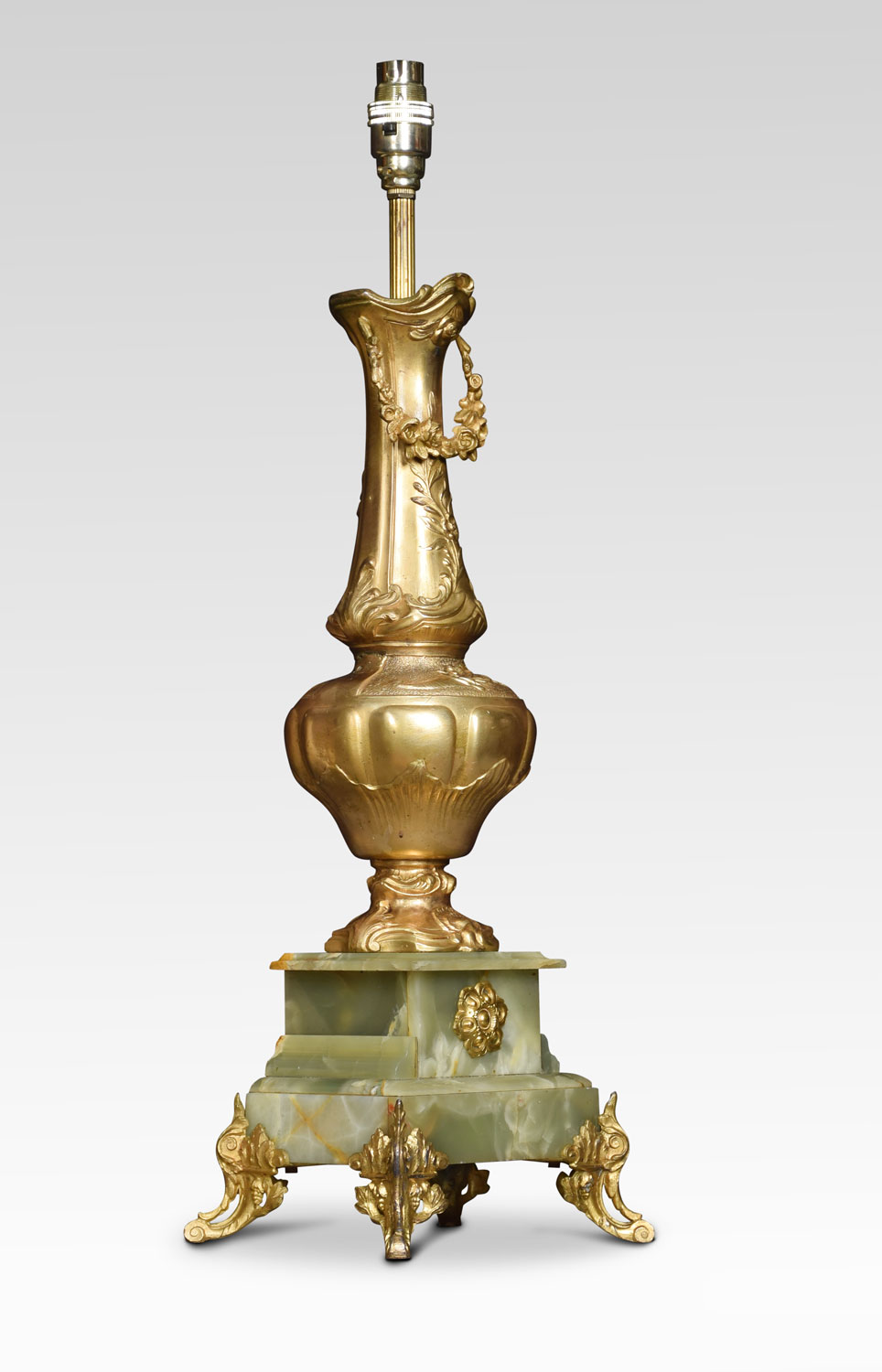 Gilded metal and onyx table lamp of vase form raised up on square plinth terminating in foliating scrolling feet. Together with silk shade.