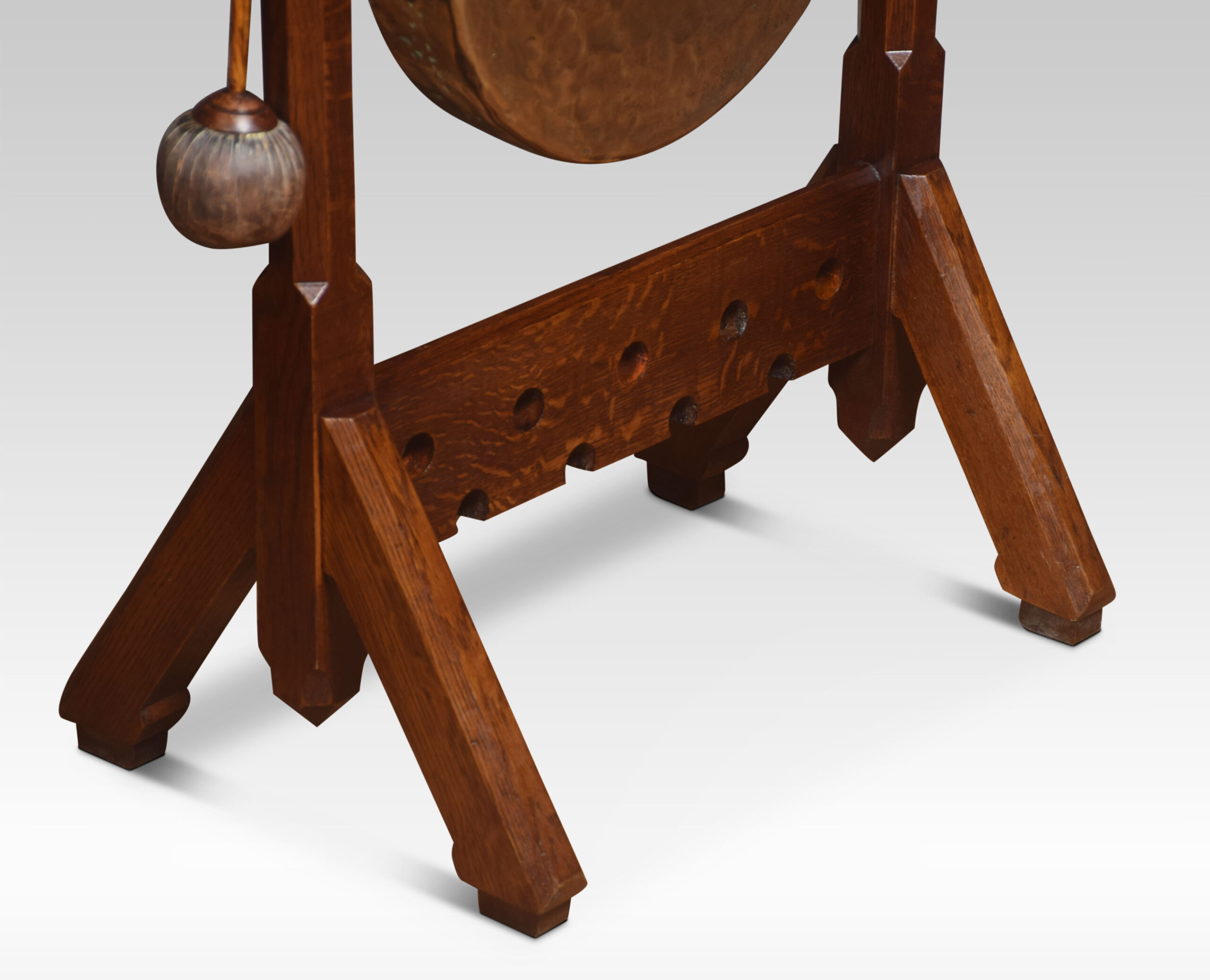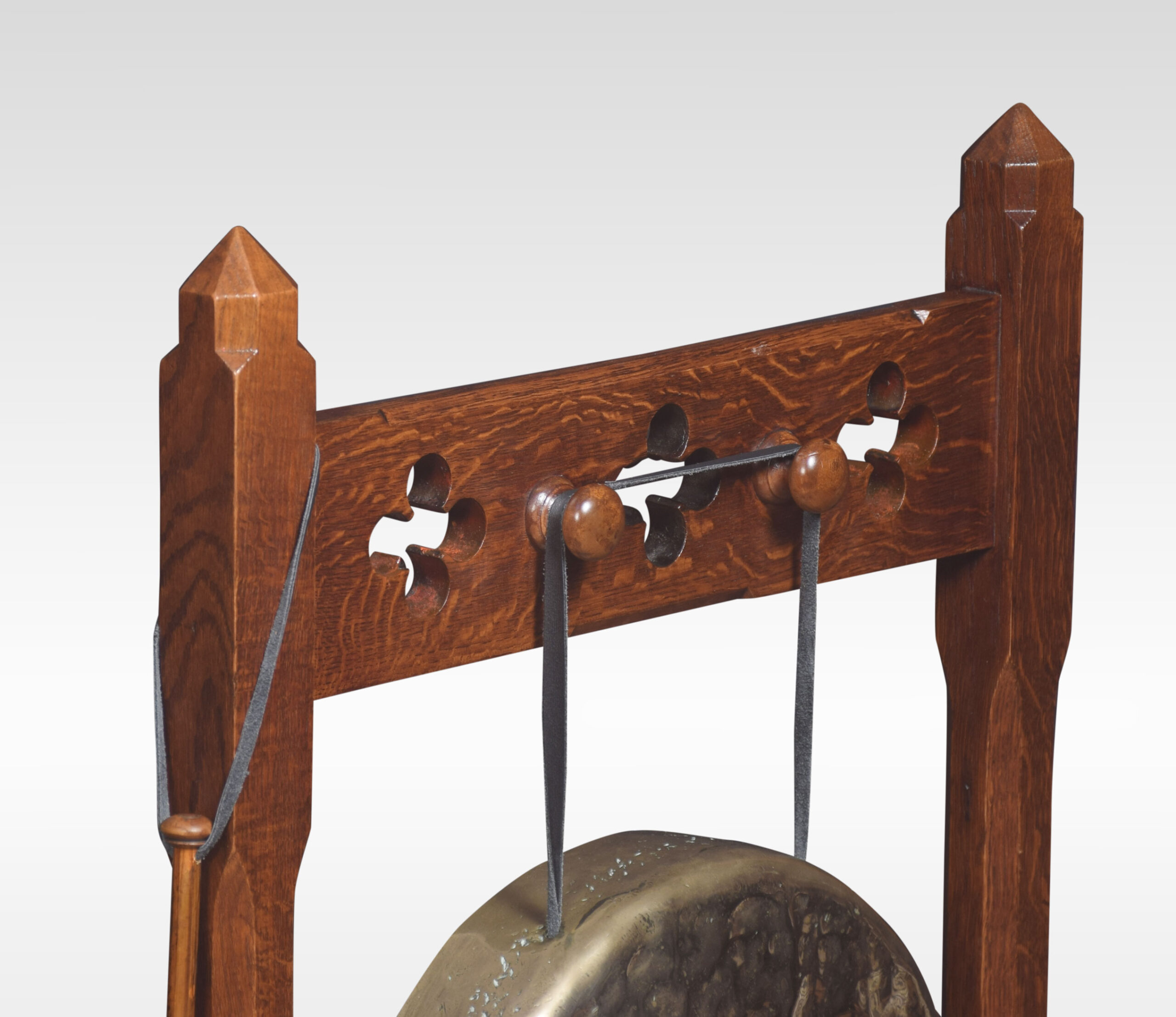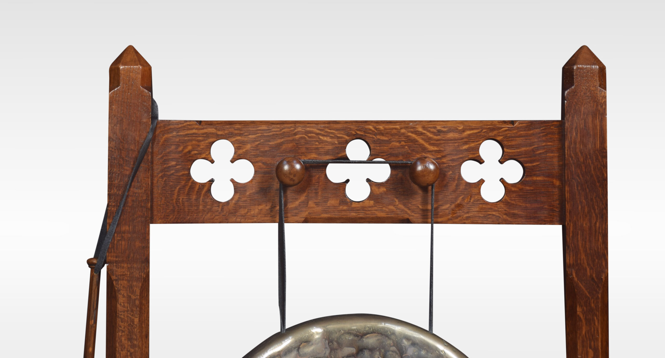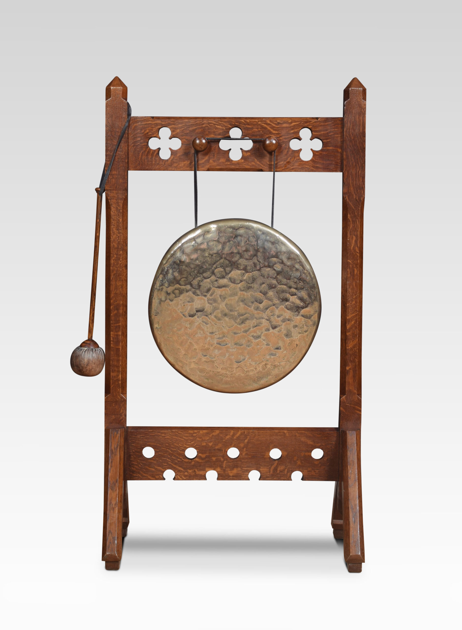Gothic revival dinner gong, in the style of Bruce Talbert. With an oak frame, brass gong, and original beater.