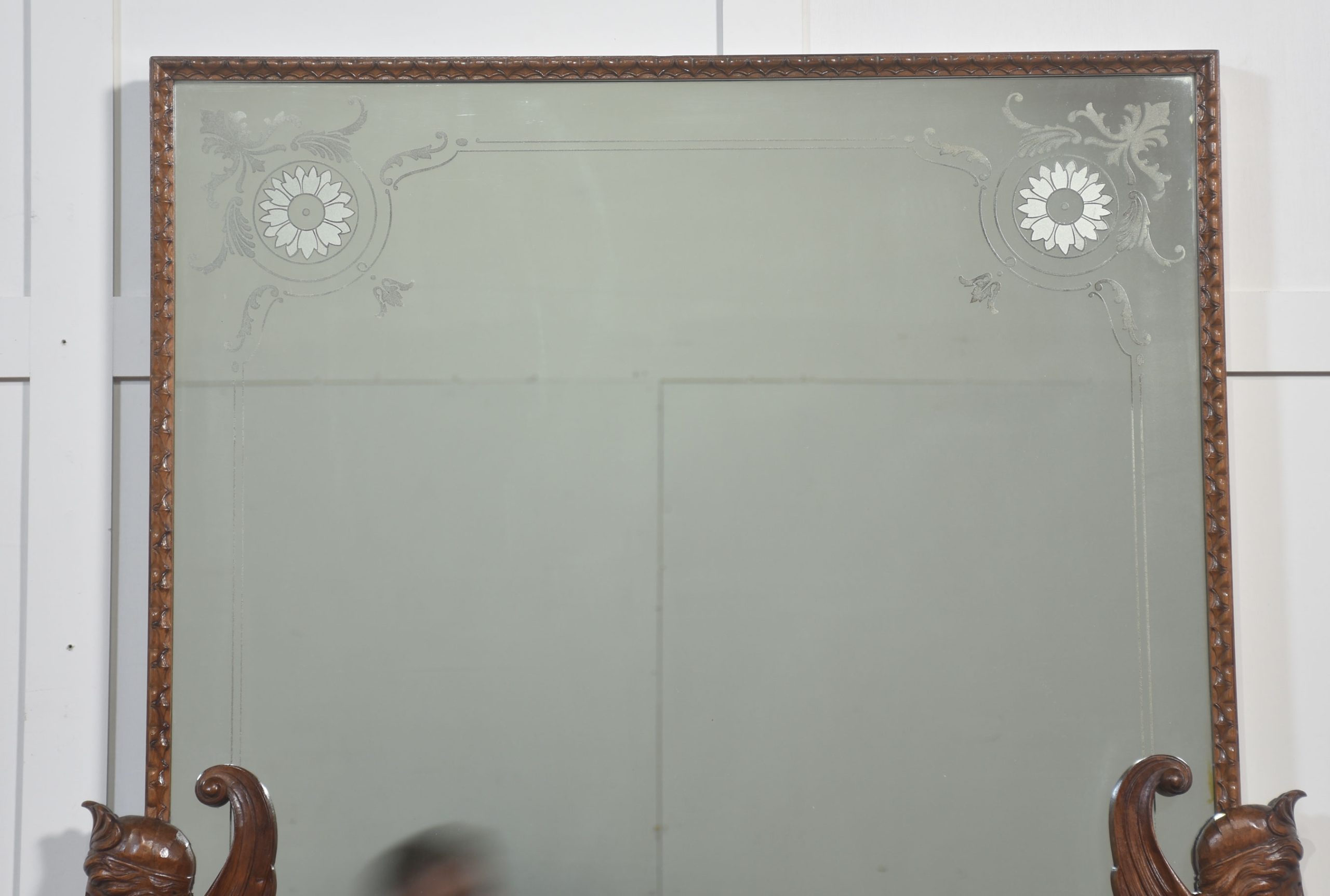 The mirror supports are masterfully sculpted caryatid-style figures, each displaying detailed plumage, drapery, and scrollwork bases—hallmarks of the bold decorative vocabulary of the Renaissance Revival style.
