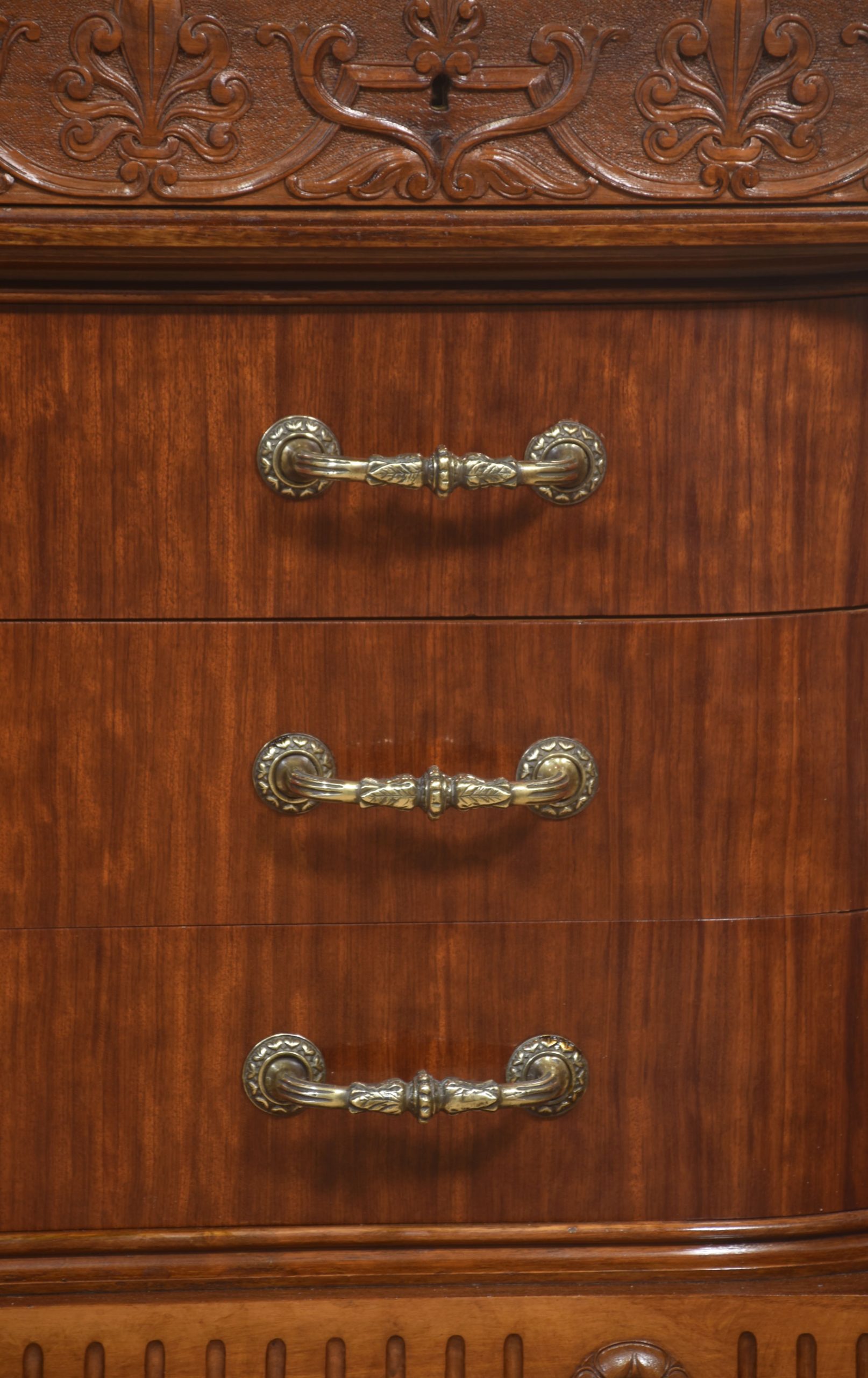 The chest is fitted with a beautifully polished marble surface in warm, softly veined tones. Beneath the carved foliate frieze are two long, slim concealed drawers, with three substantial full-width drawers forming the main body. Each drawer retains period-style brass handles and operates smoothly. The case is framed by turned and carved columns, with the lower apron decorated by fluting and rosette motifs and supported on boldly carved feet.