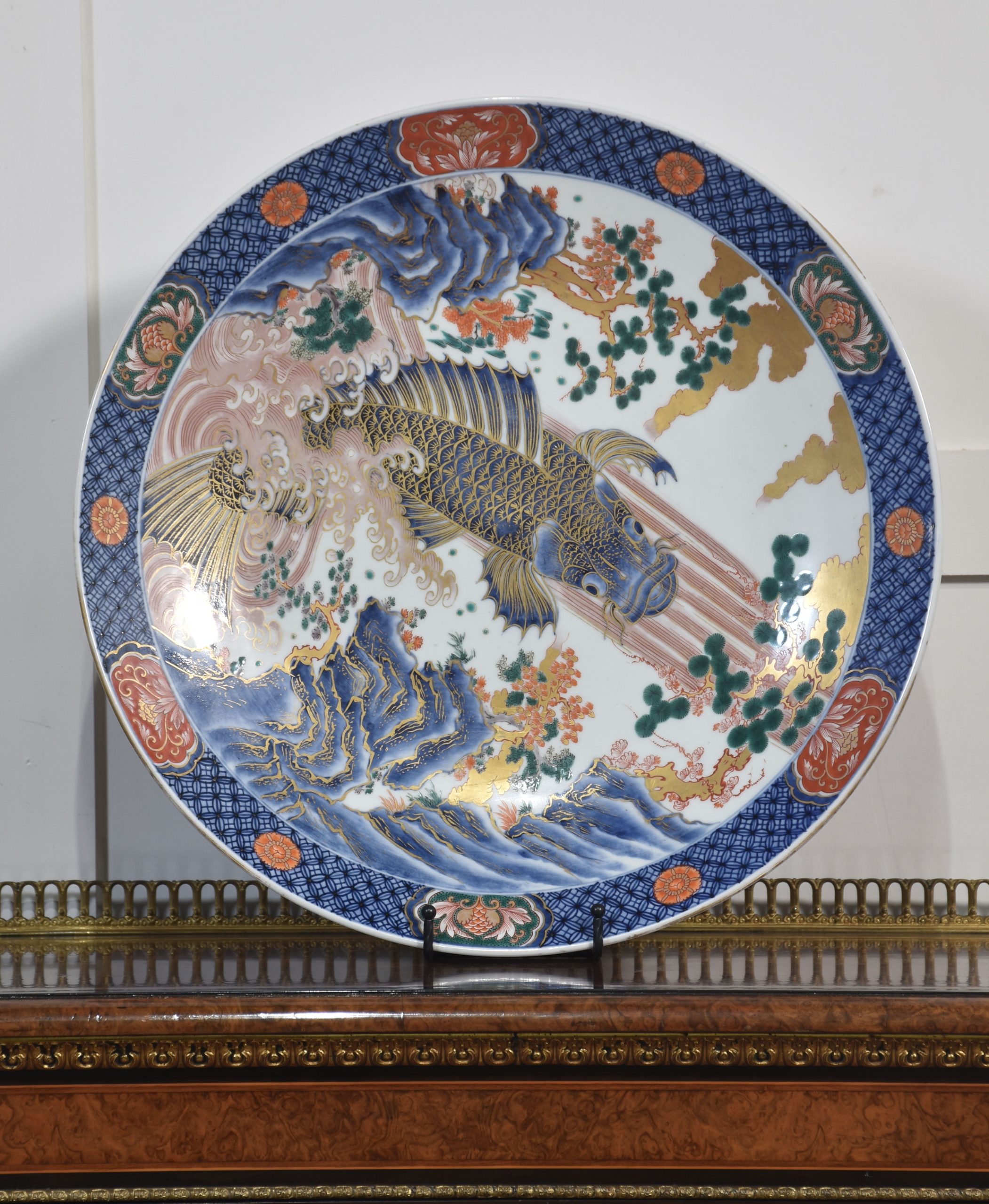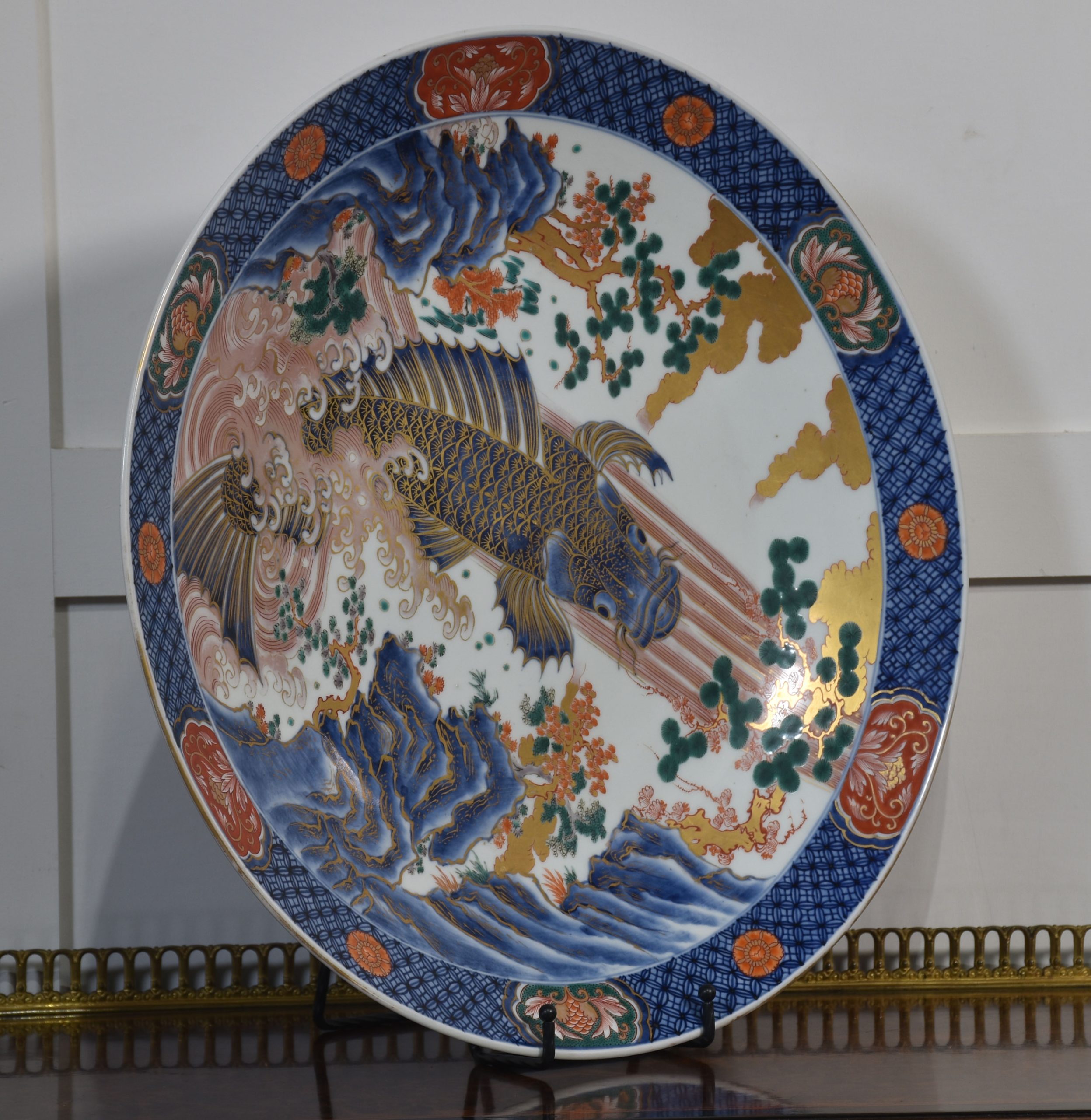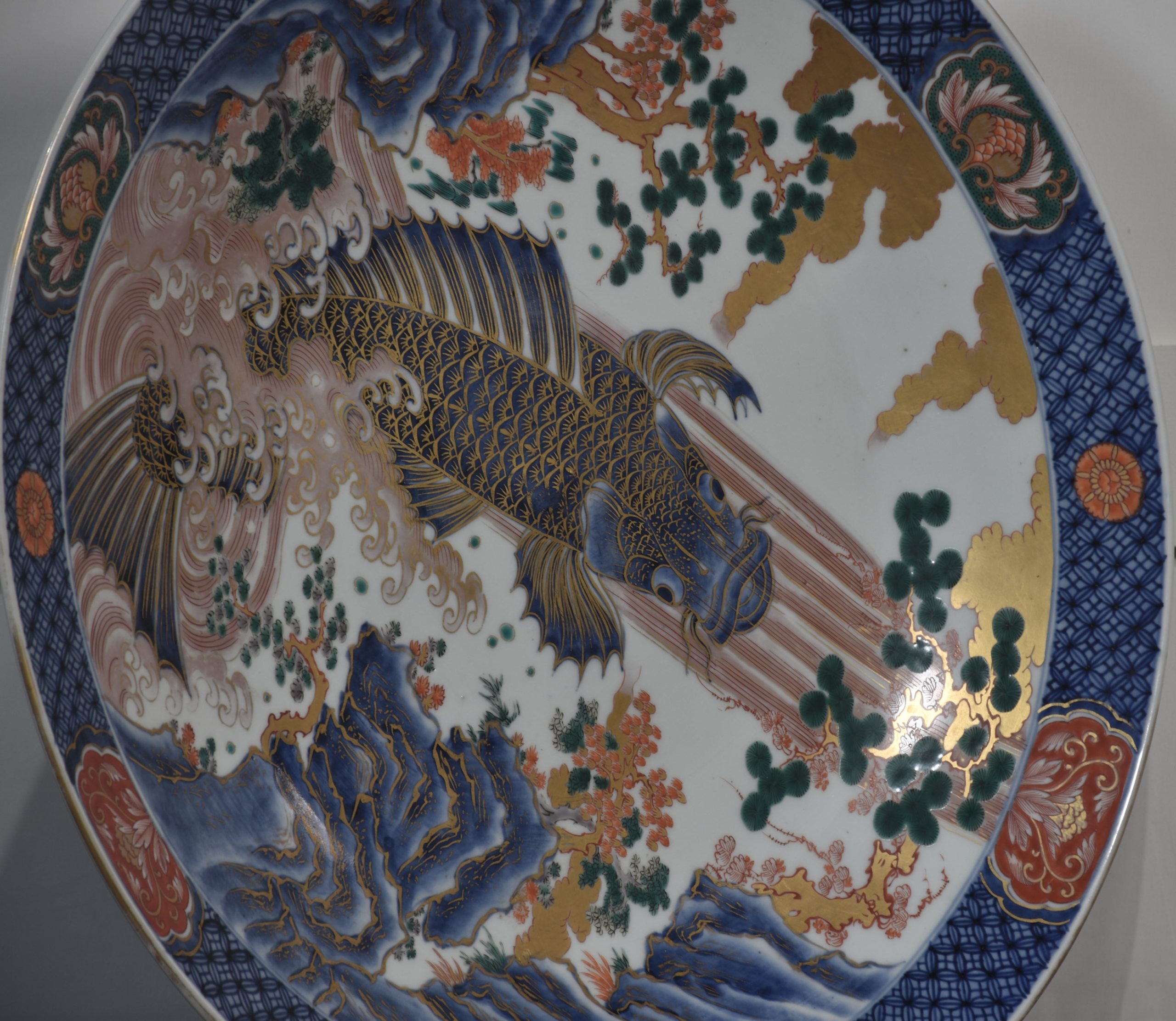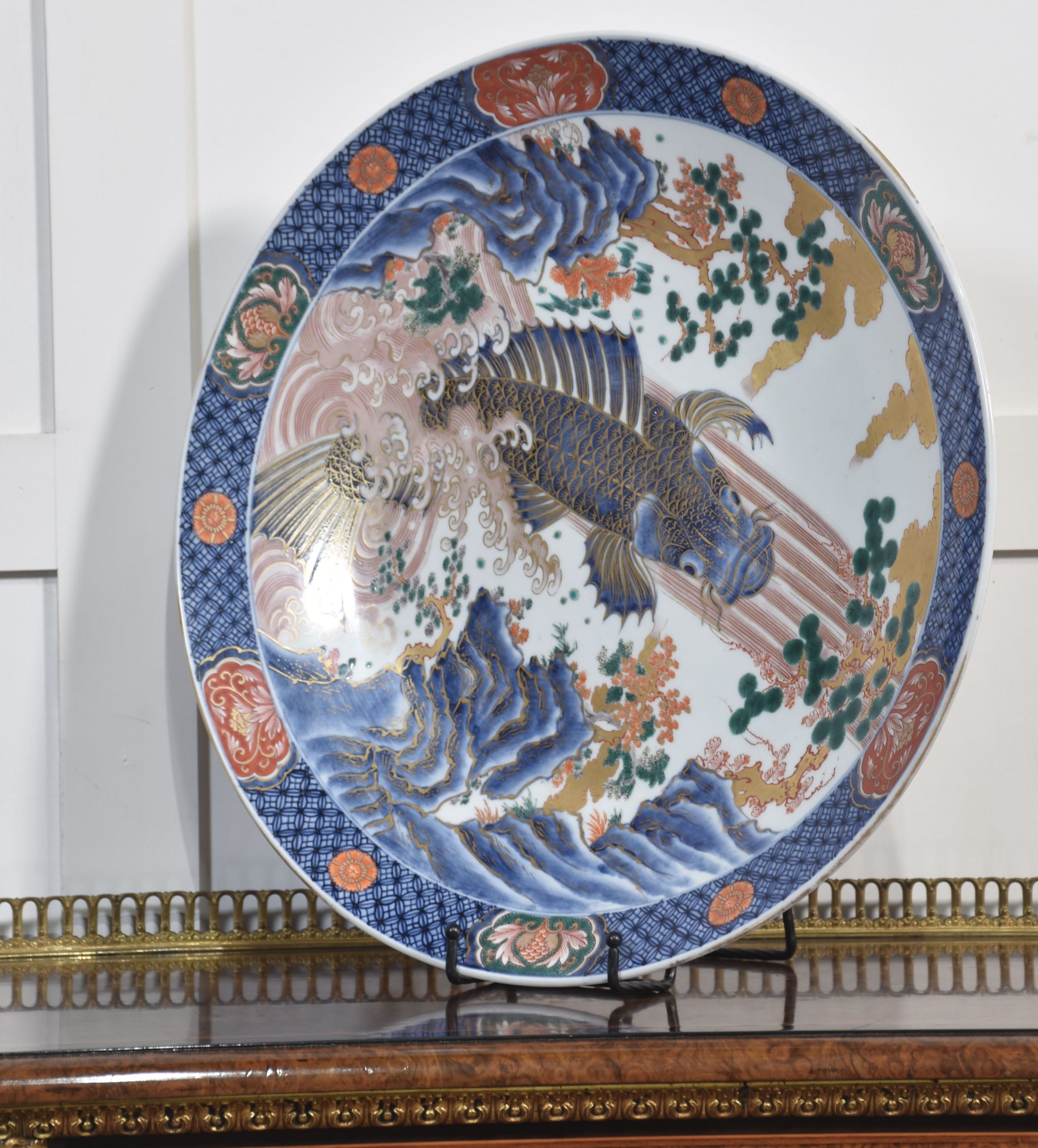 Japanese Imari plate, decorated with a leaping carp in traditional colours, heightened in gilt, six-character mark to the underside.