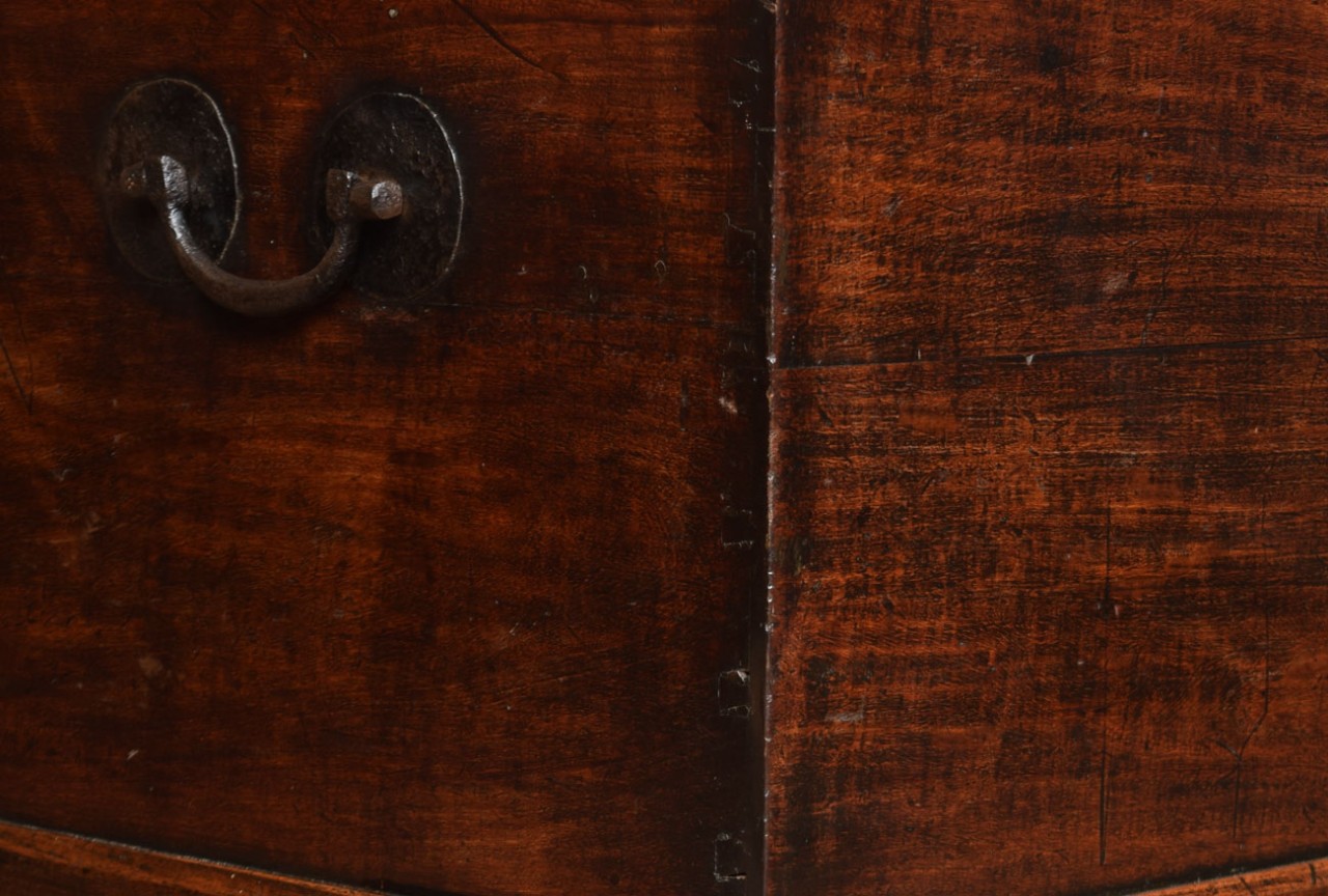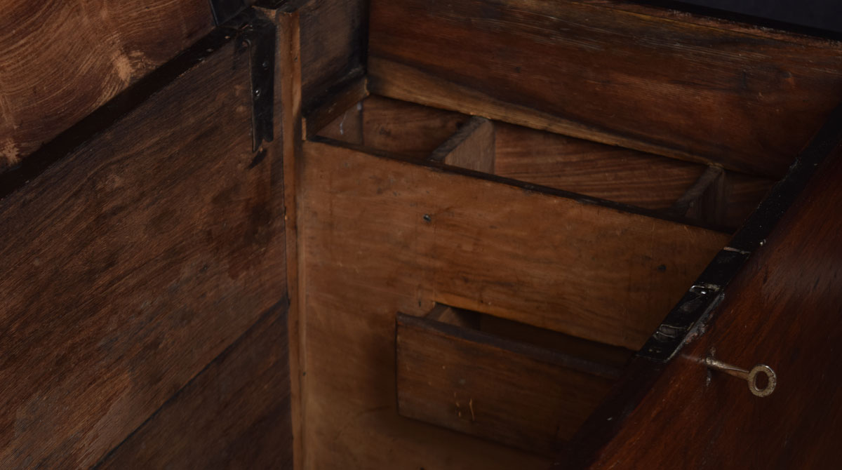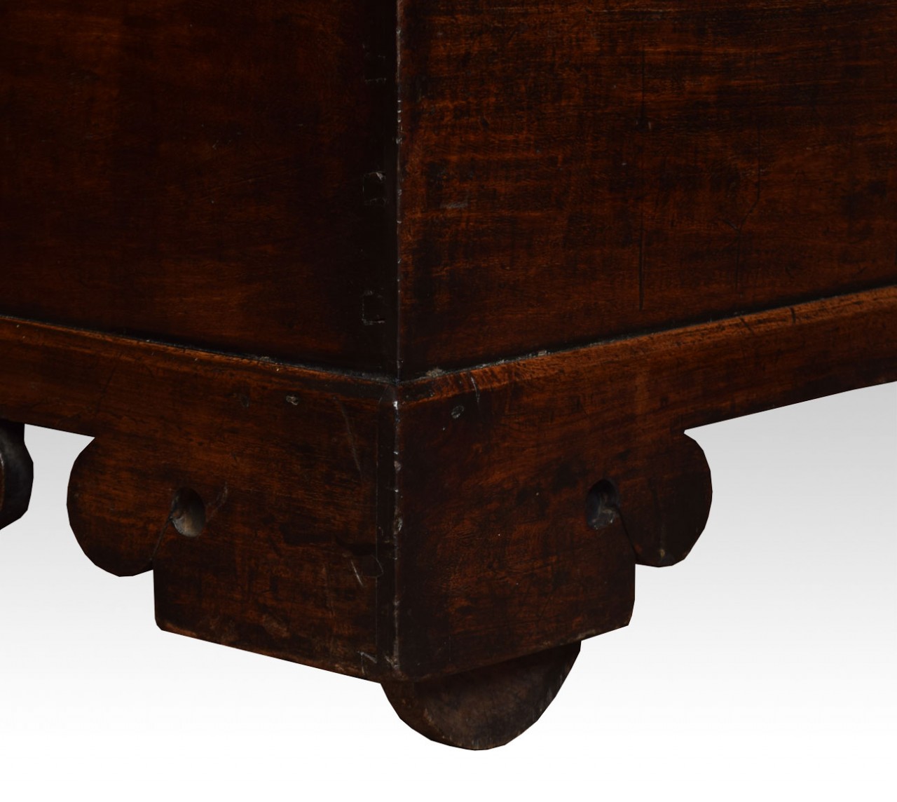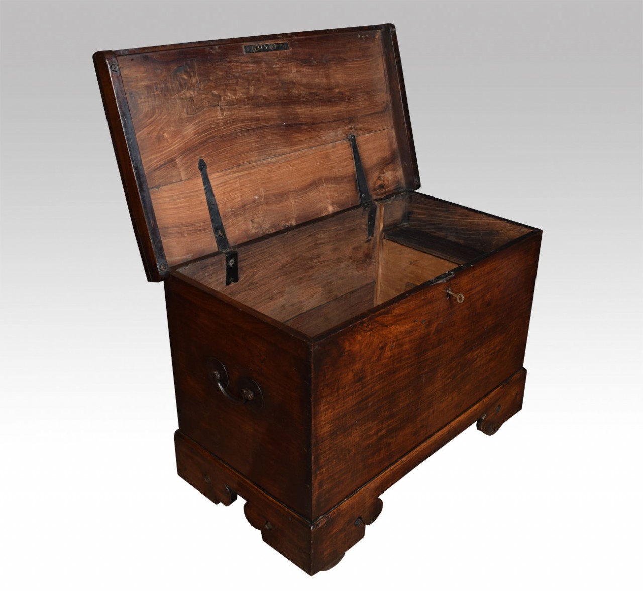 Product Description Large chest the hinged lid opening to reveal large storage area, having original lock raised up on bracket feet and