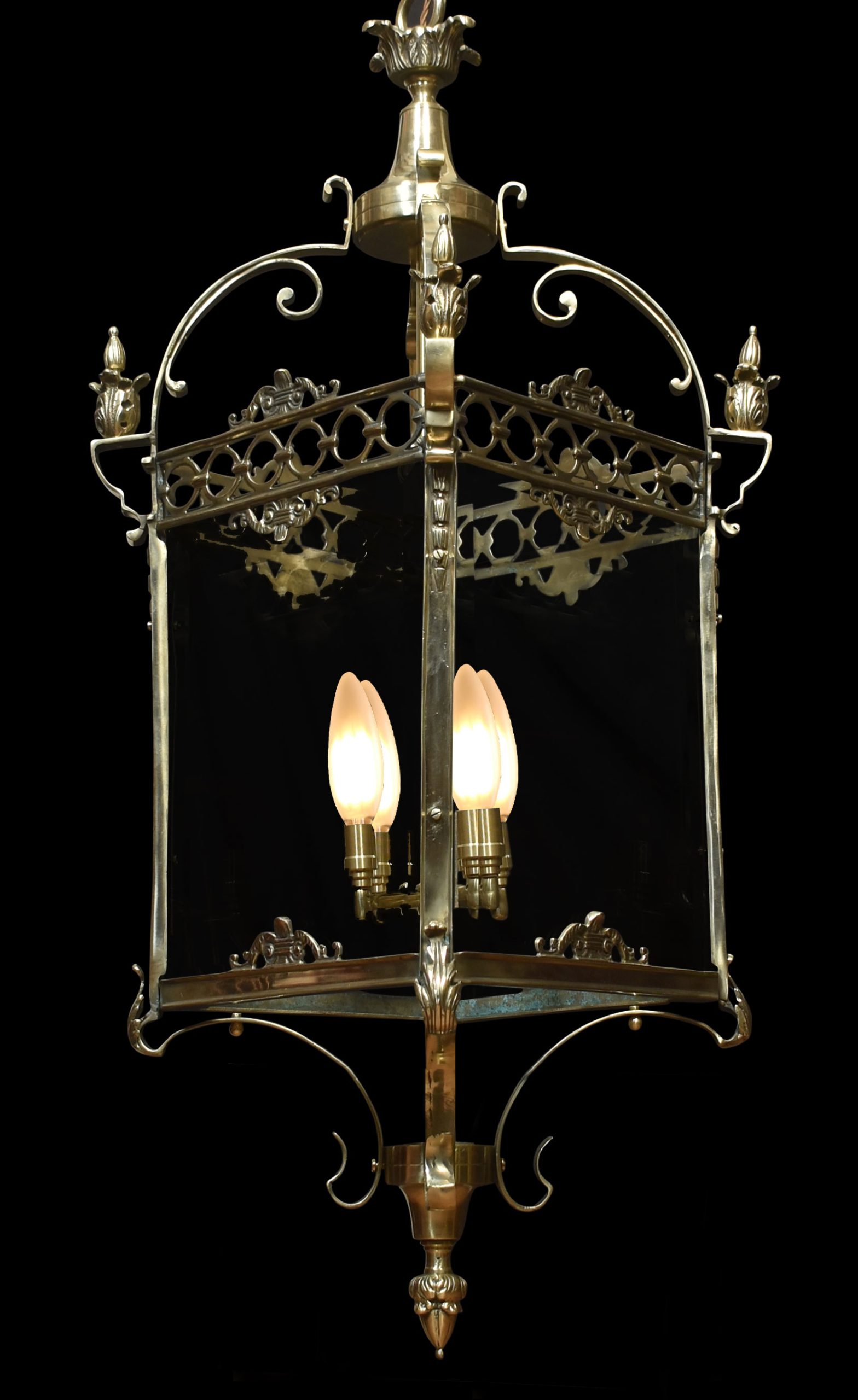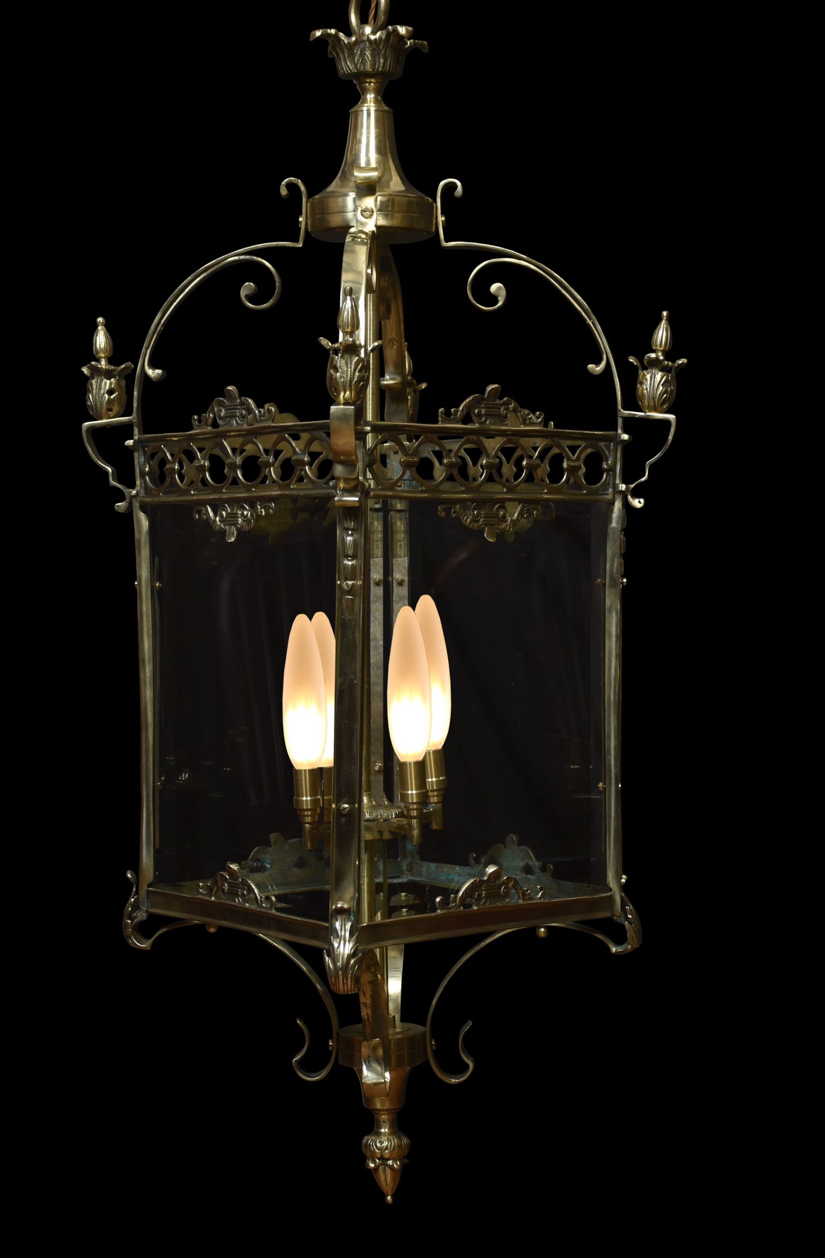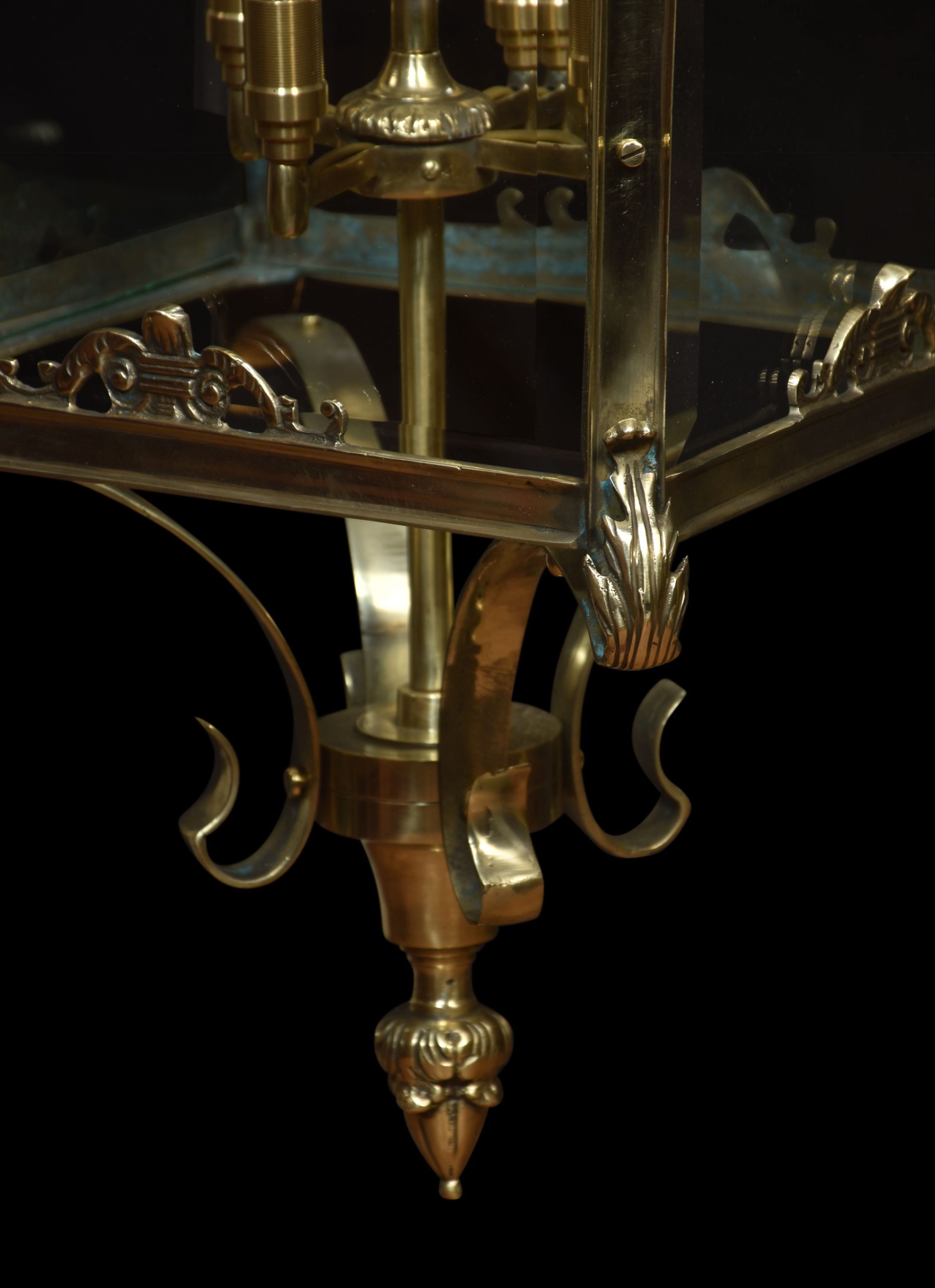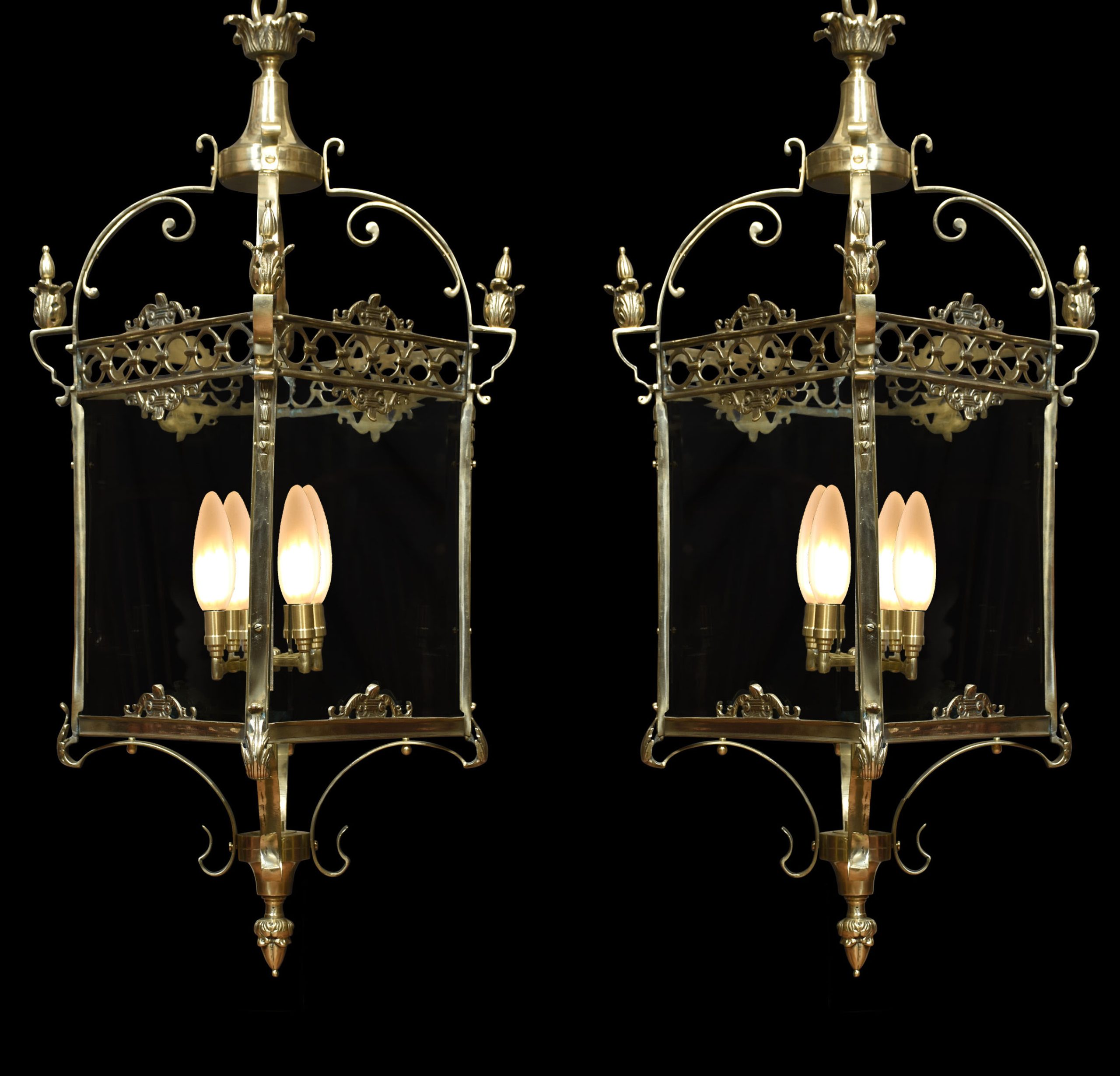 Large pair of hall lantern in 18th Century style, the scroll surmount above a square beveled glazed body, enclosing a four-light electrolier. The lanterns have been rewired.