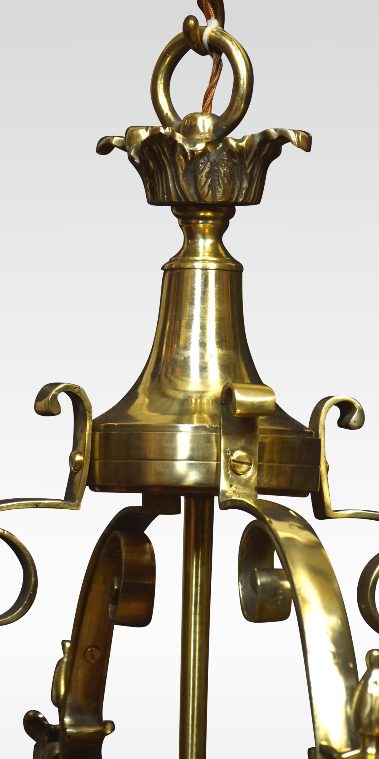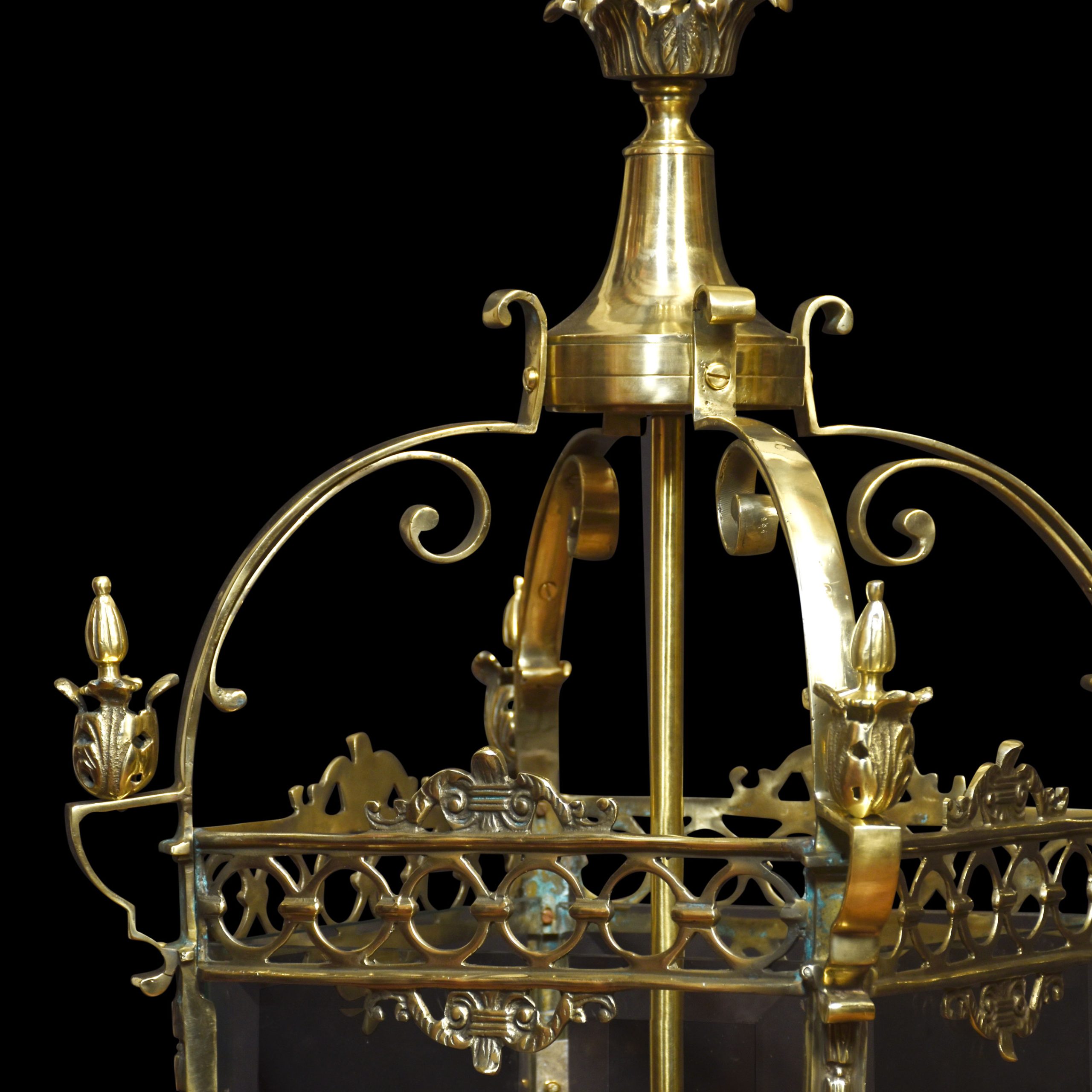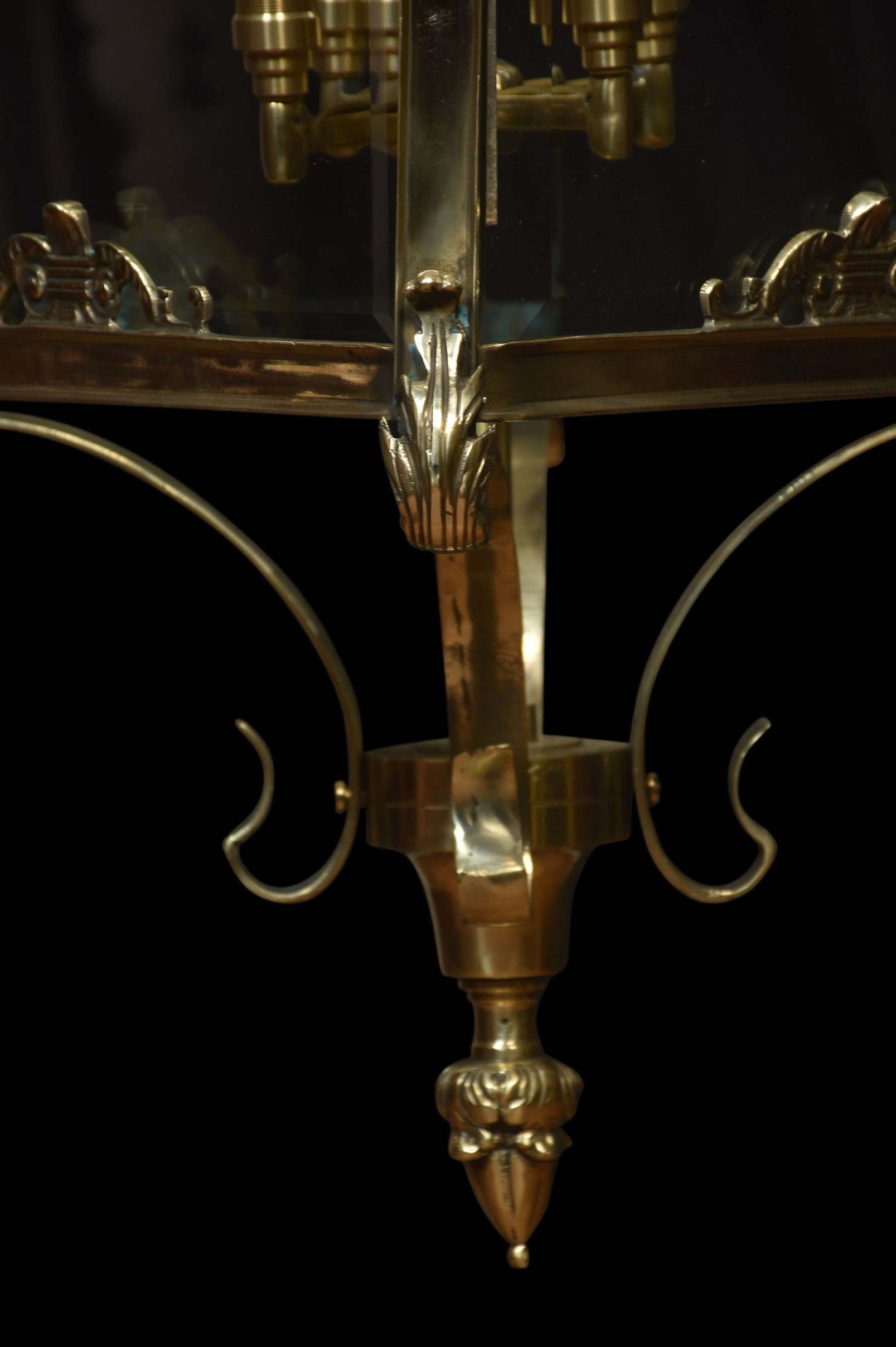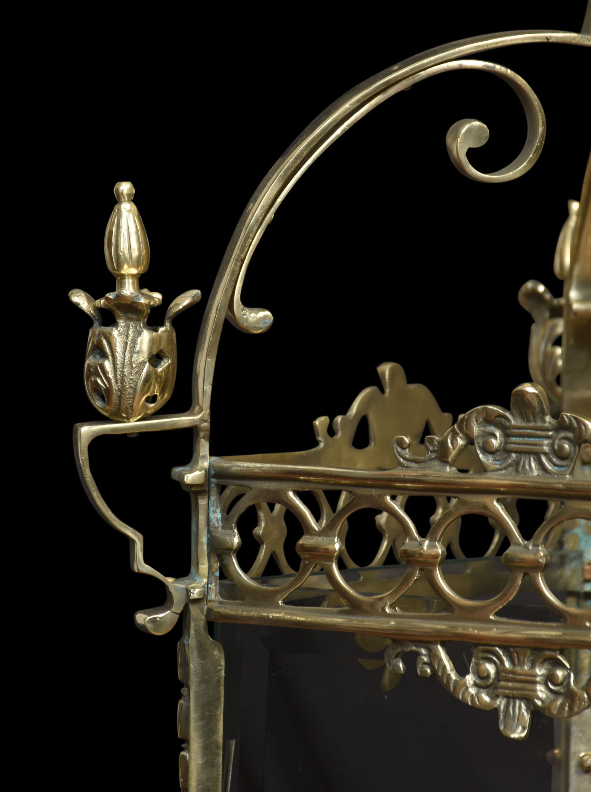 Large pair of hall lantern in 18th Century style, the scroll surmount above a square beveled glazed body, enclosing a four-light electrolier. The lanterns have been rewired.