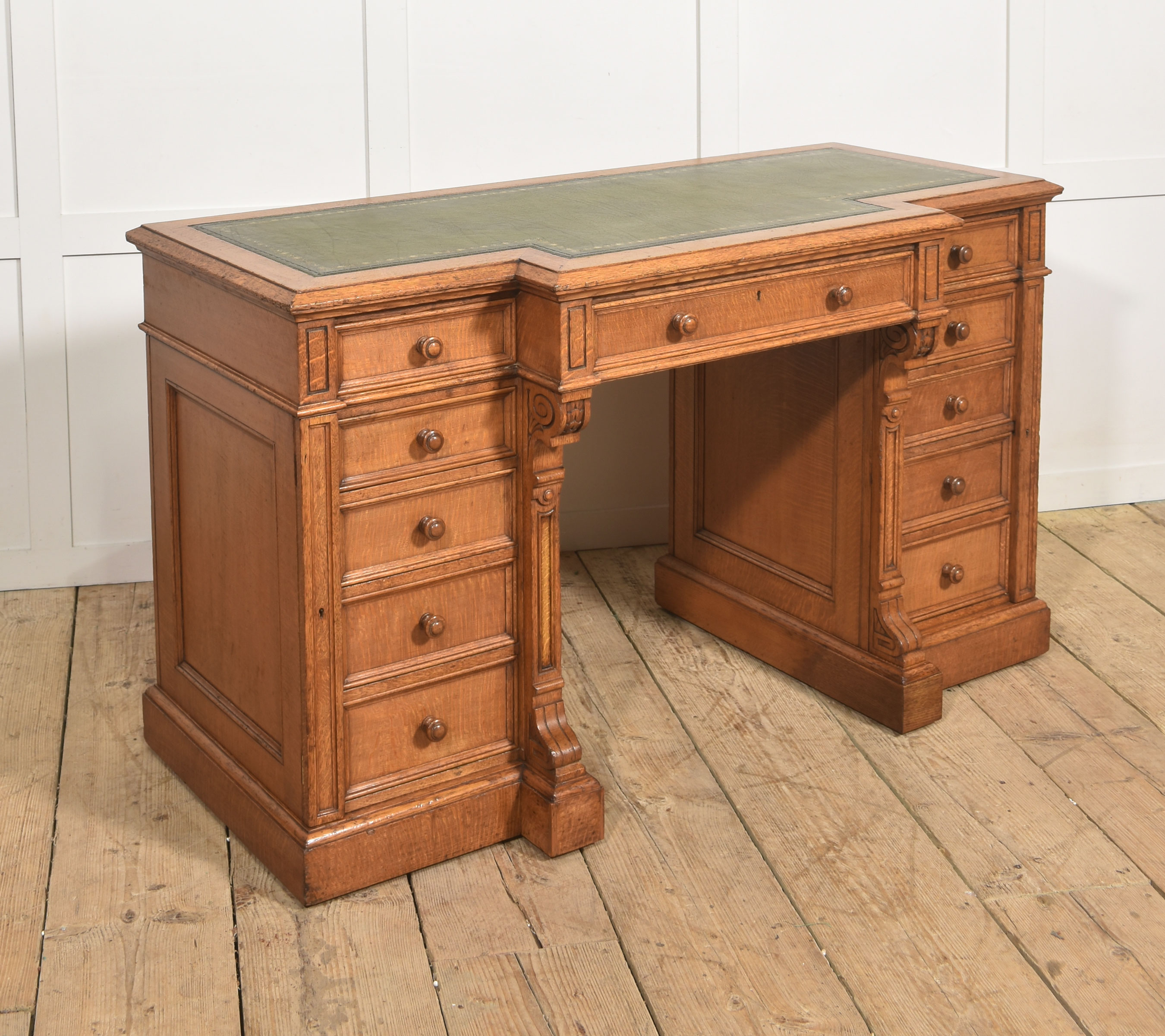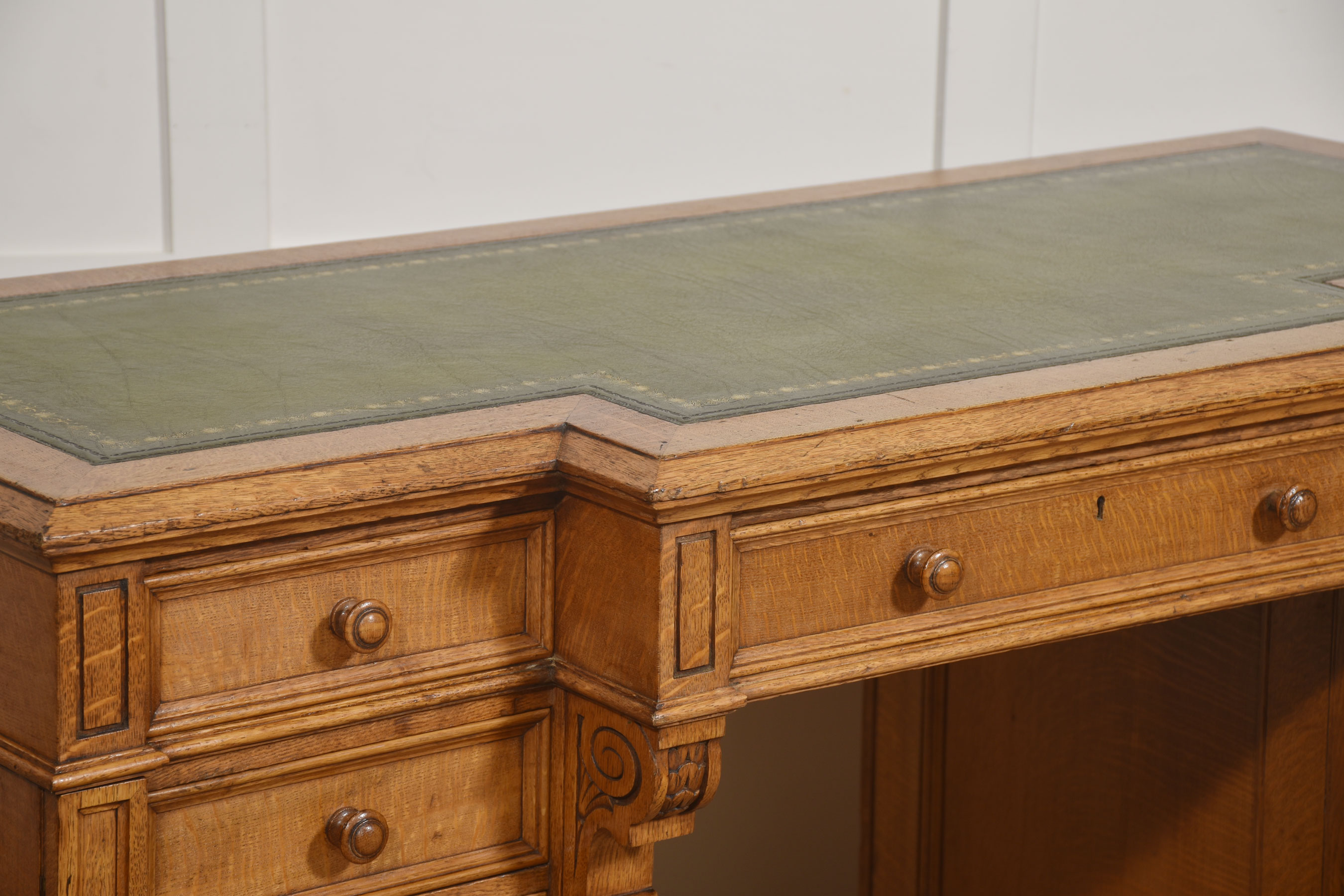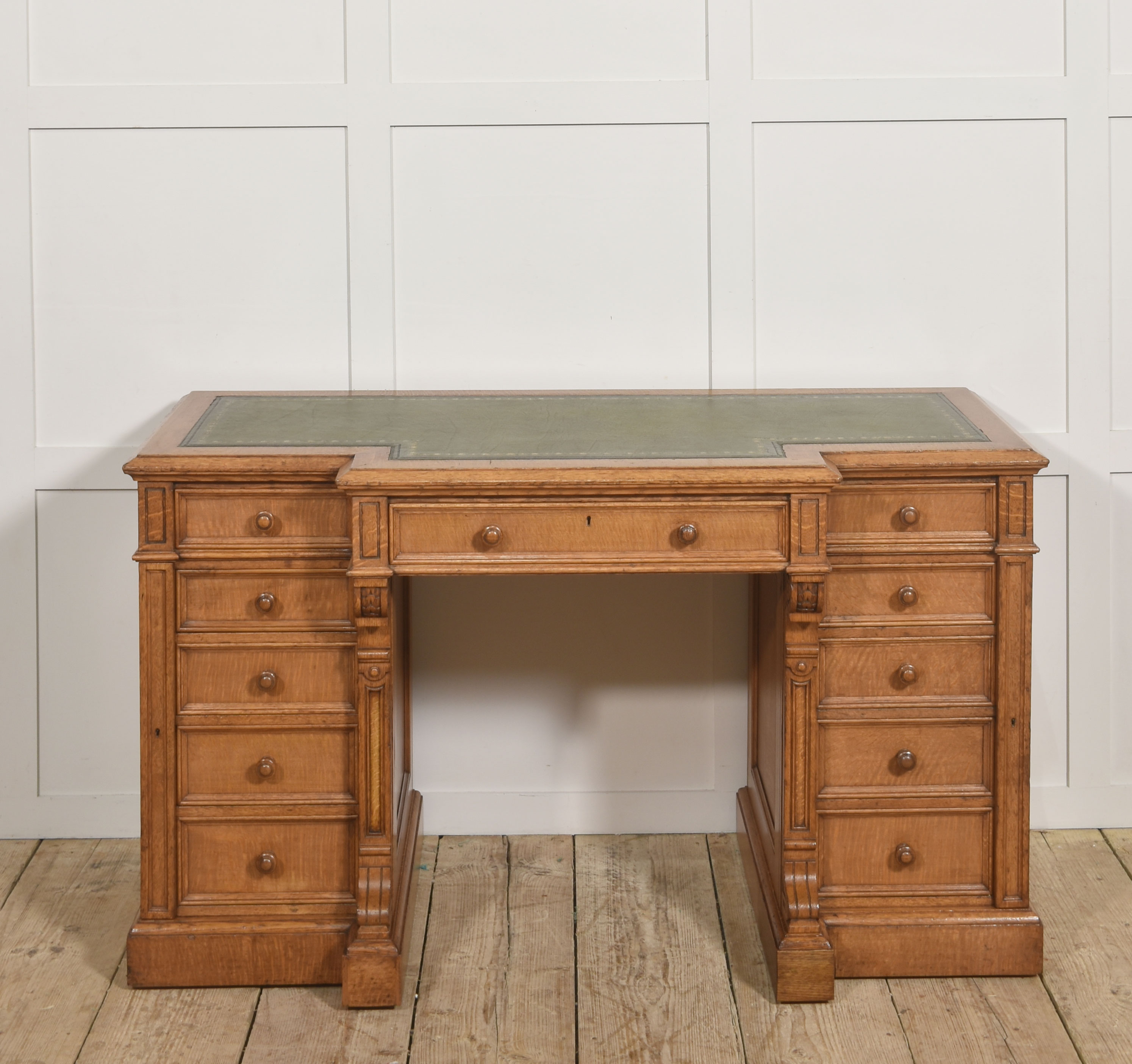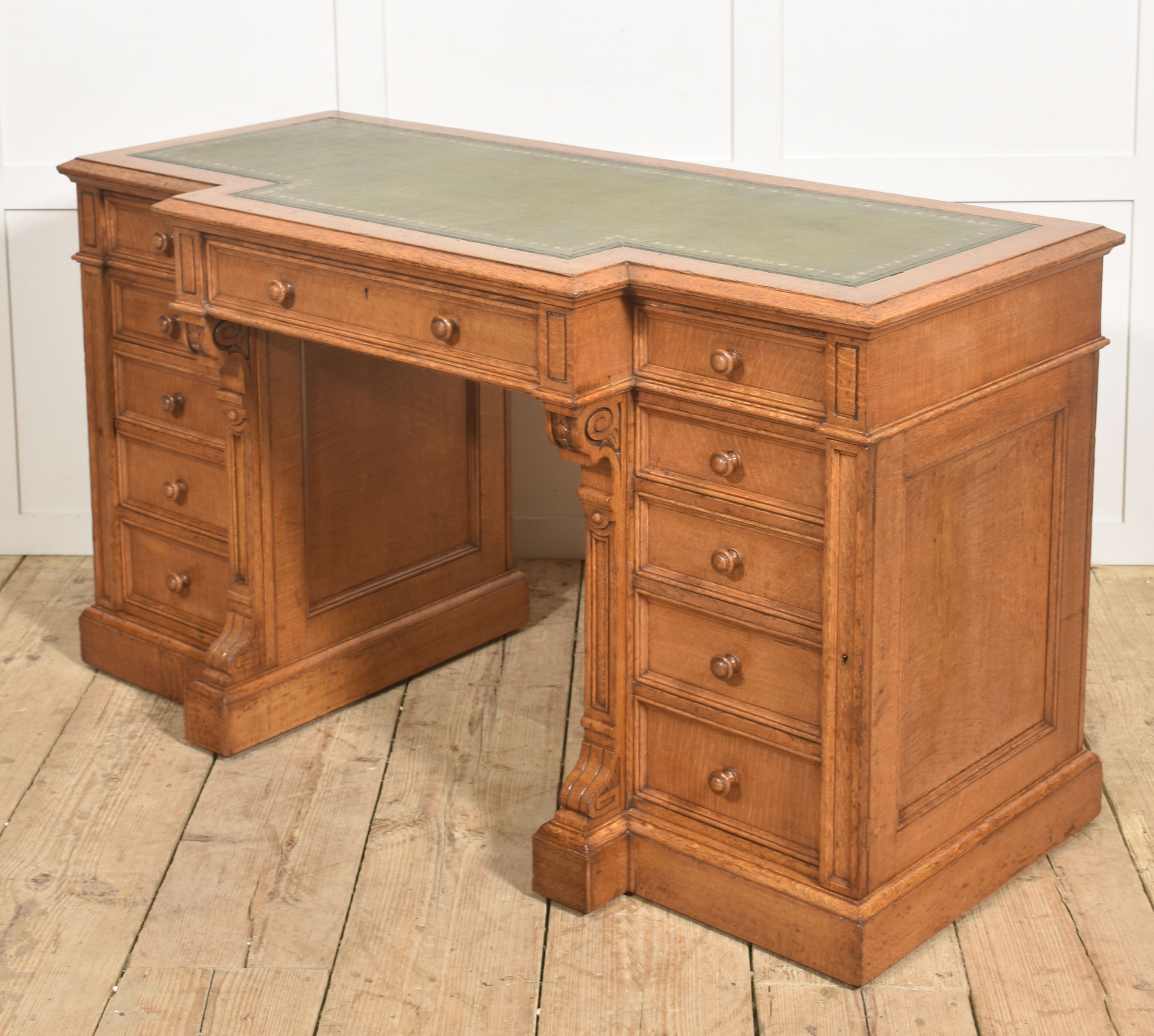 A well-proportioned late 19th-century pedestal desk in figured oak, of classic twin-pedestal form and retaining its original configuration. The rectangular top is inset with a gilt-tooled green leather writing surface, shaped with a central breakfront projection to the front edge, providing both visual emphasis and practical working depth.