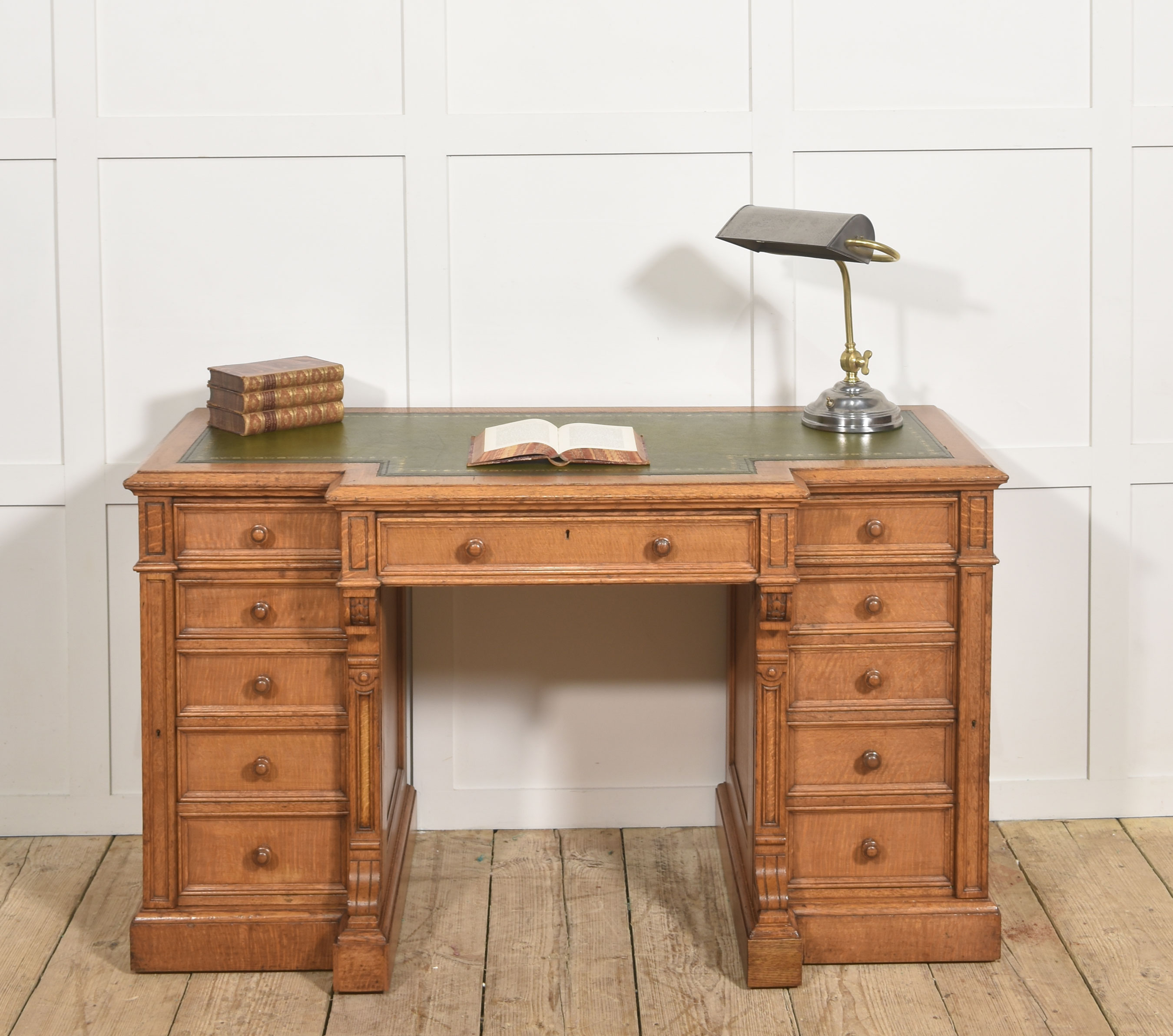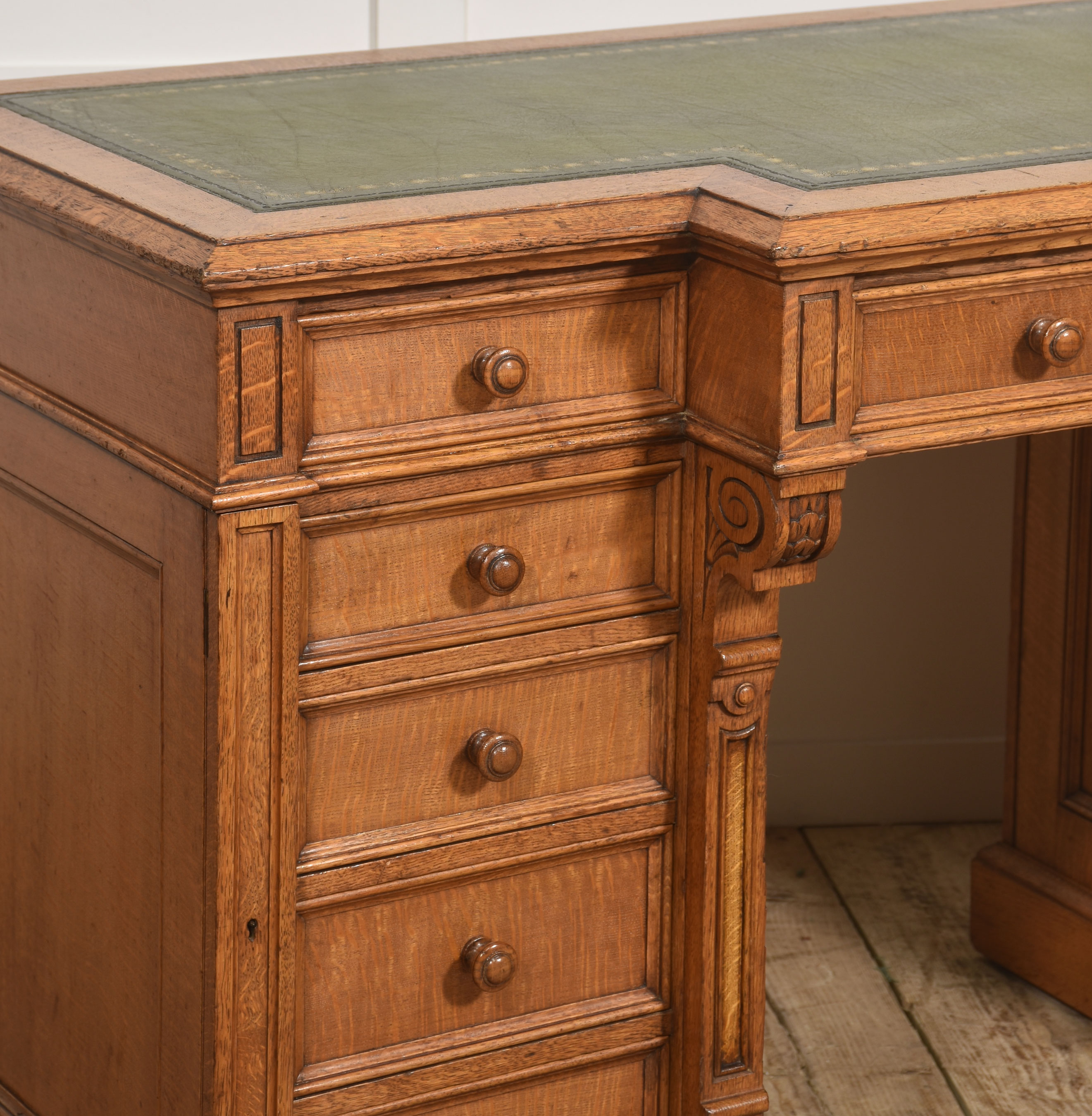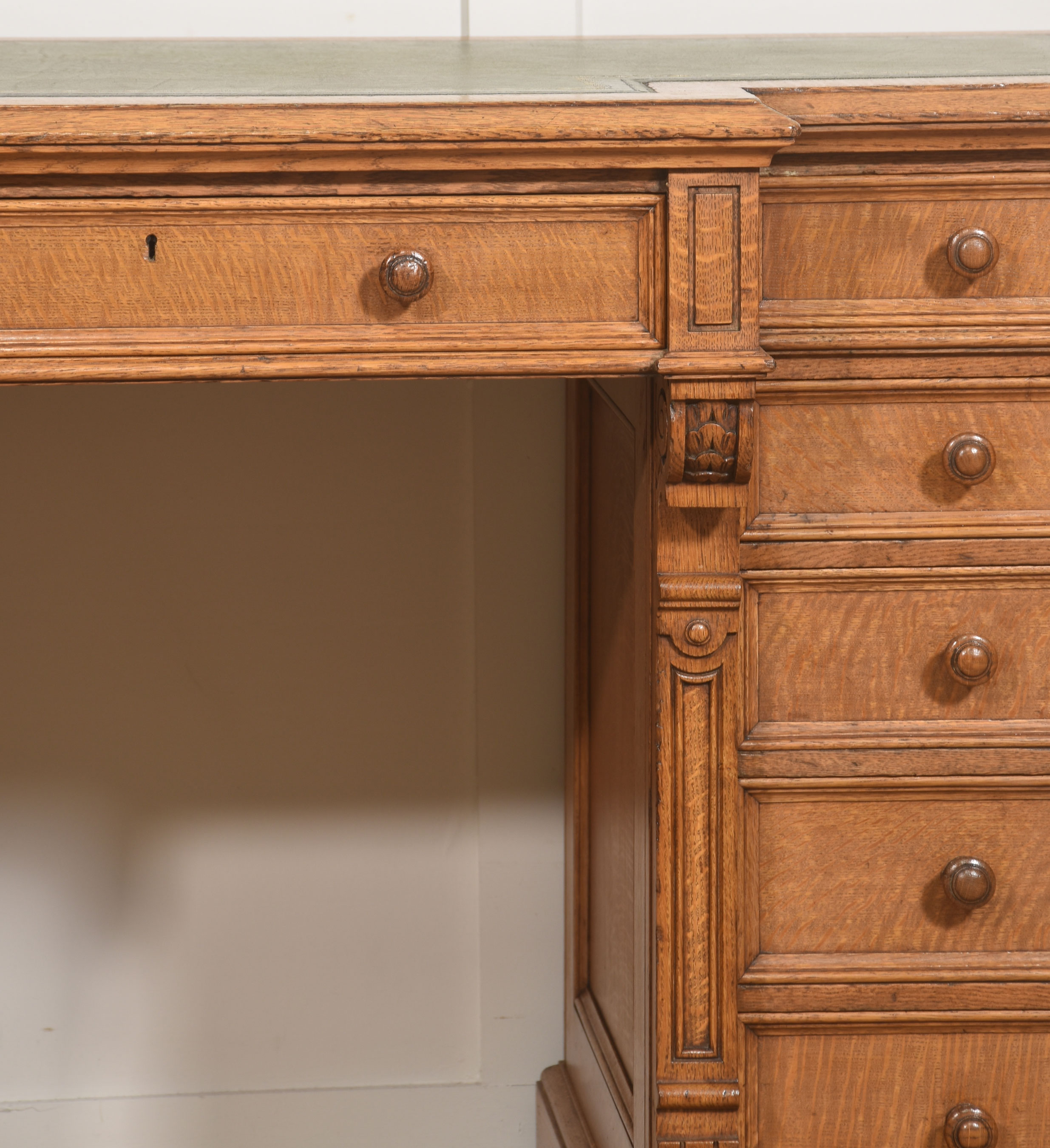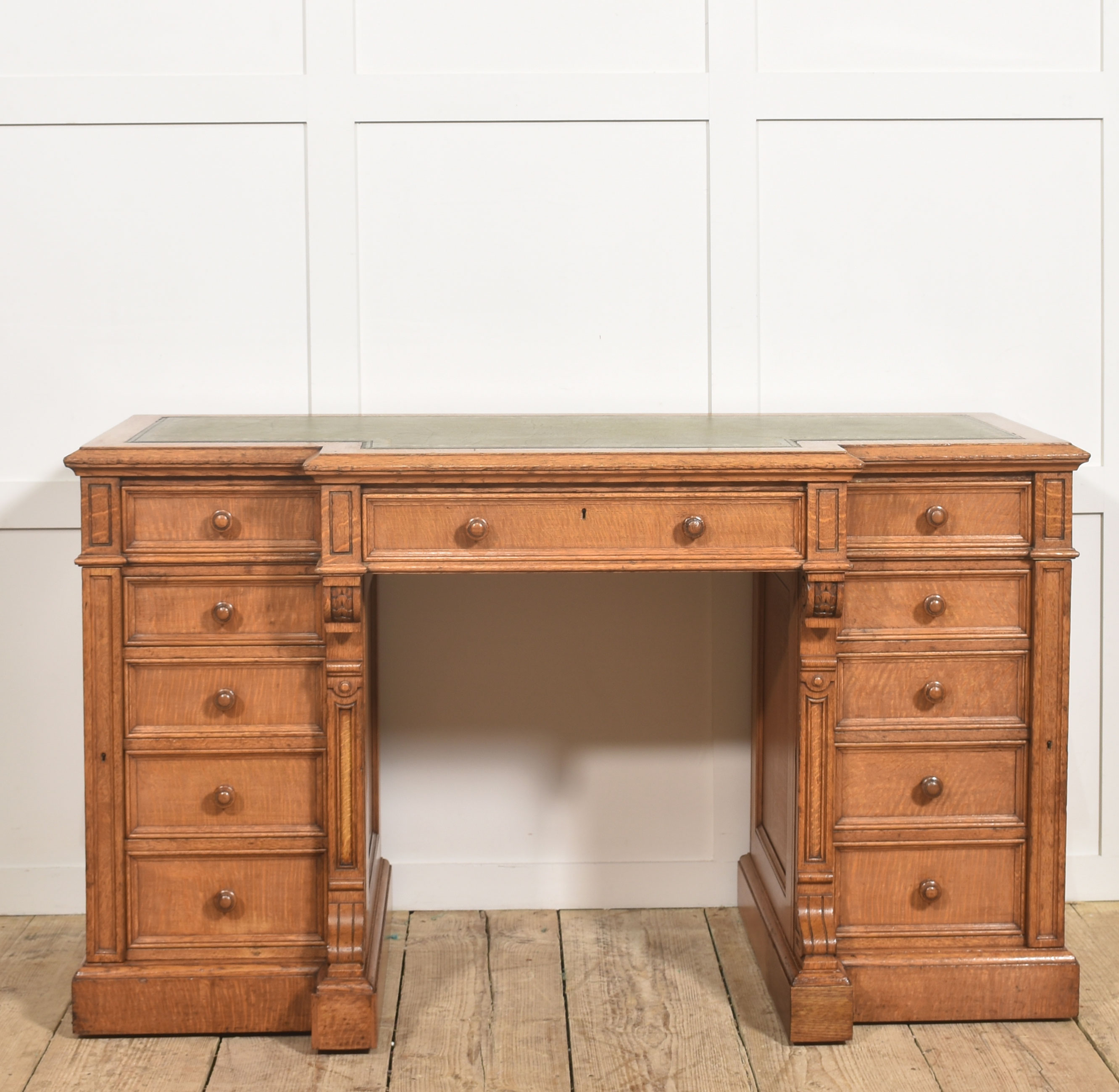 A well-proportioned late 19th-century pedestal desk in figured oak, of classic twin-pedestal form and retaining its original configuration. The rectangular top is inset with a gilt-tooled green leather writing surface, shaped with a central breakfront projection to the front edge, providing both visual emphasis and practical working depth.