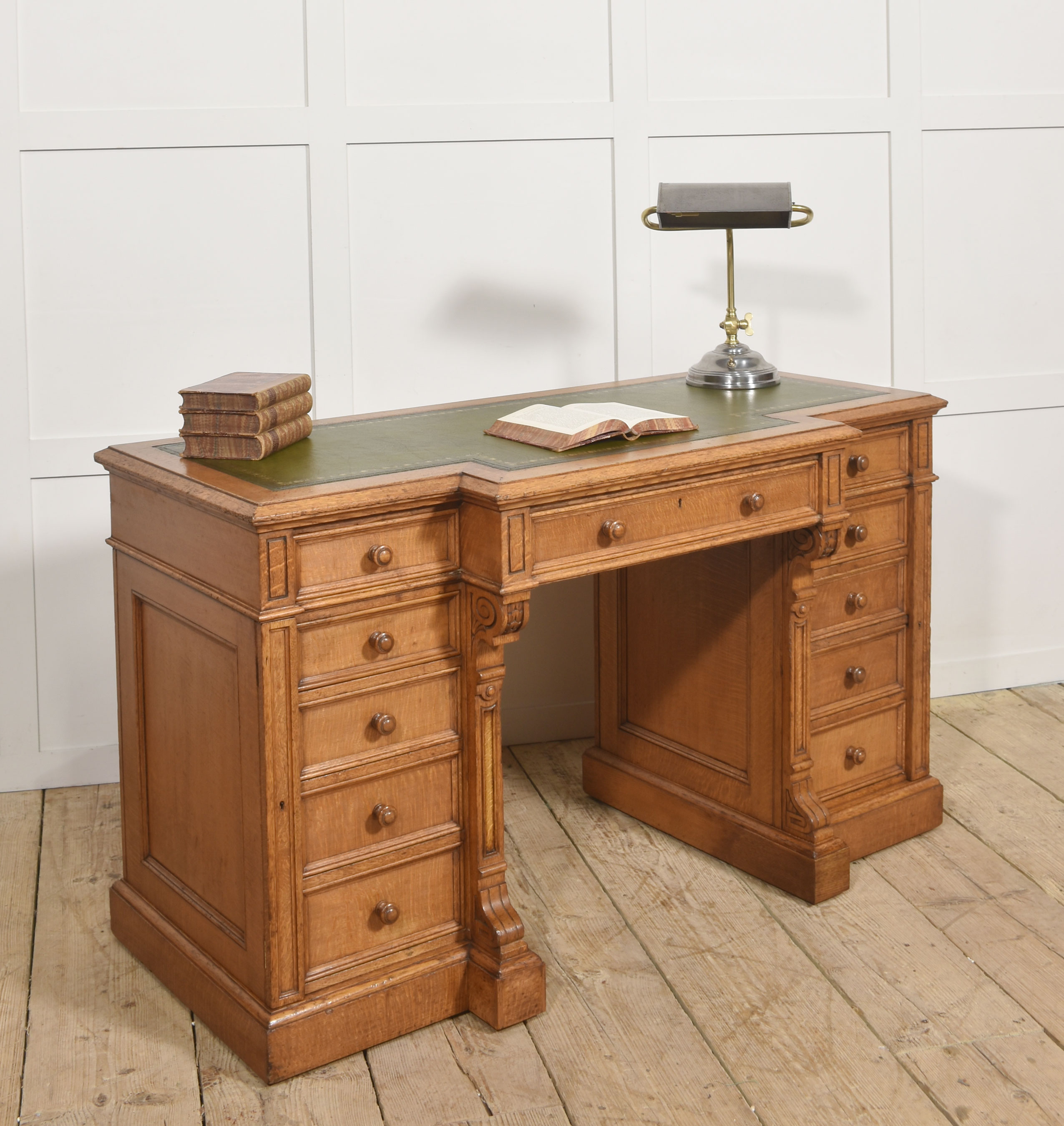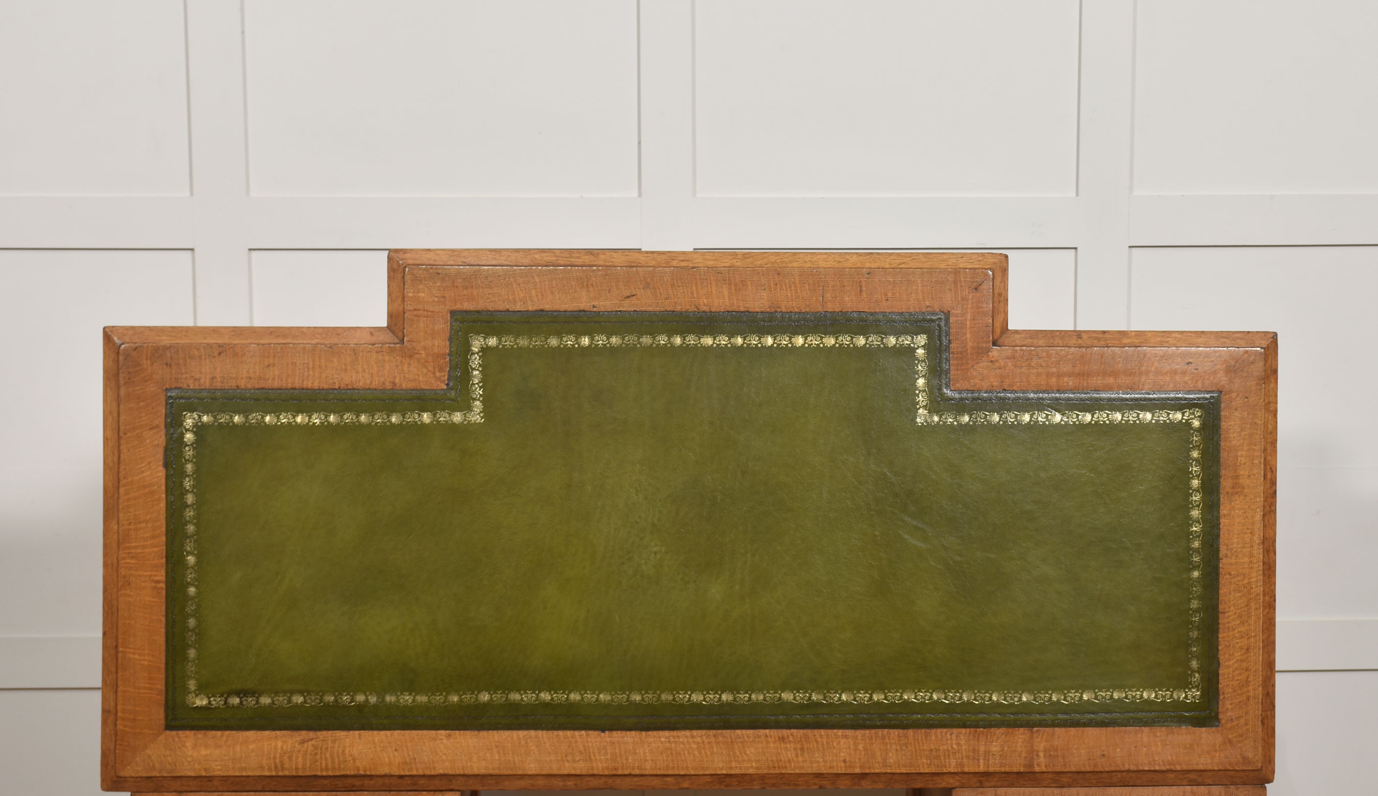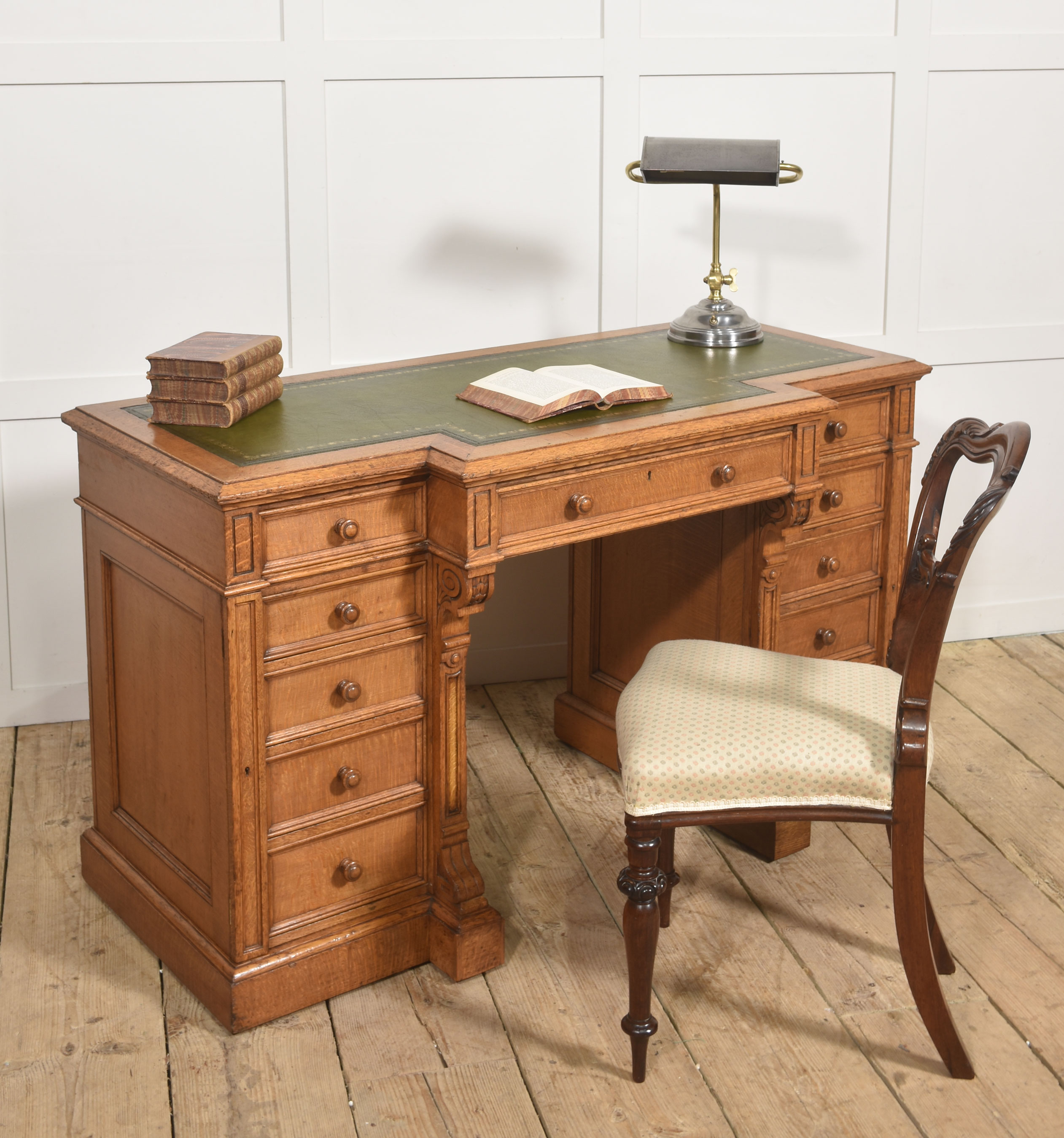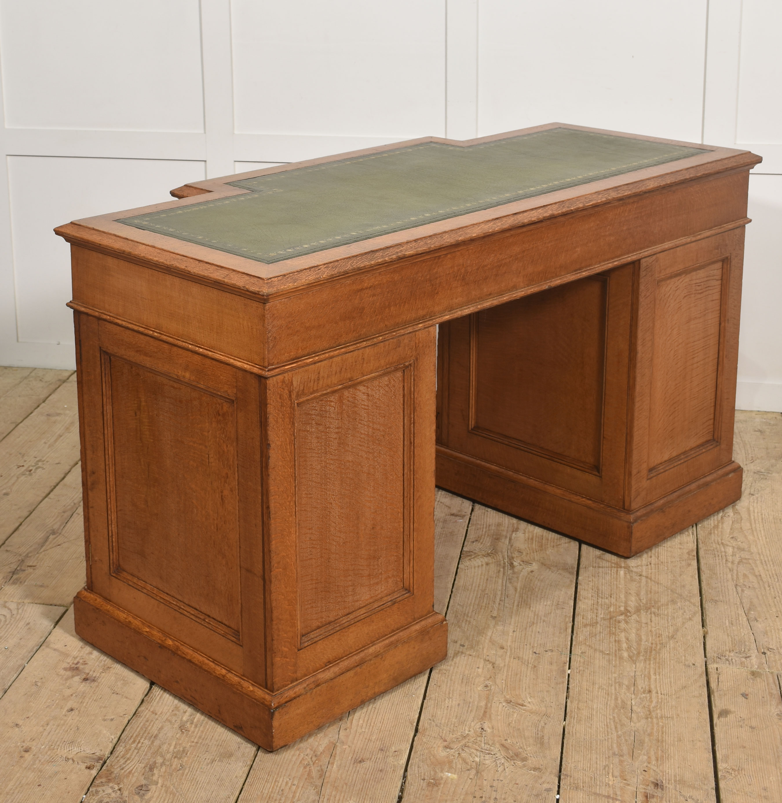 A well-proportioned late 19th-century pedestal desk in figured oak, of classic twin-pedestal form and retaining its original configuration. The rectangular top is inset with a gilt-tooled green leather writing surface, shaped with a central breakfront projection to the front edge, providing both visual emphasis and practical working depth.