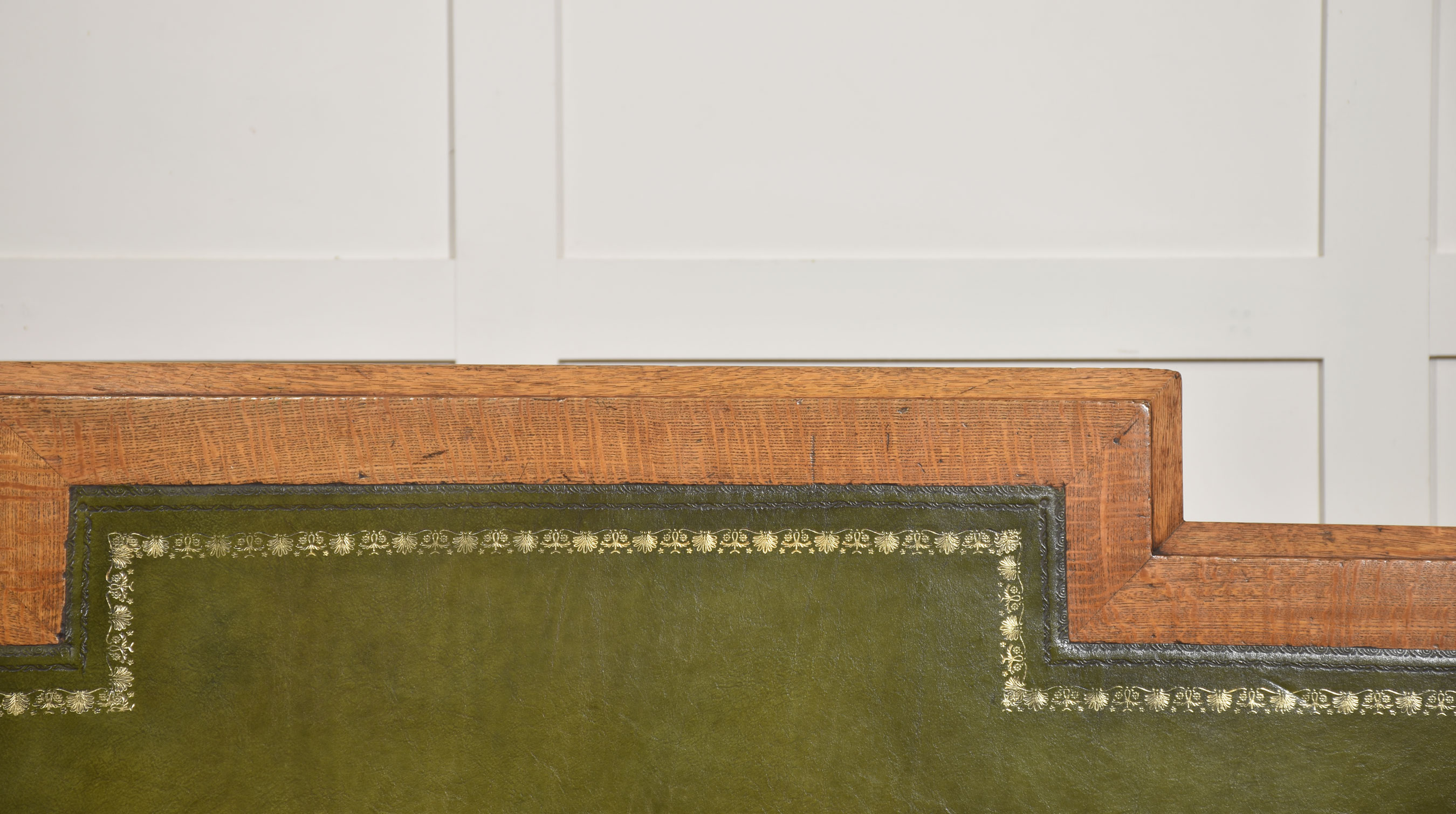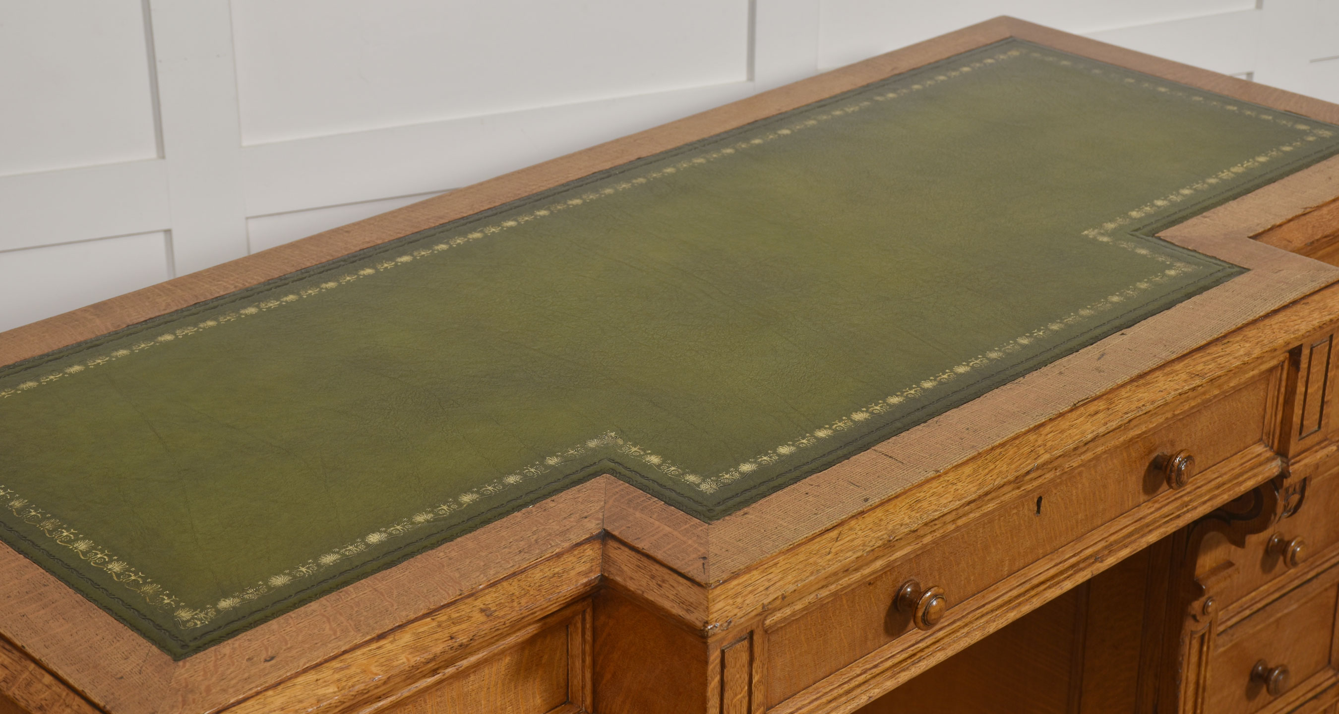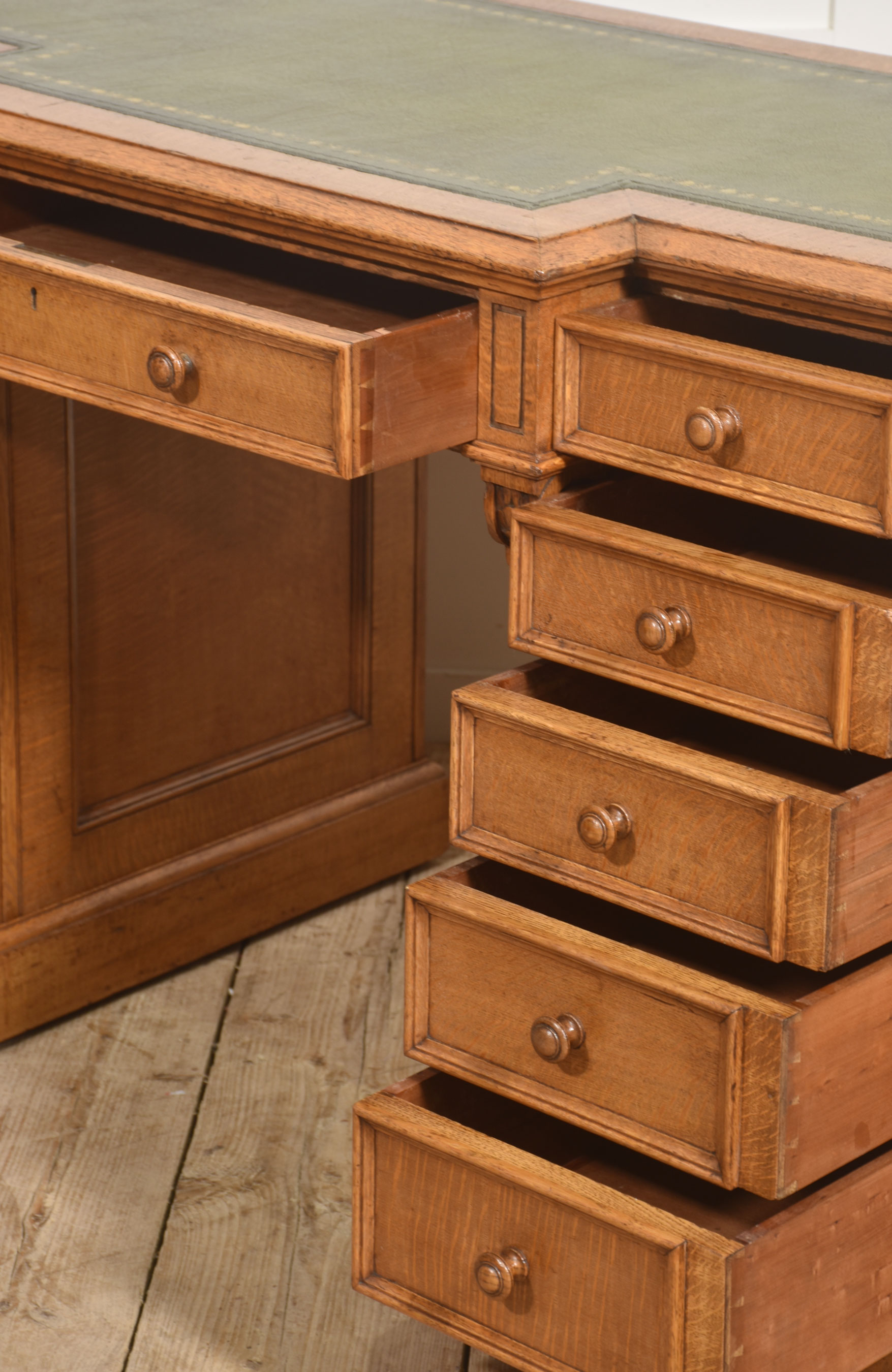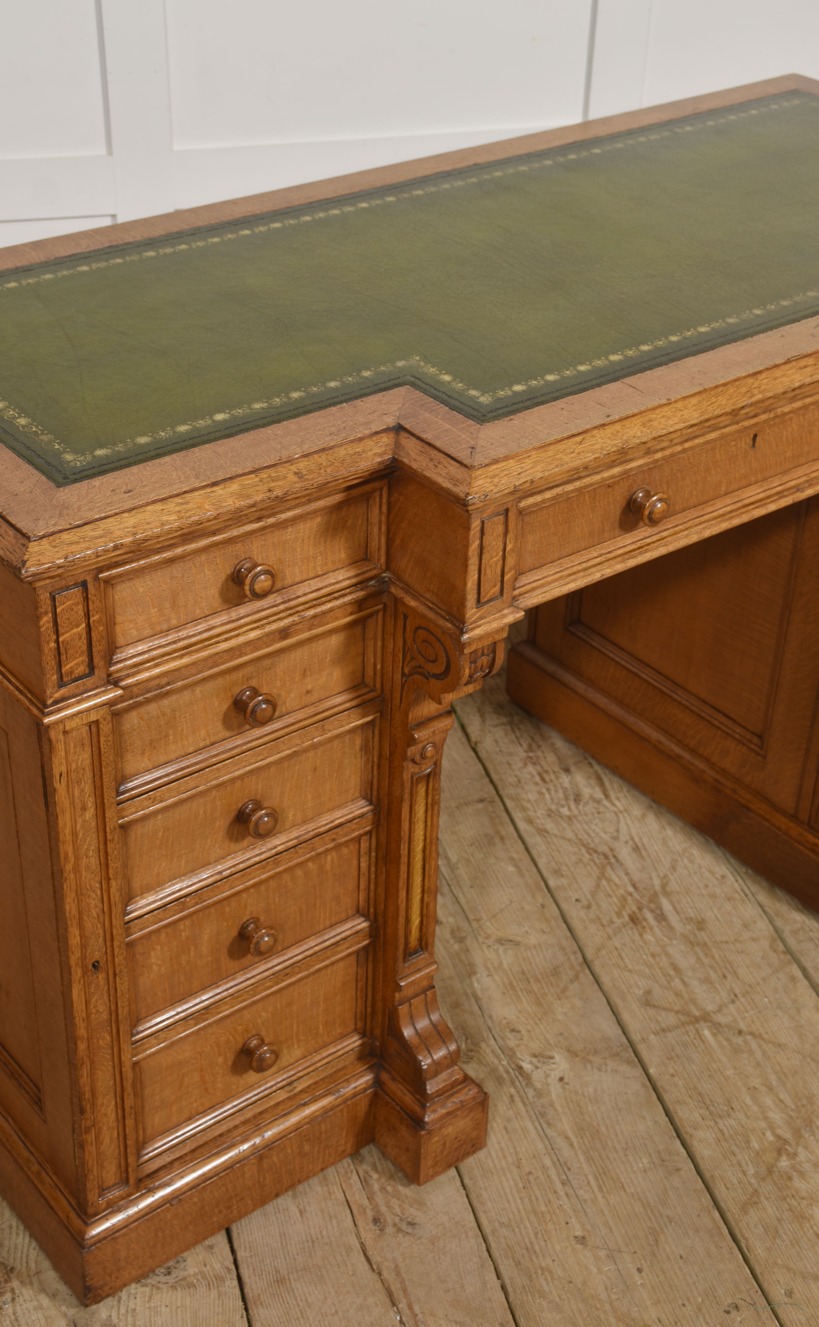 A well-proportioned late 19th-century pedestal desk in figured oak, of classic twin-pedestal form and retaining its original configuration. The rectangular top is inset with a gilt-tooled green leather writing surface, shaped with a central breakfront projection to the front edge, providing both visual emphasis and practical working depth.