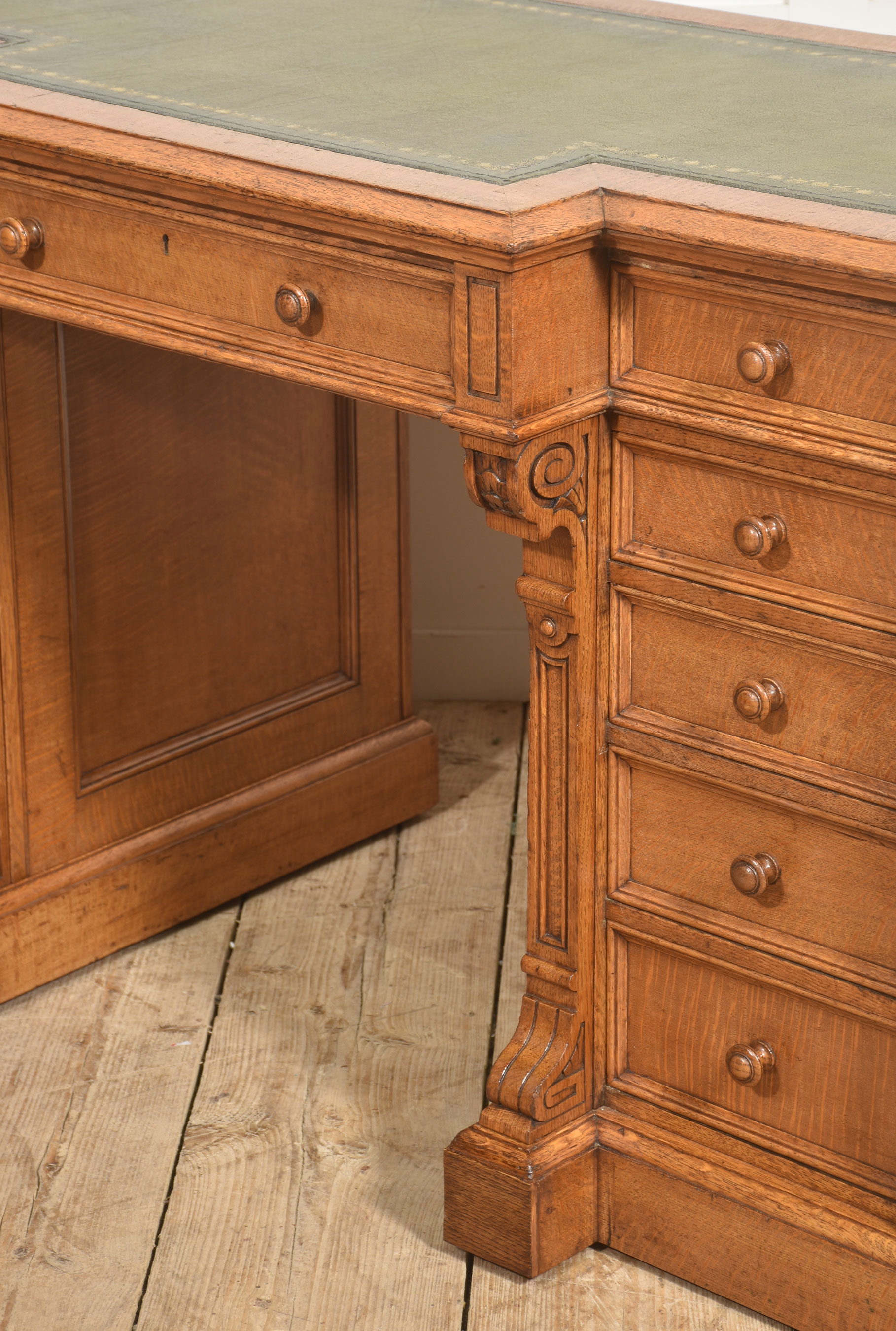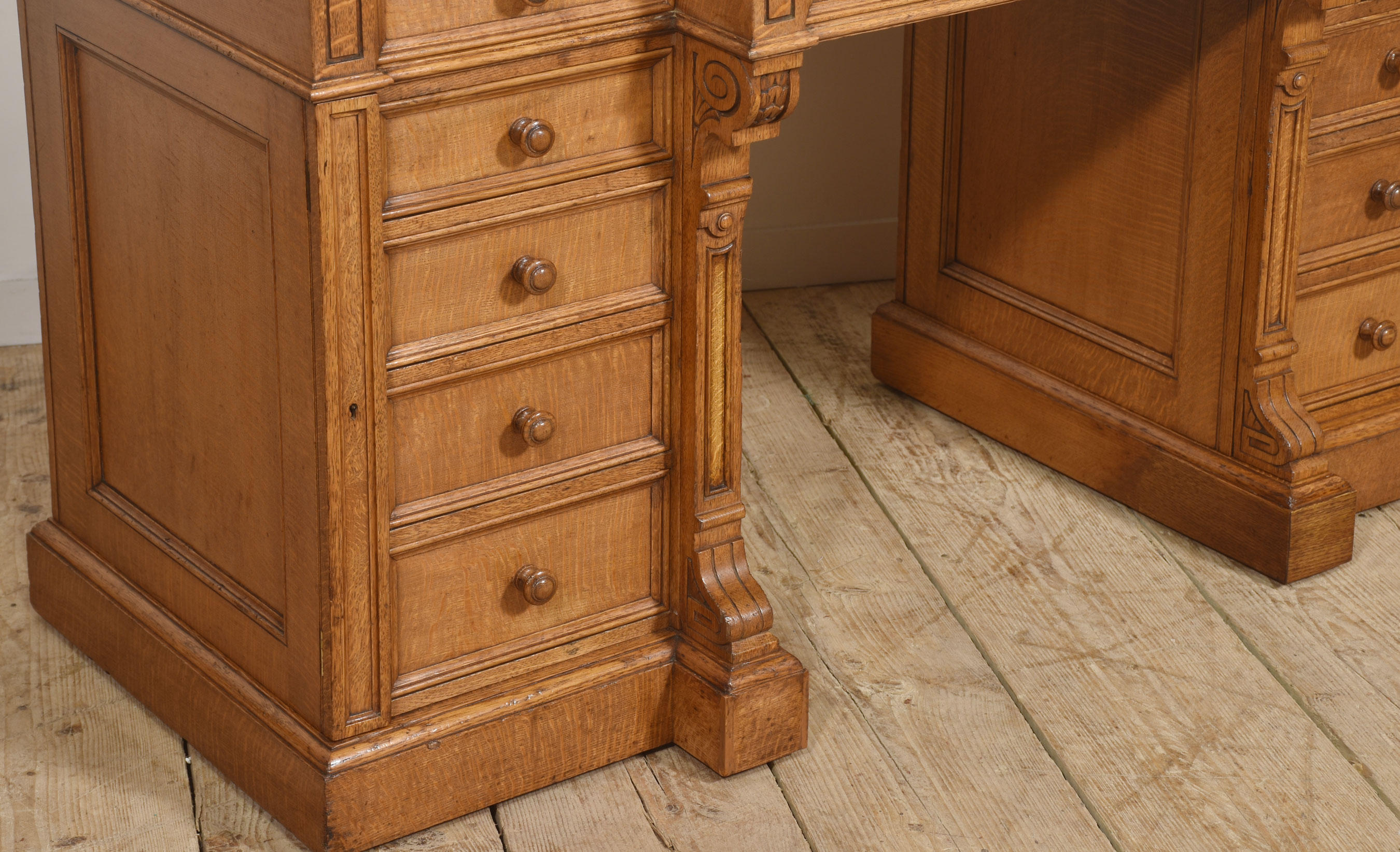 The frieze is fitted with a long central drawer flanked by smaller drawers to either side, all retaining turned wooden knob handles. Each pedestal is arranged with a graduated bank of drawers, offering ample storage, and stands on a plinth base. The desk is enriched throughout with restrained carved detailing, including scrolled brackets beneath the frieze, fielded panel sides, and moulded drawer fronts, reflecting solid late Victorian craftsmanship.