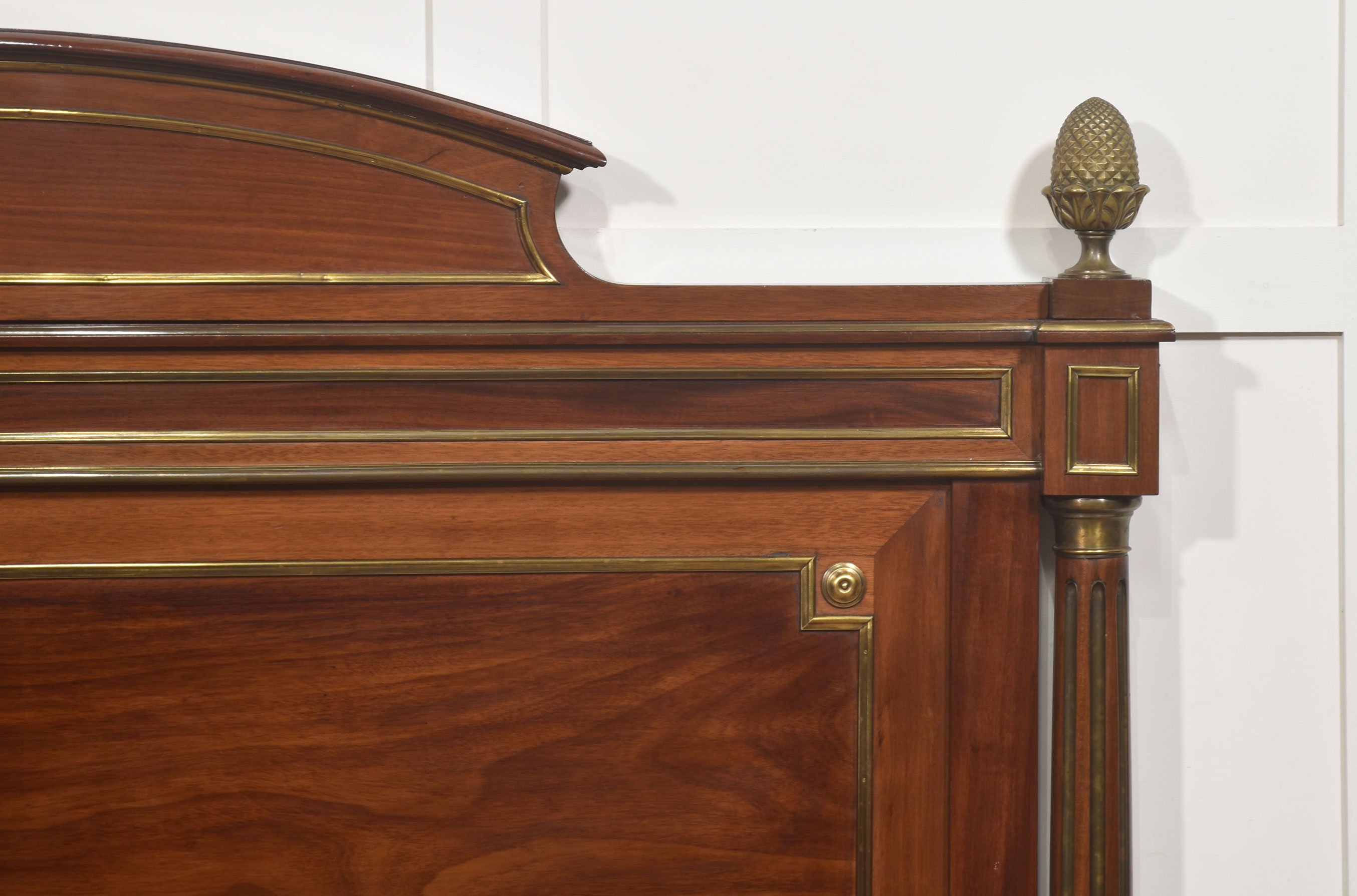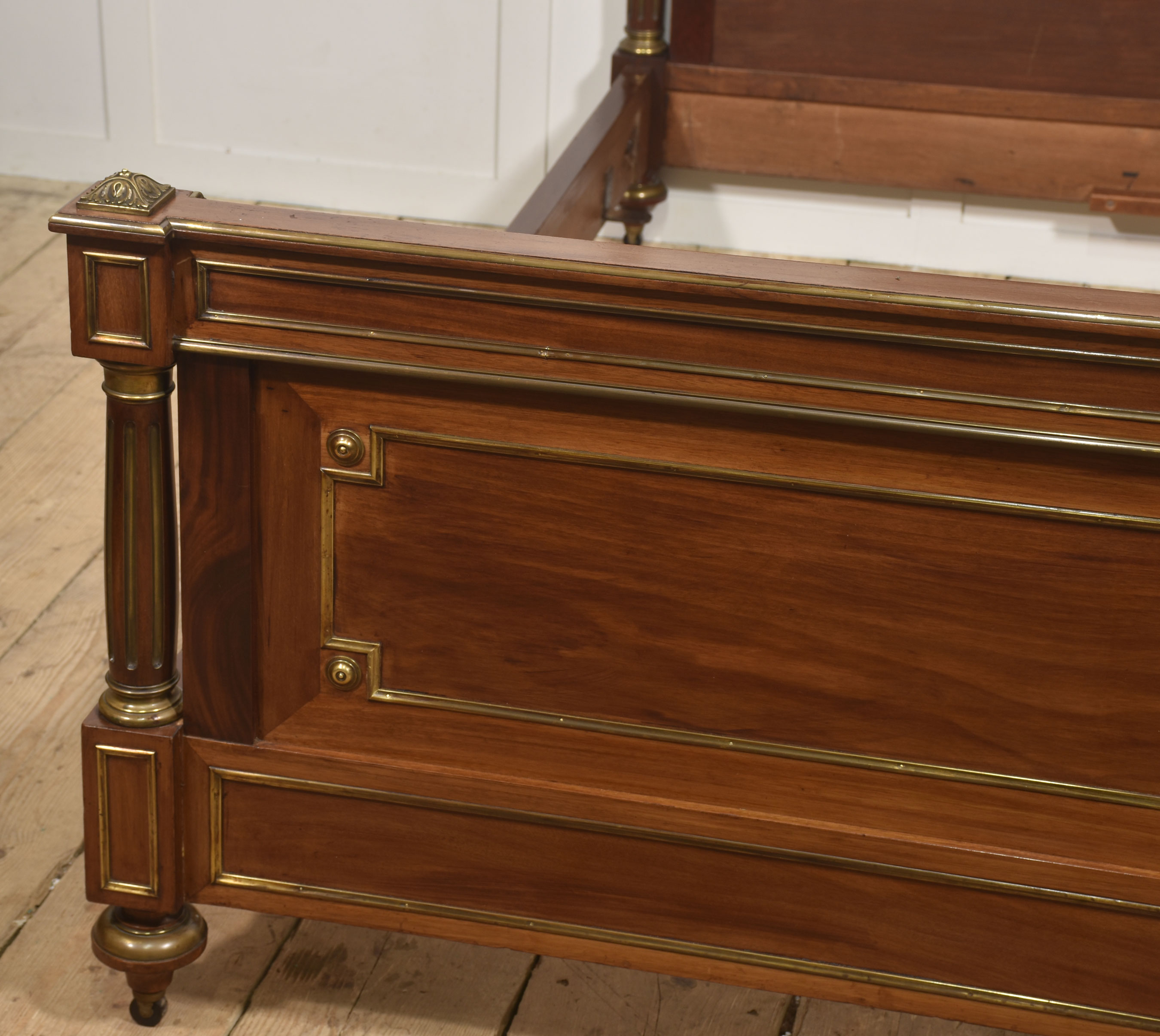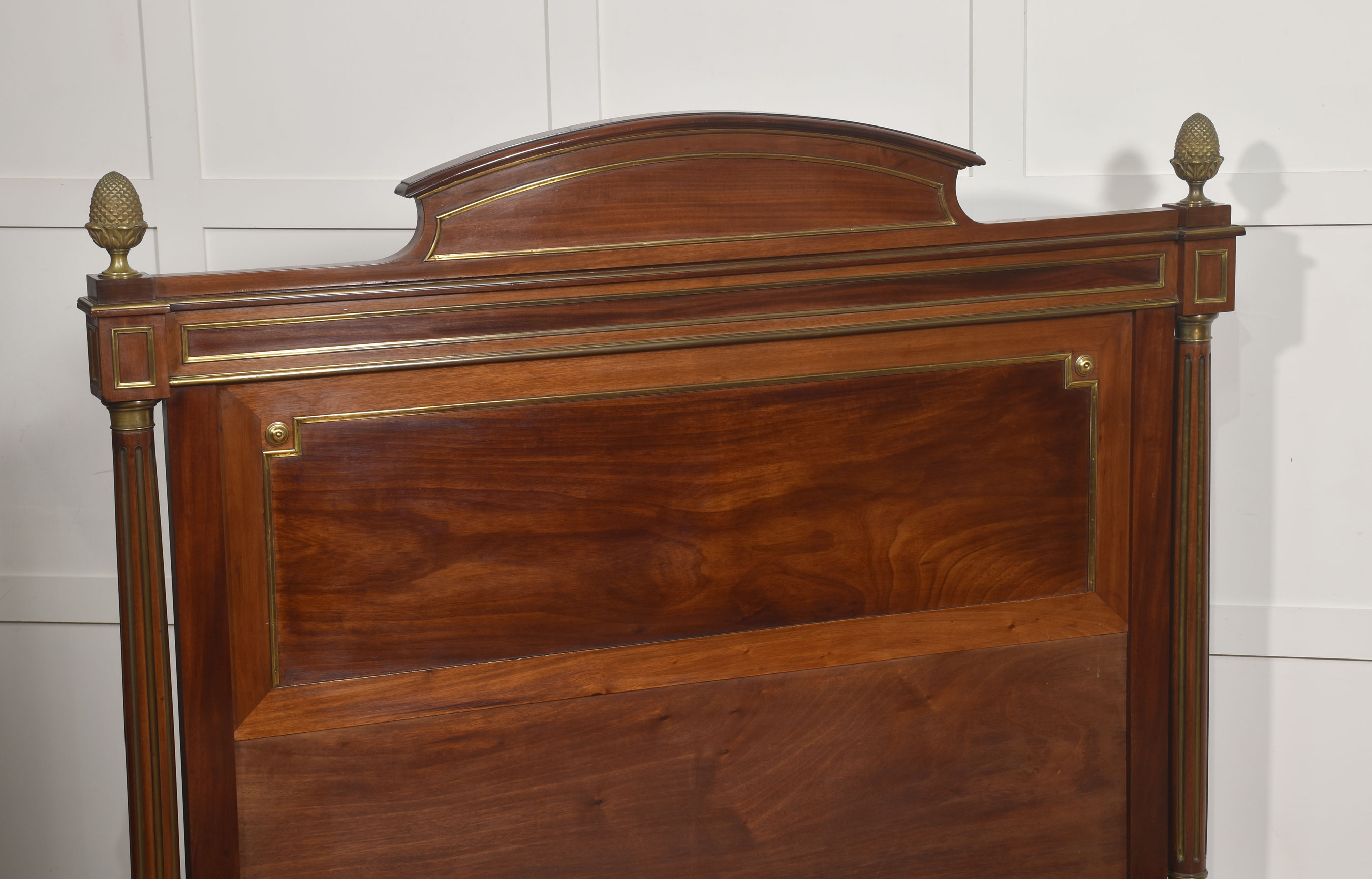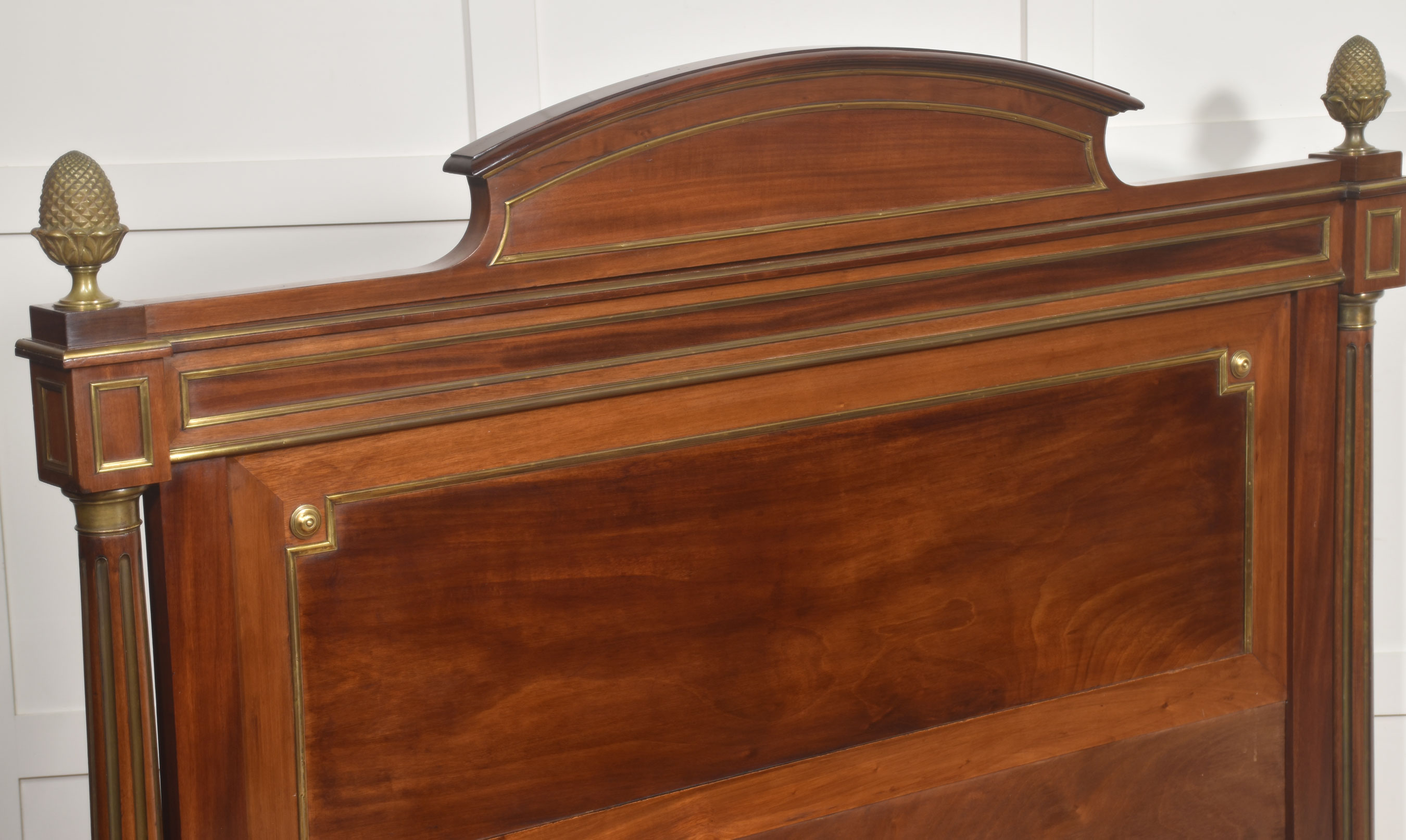 A fine late 19th century mahogany and brass-mounted bedstead, of generous proportions and elegant neoclassical influence, the headboard with a shaped and gently arched cresting rail above a broad, well-figured panel, framed within moulded borders and finely inlaid with brass stringing. The uprights are conceived as fluted, columnar posts with gilt-brass capitals and bases, surmounted by crisply cast acorn finials, lending a sense of architectural solidity and refinement.