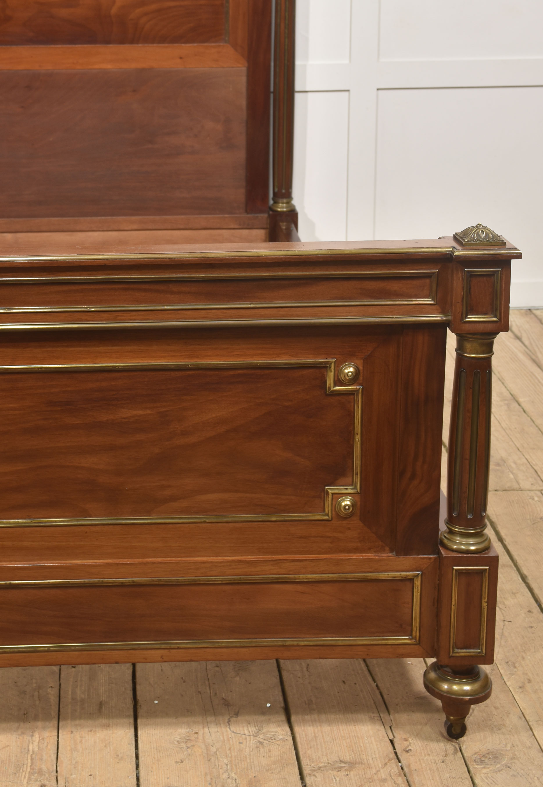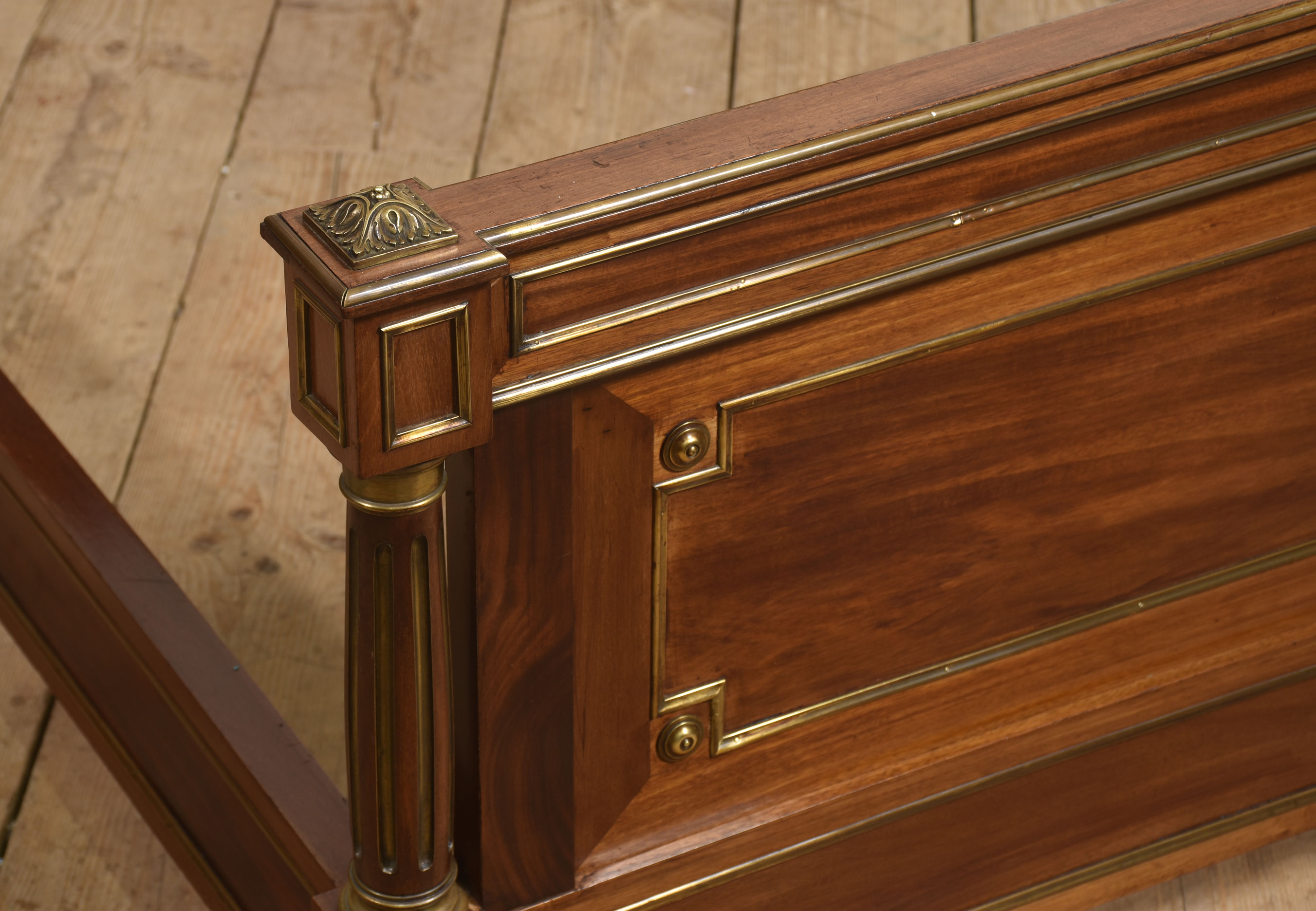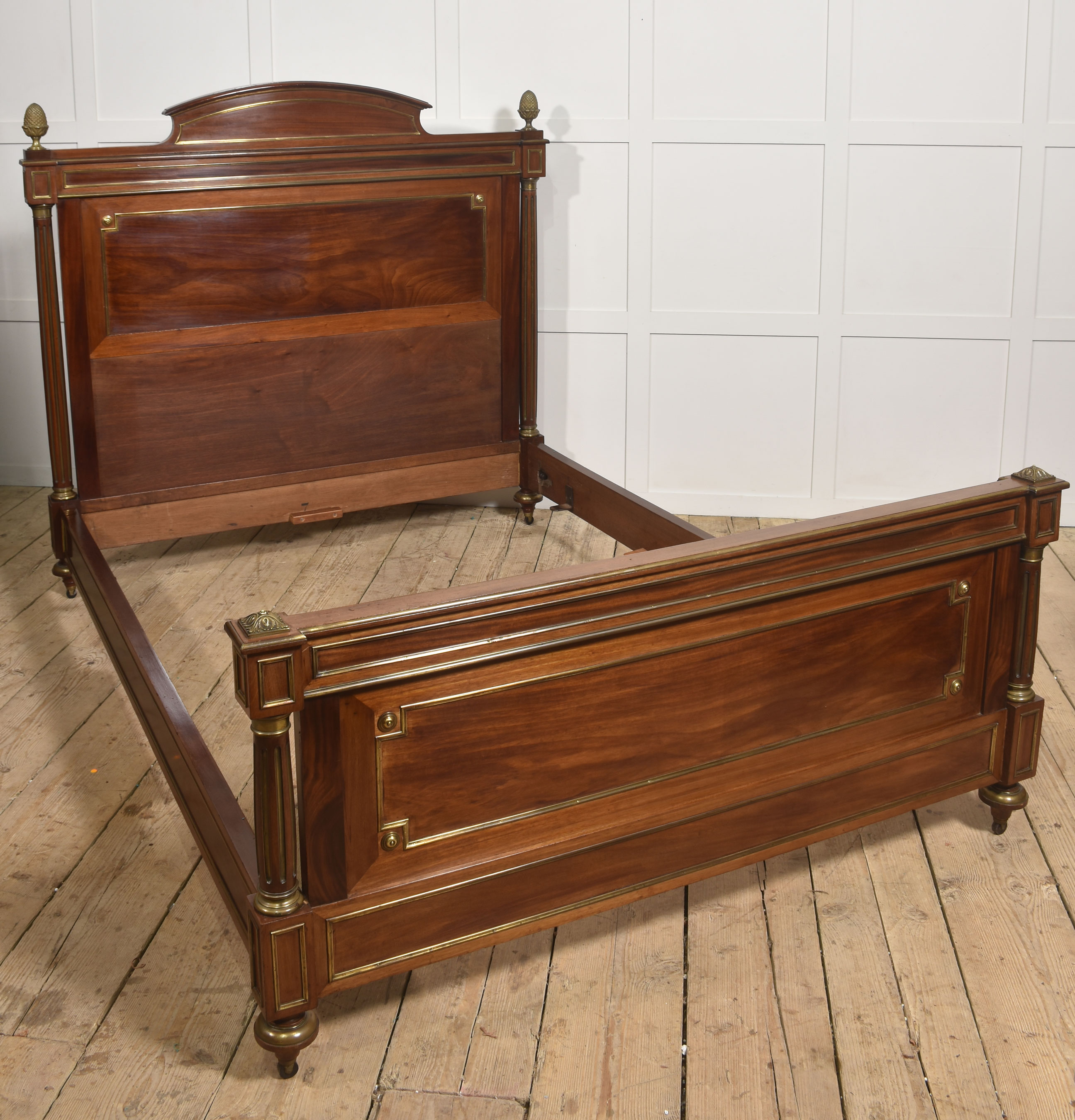 A fine late 19th century mahogany and brass-mounted bedstead, of generous proportions and elegant neoclassical influence, the headboard with a shaped and gently arched cresting rail above a broad, well-figured panel, framed within moulded borders and finely inlaid with brass stringing. The uprights are conceived as fluted, columnar posts with gilt-brass capitals and bases, surmounted by crisply cast acorn finials, lending a sense of architectural solidity and refinement.