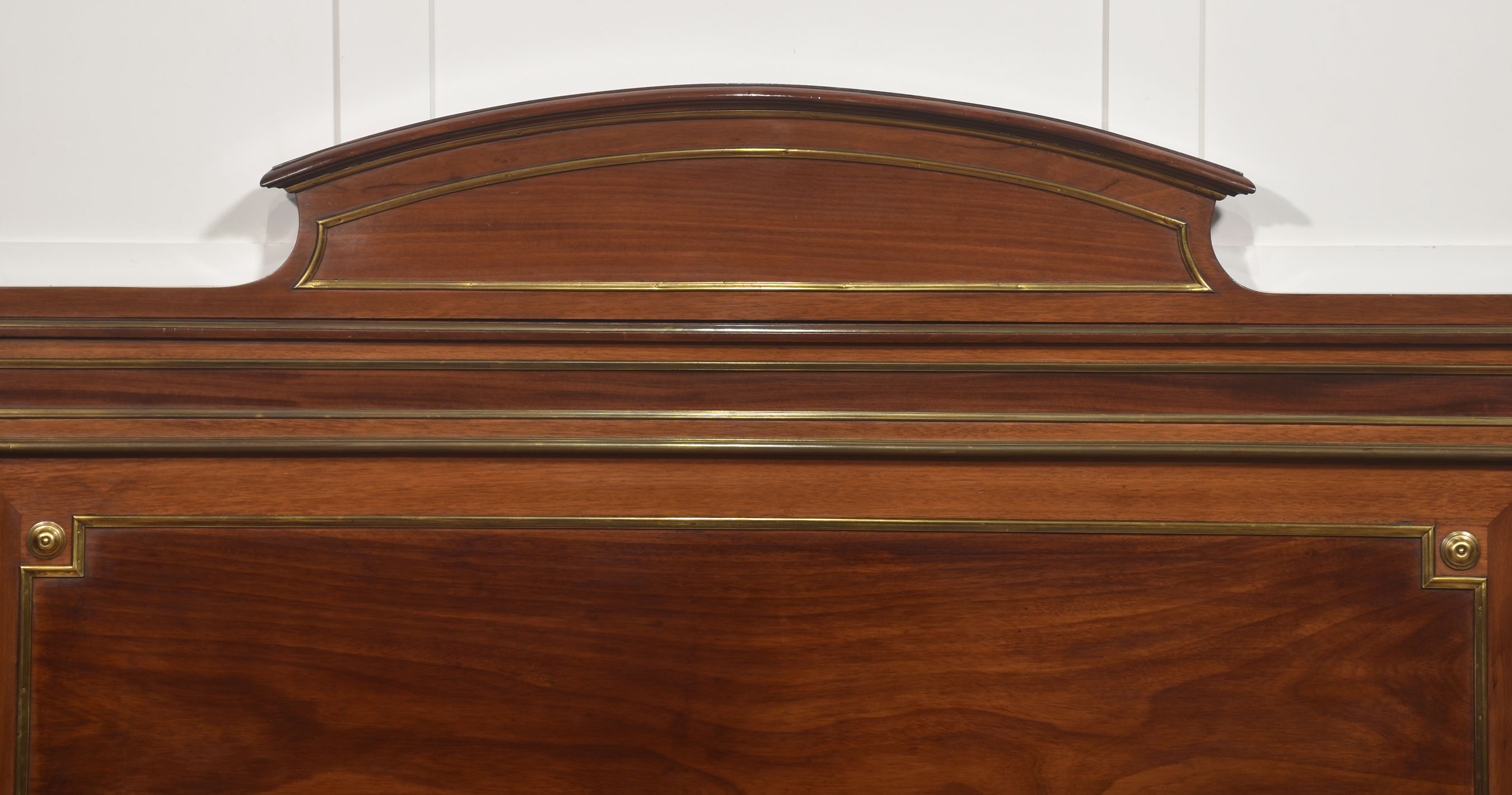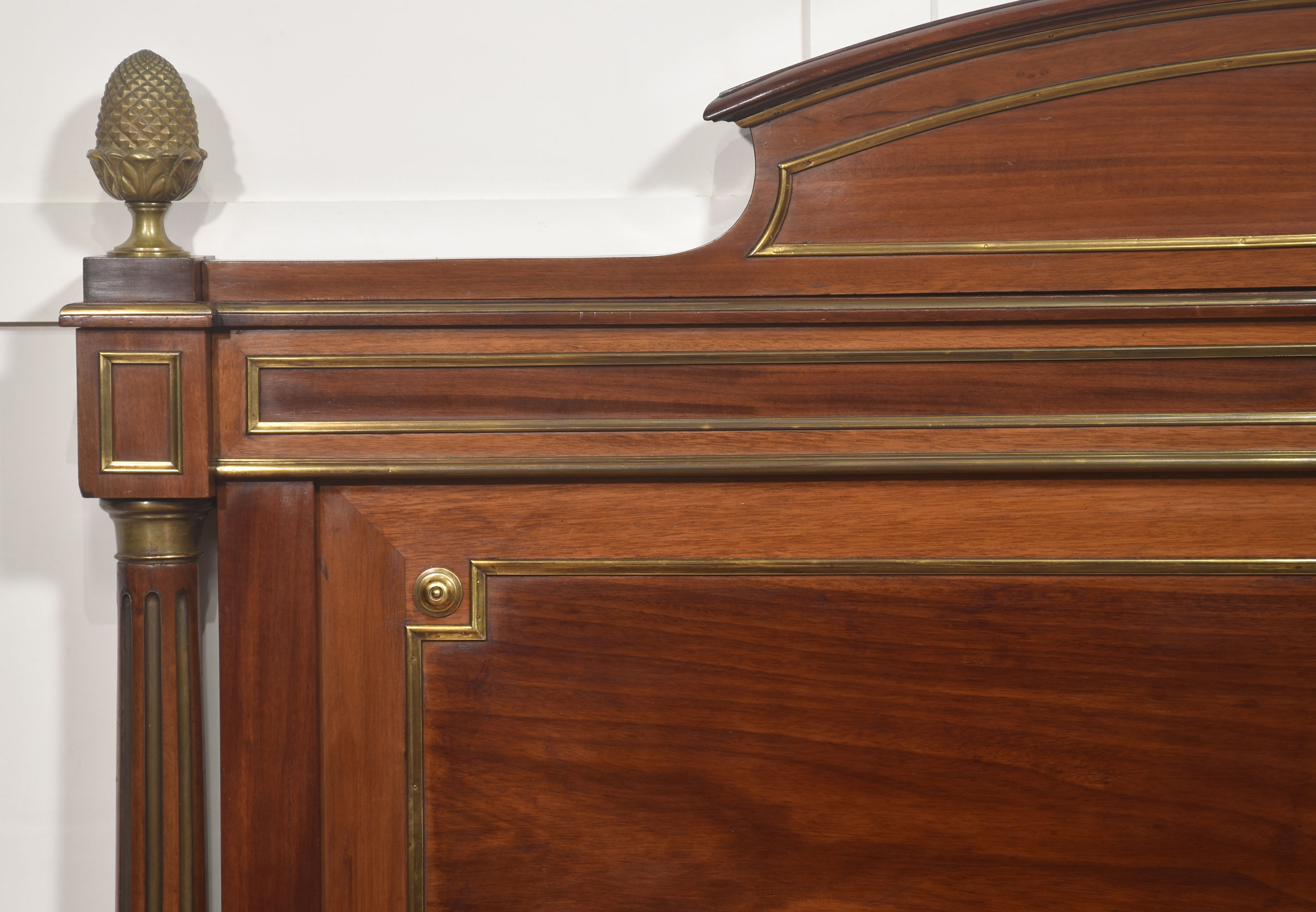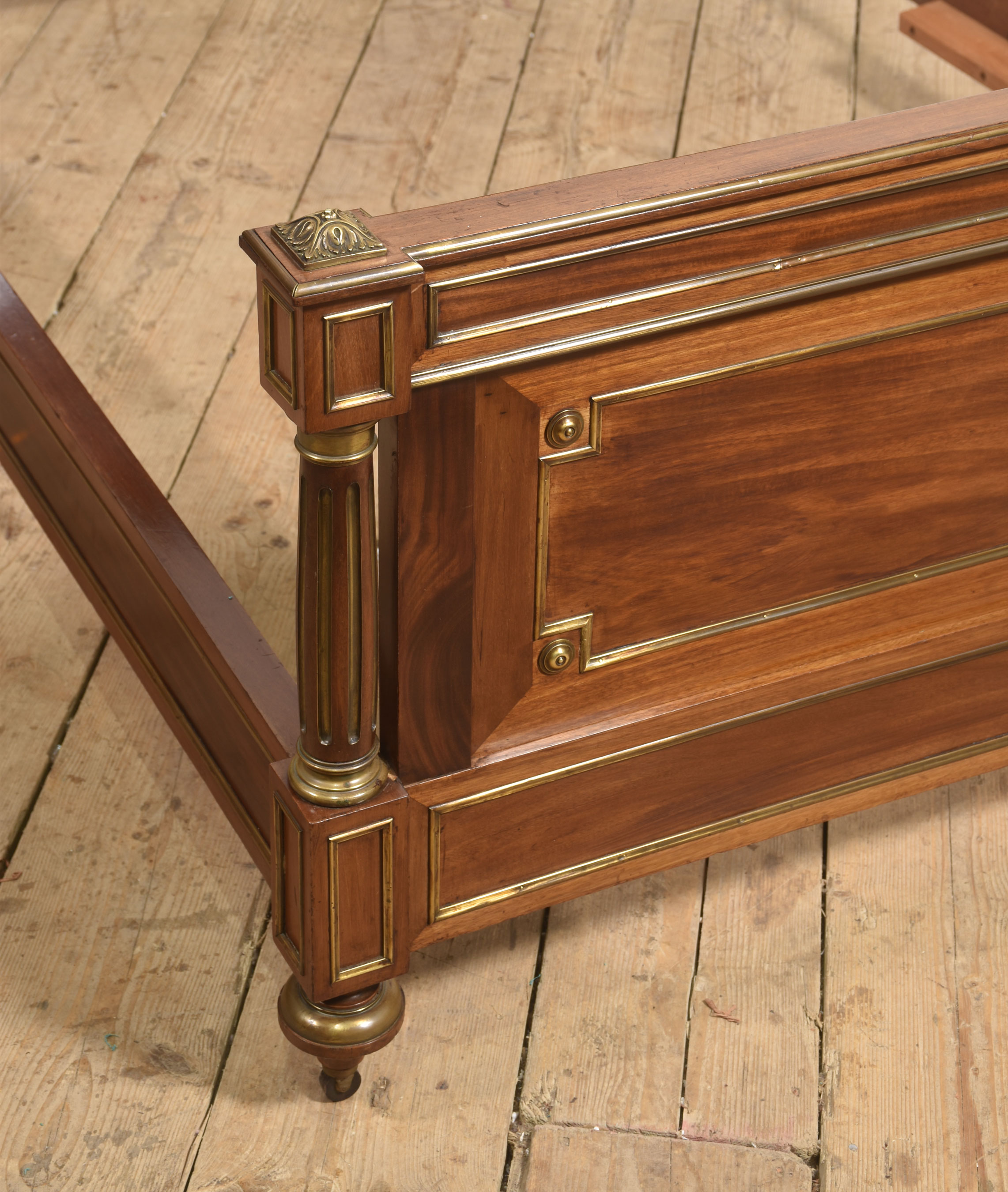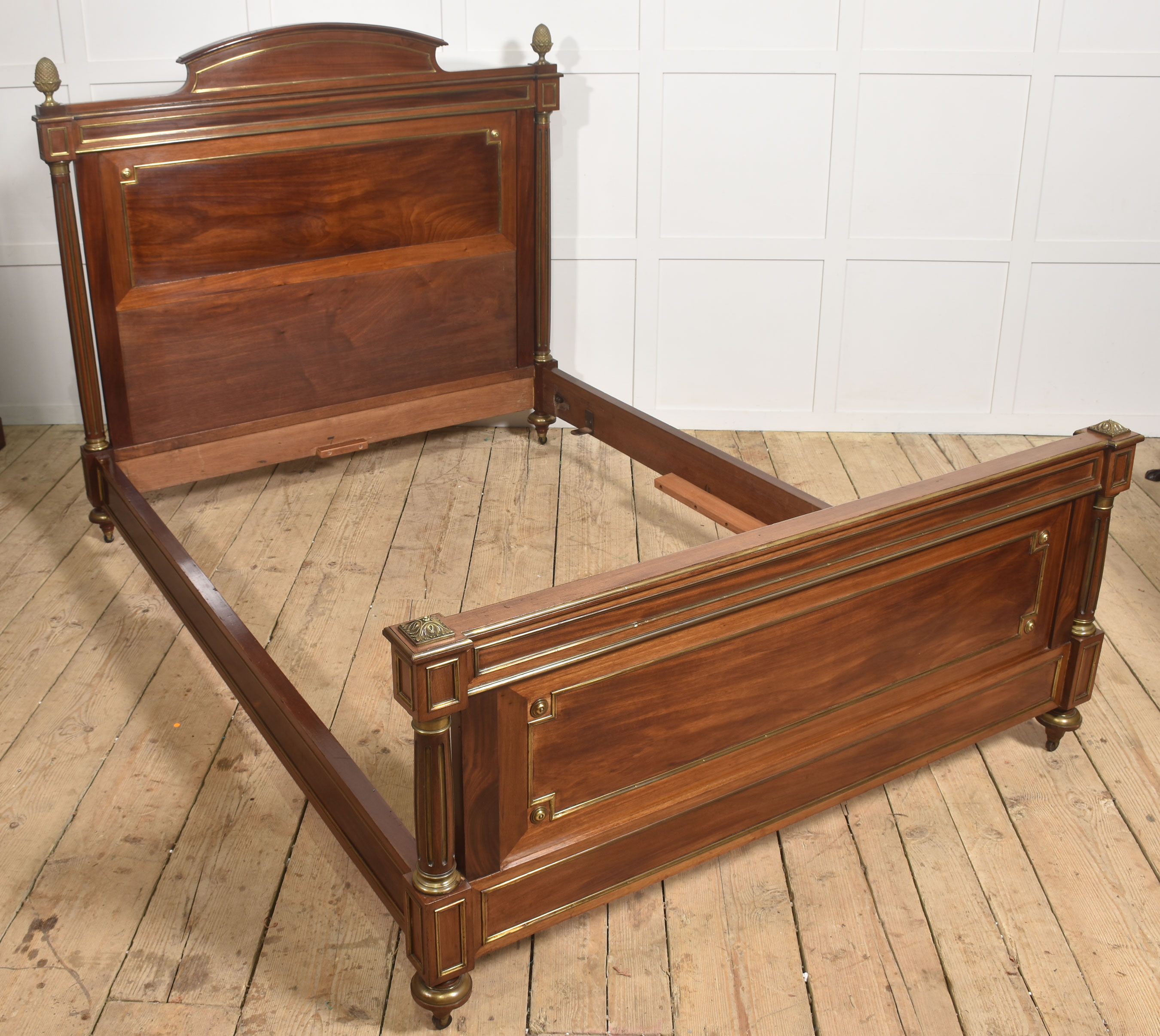 A fine late 19th century mahogany and brass-mounted bedstead, of generous proportions and elegant neoclassical influence, the headboard with a shaped and gently arched cresting rail above a broad, well-figured panel, framed within moulded borders and finely inlaid with brass stringing. The uprights are conceived as fluted, columnar posts with gilt-brass capitals and bases, surmounted by crisply cast acorn finials, lending a sense of architectural solidity and refinement.