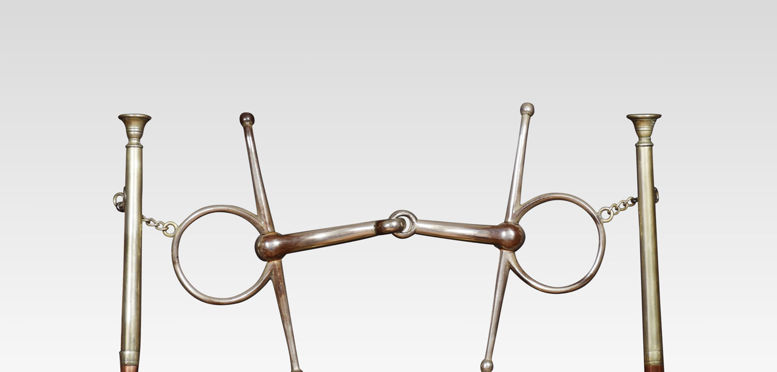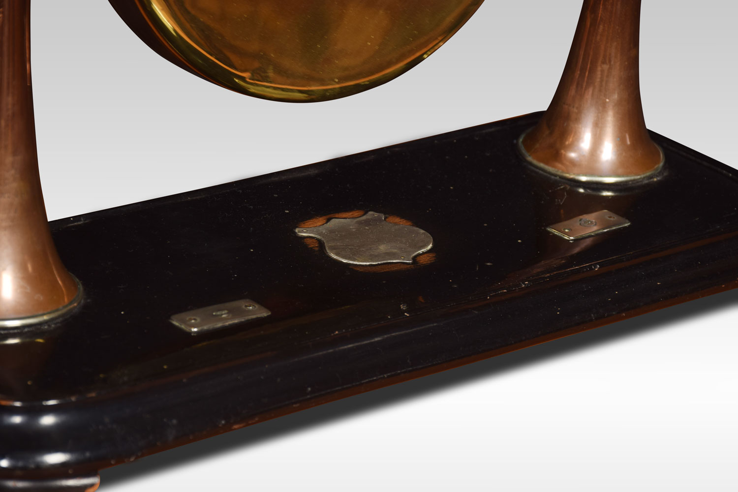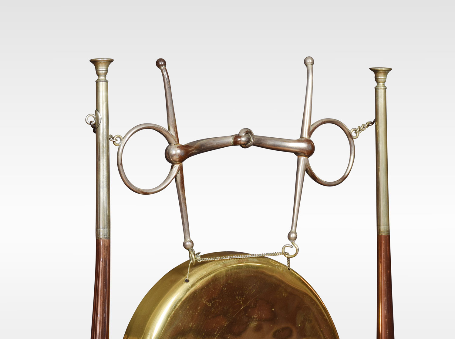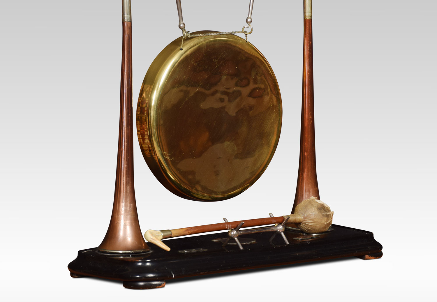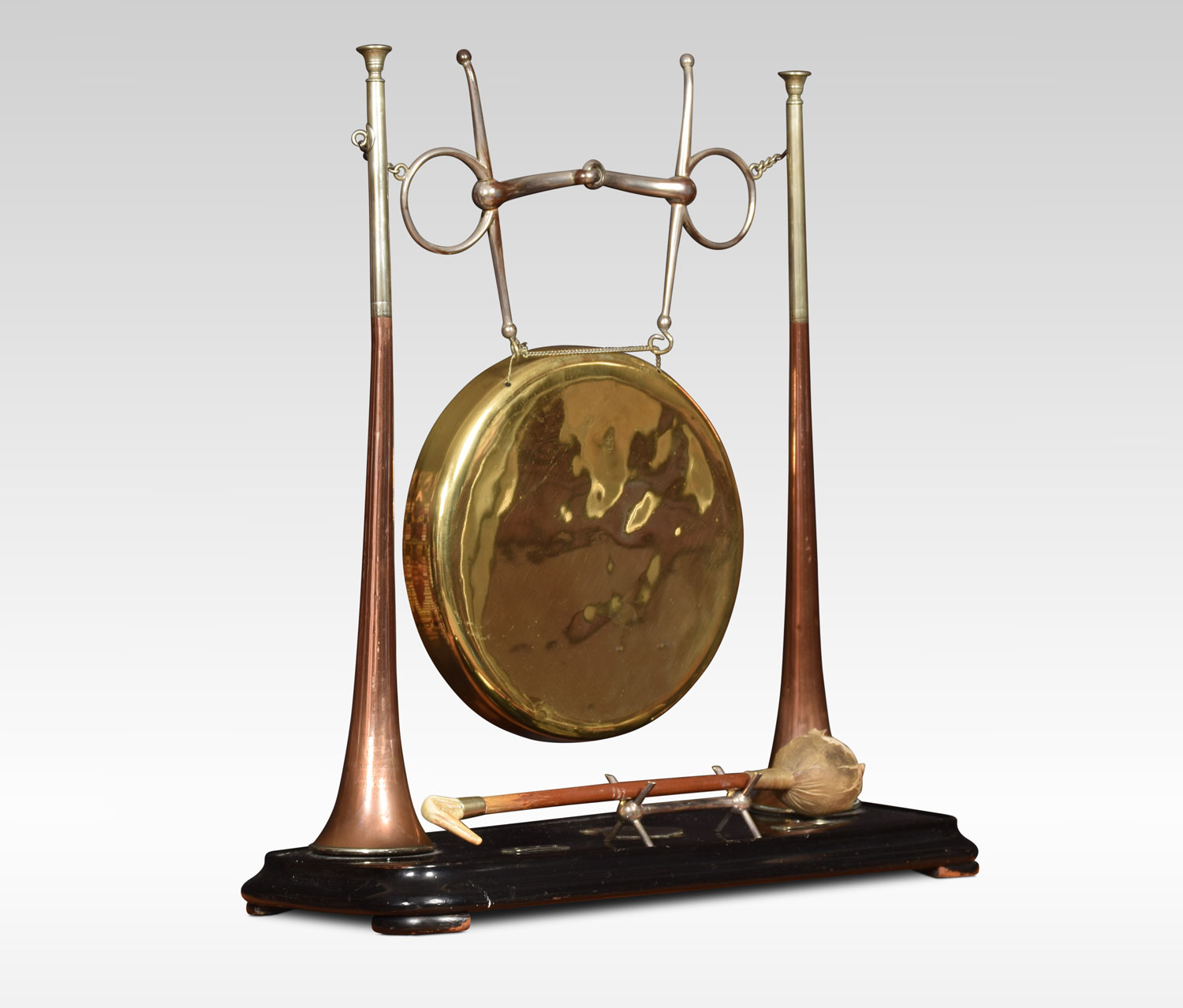 A late Victorian hunting novelty dinner gong by Henry Keat & Sons of London, the plated gong suspended from a horse`s bit supported by a pair of copper and brass hunting horns, the ebonised base with a vacant silver plaque. The original beater in the form of a riding crop.