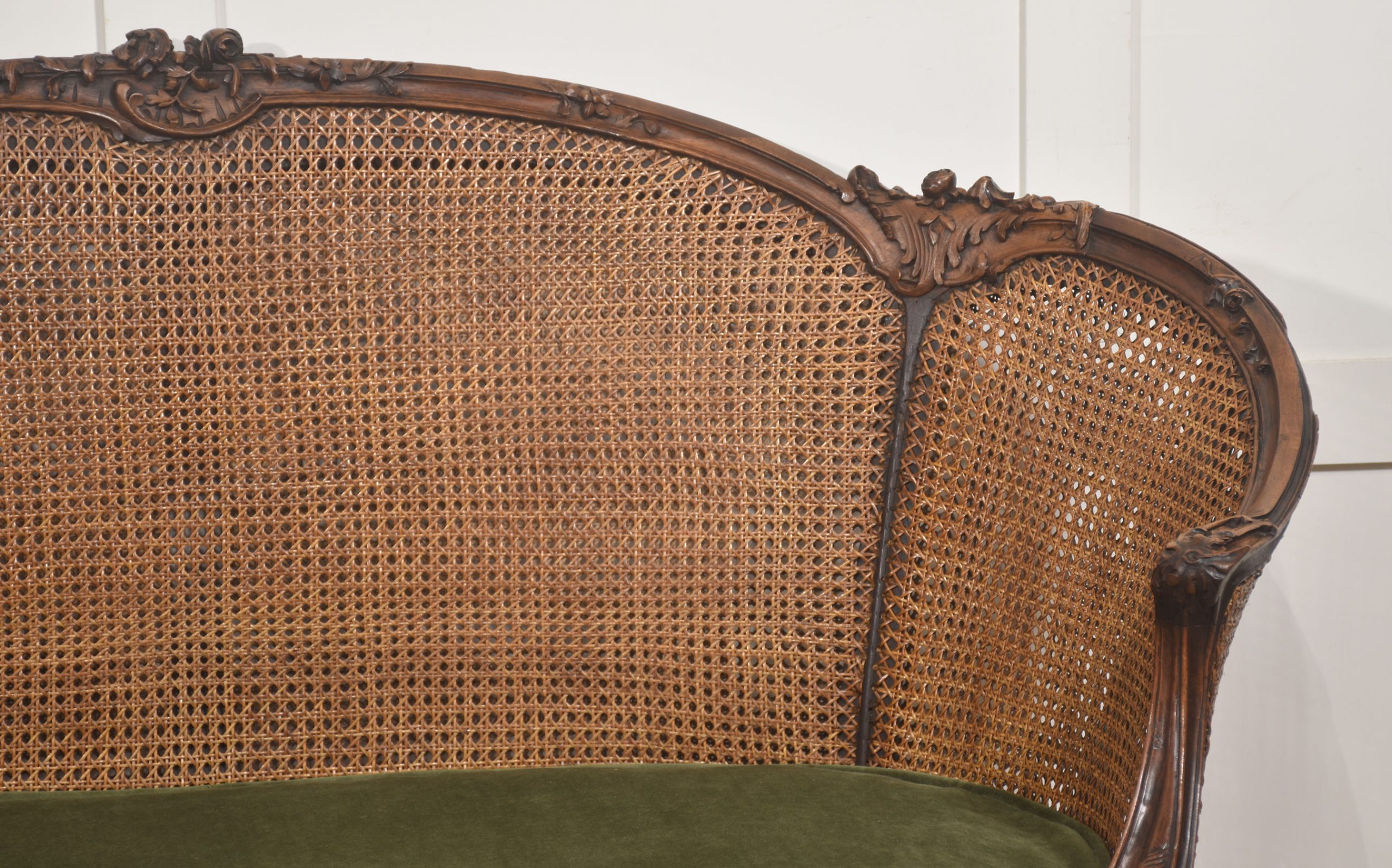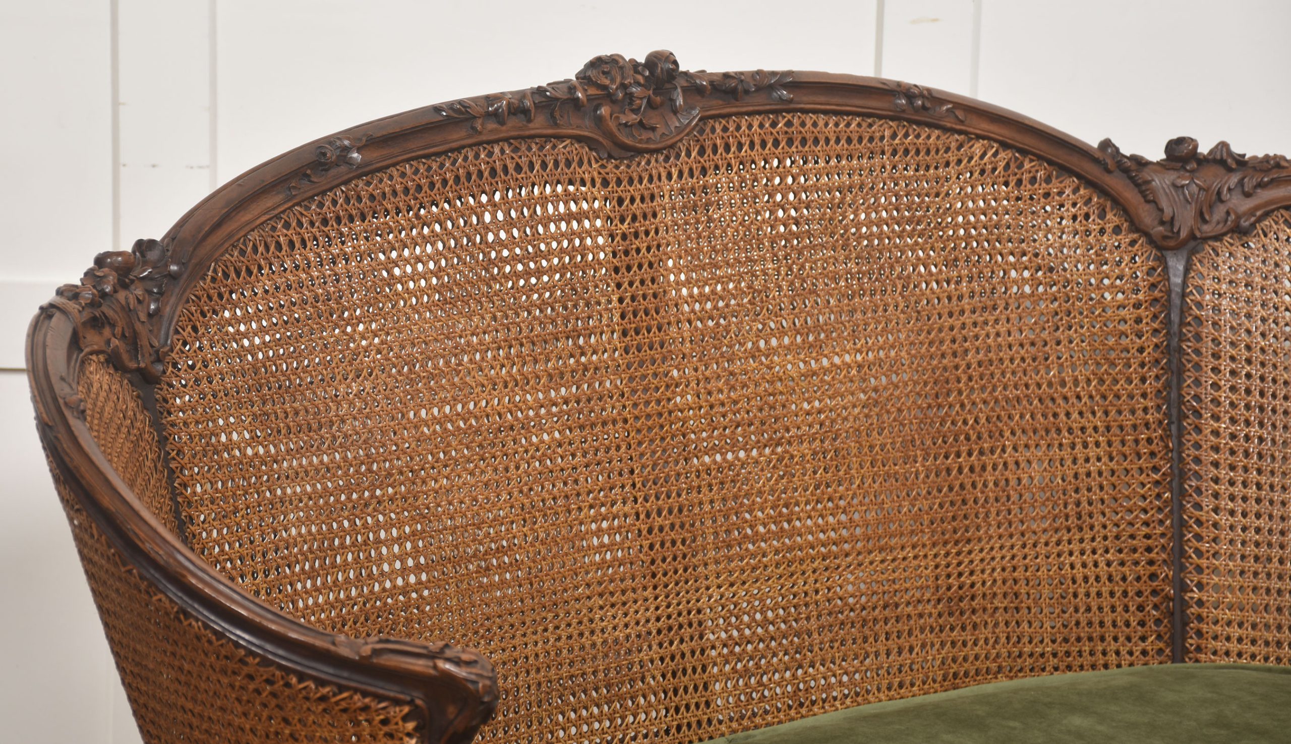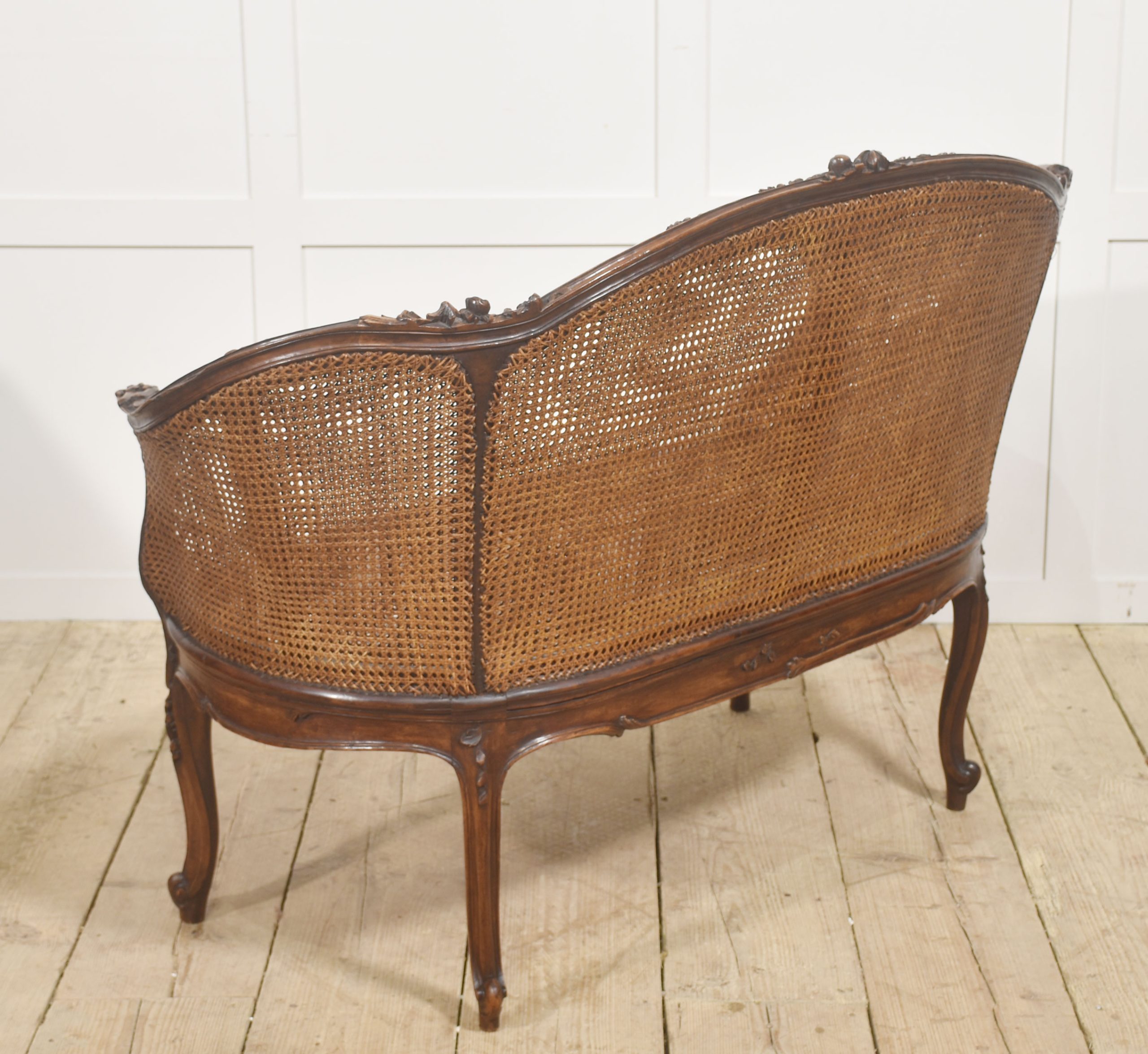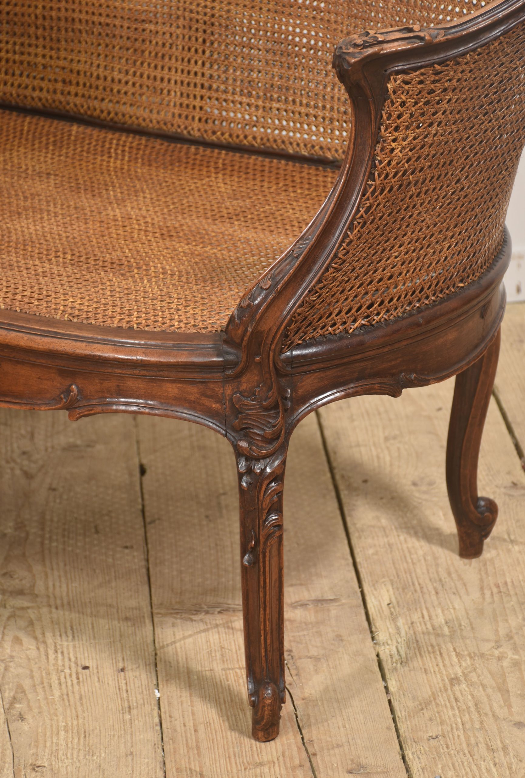 An elegant Louis XV–style caned bergère settee, crafted in richly toned carved walnut. The shaped frame features finely executed rococo ornament, including scrolling foliage and floral carving along the crest rail, apron, and cabriole legs. The serpentine top rail flows gracefully into outward-curving arms, creating a comfortable and visually balanced silhouette characteristic of 18th-century French design.