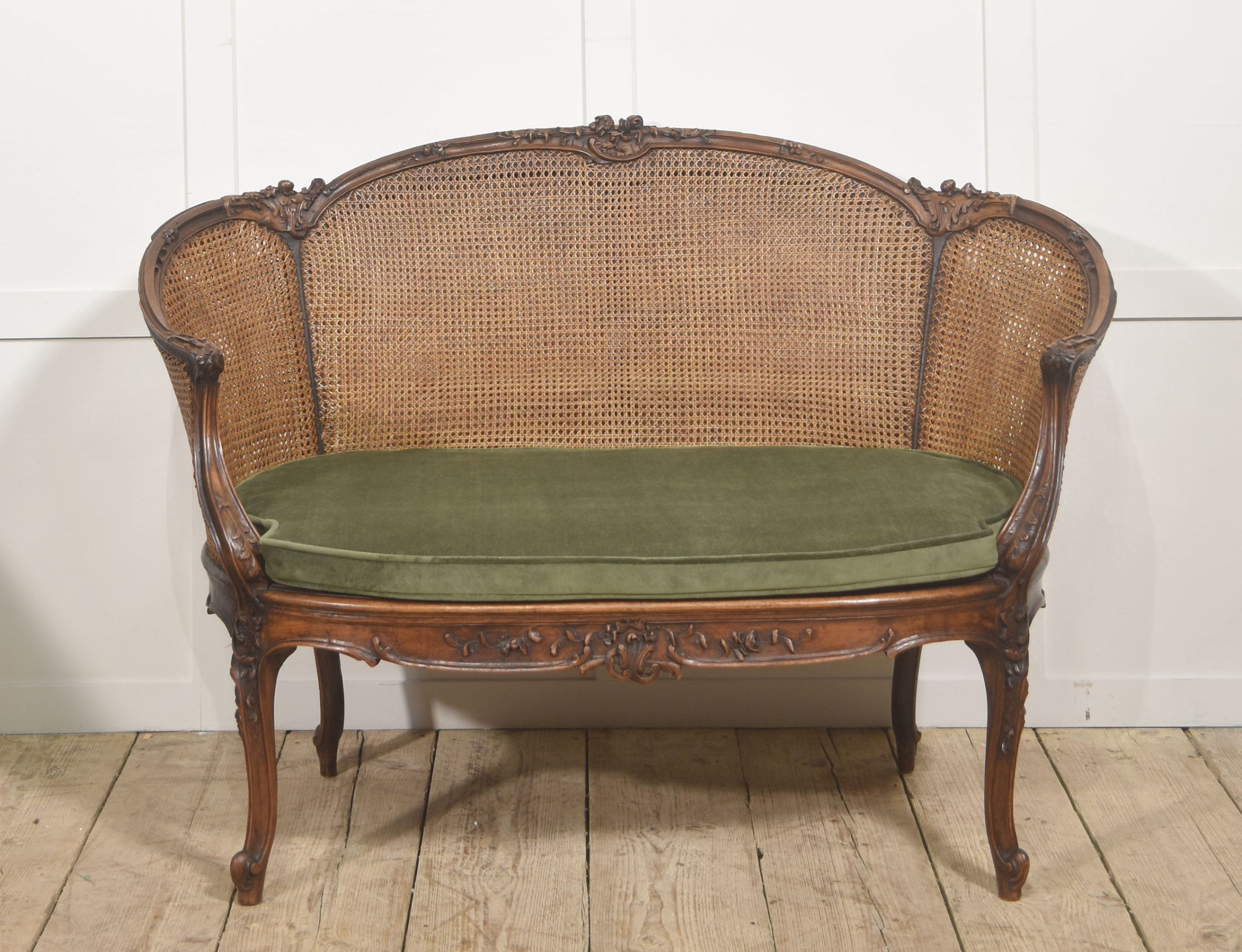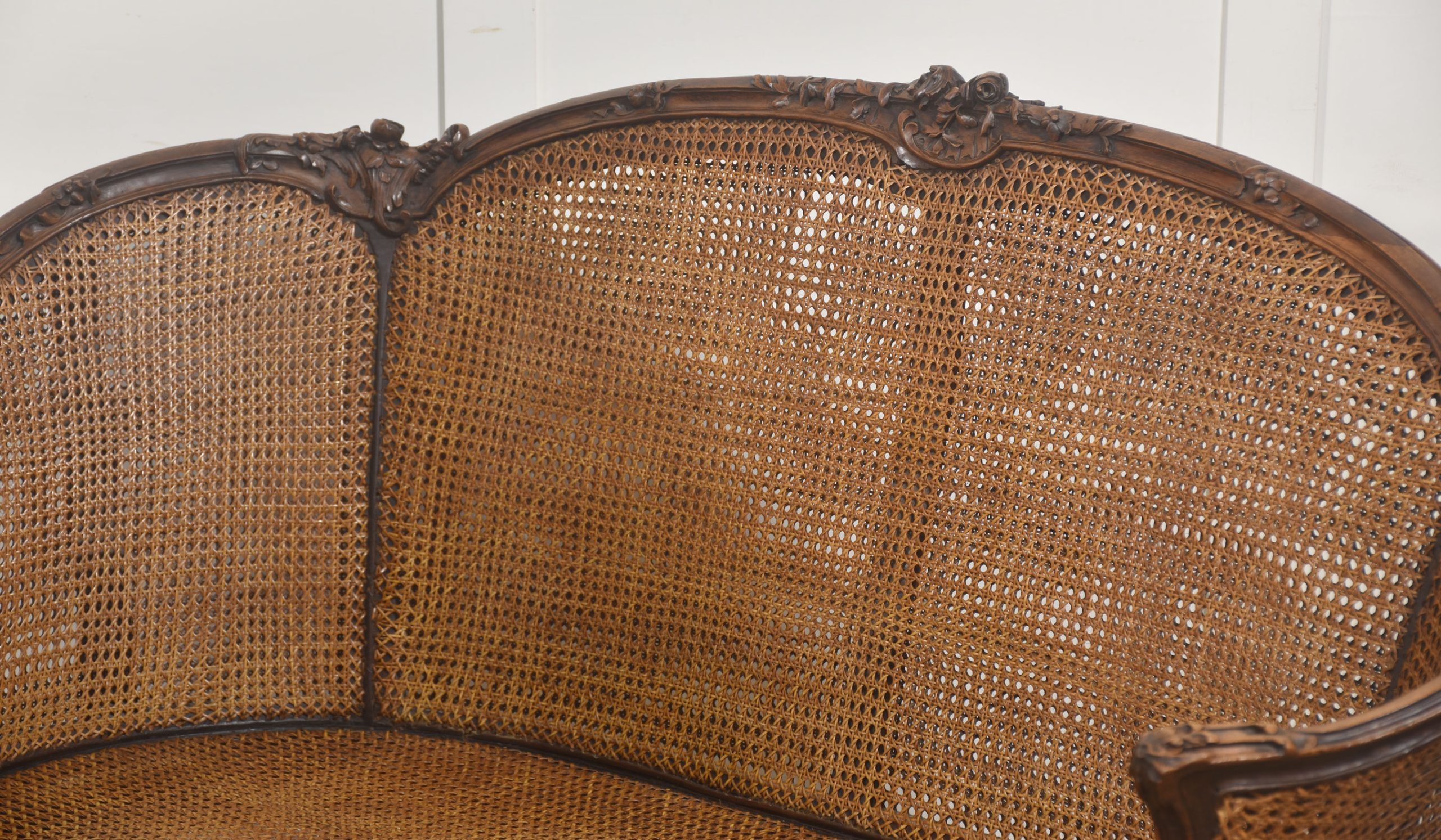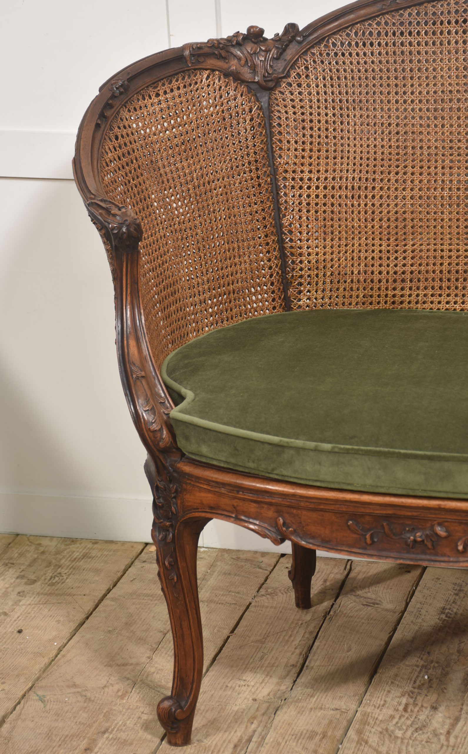An elegant Louis XV–style caned bergère settee, crafted in richly toned carved walnut. The shaped frame features finely executed rococo ornament, including scrolling foliage and floral carving along the crest rail, apron, and cabriole legs. The serpentine top rail flows gracefully into outward-curving arms, creating a comfortable and visually balanced silhouette characteristic of 18th-century French design.