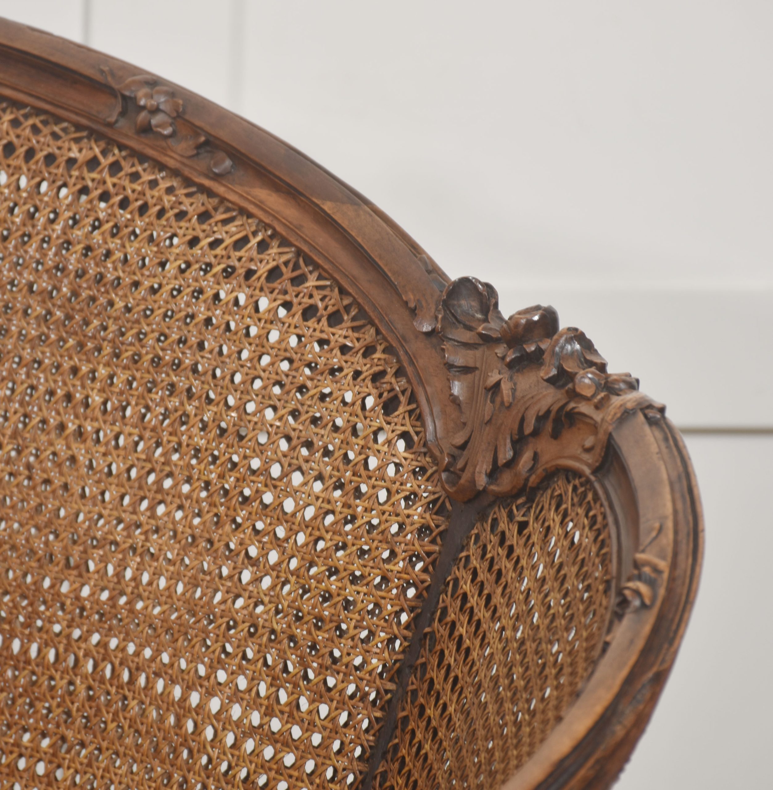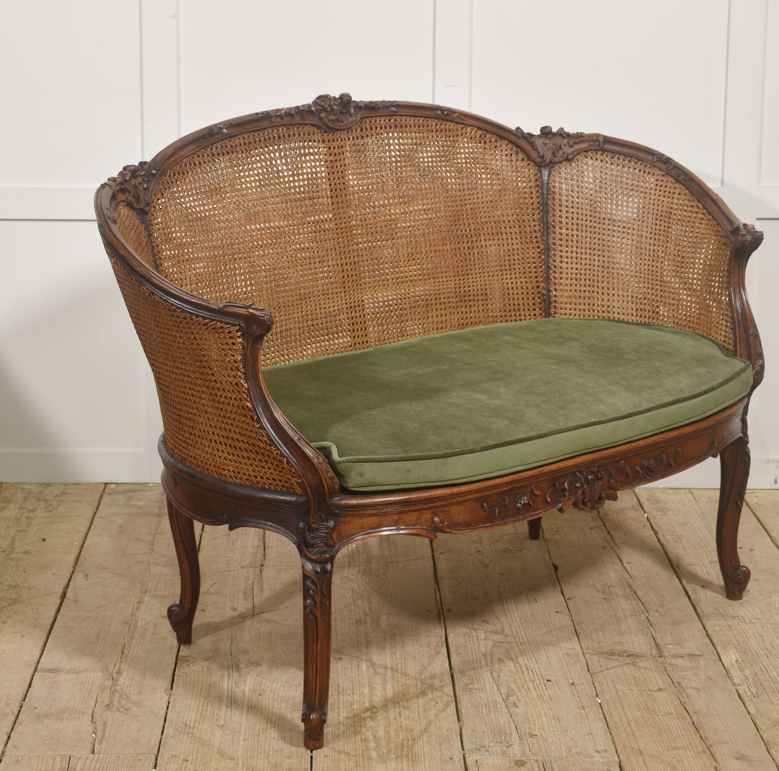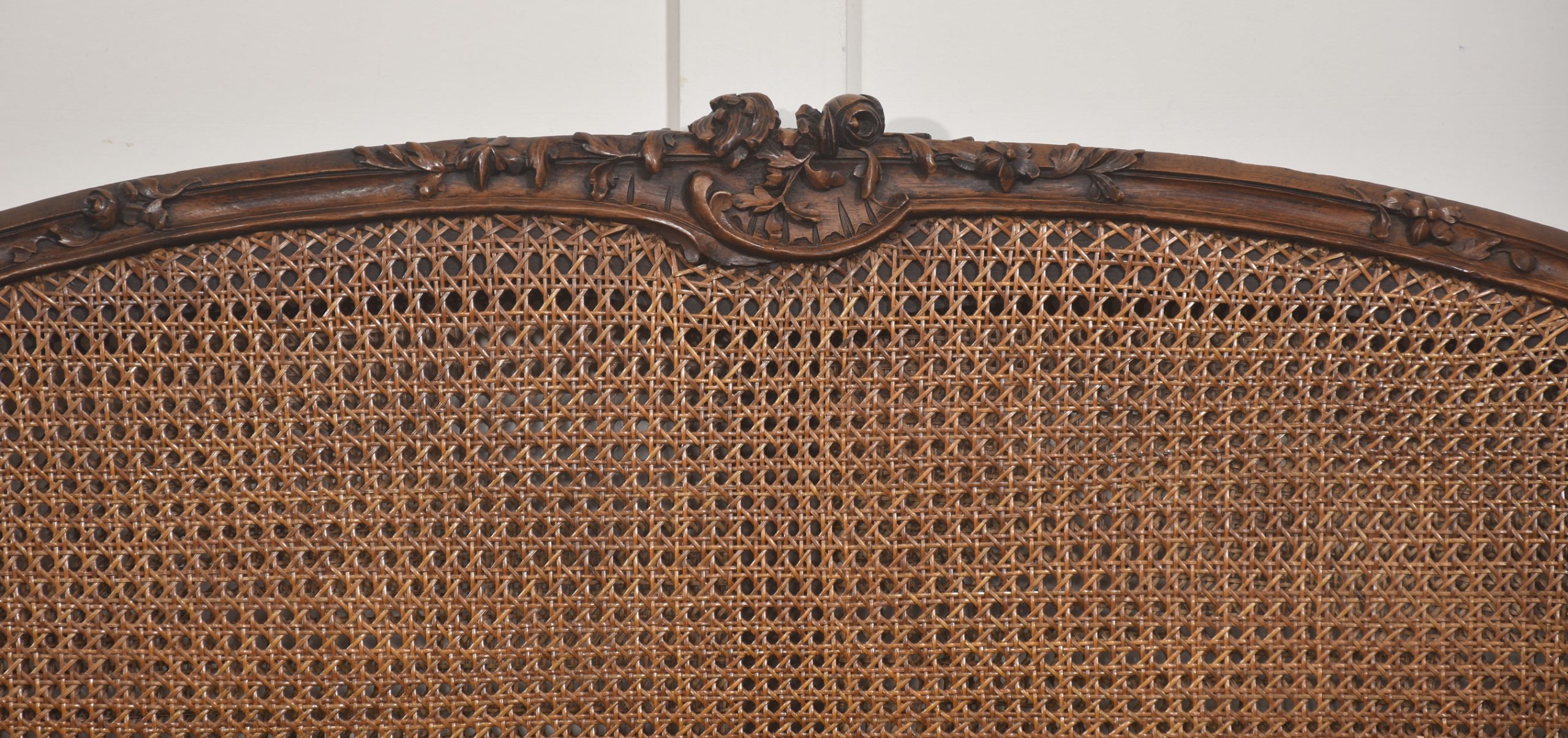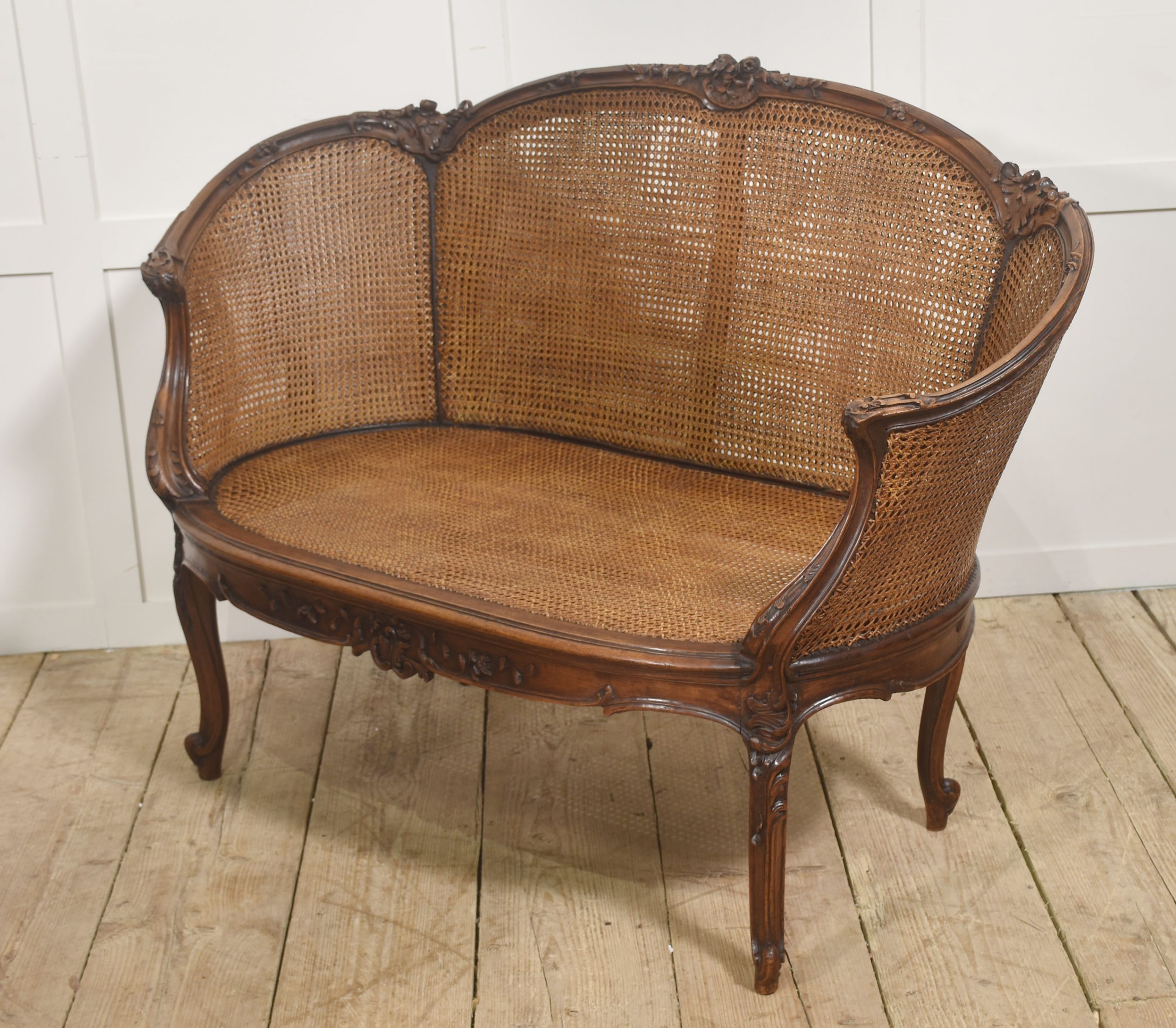 An elegant Louis XV–style caned bergère settee, crafted in richly toned carved walnut. The shaped frame features finely executed rococo ornament, including scrolling foliage and floral carving along the crest rail, apron, and cabriole legs. The serpentine top rail flows gracefully into outward-curving arms, creating a comfortable and visually balanced silhouette characteristic of 18th-century French design.