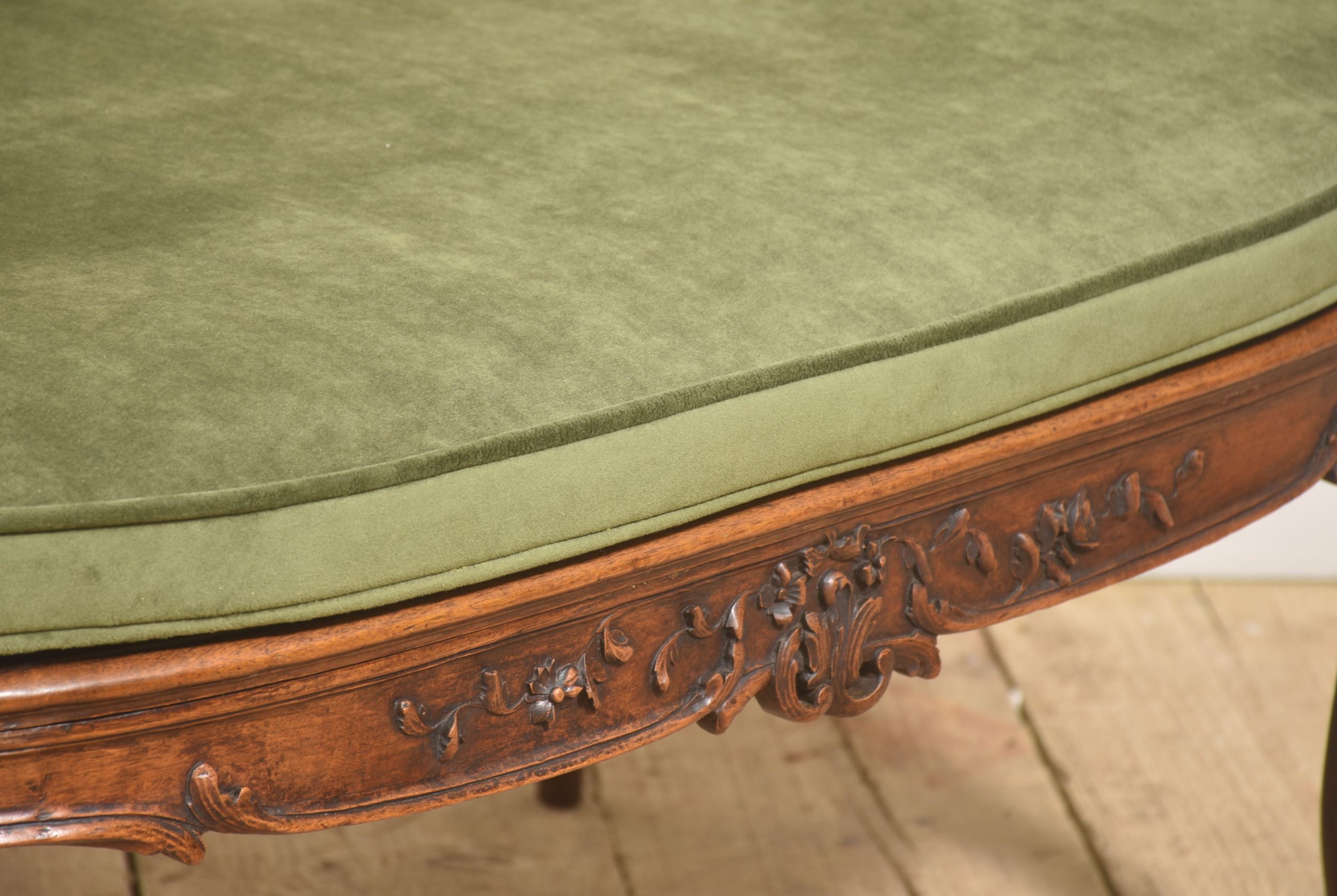 Raised on slender cabriole legs with carved detailing at the knees and feet, the piece displays refined craftsmanship and decorative elegance. The shaped apron is centered with a carved floral cartouche and scrolling motifs that echo the ornament along the crest.