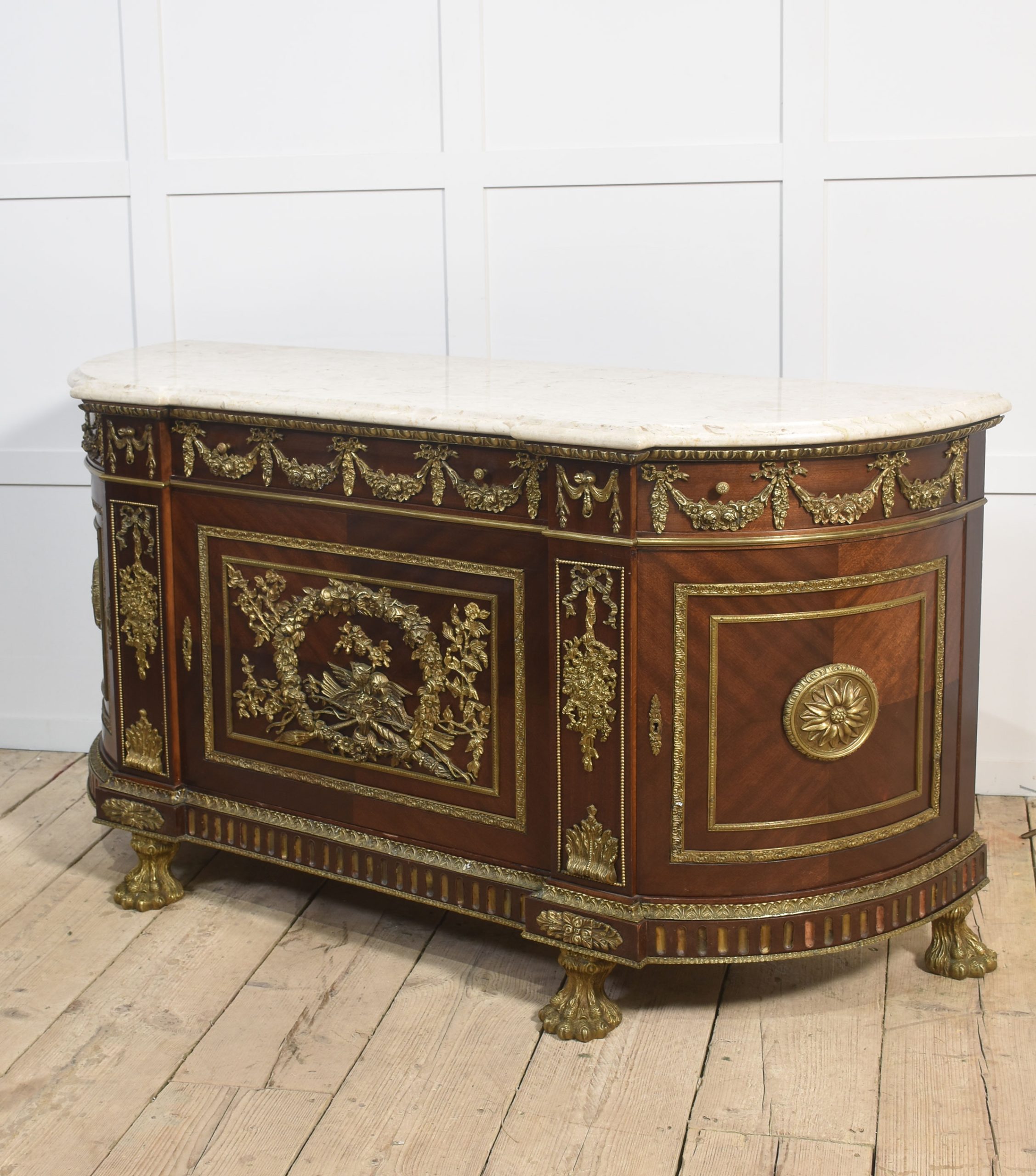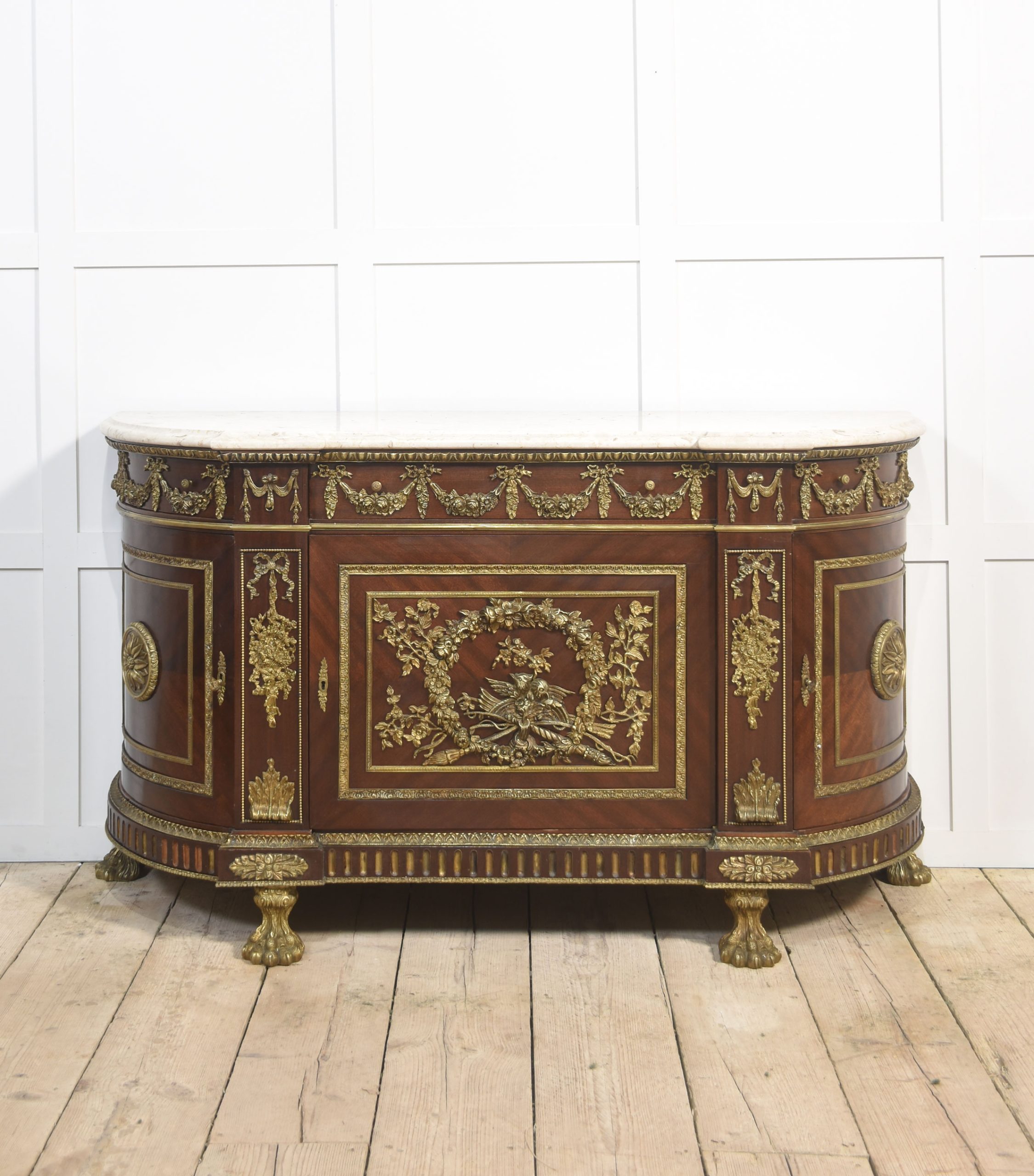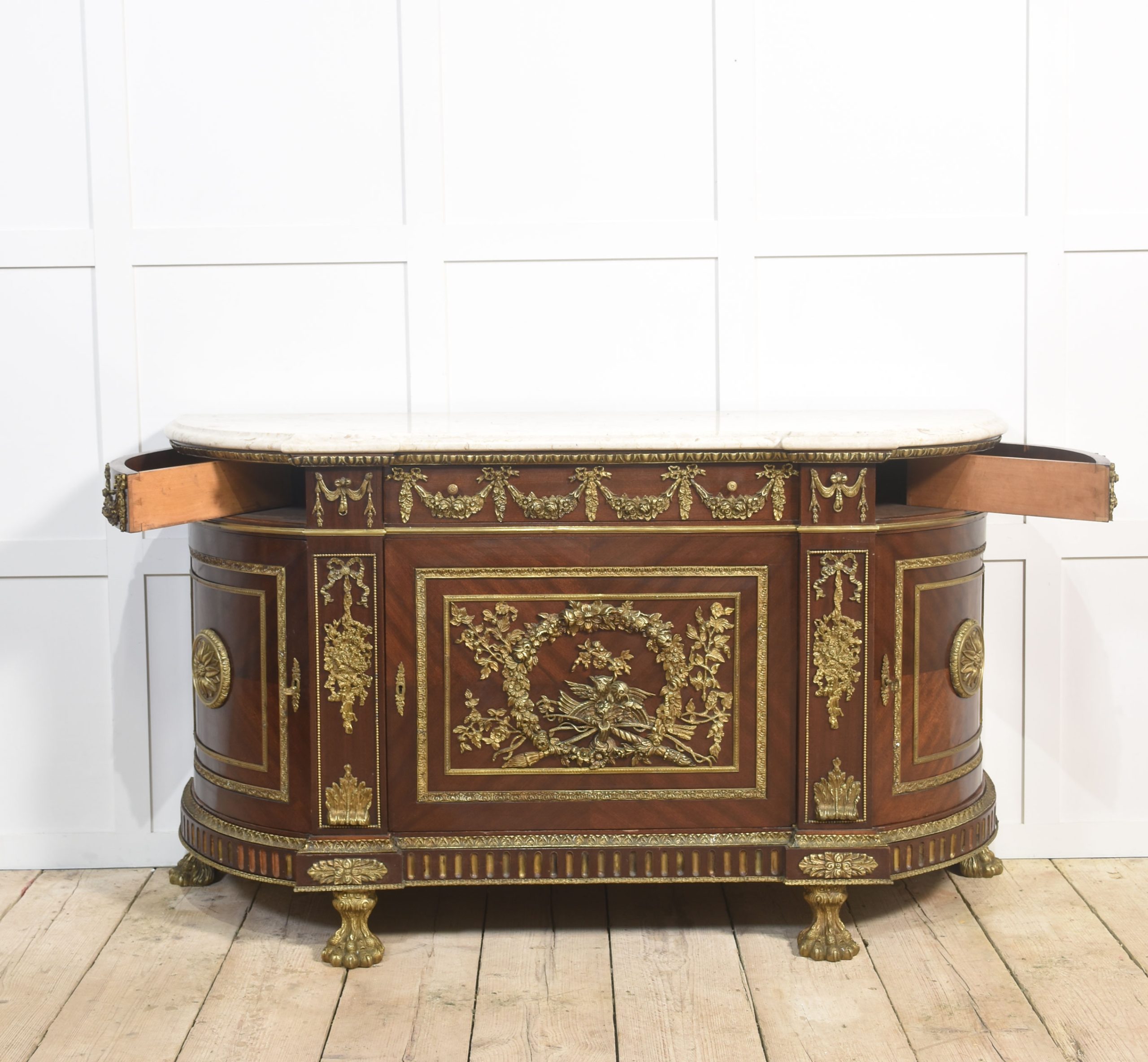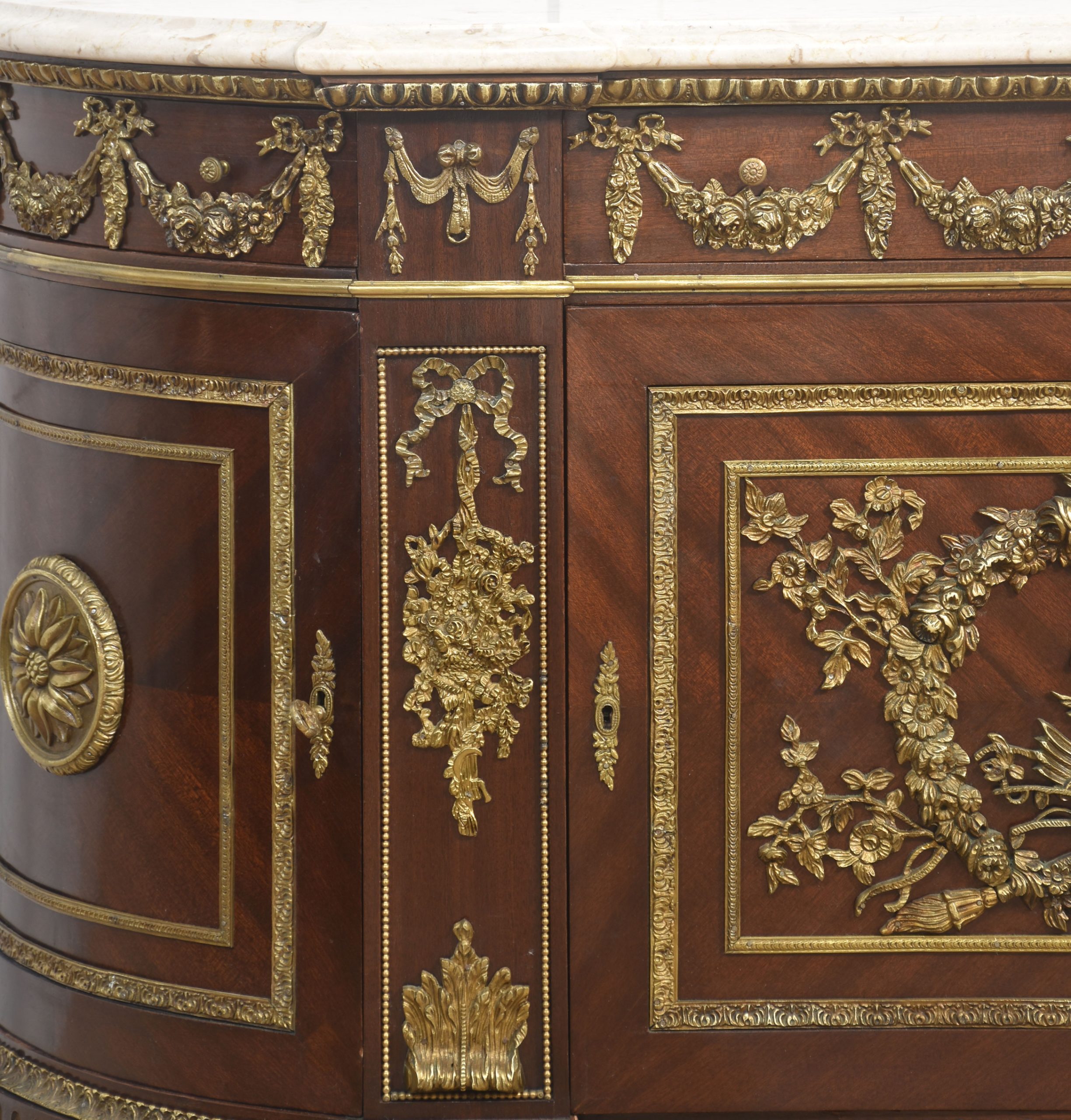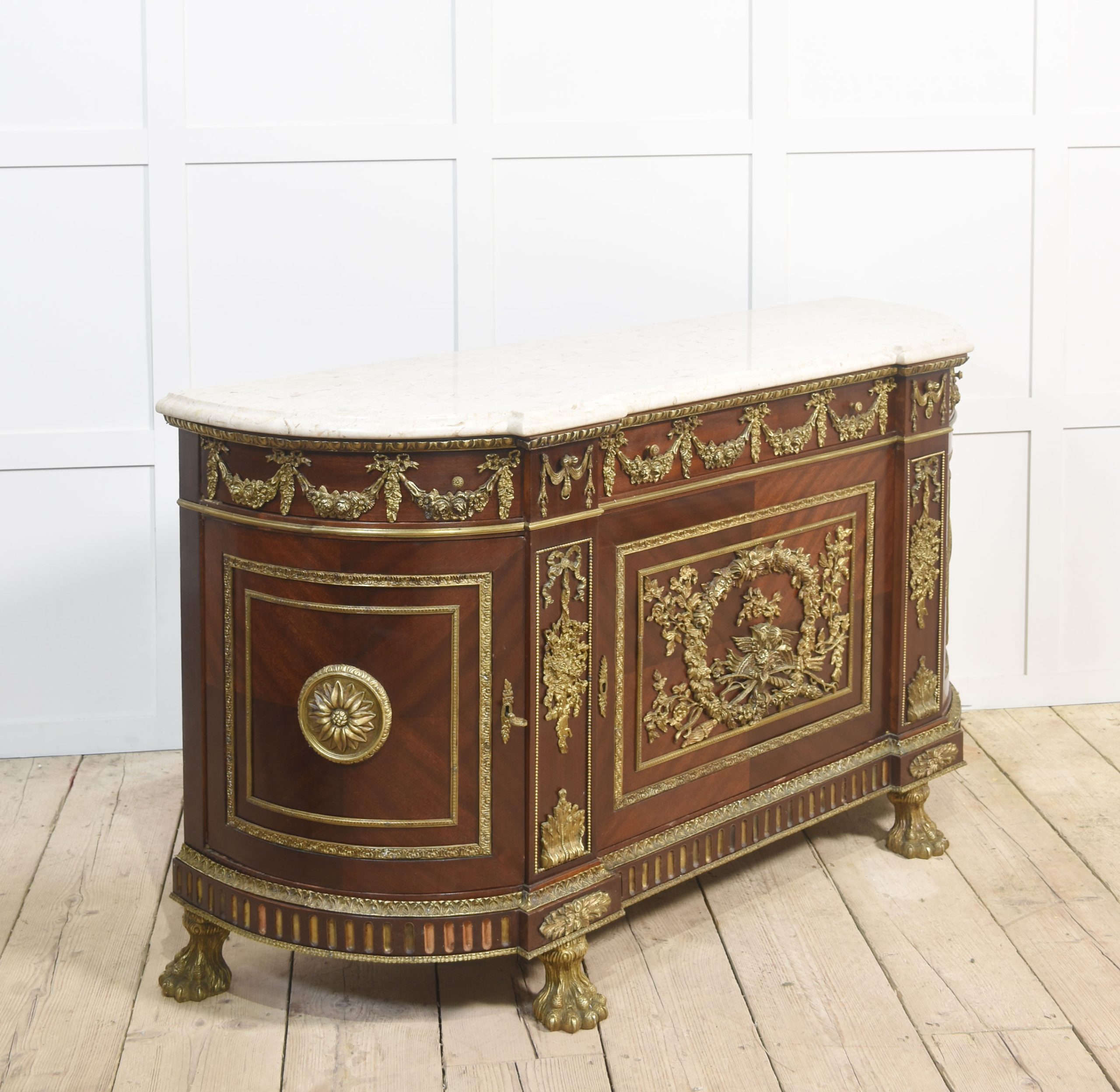 Louis XVI style mahogany credenza with profuse all-over ormolu mounts having a shaped white well-figured breakfront marble top. Above a single frieze drawer with floral swags over a central cabinet door mounted with a laurel wreath flanked by two bowed cabinet doors raised on lion’s paw feet.