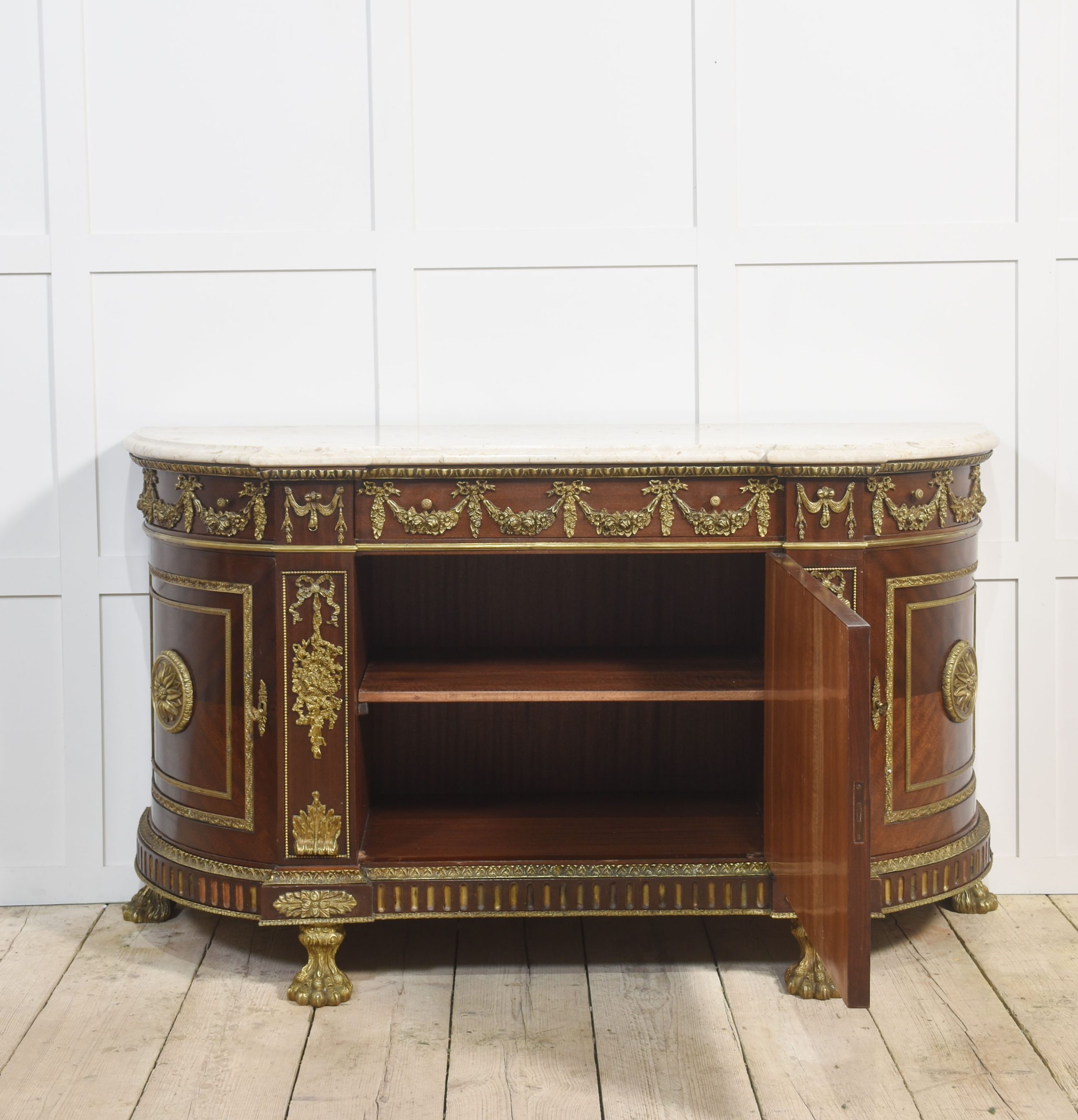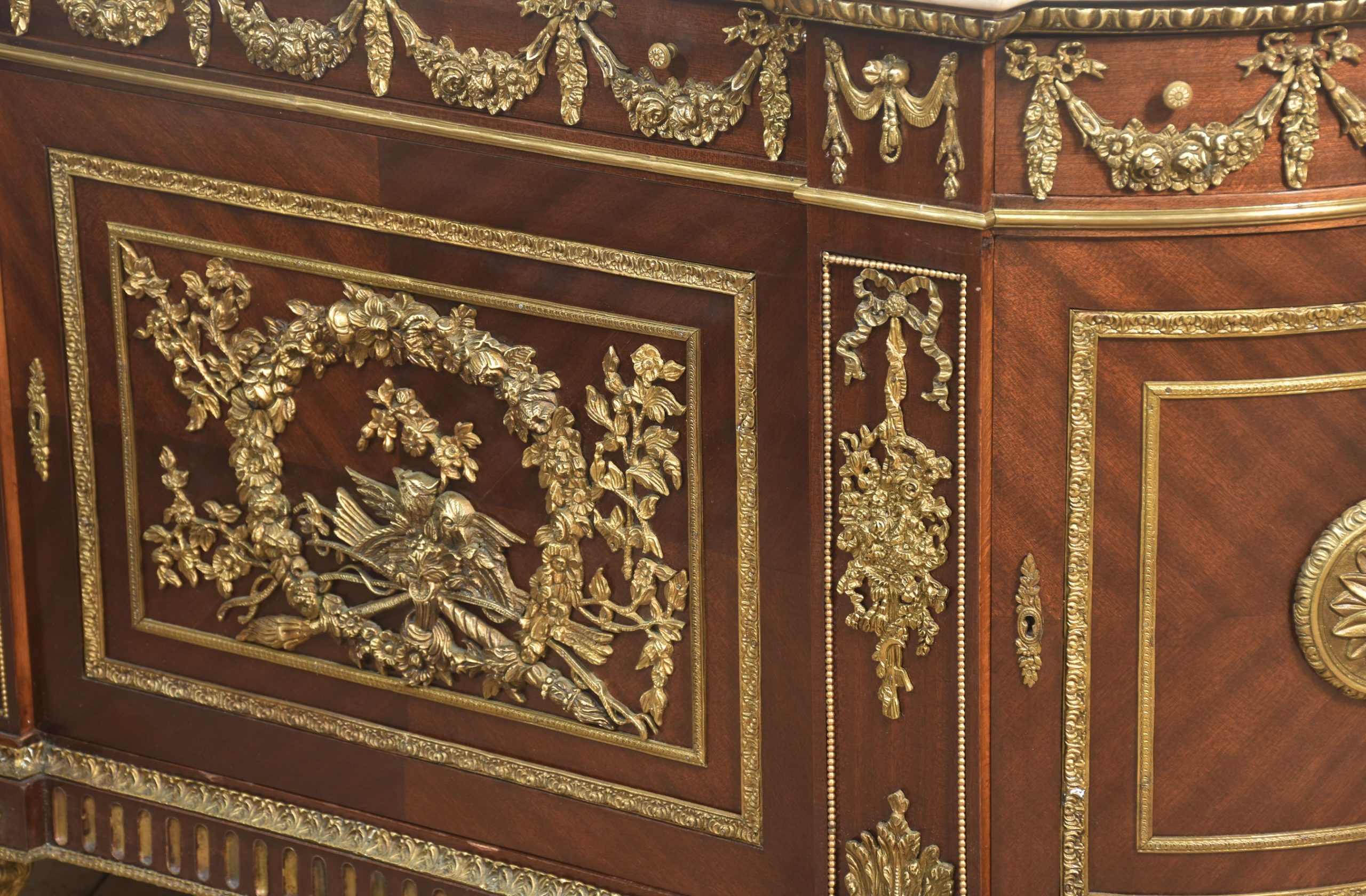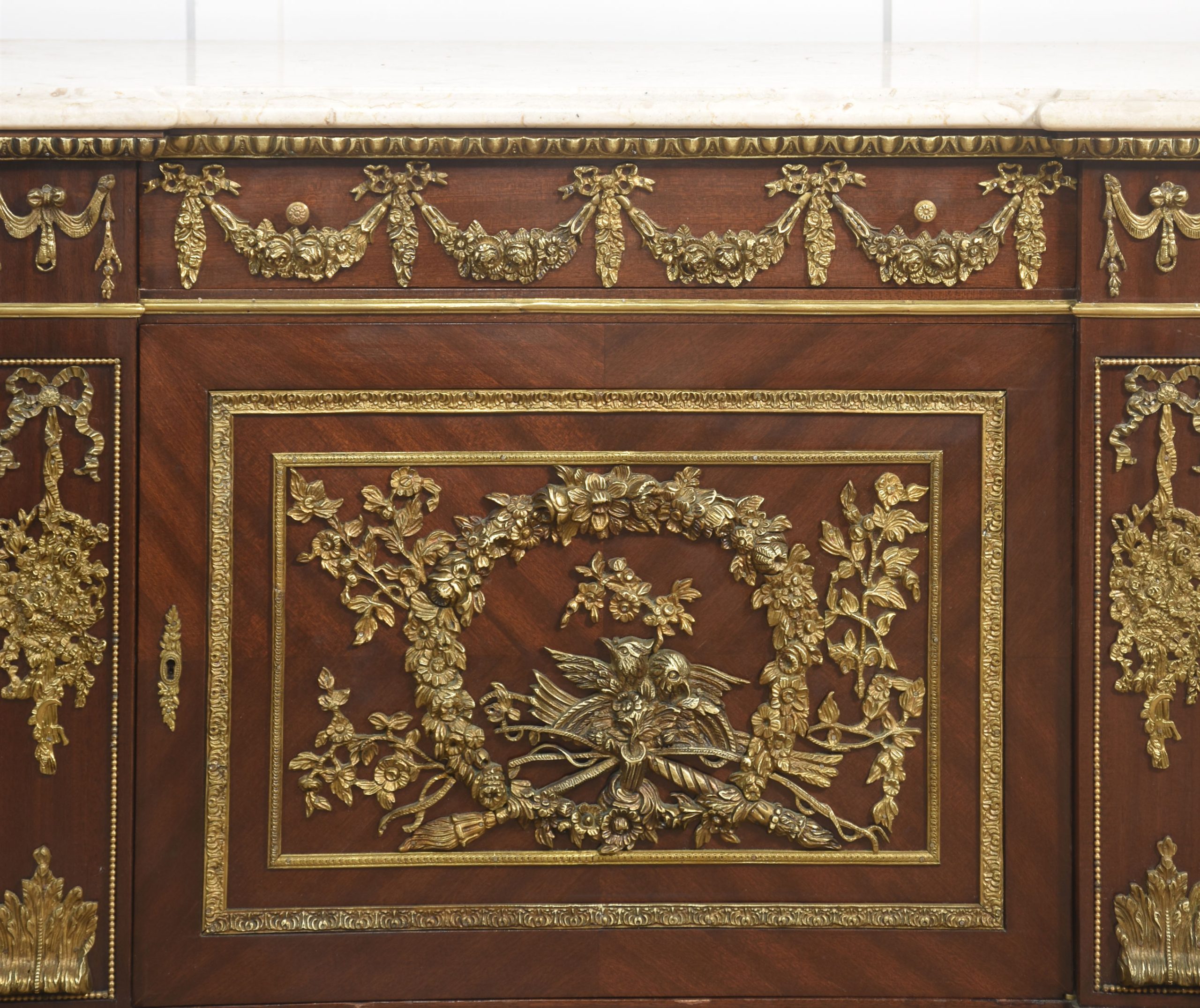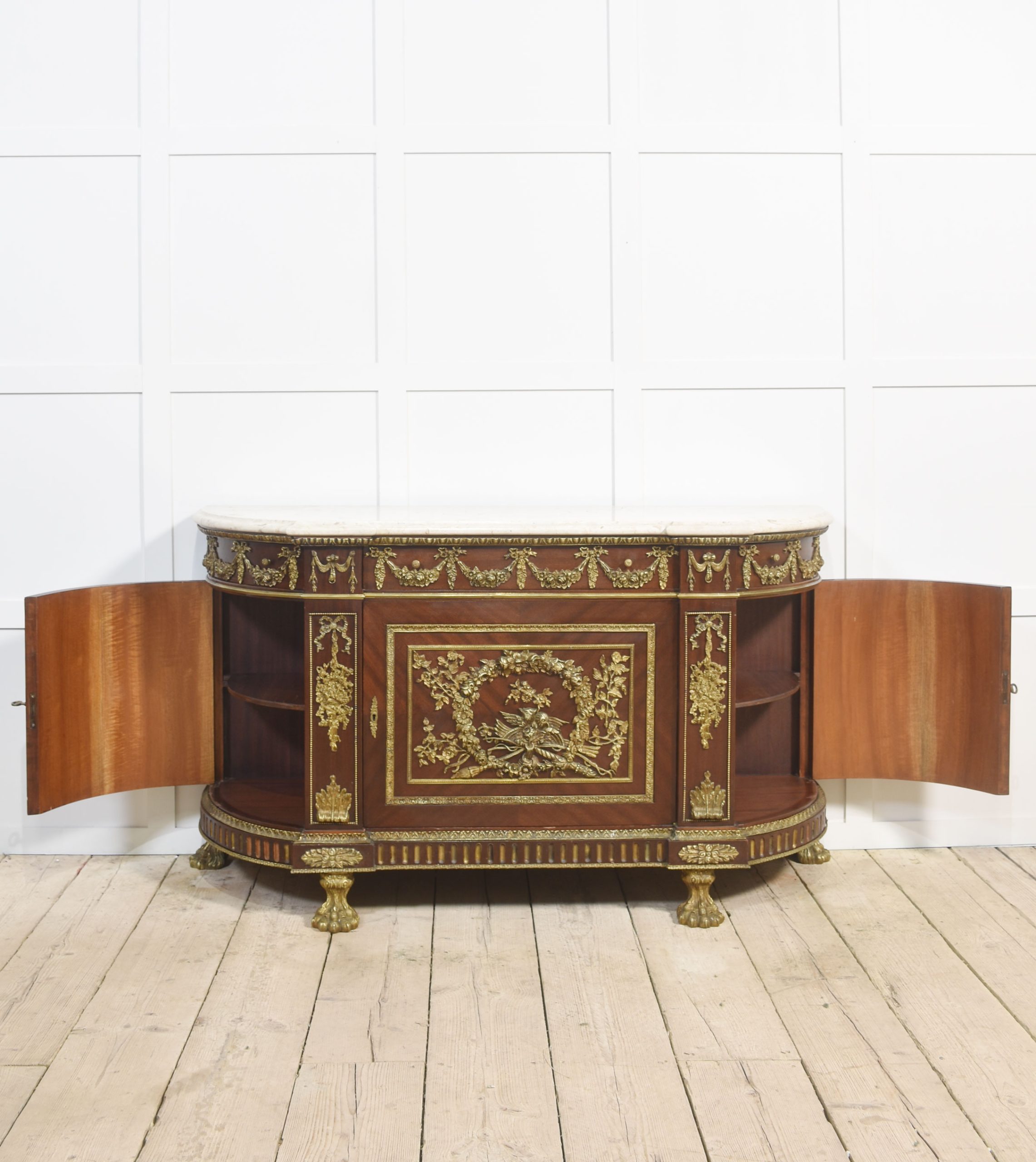 Louis XVI style mahogany credenza with profuse all-over ormolu mounts having a shaped white well-figured breakfront marble top. Above a single frieze drawer with floral swags over a central cabinet door mounted with a laurel wreath flanked by two bowed cabinet doors raised on lion’s paw feet.