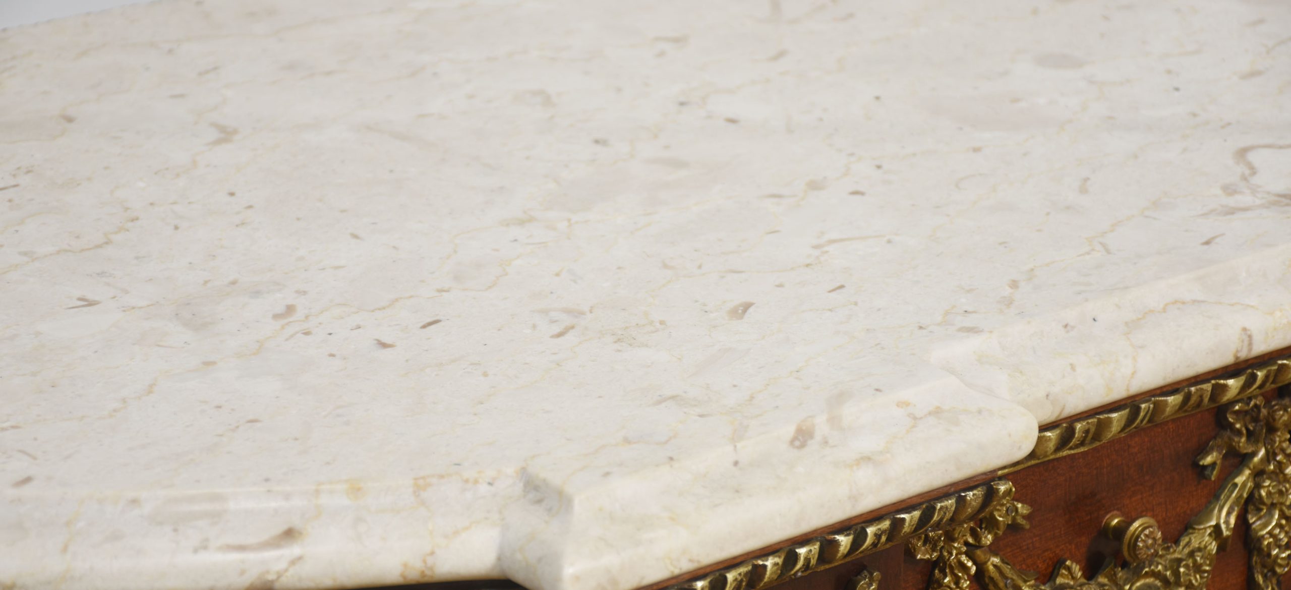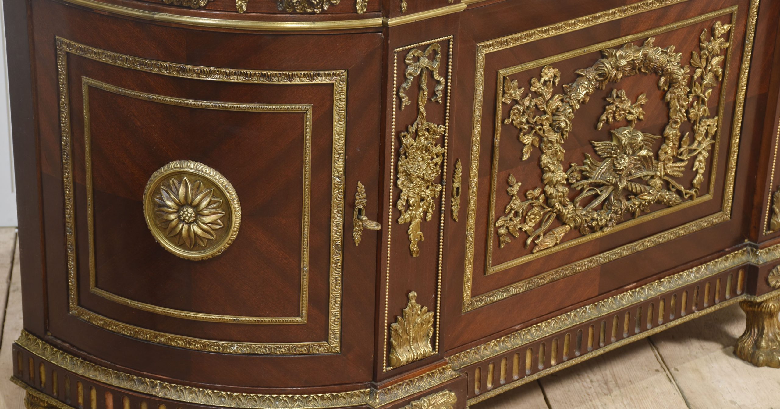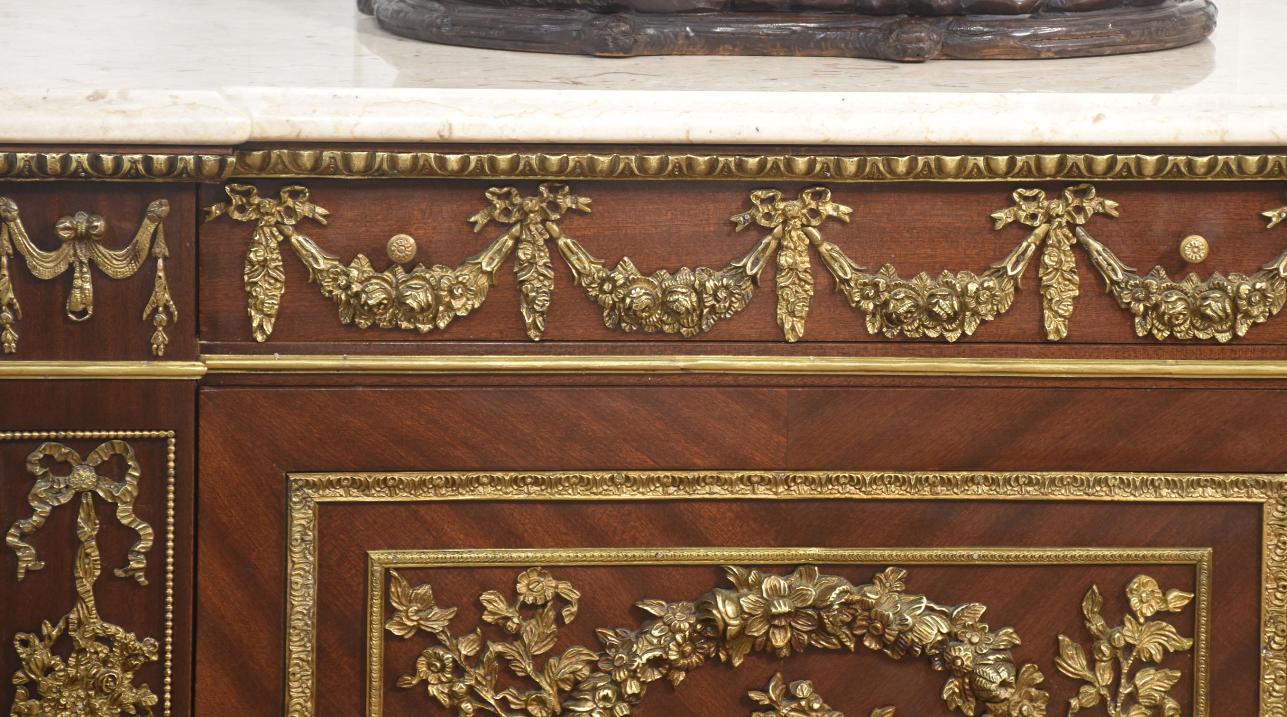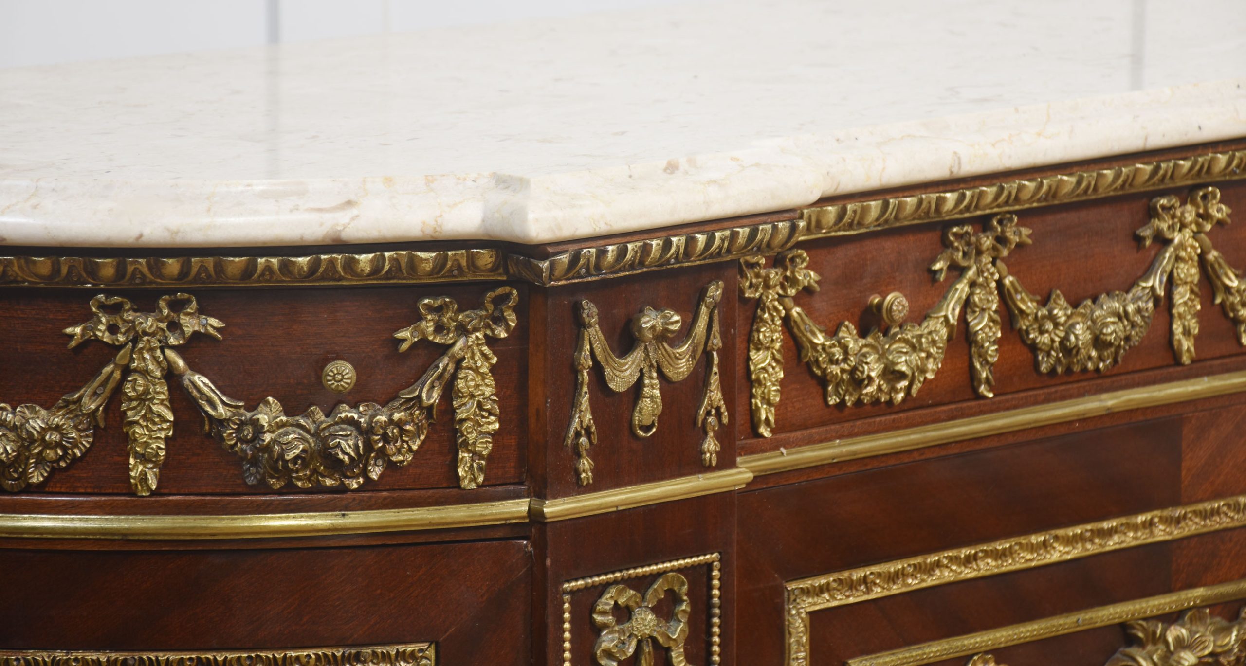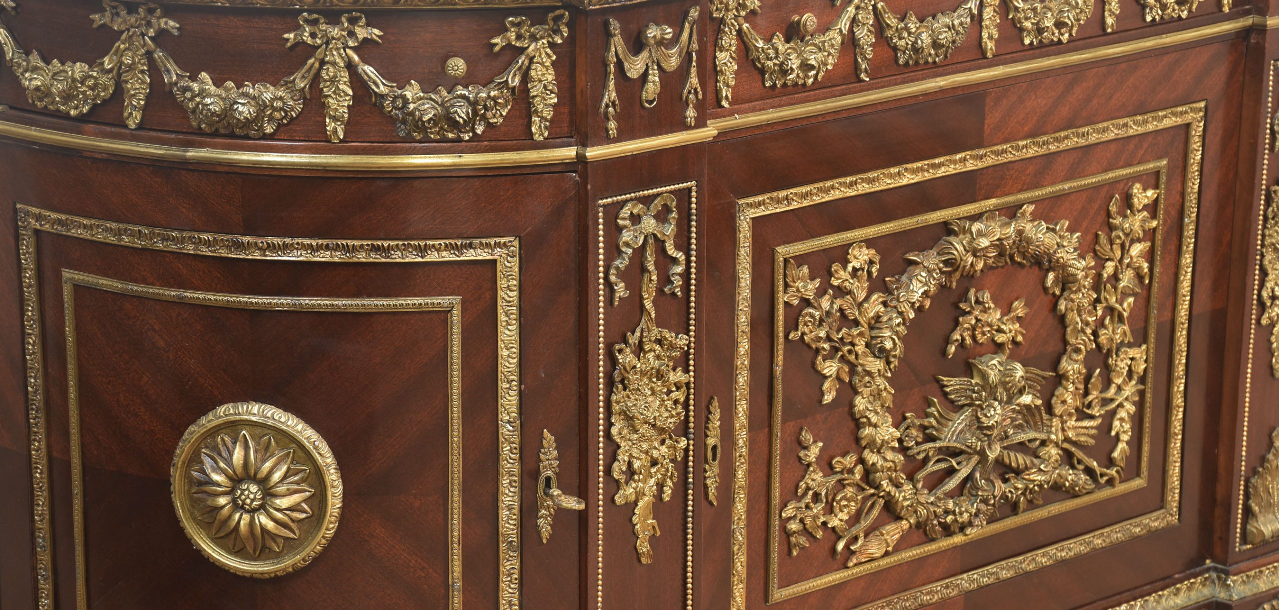 Louis XVI style mahogany credenza with profuse all-over ormolu mounts having a shaped white well-figured breakfront marble top. Above a single frieze drawer with floral swags over a central cabinet door mounted with a laurel wreath flanked by two bowed cabinet doors raised on lion’s paw feet.