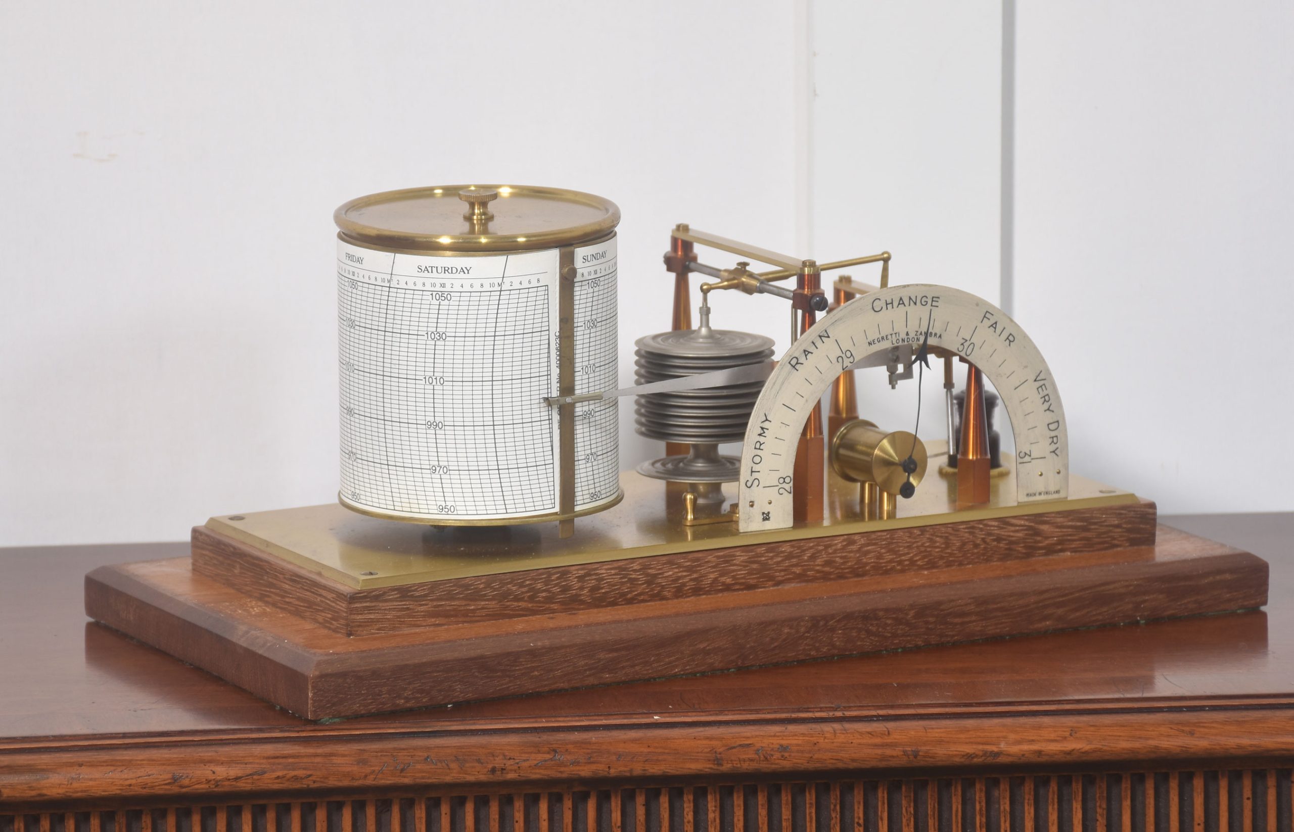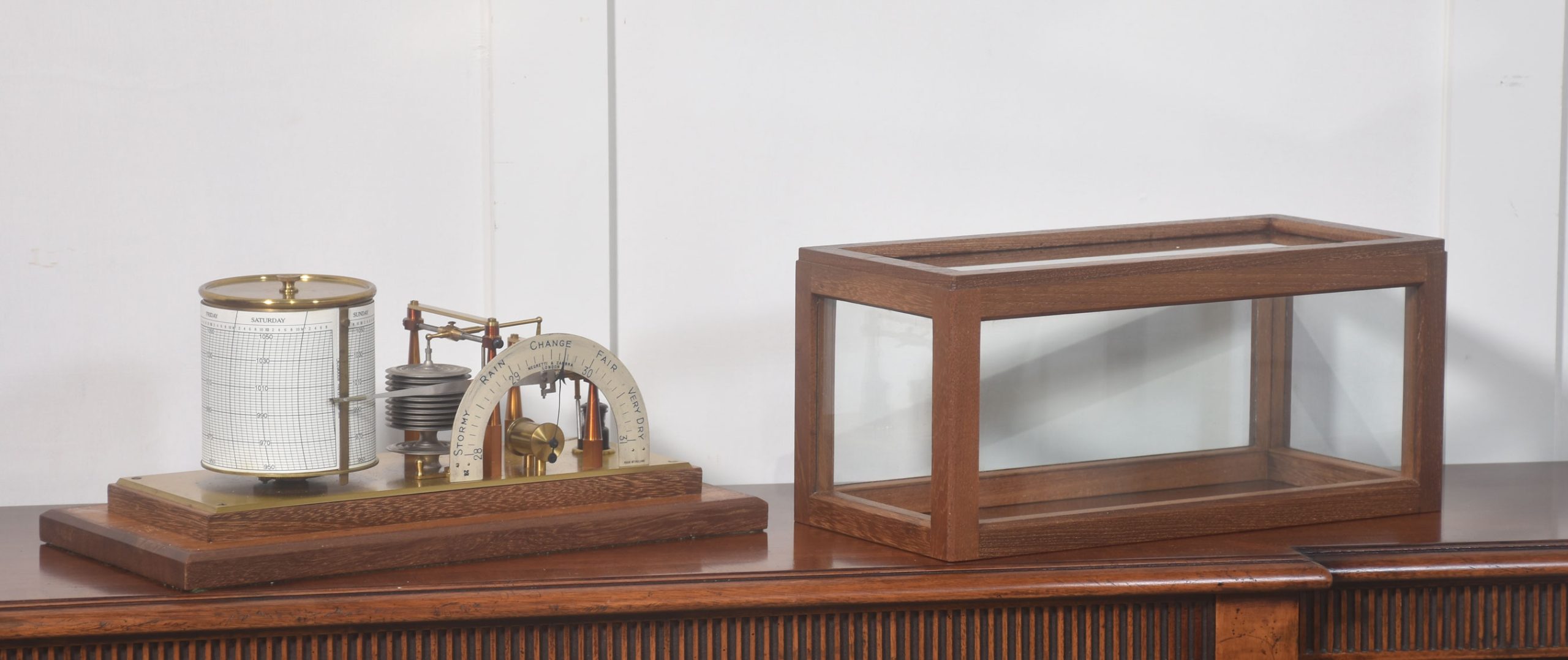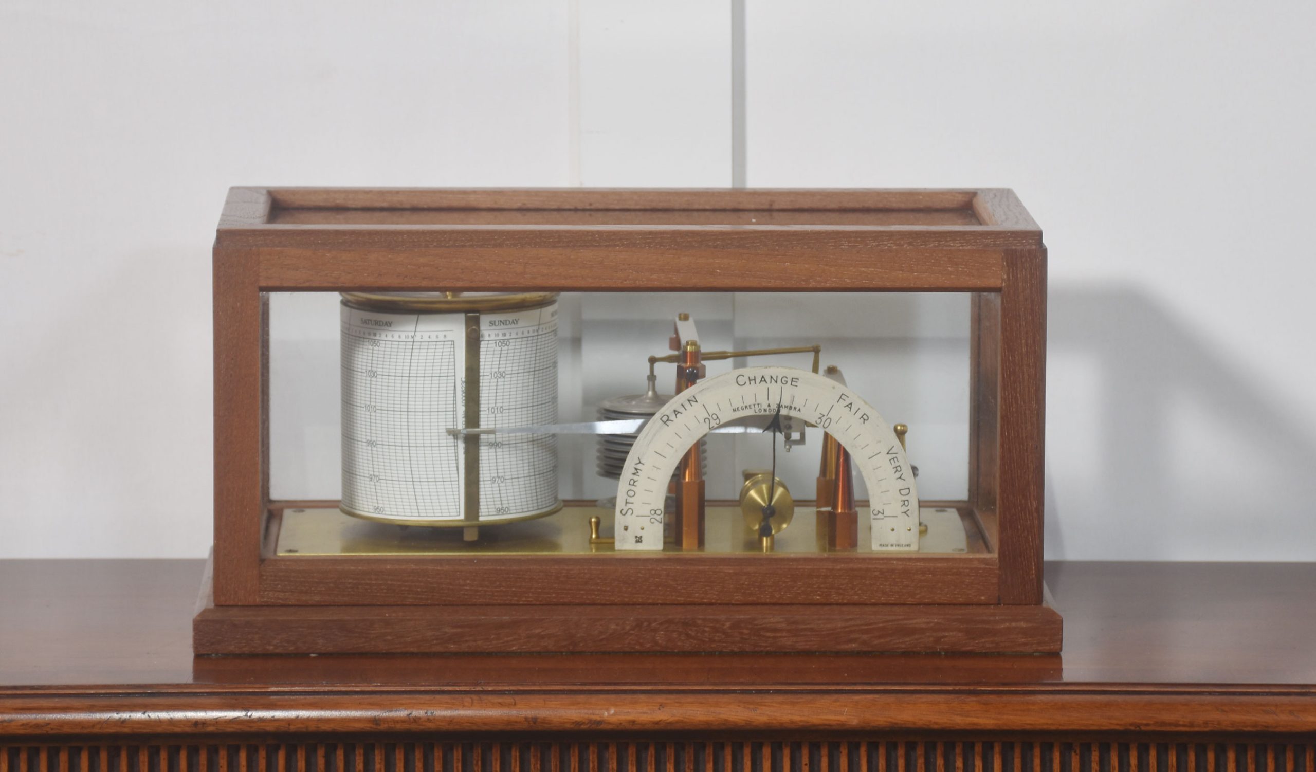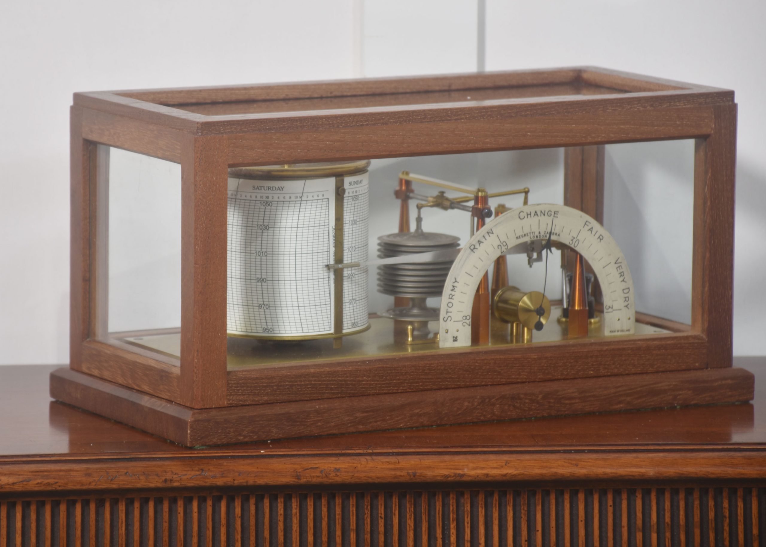Unusual mahogany-cased barograph and barometer by Negretti & Zambra, having five glazed removable lid. The mechanical eight-day movement is housed in the drum, fitted with a seven-day chart that covers one full rotation of the drum. The ink trace, or barogram, on the recording paper, is a visual record of changes in pressure. The aneroid barometer mechanism has eleven stacked vacuum capsules and utilizes a gate suspension, with an unusual half-round barometer dial. The barograph having a glass ink bottle recessed into the case.
