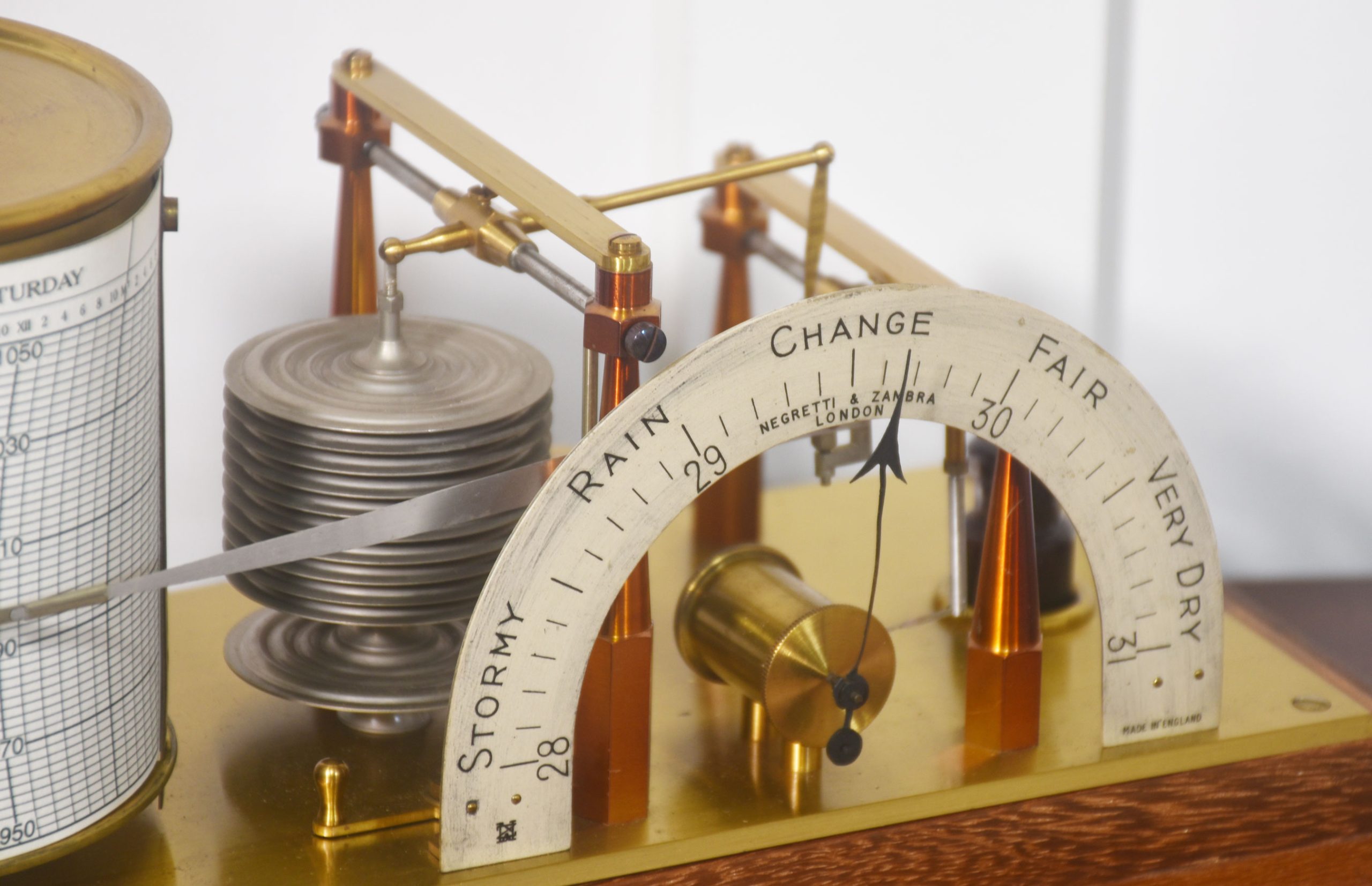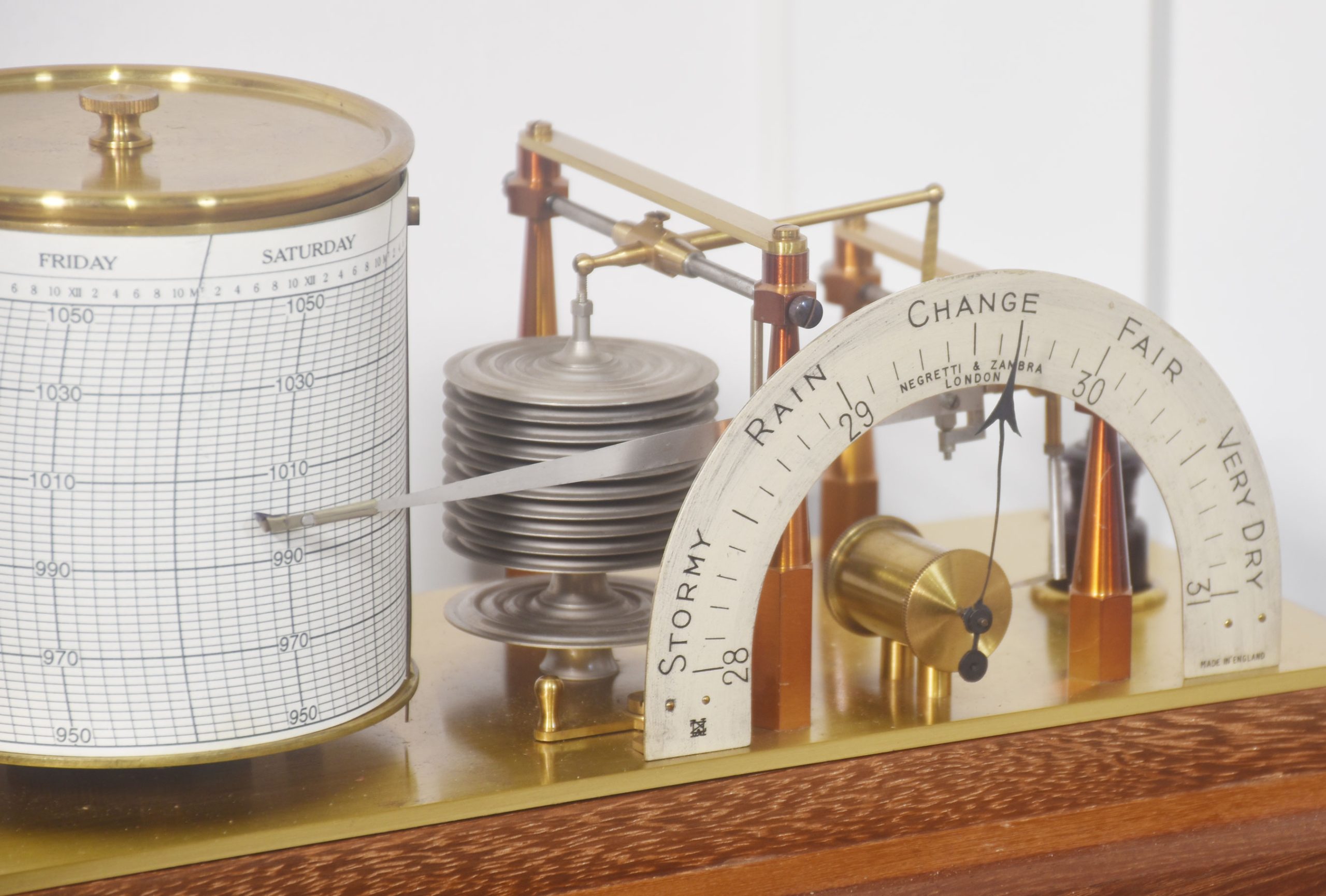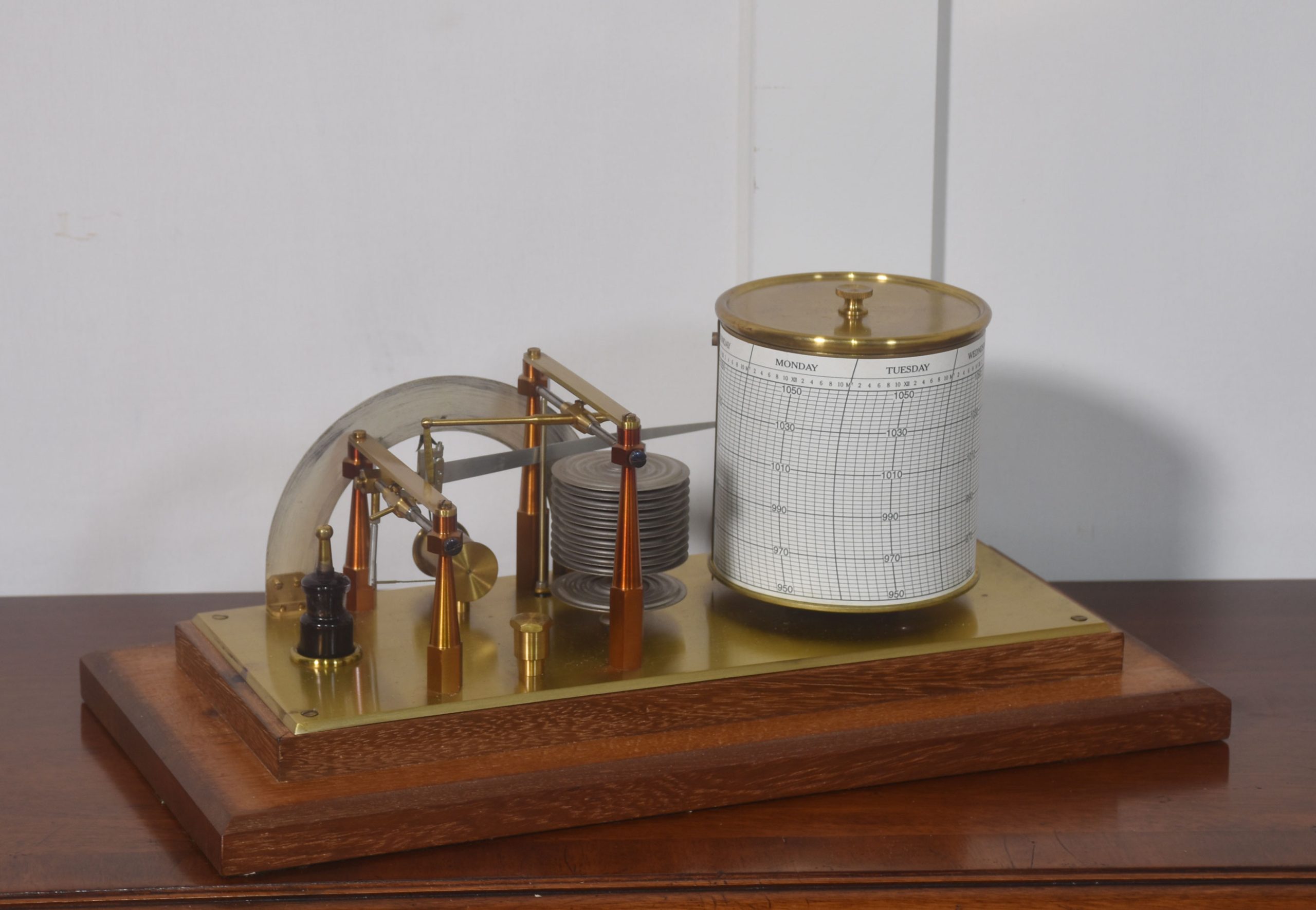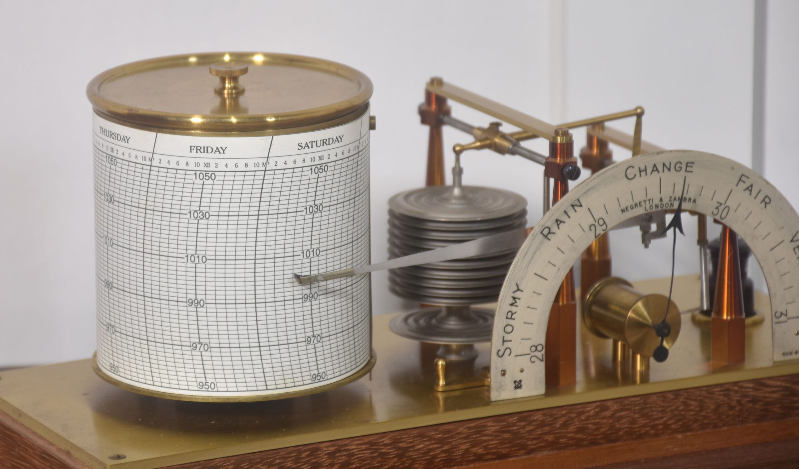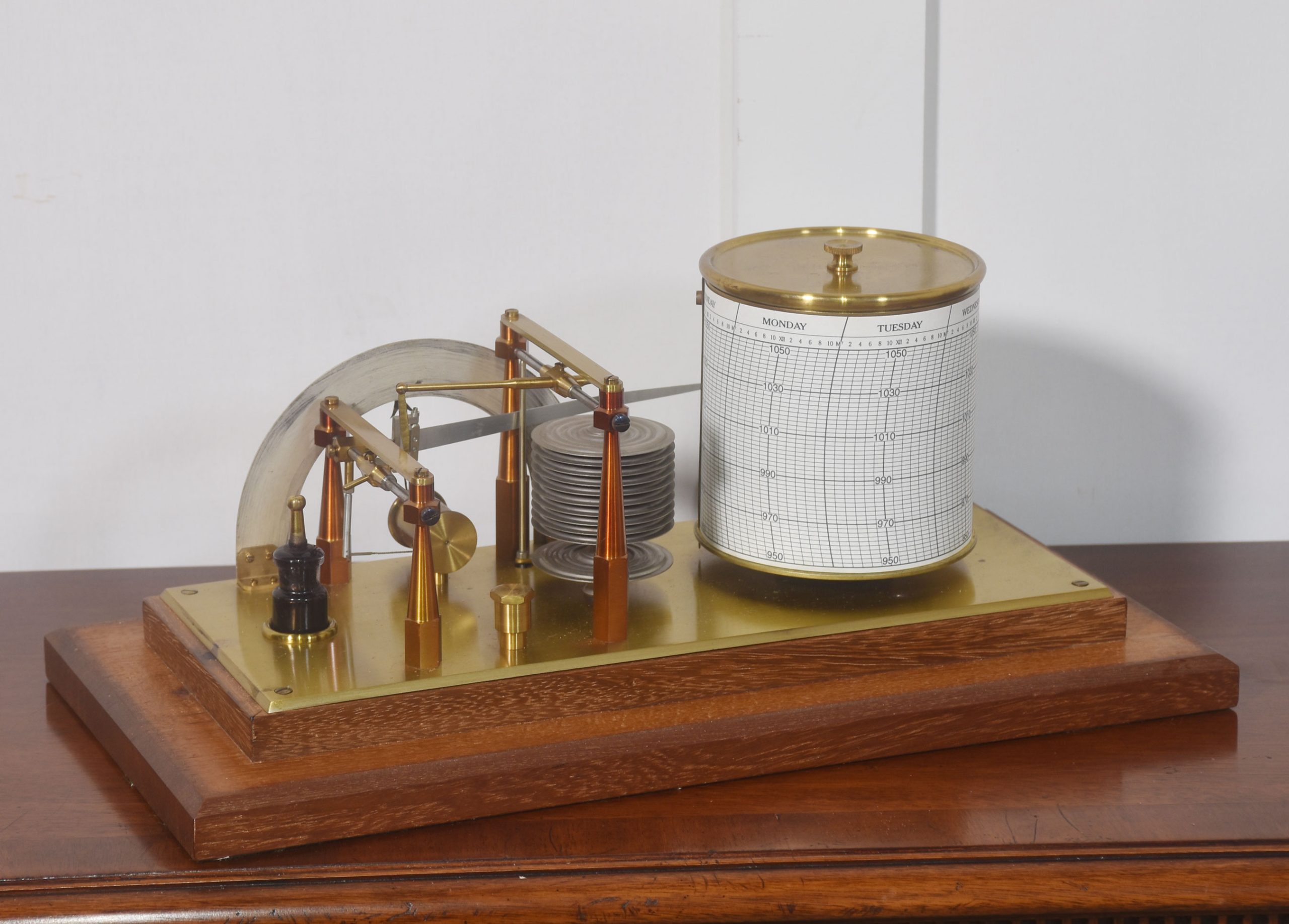 Unusual mahogany-cased barograph and barometer by Negretti & Zambra, having five glazed removable lid. The mechanical eight-day movement is housed in the drum, fitted with a seven-day chart that covers one full rotation of the drum. The ink trace, or barogram, on the recording paper, is a visual record of changes in pressure. The aneroid barometer mechanism has eleven stacked vacuum capsules and utilizes a gate suspension, with an unusual half-round barometer dial. The barograph having a glass ink bottle recessed into the case.