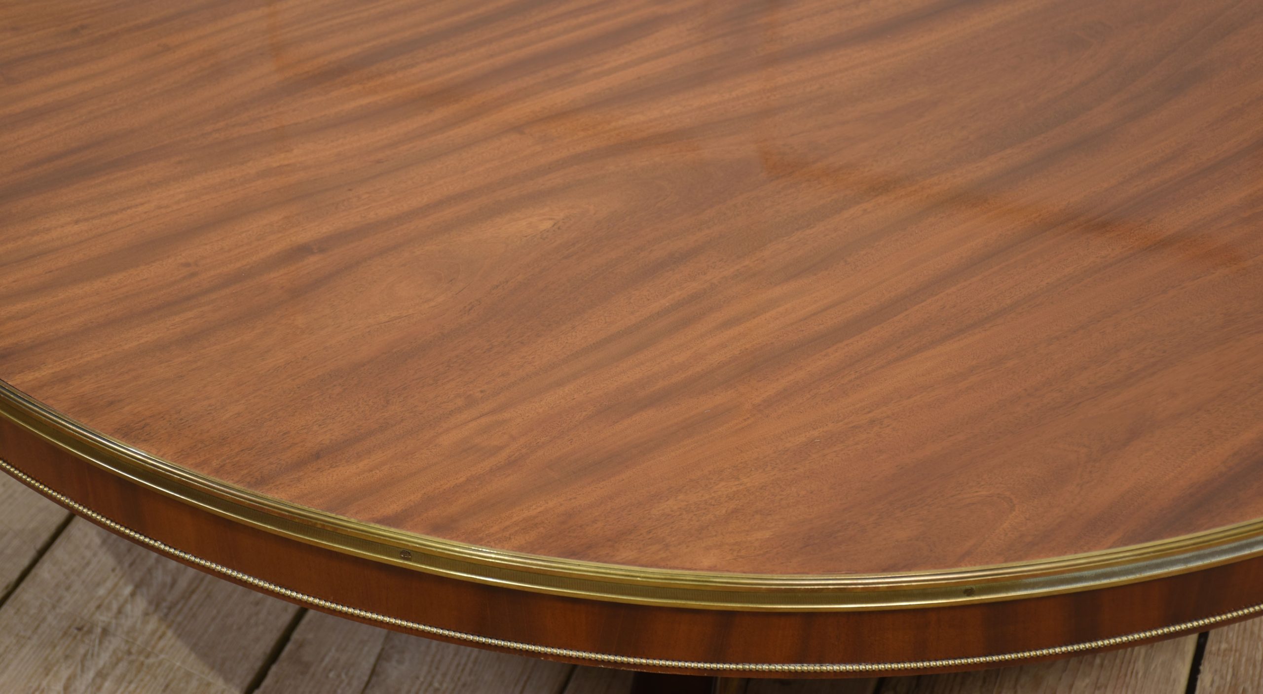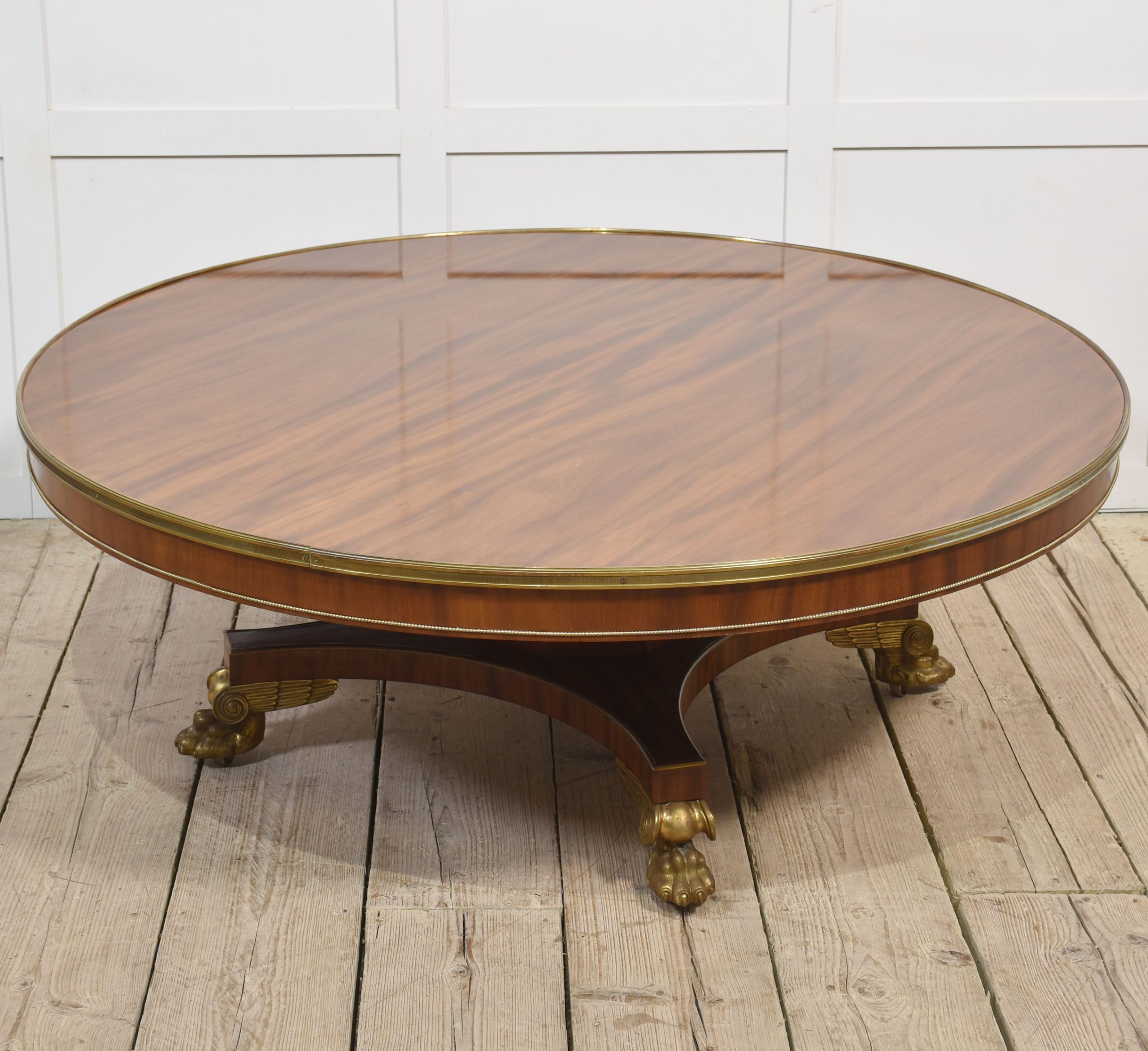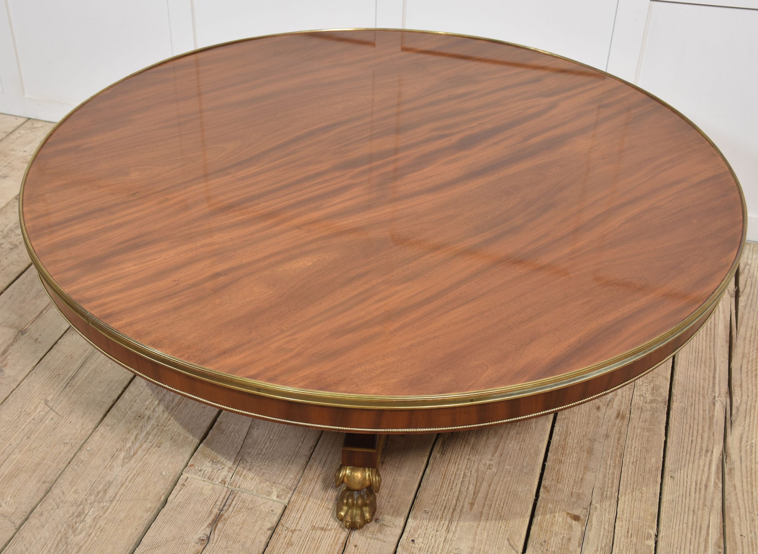 Mahogany coffee table. The well-figured circular top having a brass-bound edge. Raised on a splayed platform base terminating in paw feet and brass castors.