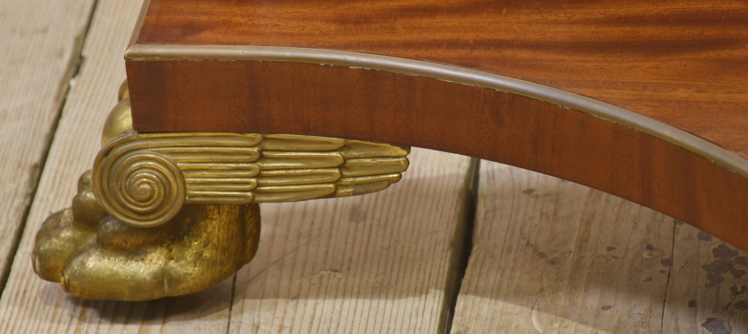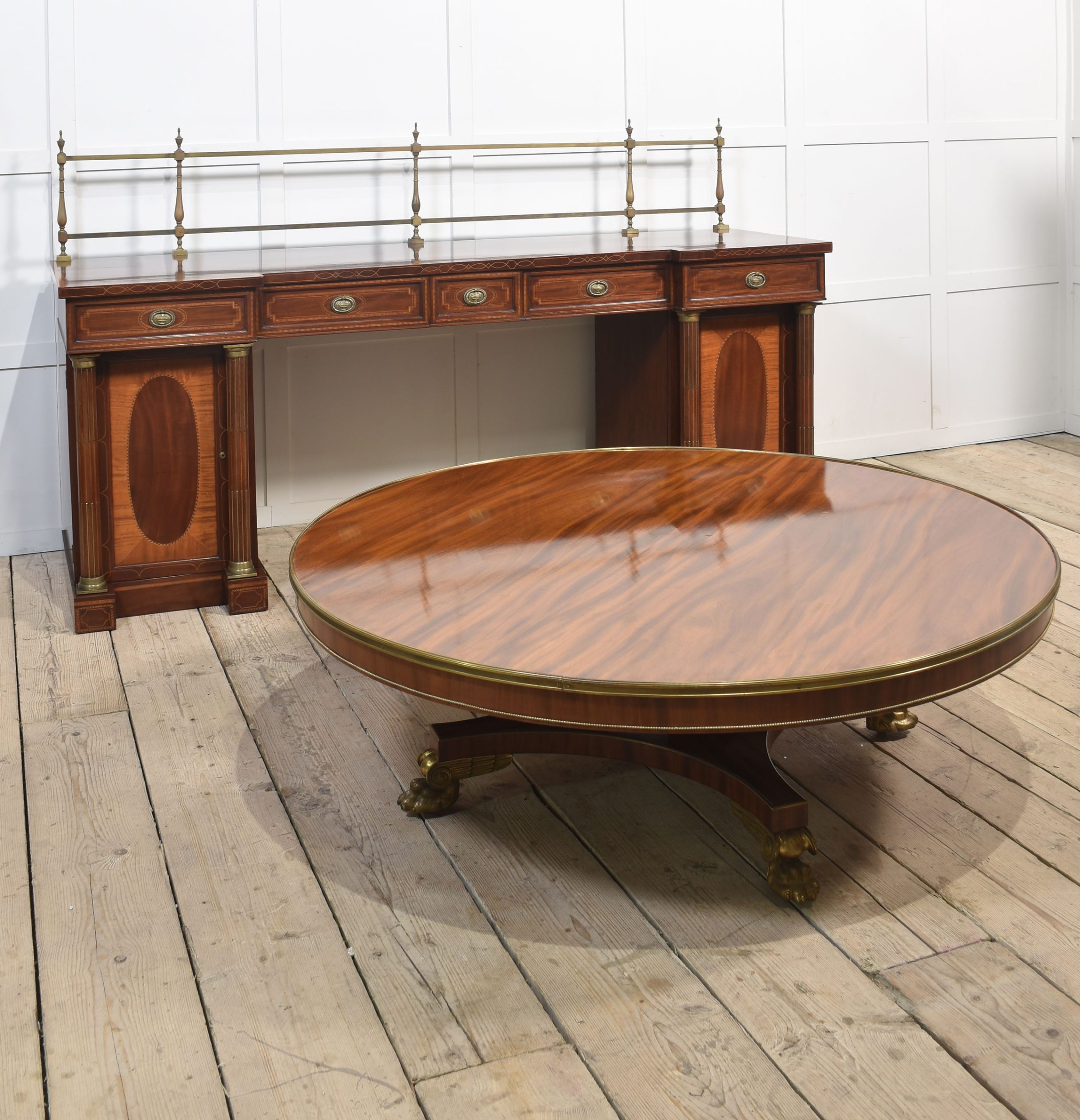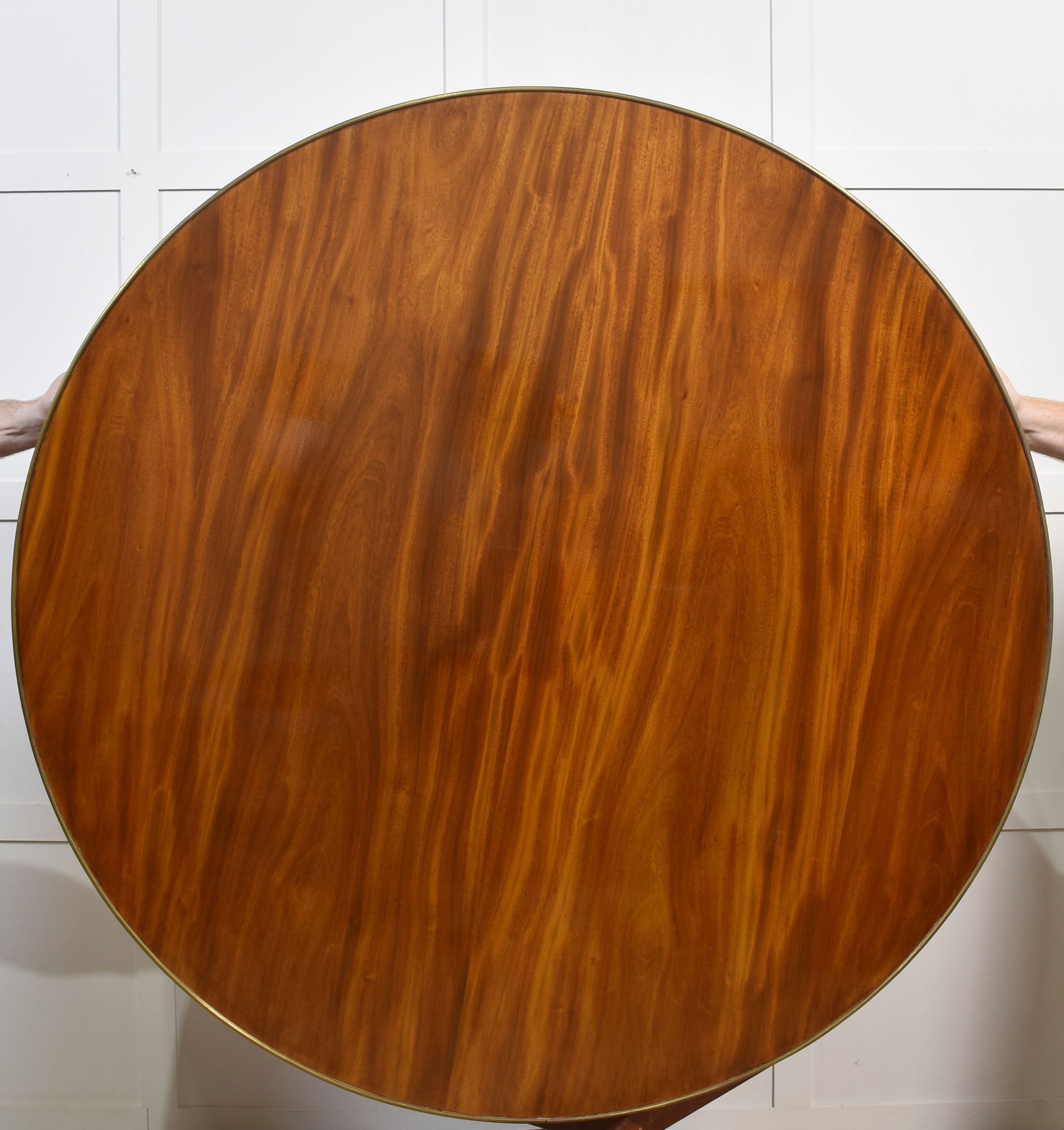 Mahogany coffee table. The well-figured circular top having a brass-bound edge. Raised on a splayed platform base terminating in paw feet and brass castors.