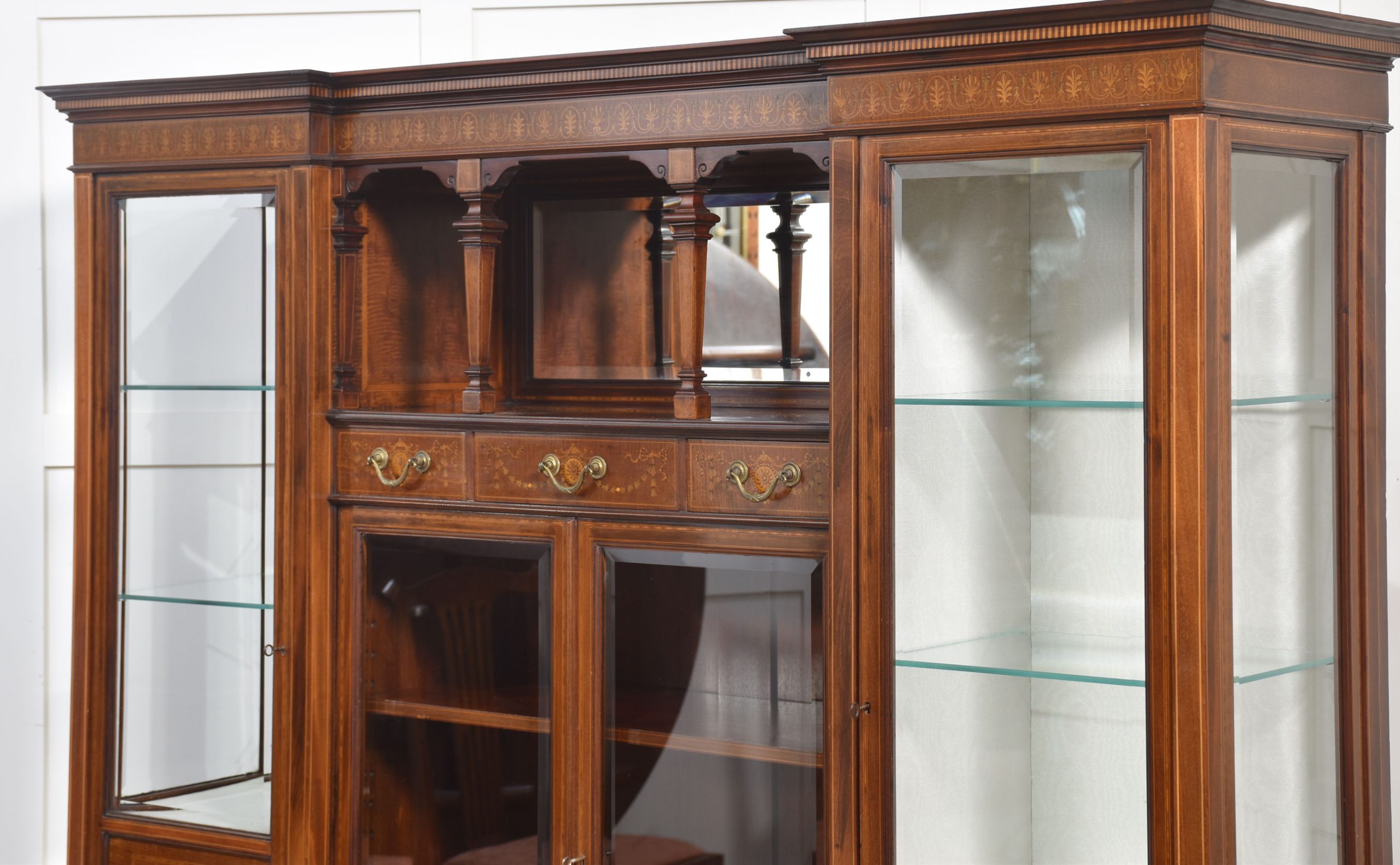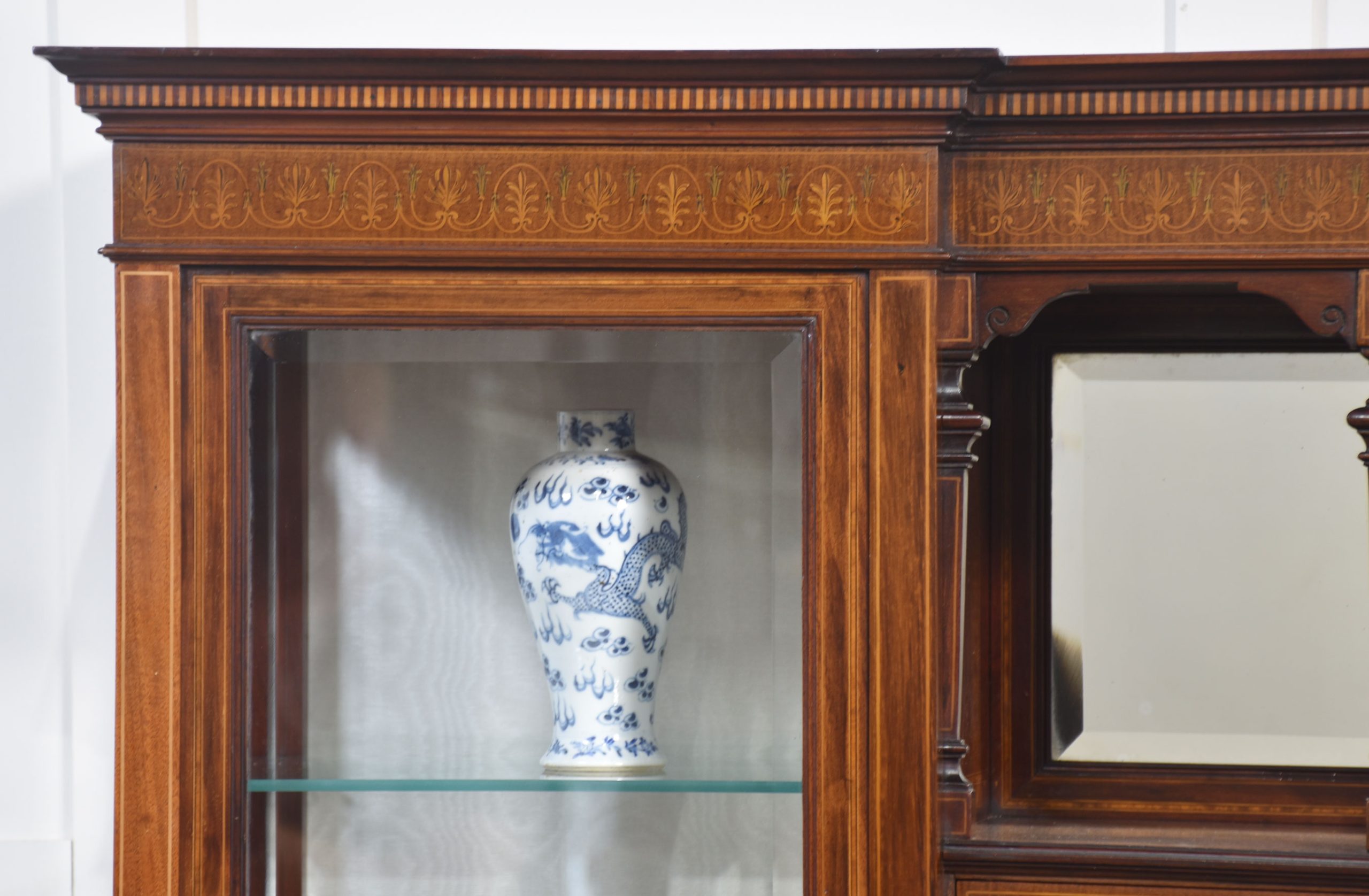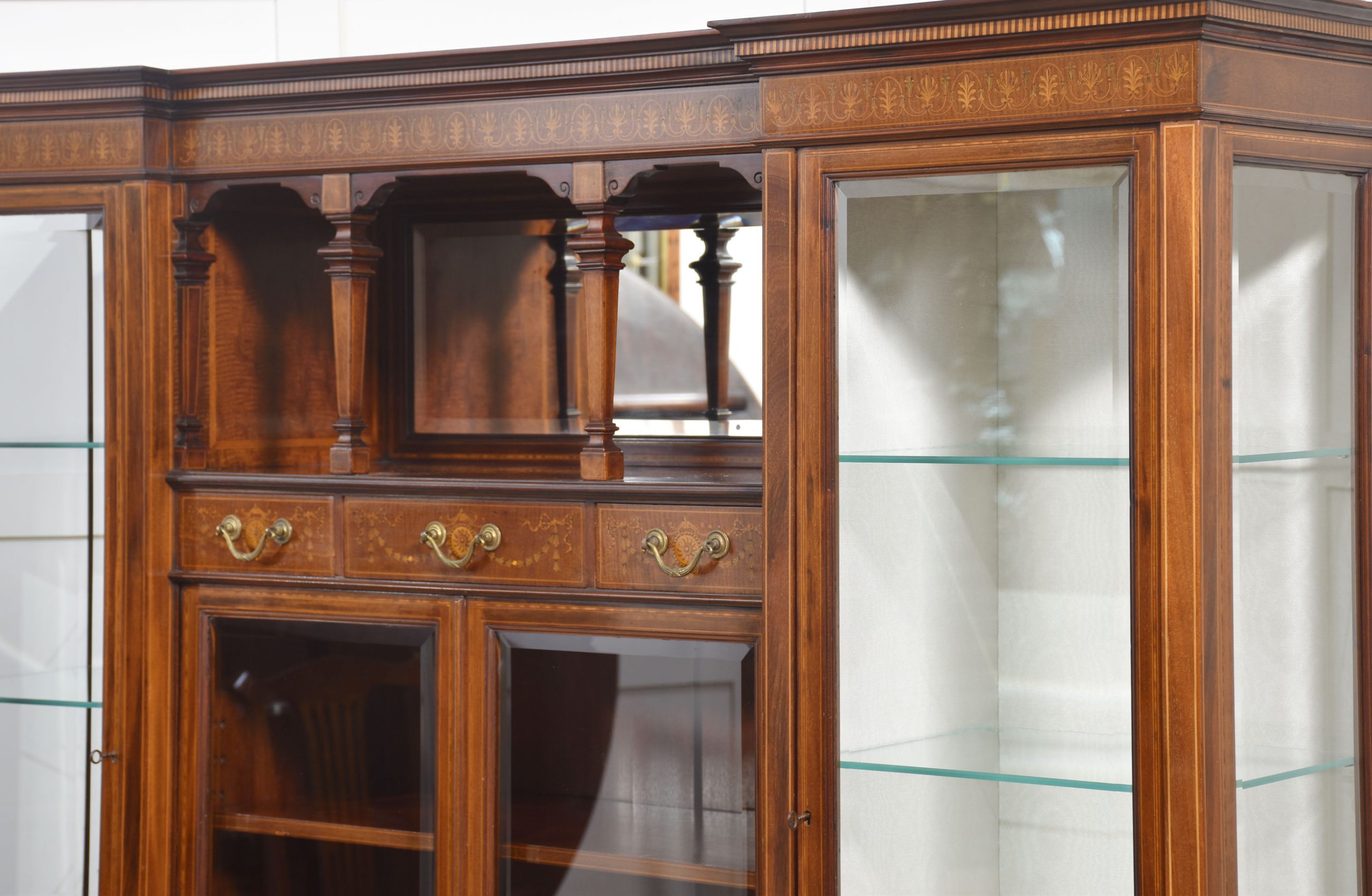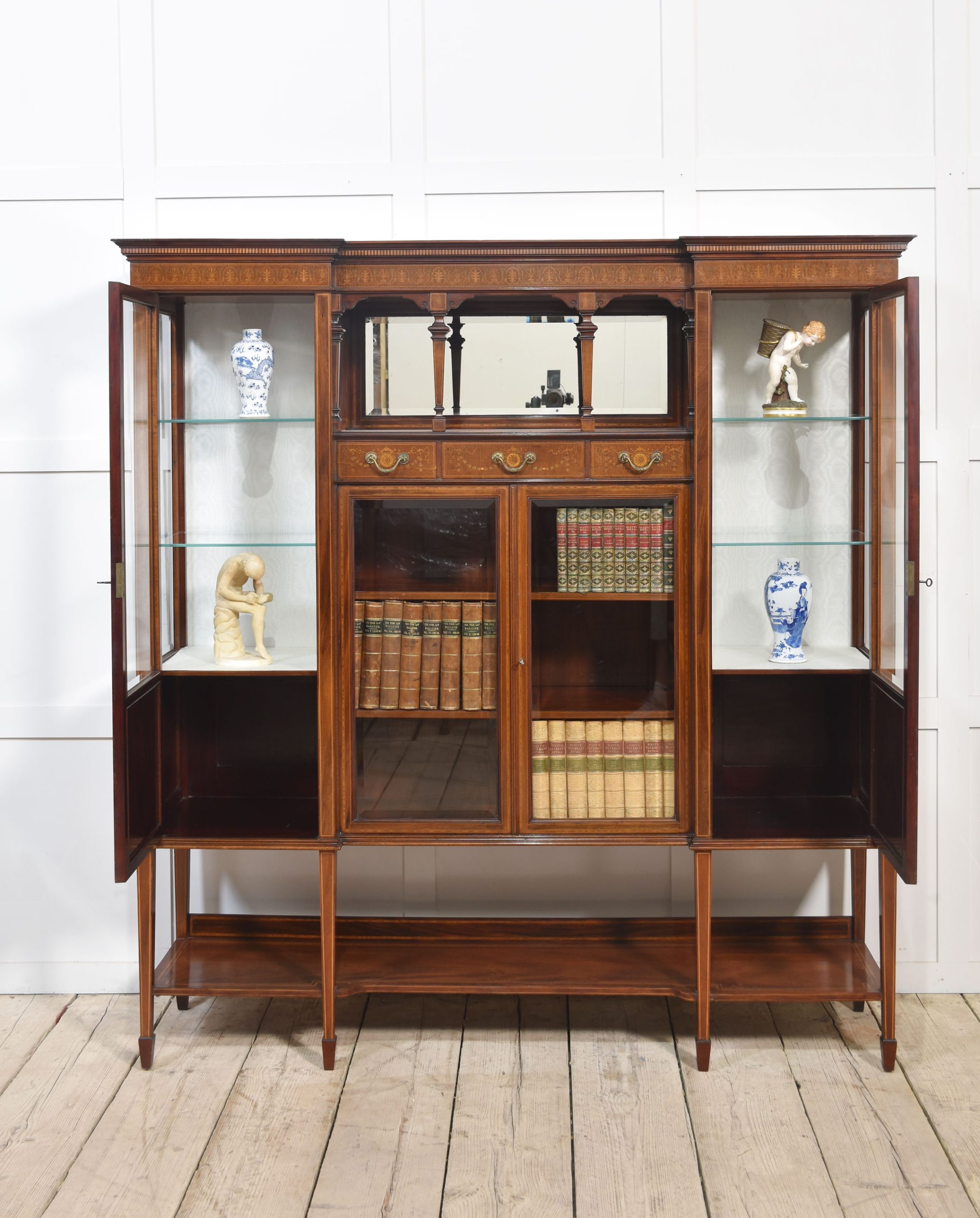 Mahogany inlaid inverted breakfront display cabinet, the moulded top to the central bevelled mirror back arcaded recess above three small drawers and a pair of glazed doors below flanked by a pair of glazed cabinet doors enclosing a lined interior with three shelves. All raised upon six tapering legs terminating in spade feet, united by under tier.