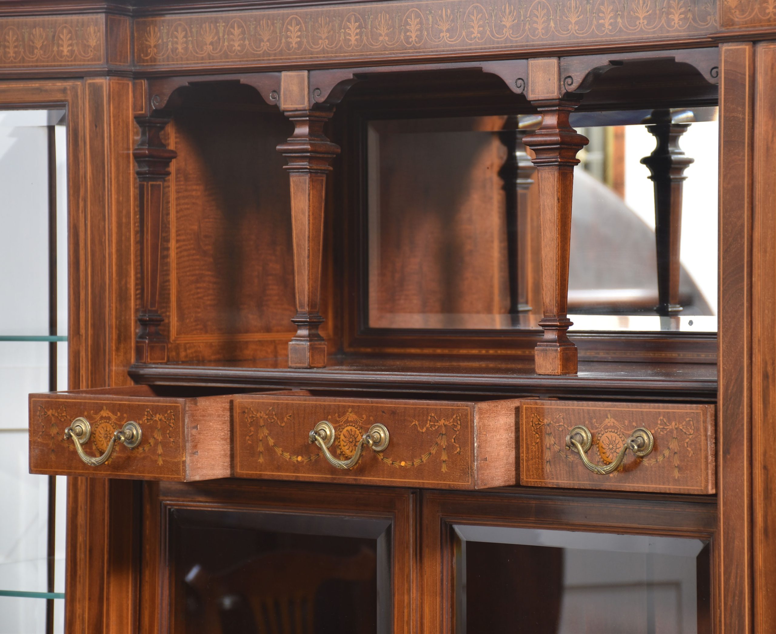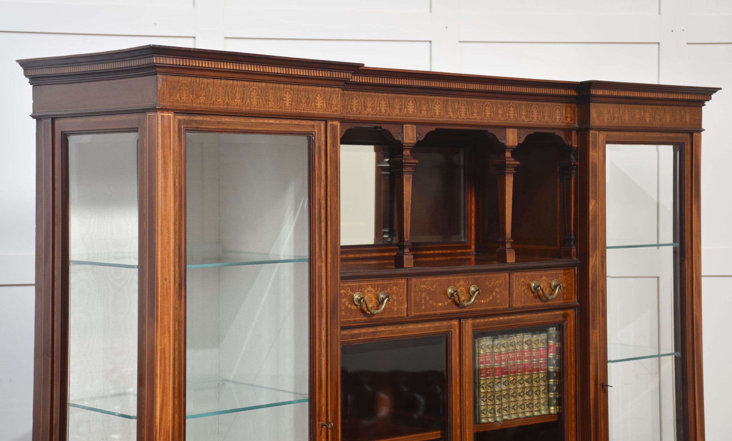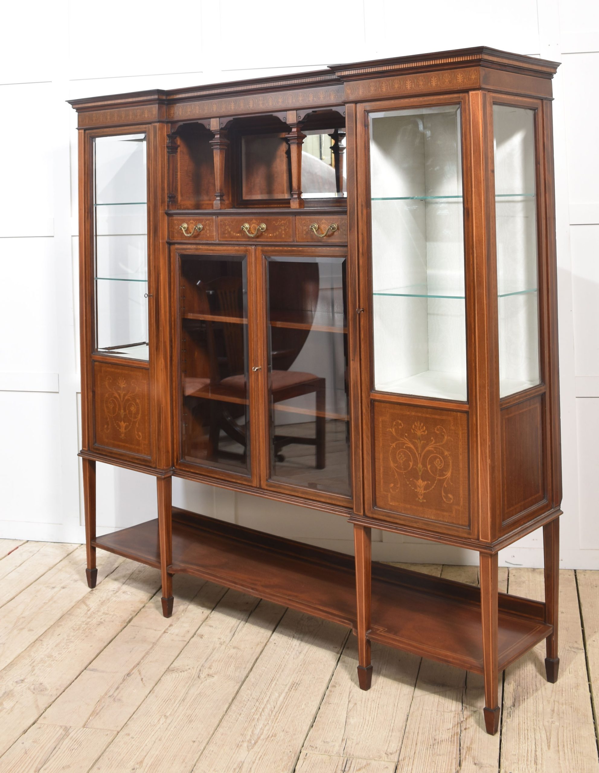 Mahogany inlaid inverted breakfront display cabinet, the moulded top to the central bevelled mirror back arcaded recess above three small drawers and a pair of glazed doors below flanked by a pair of glazed cabinet doors enclosing a lined interior with three shelves. All raised upon six tapering legs terminating in spade feet, united by under tier.