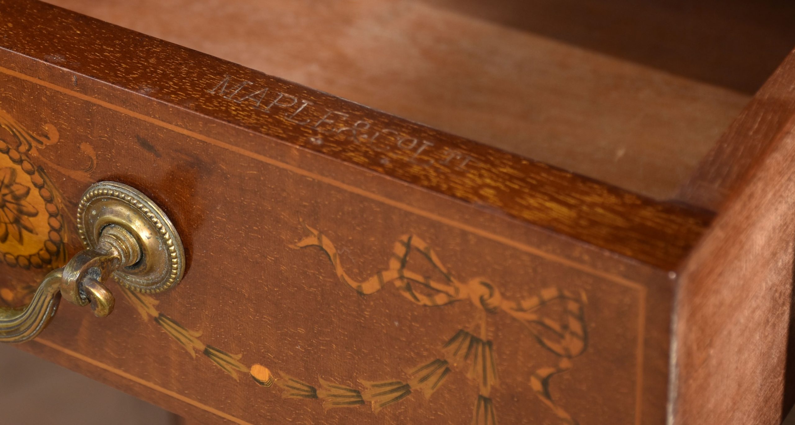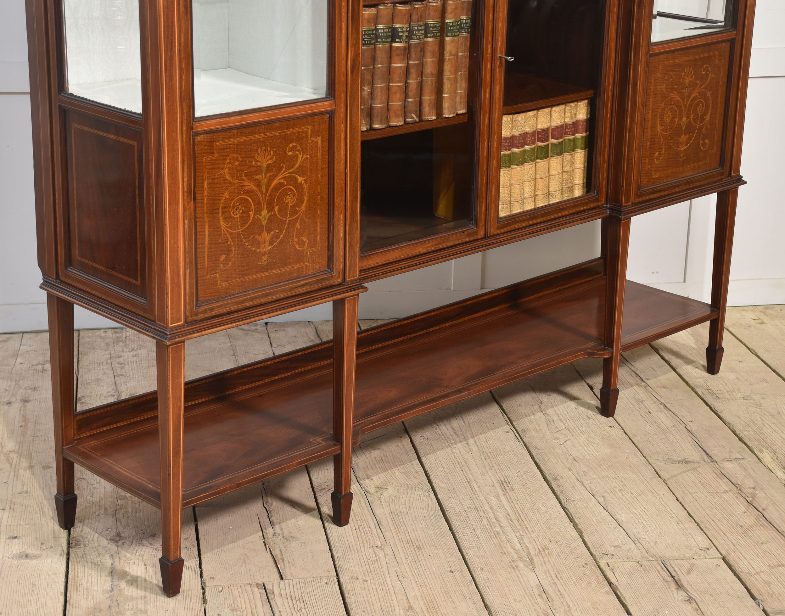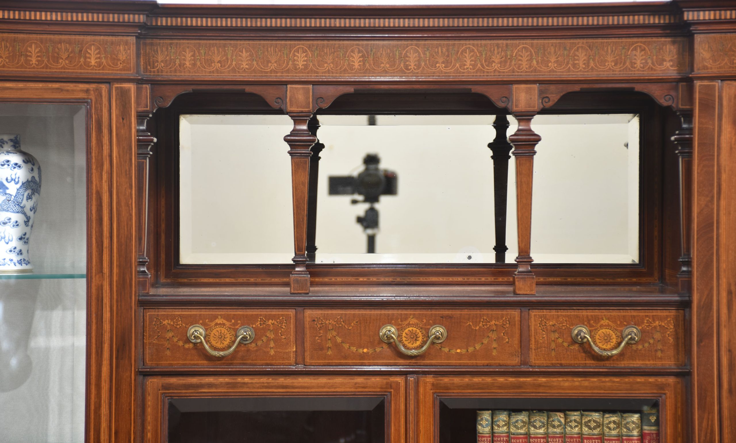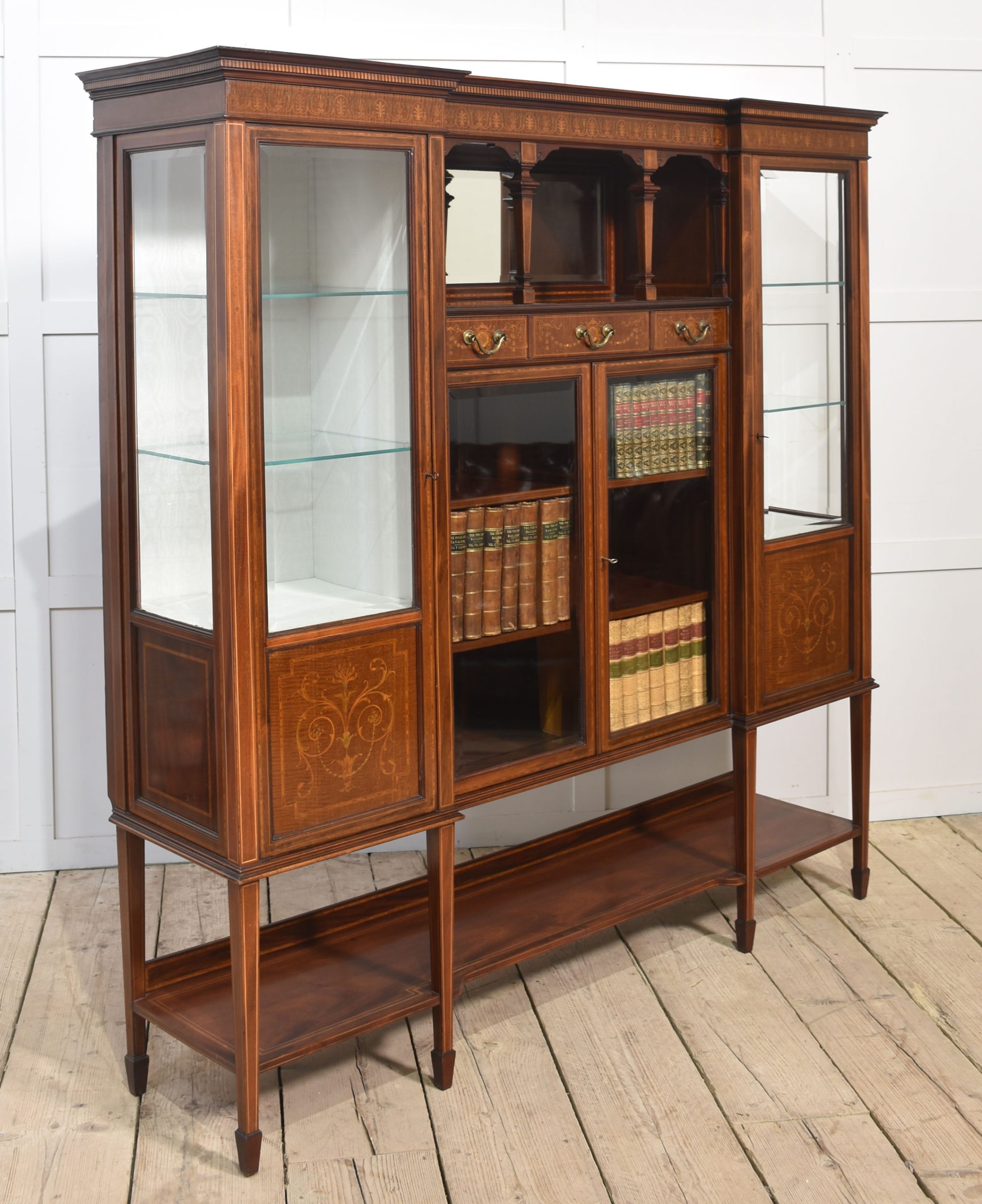 Mahogany inlaid inverted breakfront display cabinet, the moulded top to the central bevelled mirror back arcaded recess above three small drawers and a pair of glazed doors below flanked by a pair of glazed cabinet doors enclosing a lined interior with three shelves. All raised upon six tapering legs terminating in spade feet, united by under tier.