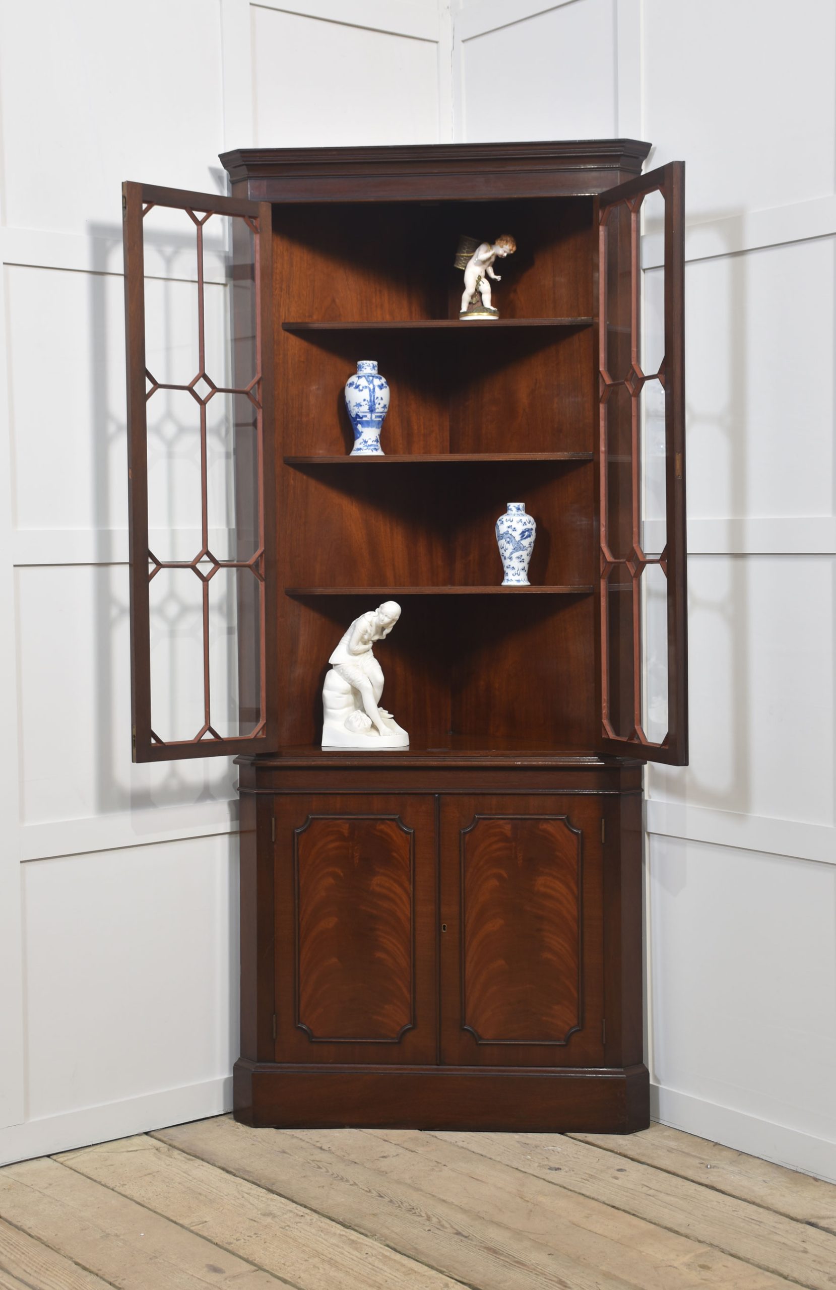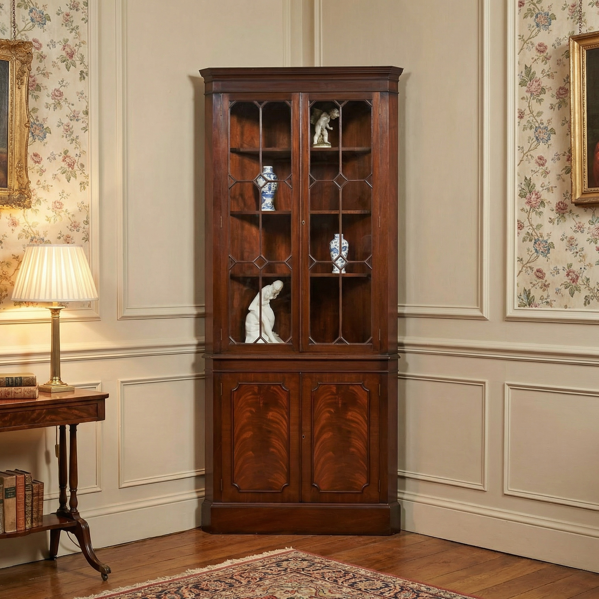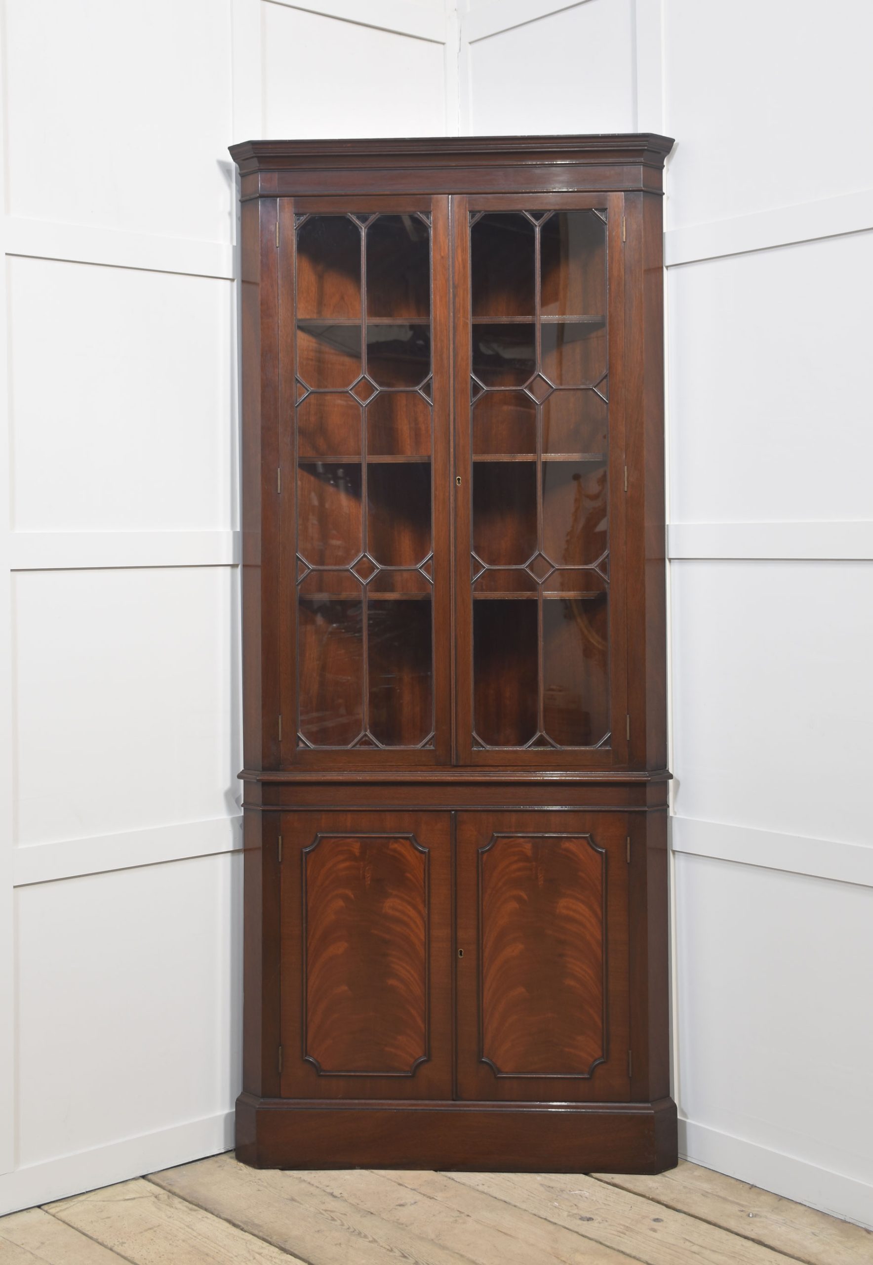 Mahogany standing corner cupboard the moulded top above a pair of glazed beaded doors opening to reveal a shelved interior. The base is fitted with a pair of well-figured mahogany panelled doors that open to reveal a single fixed shelf. All raised on bracket feet.