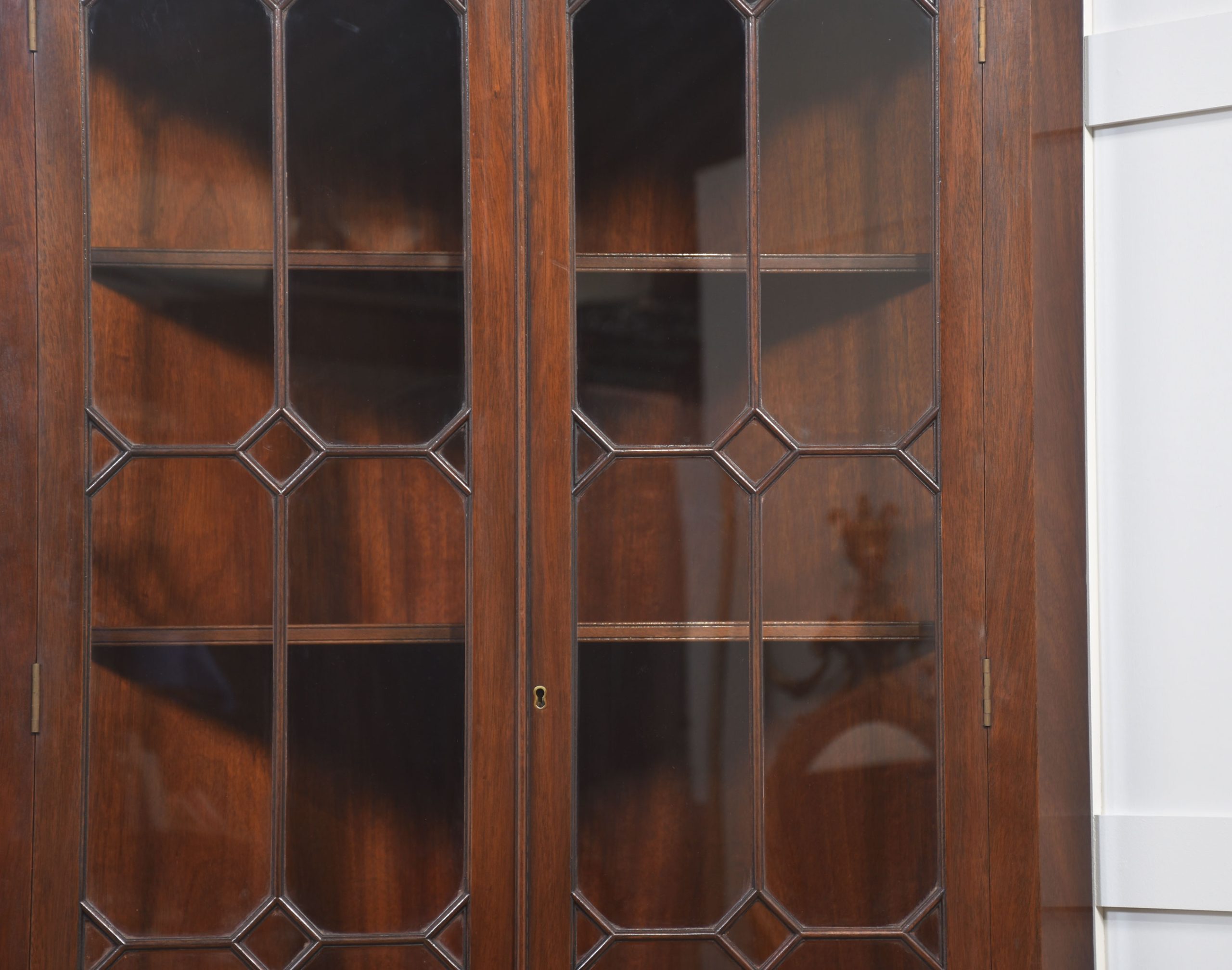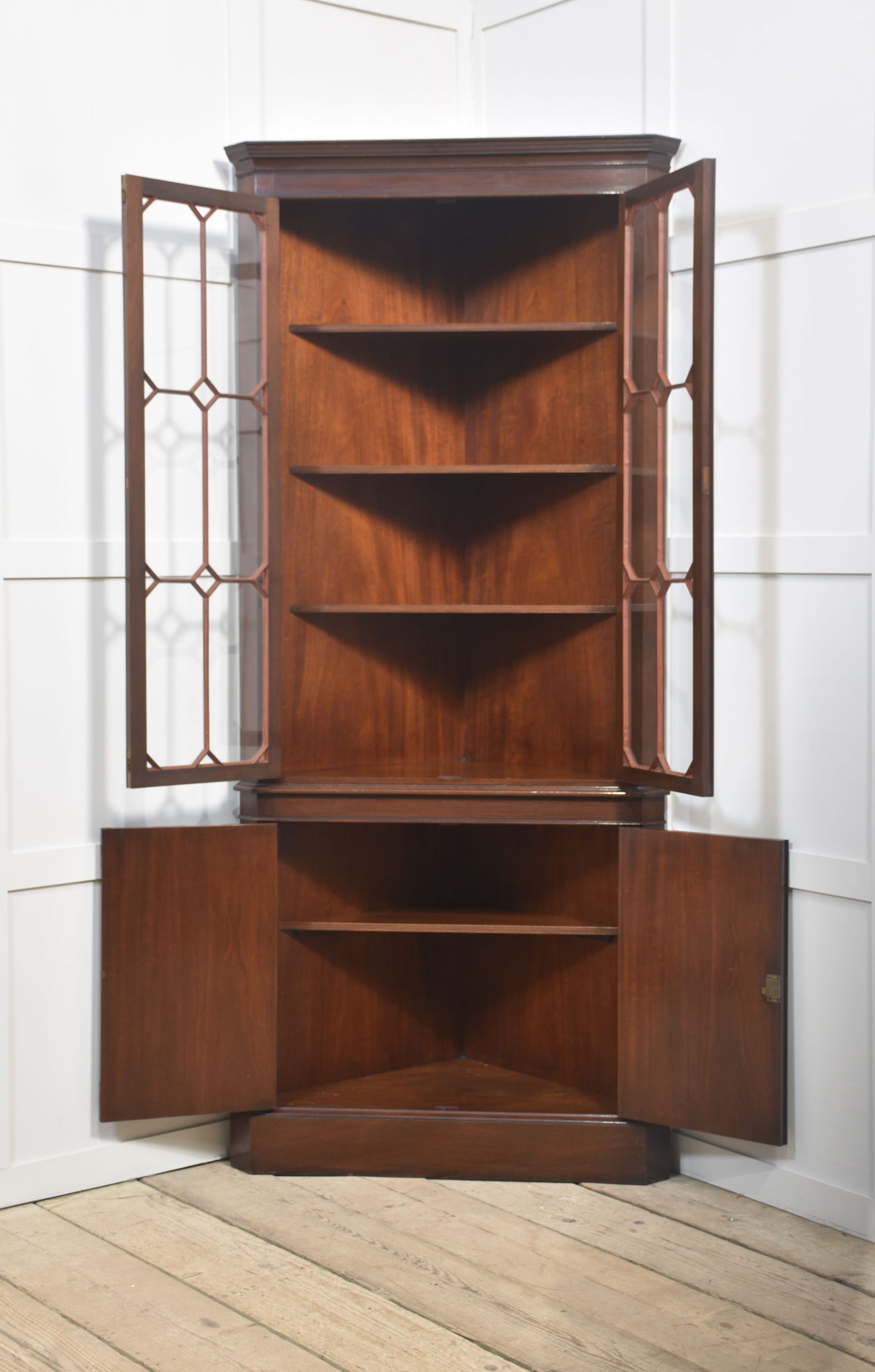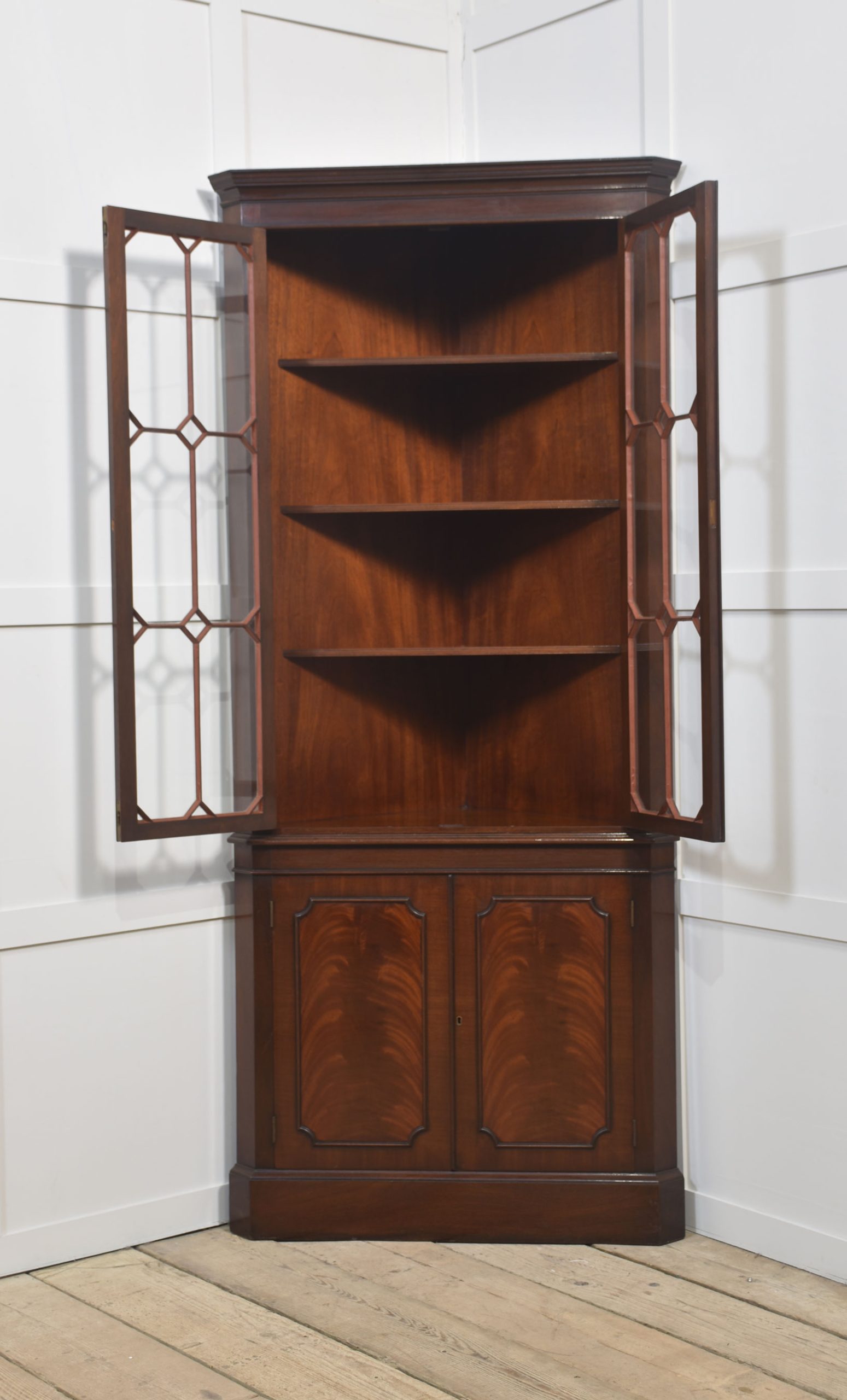 Mahogany standing corner cupboard the moulded top above a pair of glazed beaded doors opening to reveal a shelved interior. The base is fitted with a pair of well-figured mahogany panelled doors that open to reveal a single fixed shelf. All raised on bracket feet.
