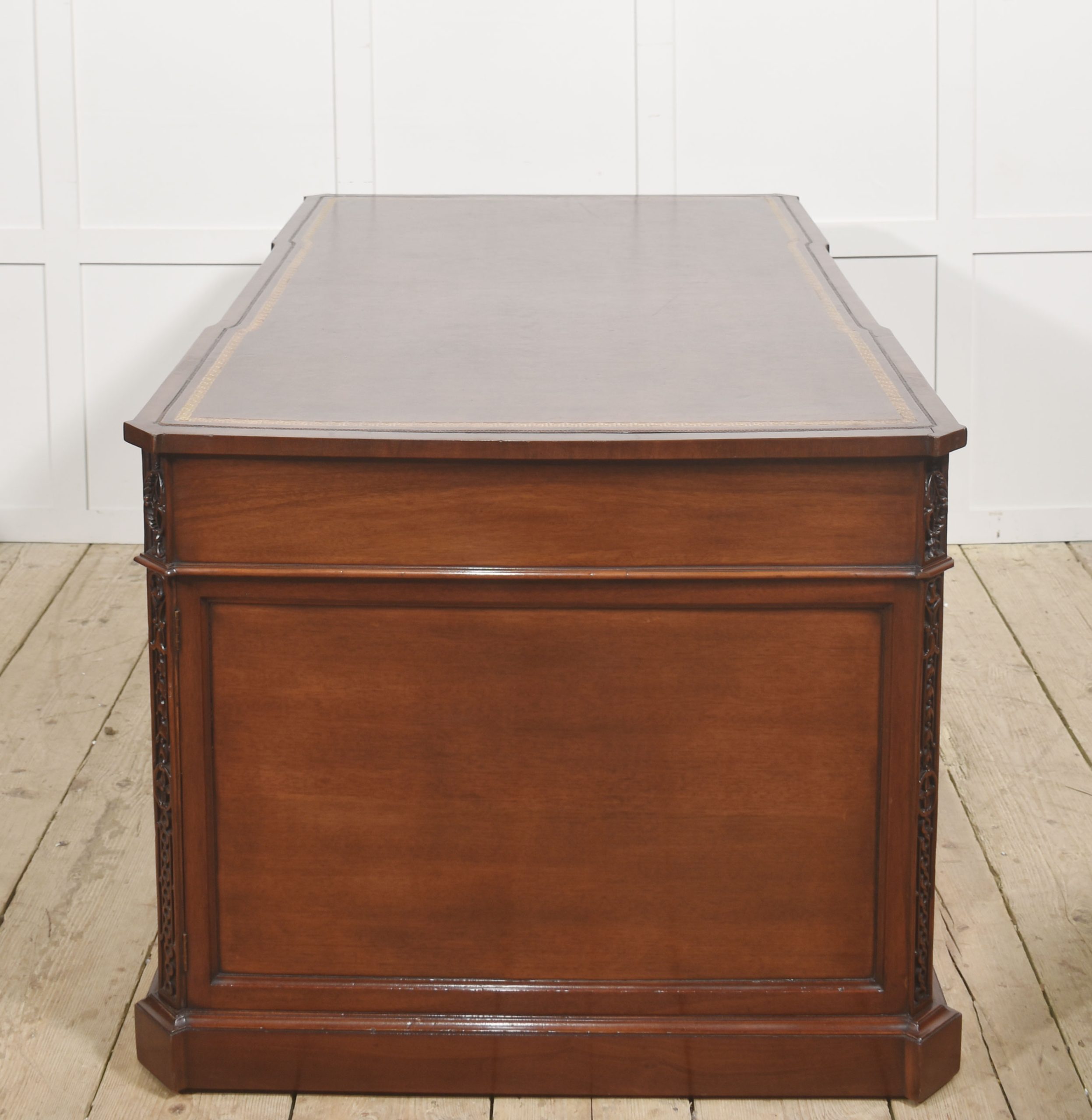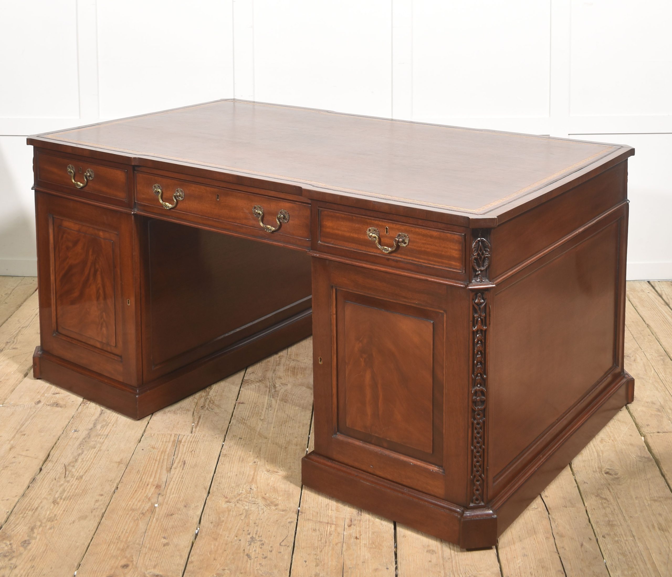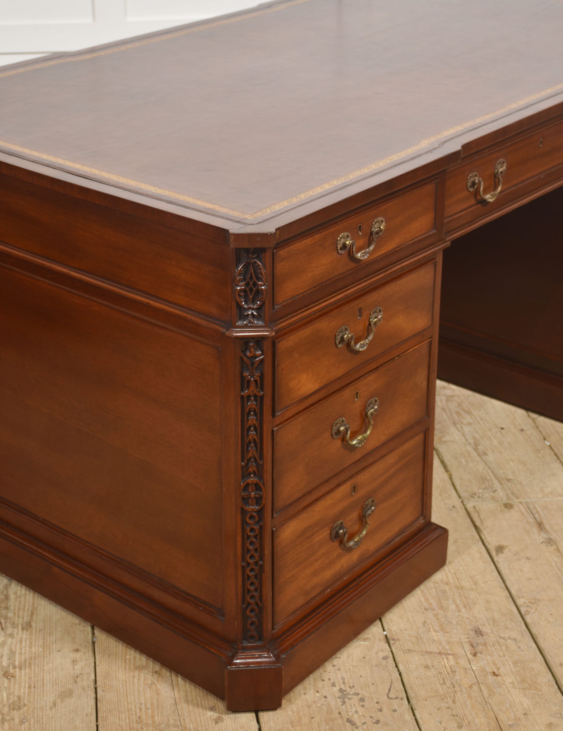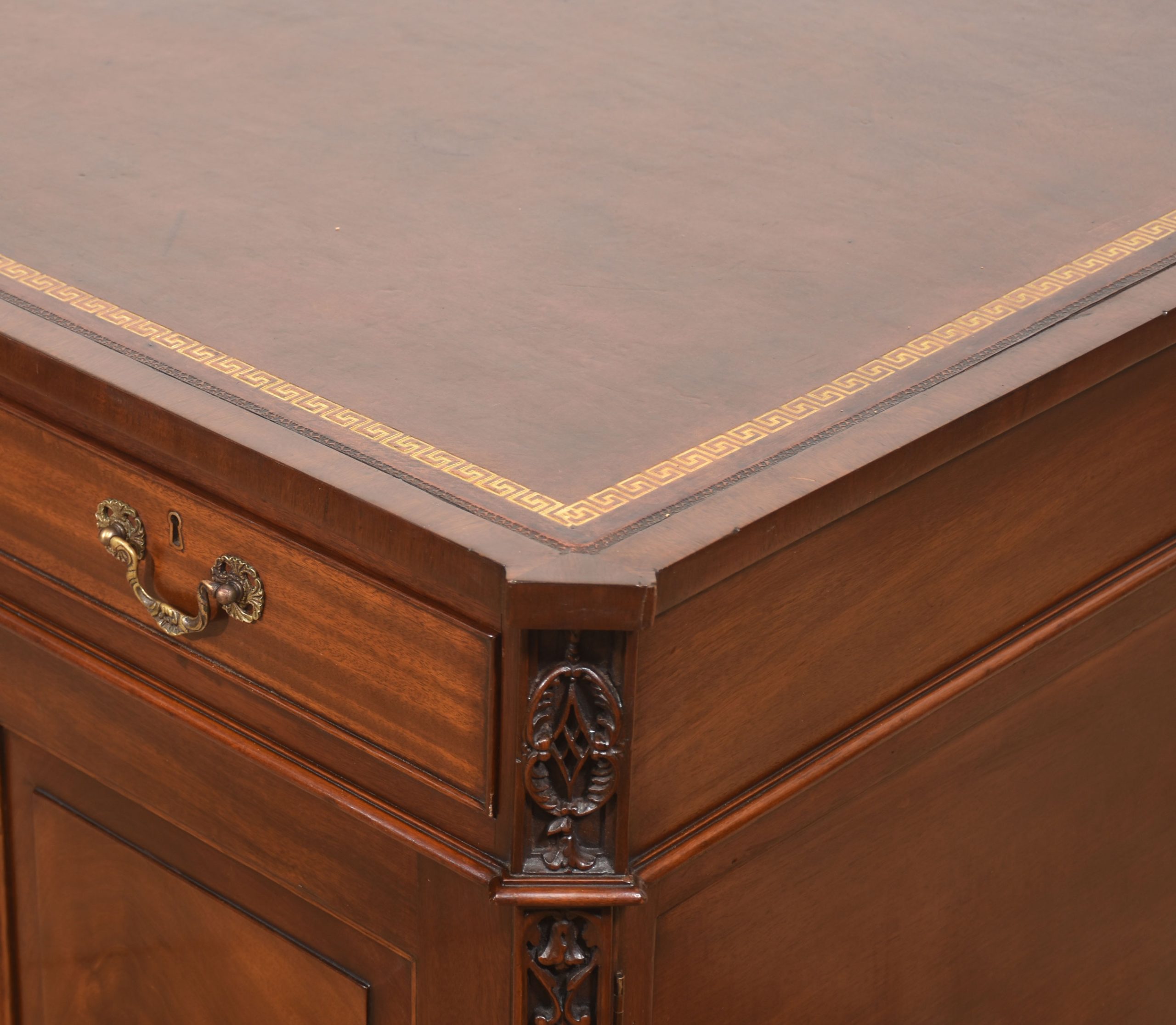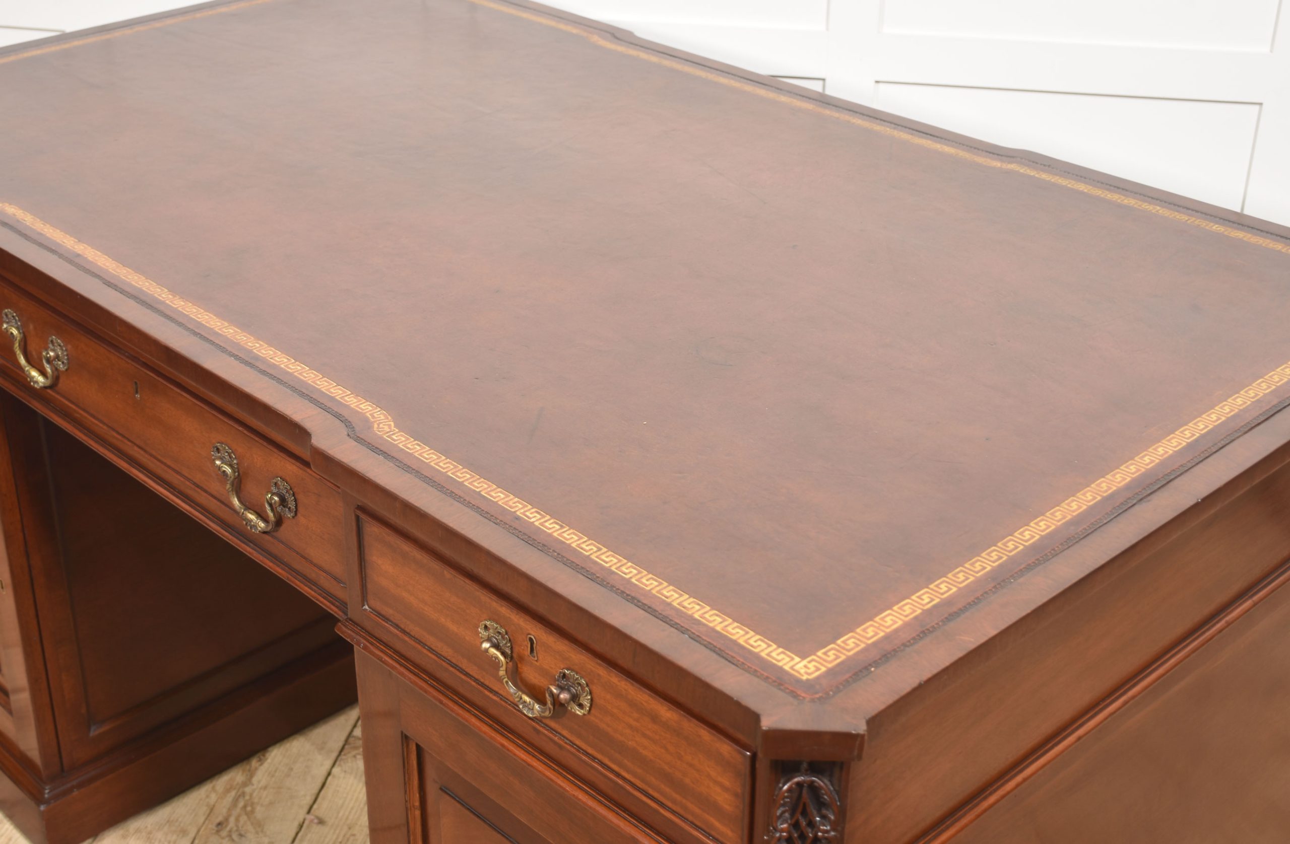 A handsome and substantial partner’s pedestal desk in finely figured mahogany, designed to be freestanding and finished on all sides. The rectangular top is inset with a rich brown tooled leather writing surface, decorated with a gilt Greek key border and framed by a moulded edge, offering both elegance and practicality.