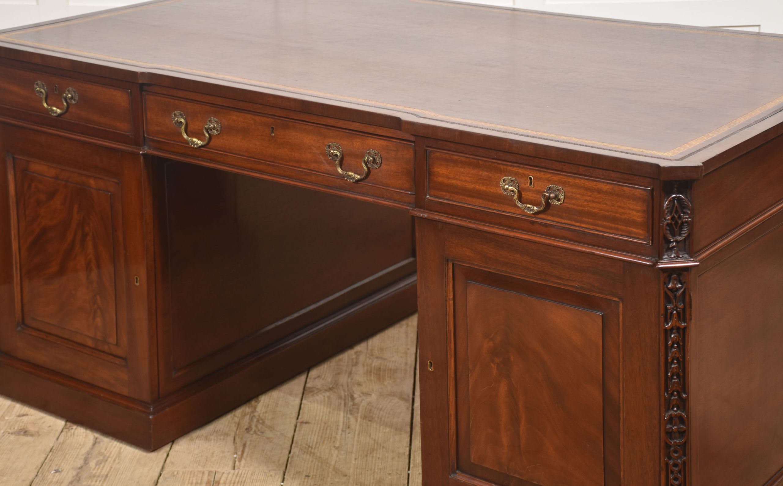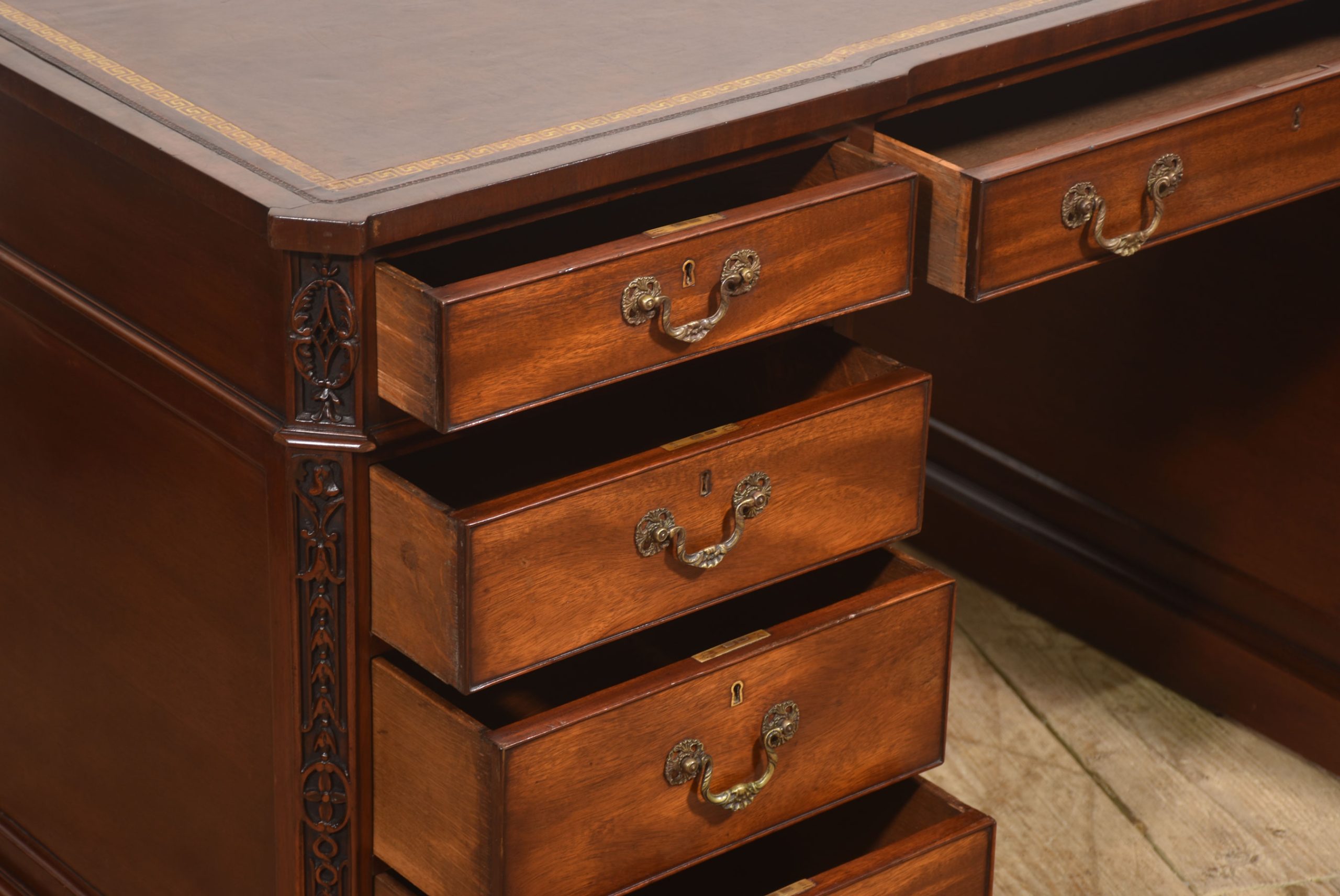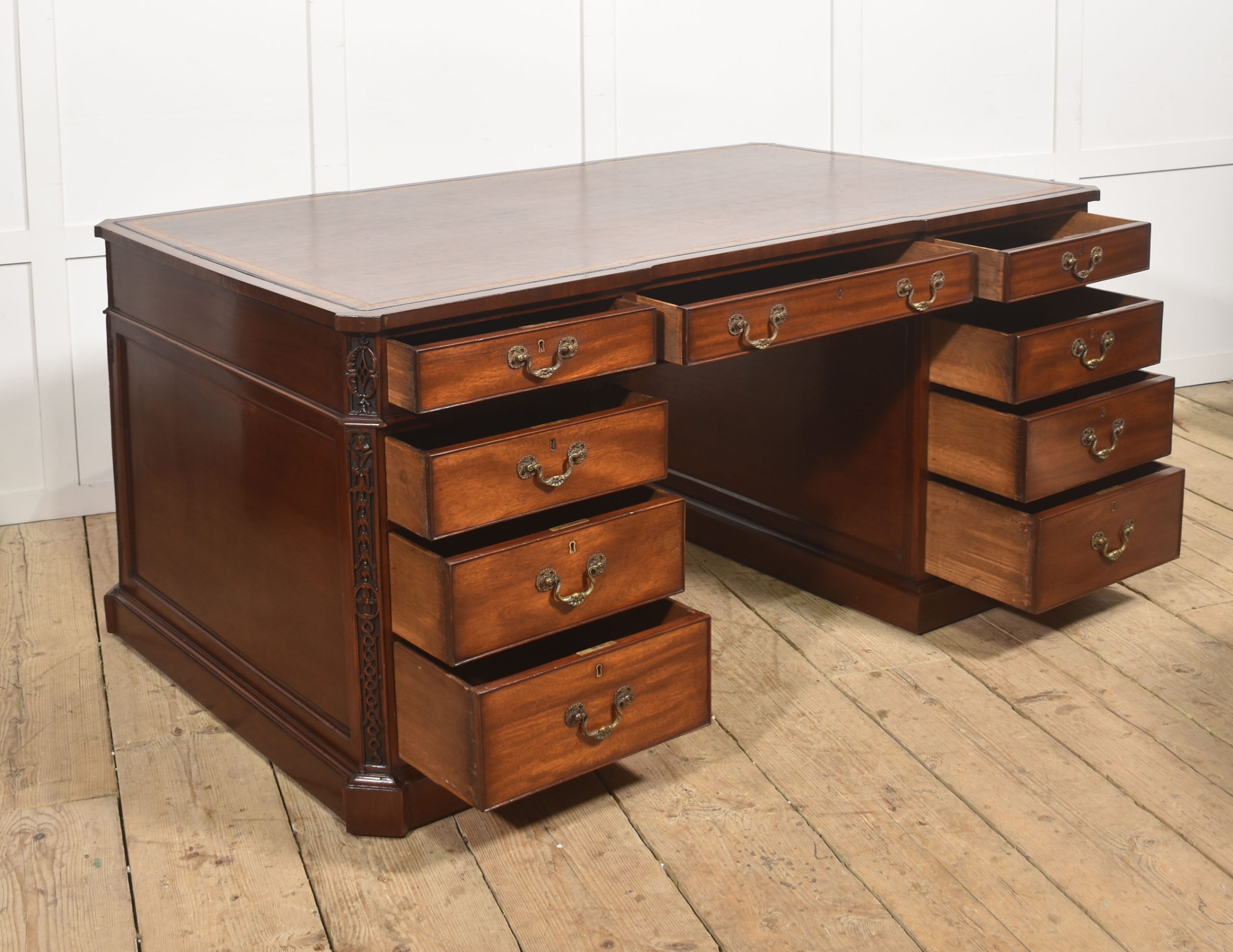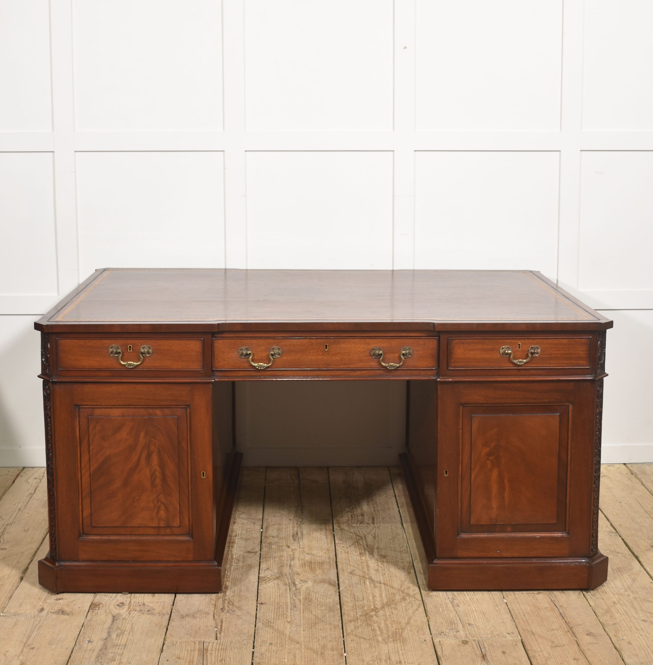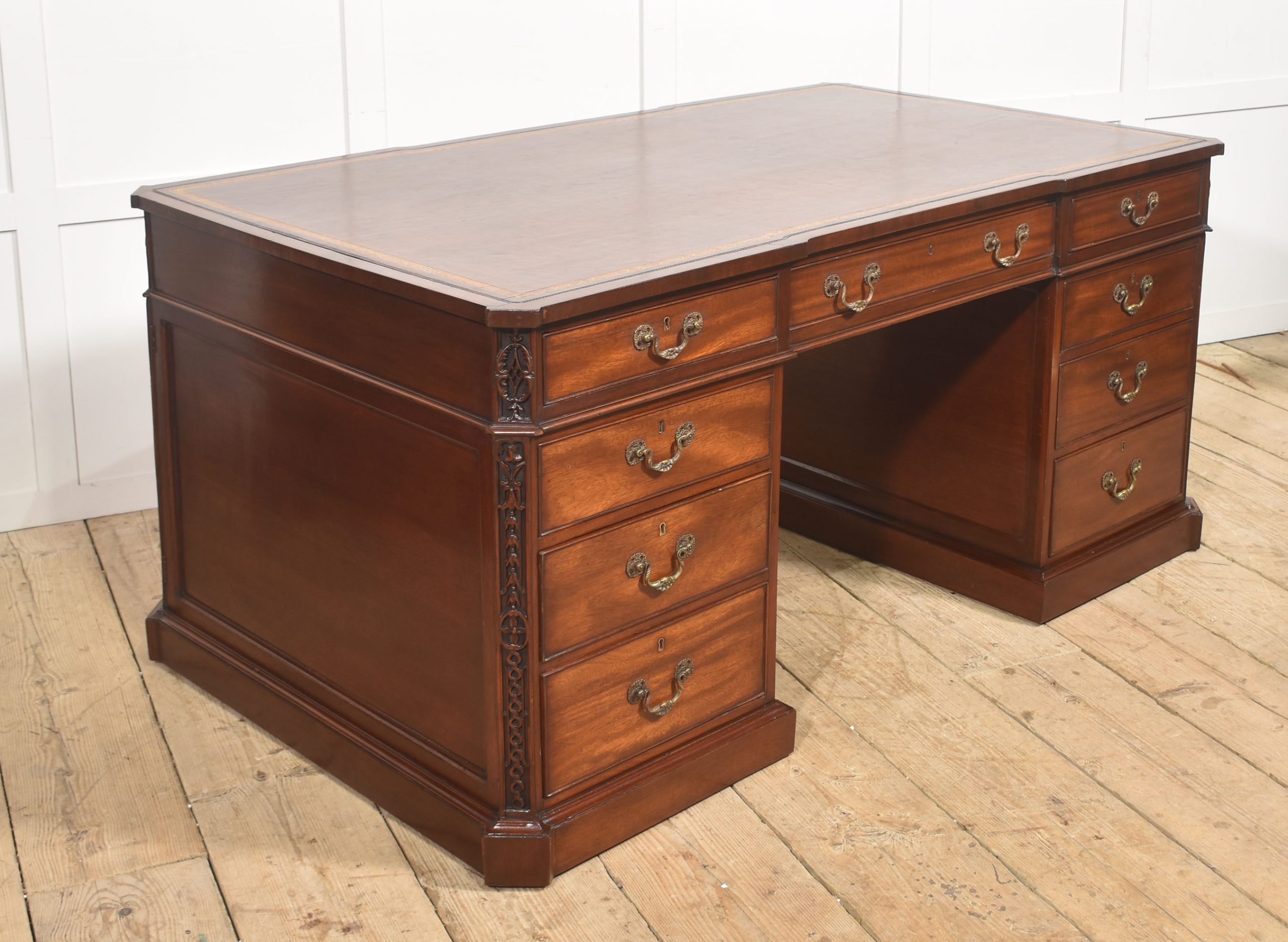 A handsome and substantial partner’s pedestal desk in finely figured mahogany, designed to be freestanding and finished on all sides. The rectangular top is inset with a rich brown tooled leather writing surface, decorated with a gilt Greek key border and framed by a moulded edge, offering both elegance and practicality.