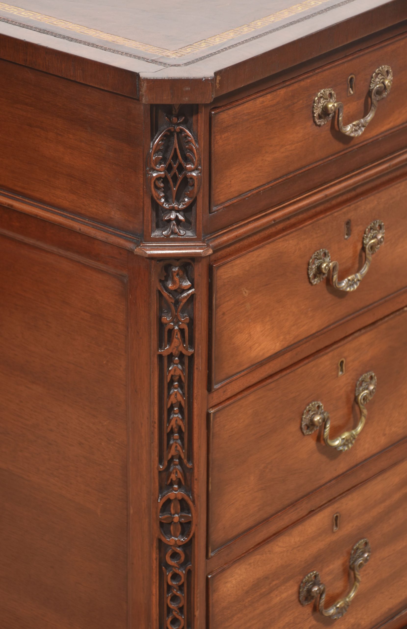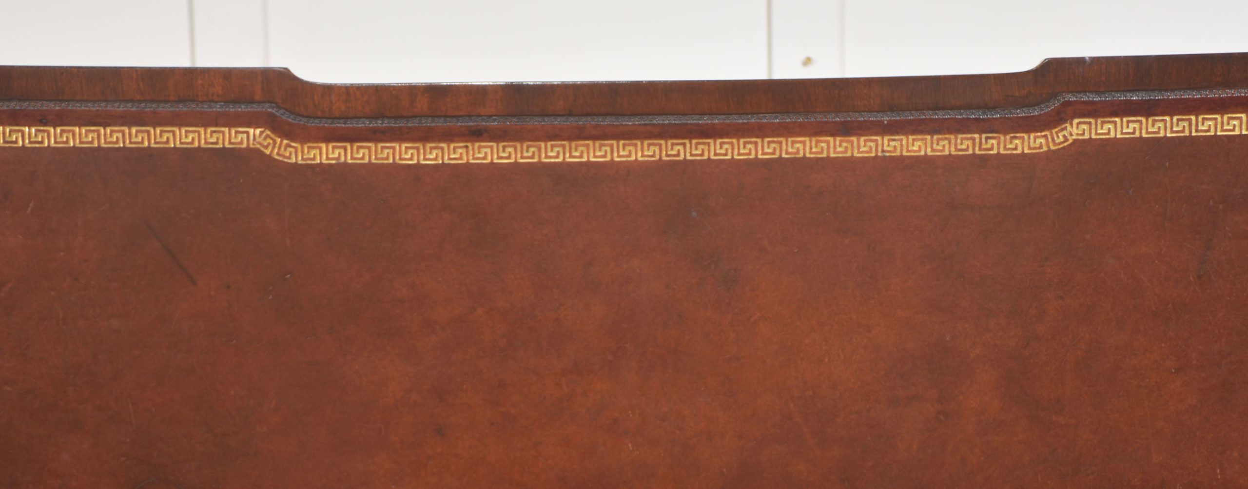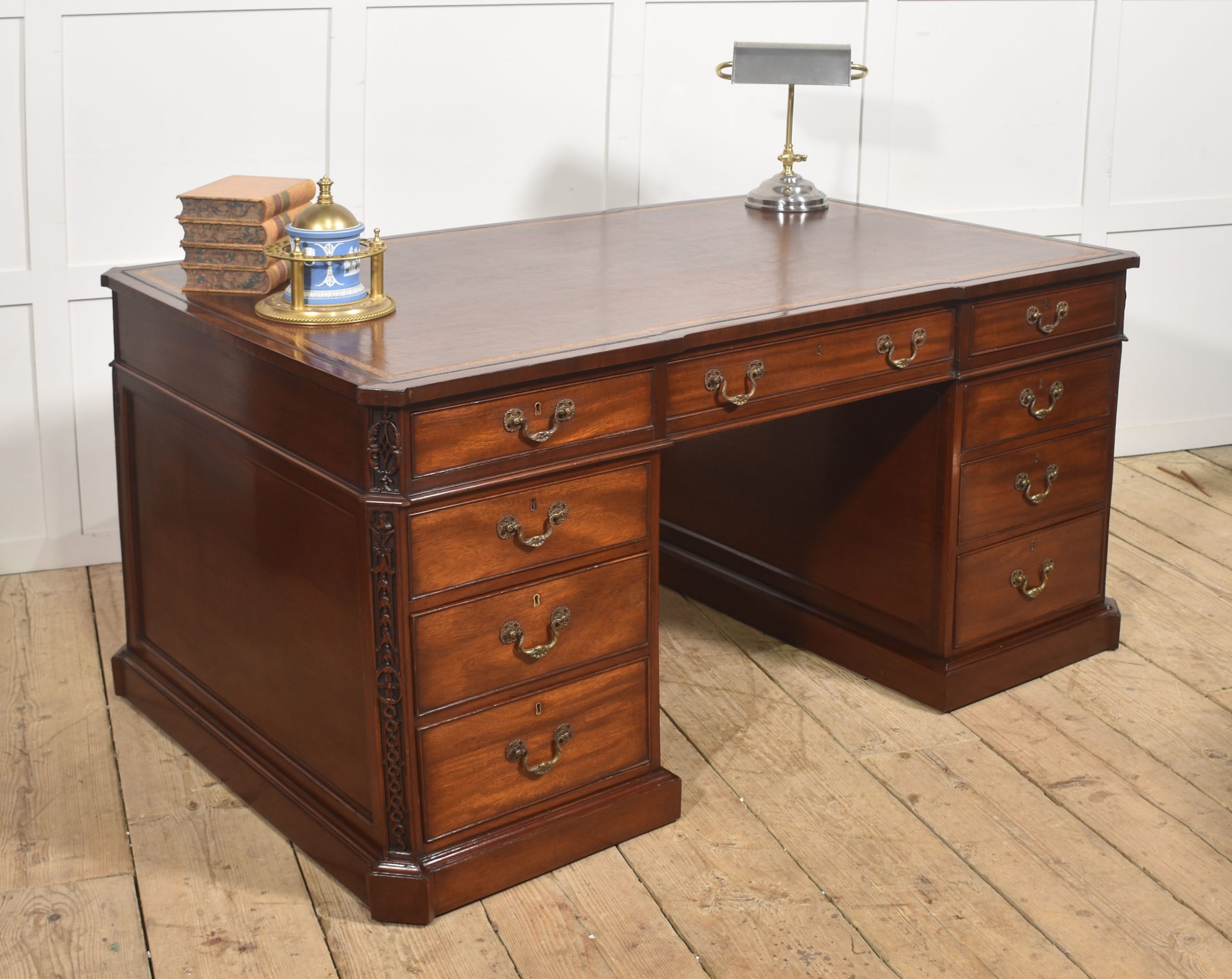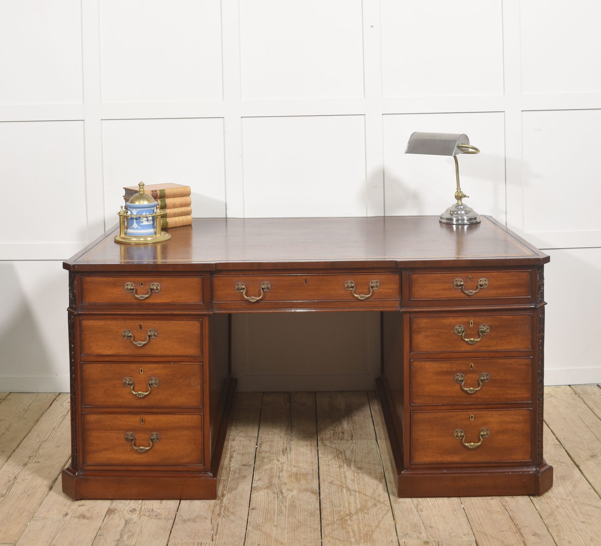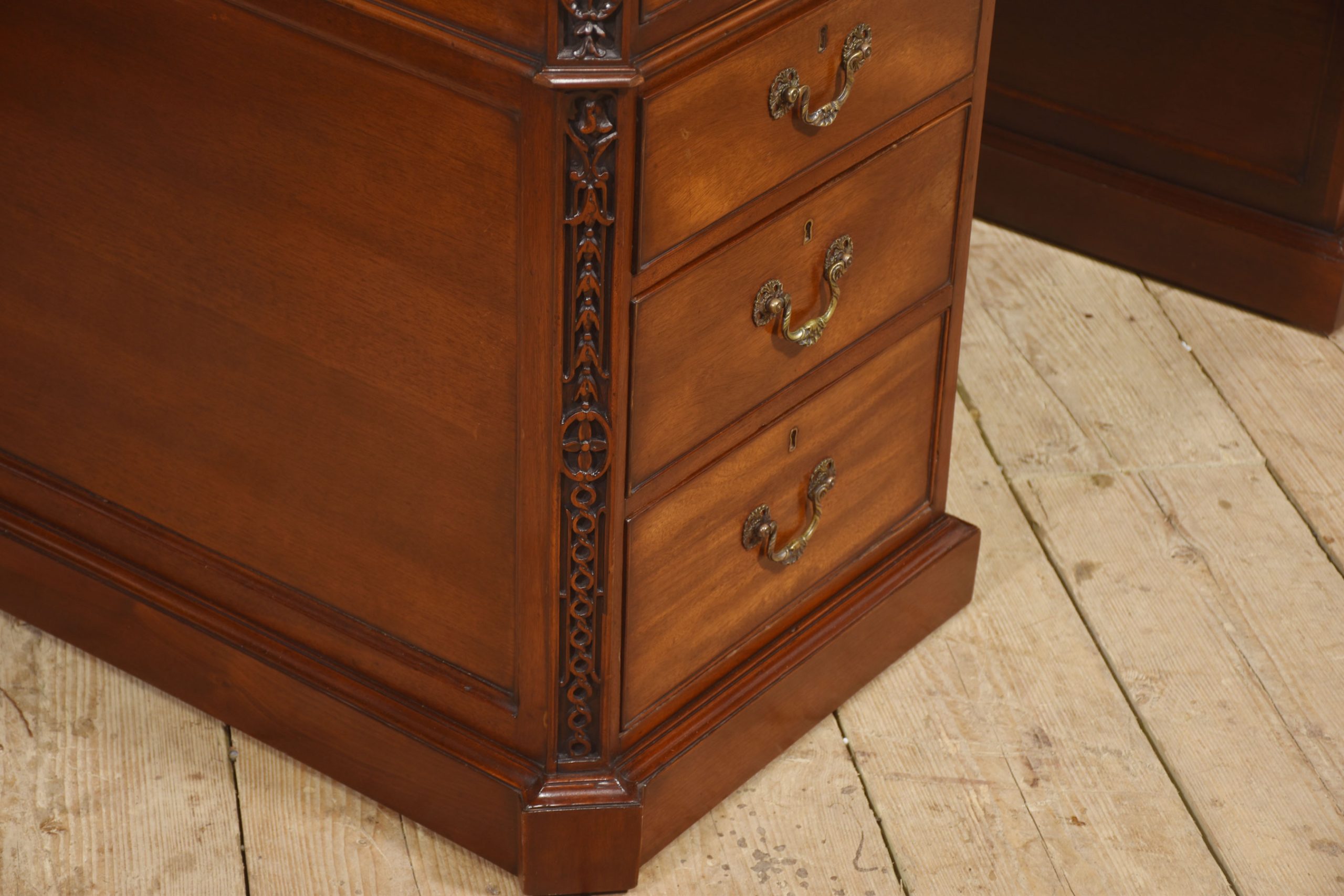 A handsome and substantial partner’s pedestal desk in finely figured mahogany, designed to be freestanding and finished on all sides. The rectangular top is inset with a rich brown tooled leather writing surface, decorated with a gilt Greek key border and framed by a moulded edge, offering both elegance and practicality.