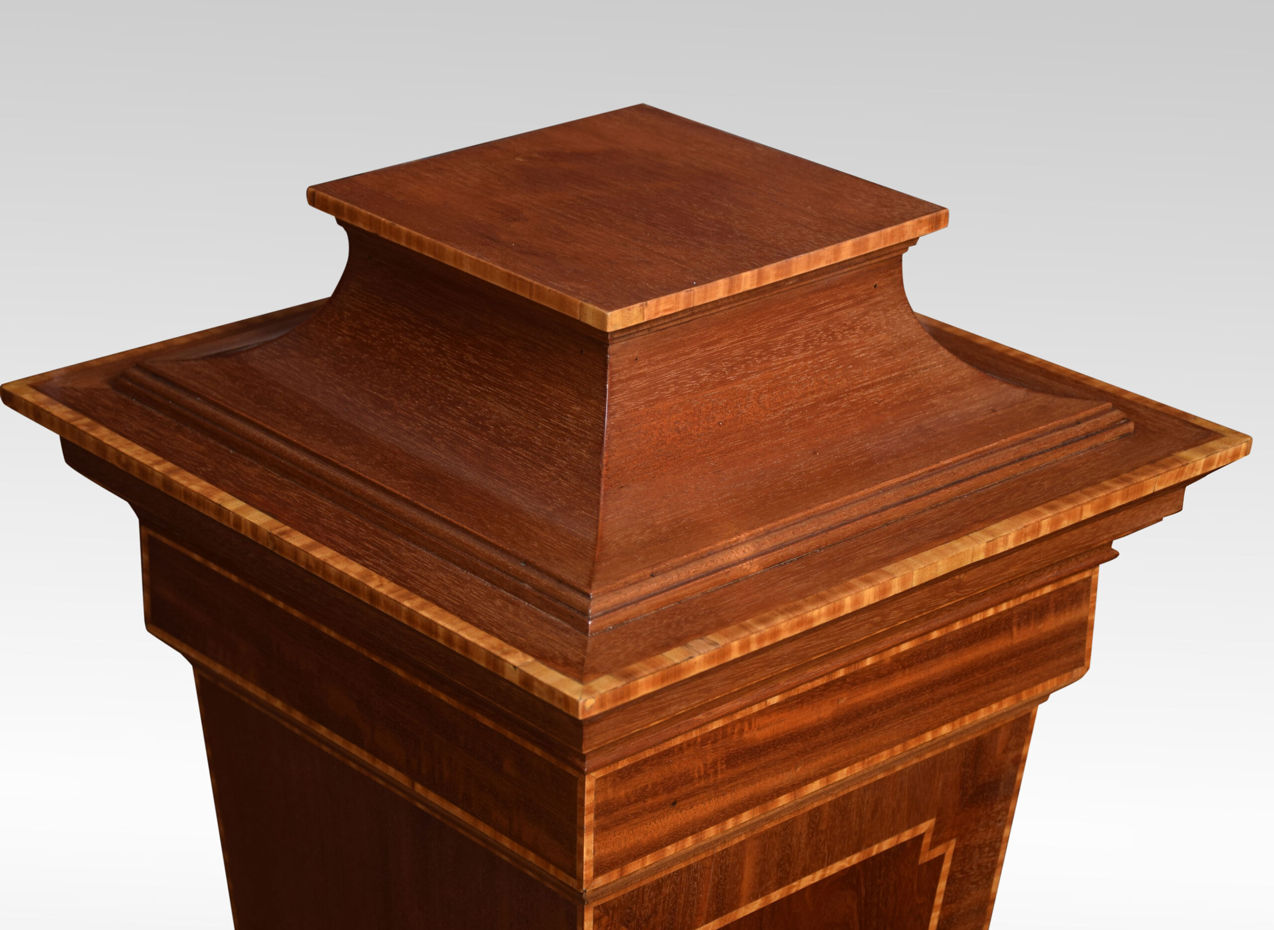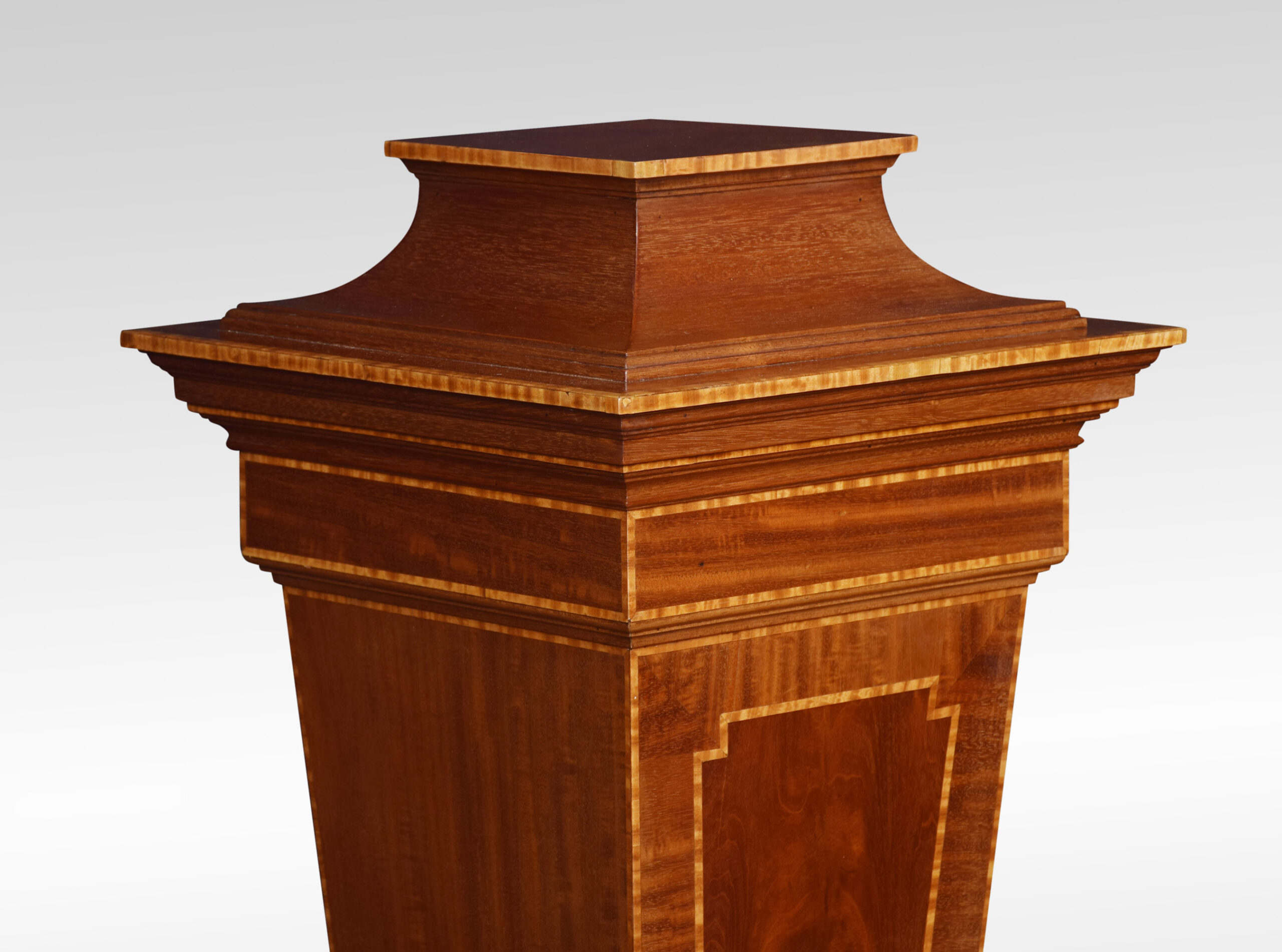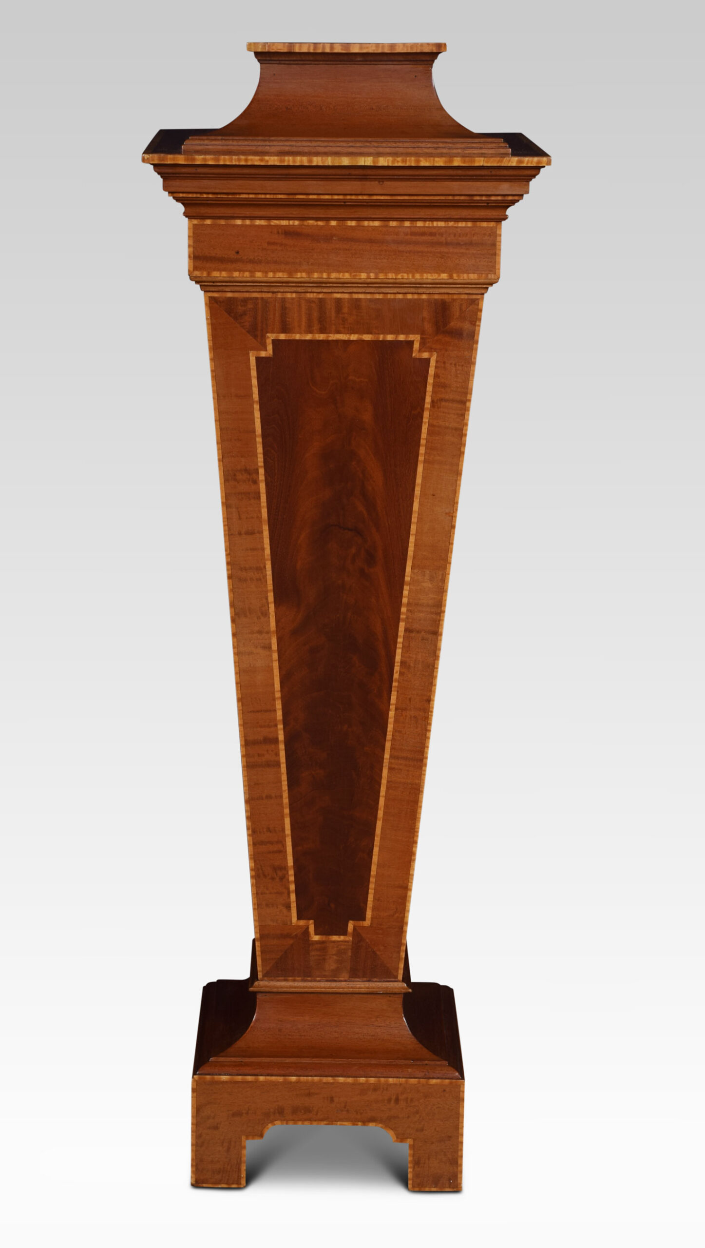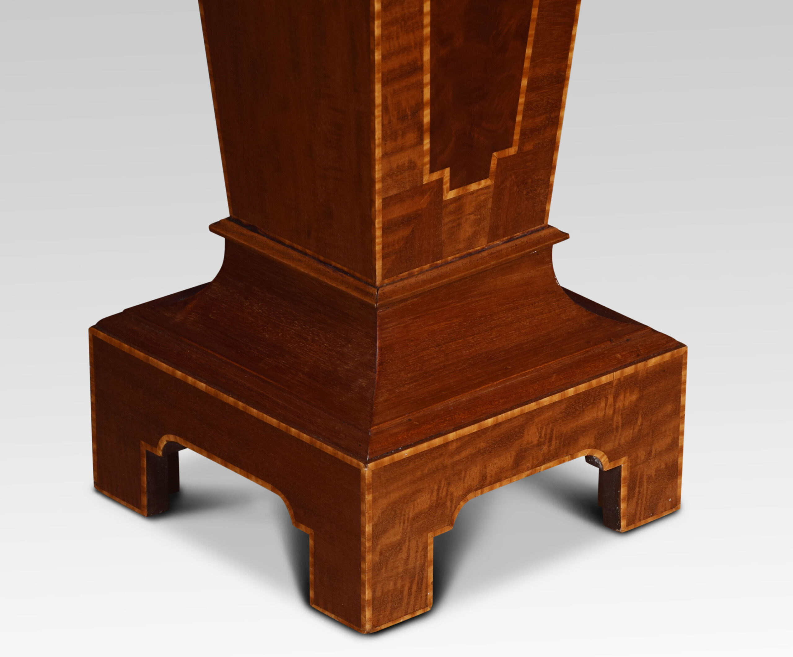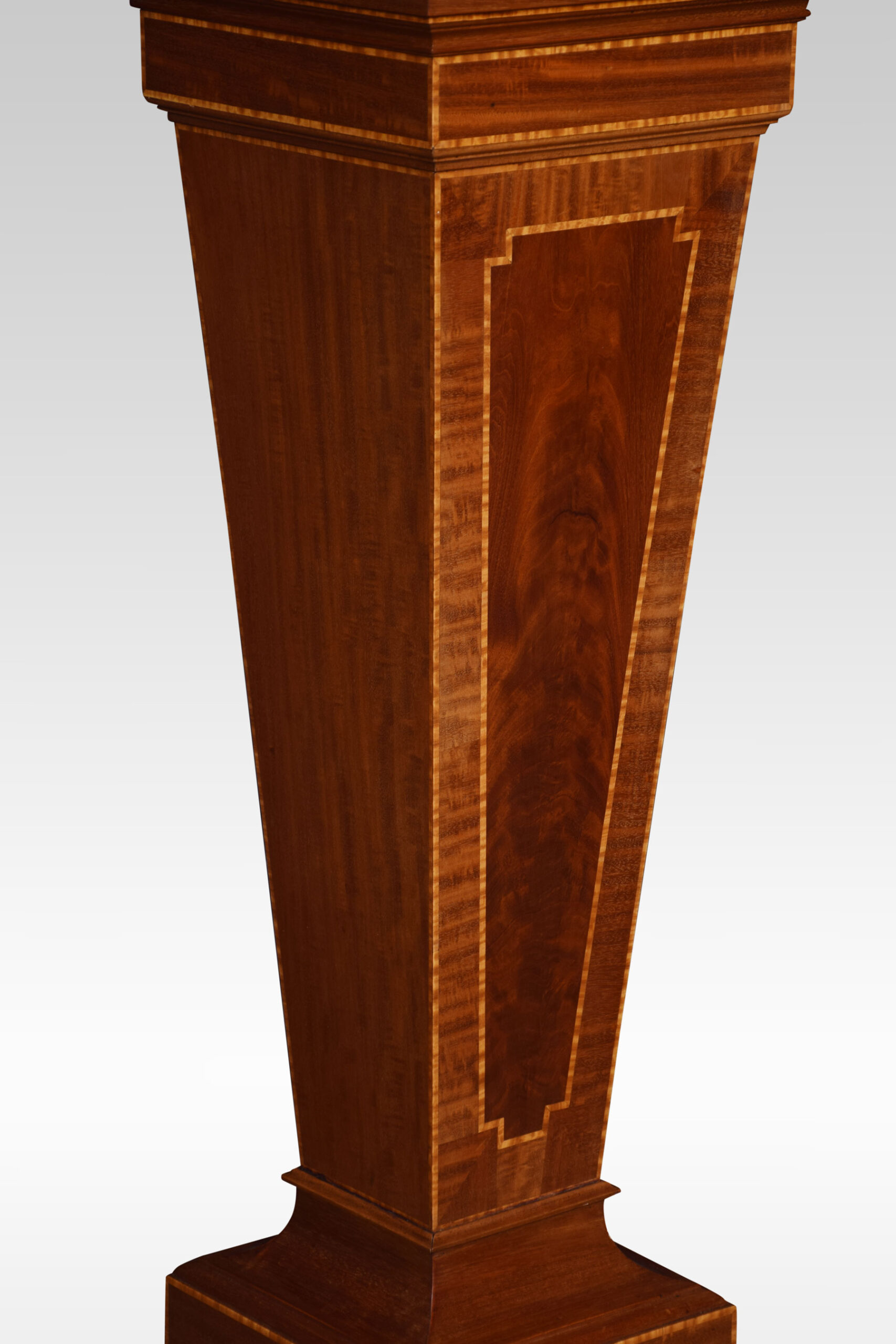 Mahogany pedestal torchiere stand, of tapering square form, with central flame mahogany panel surrounded in a crossbanded border. All raised up on stepped base.