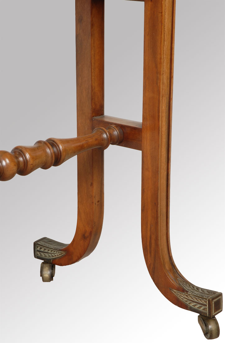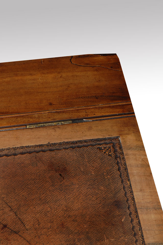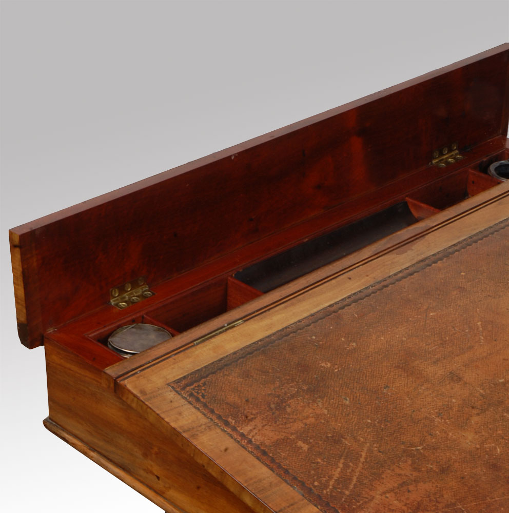 A mahogany writing desk the moulded top with lift up compartment containing its original ink wells and bottles above the sloped top with inset tooled leather panel opening to reveal storage compartment. The moulded under frame with shaped feet terminating in brass tooled capes and castors (possibly Gillows)