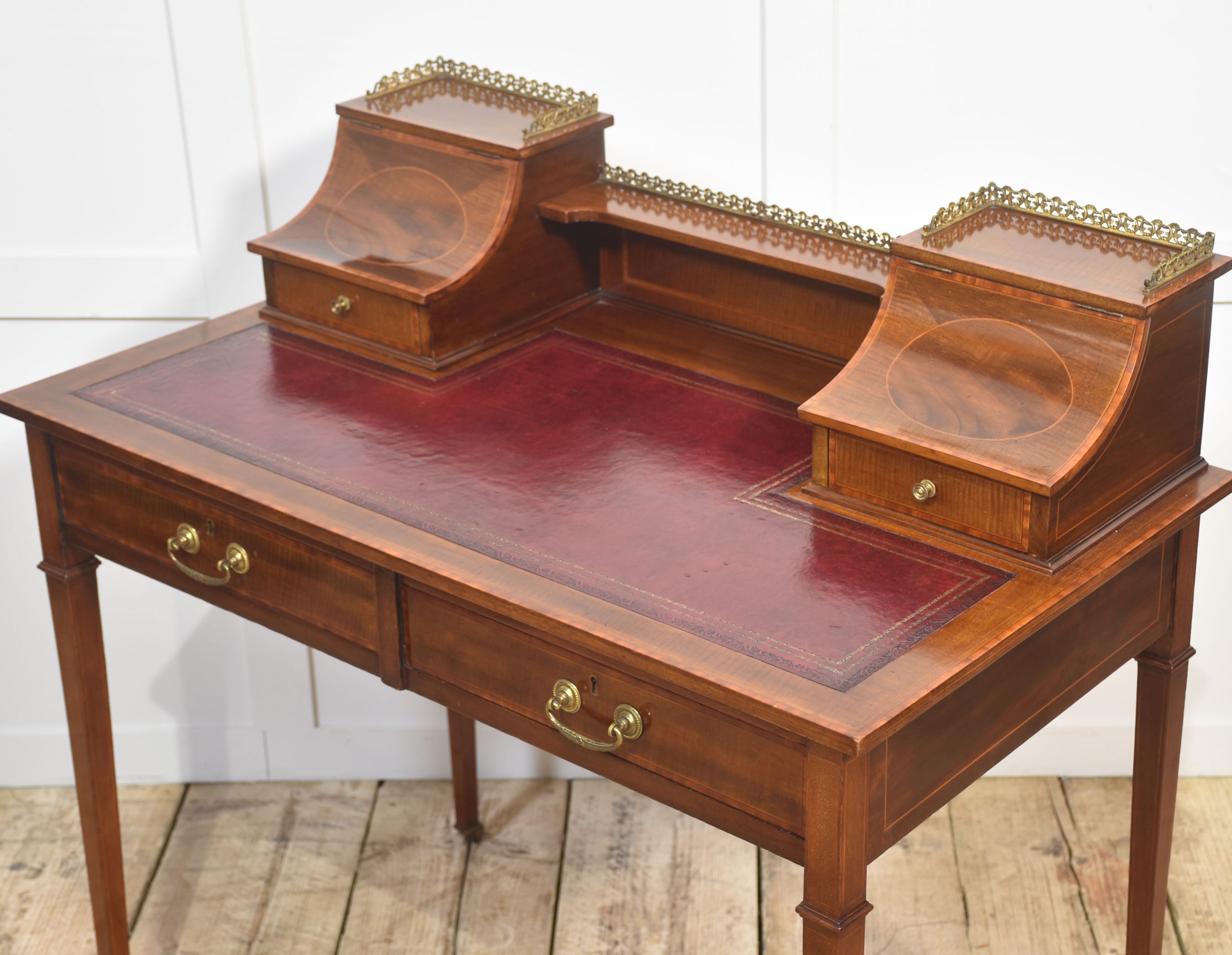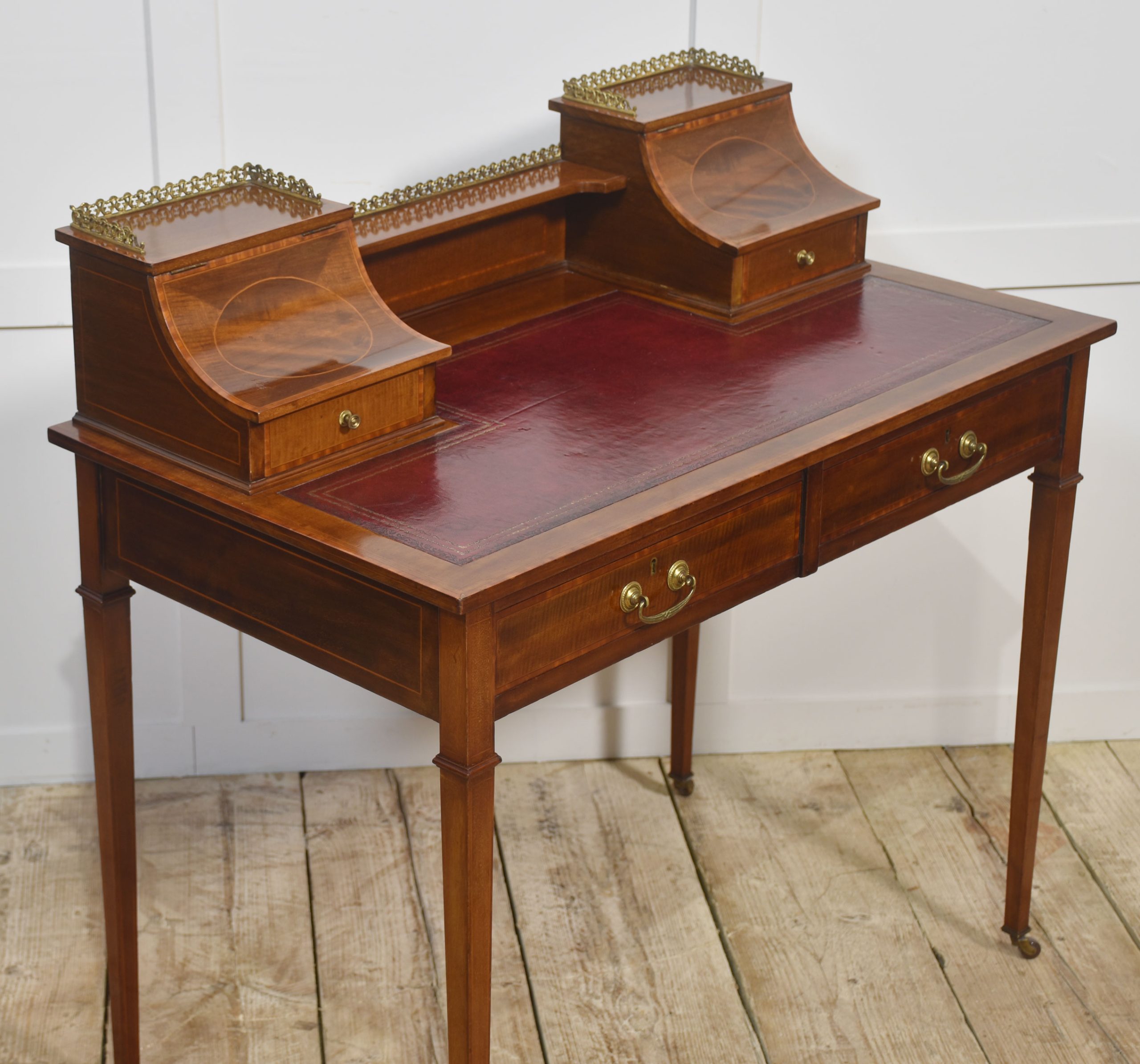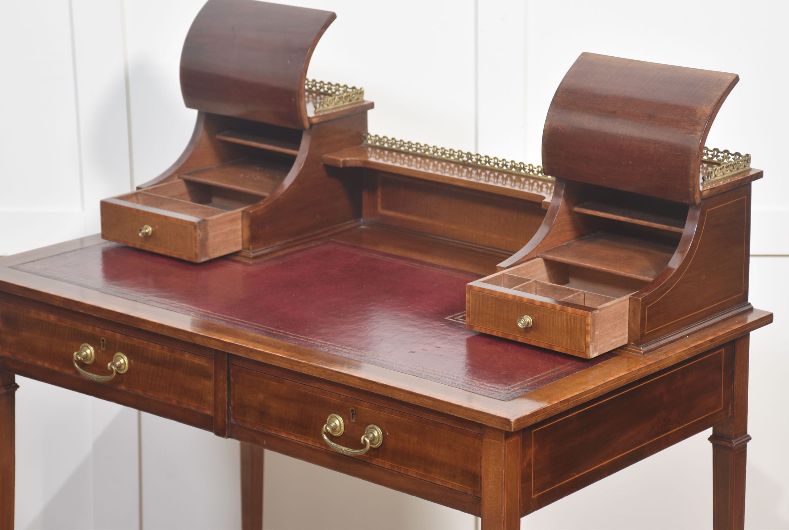 A fine quality Edwardian mahogany writing desk featuring elegant satinwood inlay and a rich patina. The desk is fitted with a tooled red leather writing surface, complemented by a pair of curved-front stationery boxes with small drawers and brass gallery surrounds. Beneath the writing surface are two full-width drawers with original brass swan-neck handles, offering generous storage.