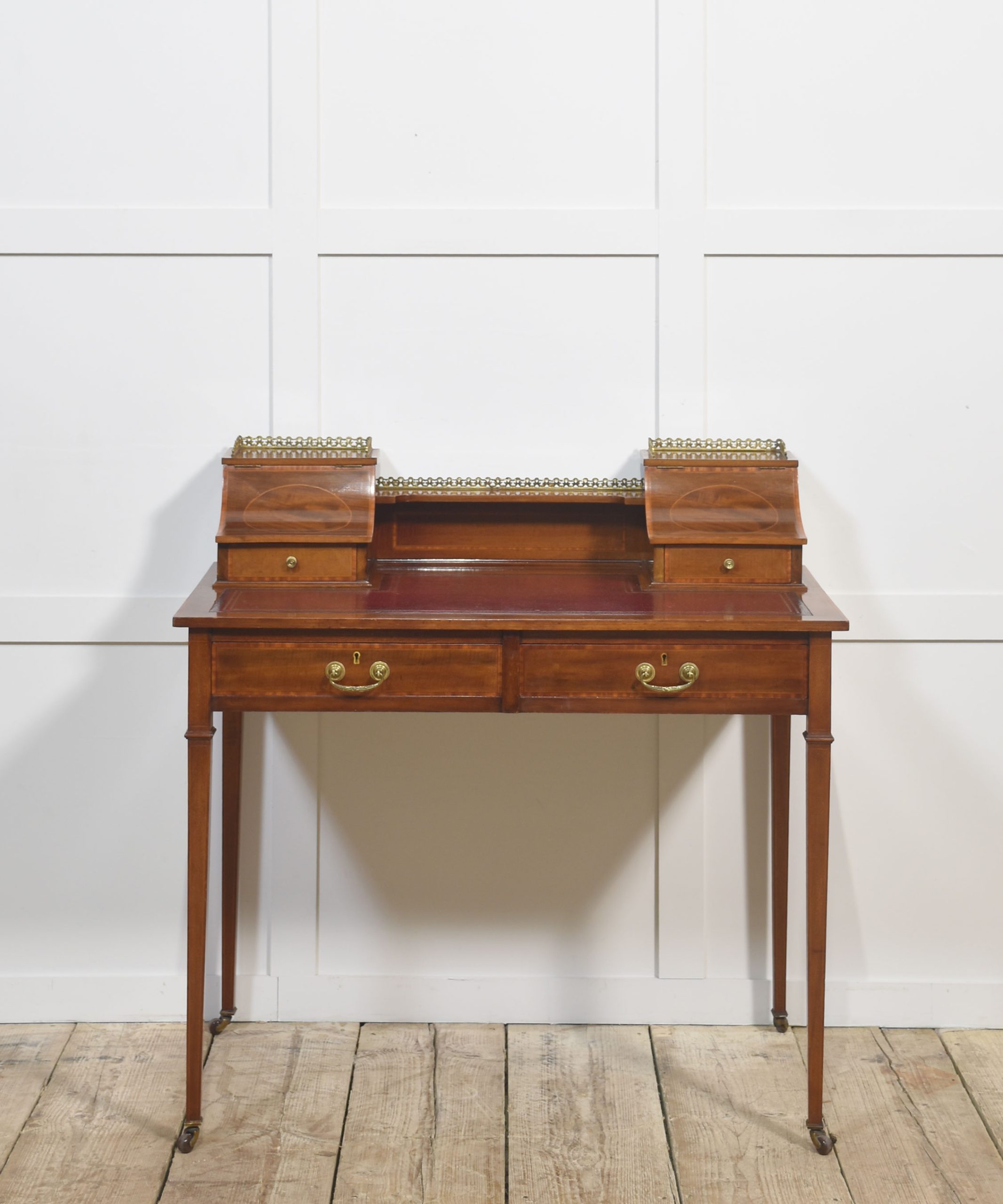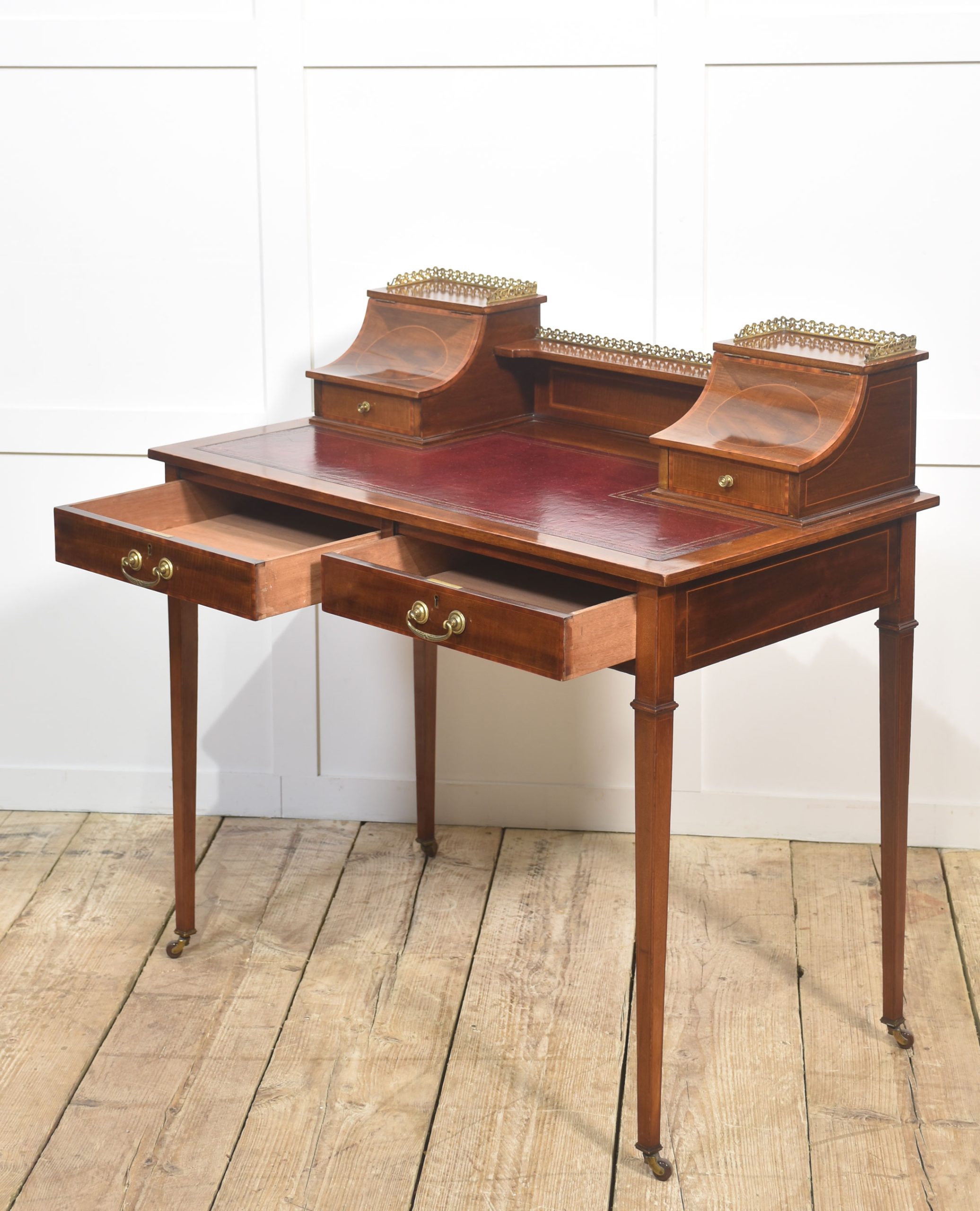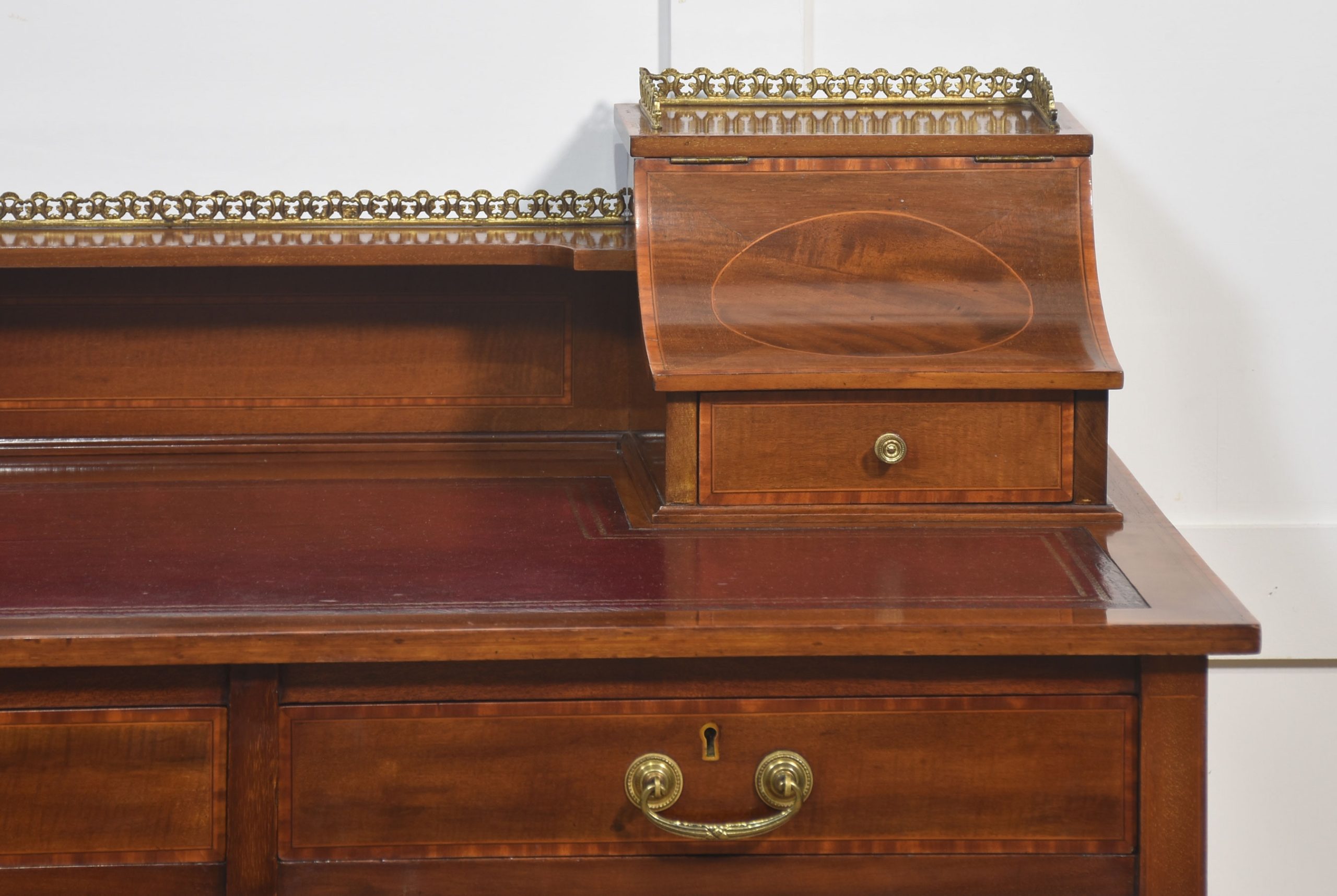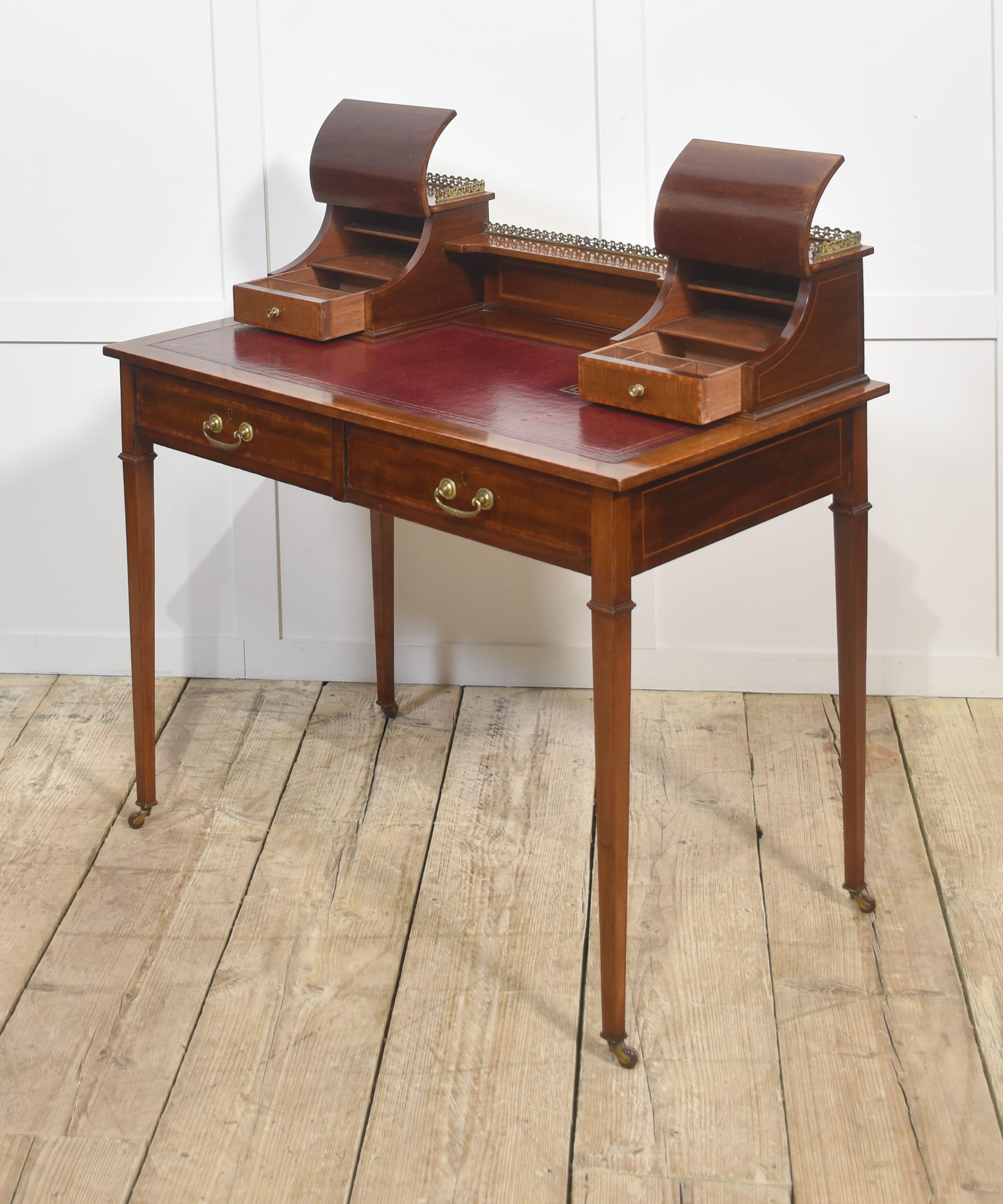 A fine quality Edwardian mahogany writing desk featuring elegant satinwood inlay and a rich patina. The desk is fitted with a tooled red leather writing surface, complemented by a pair of curved-front stationery boxes with small drawers and brass gallery surrounds. Beneath the writing surface are two full-width drawers with original brass swan-neck handles, offering generous storage.