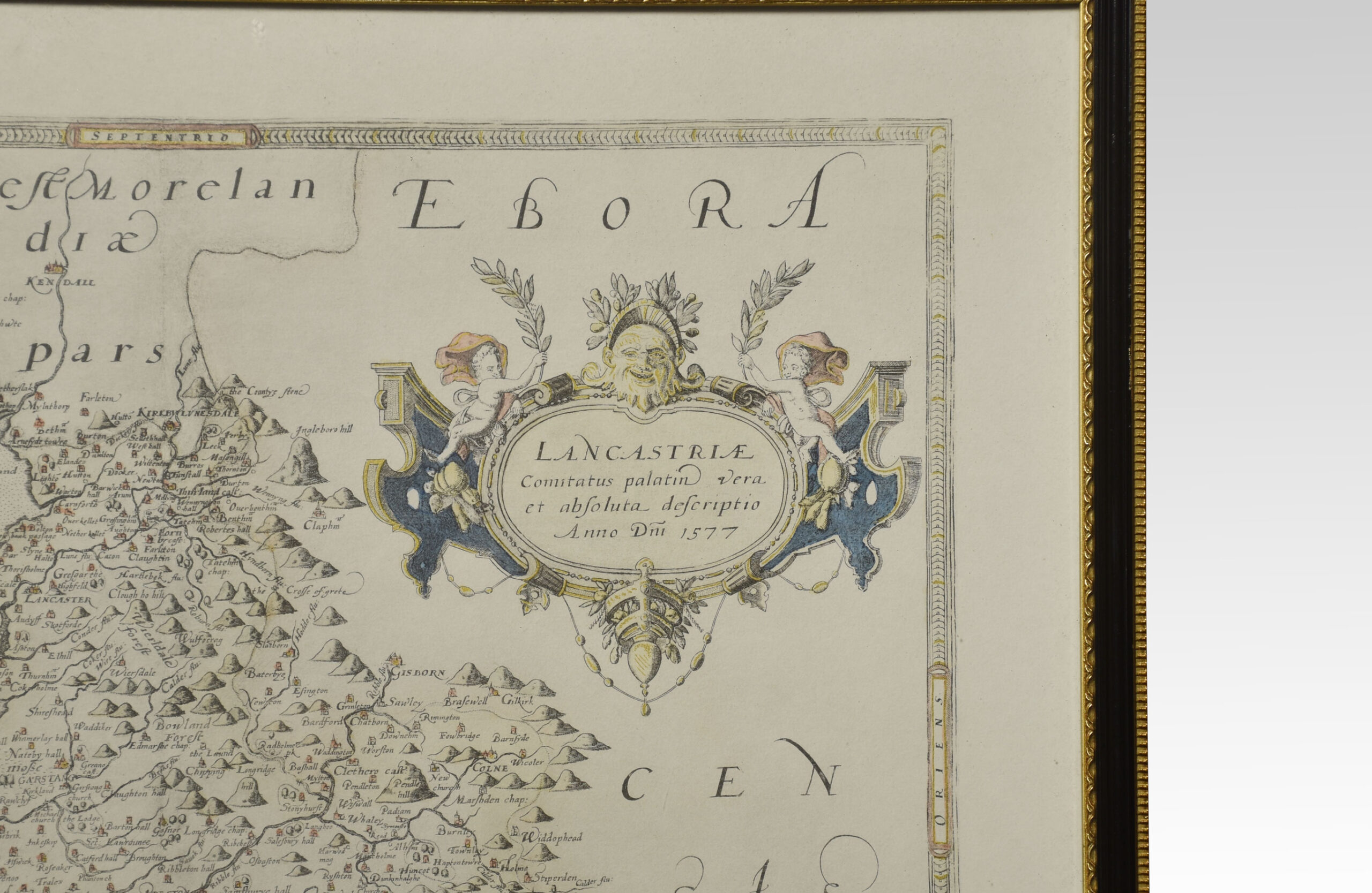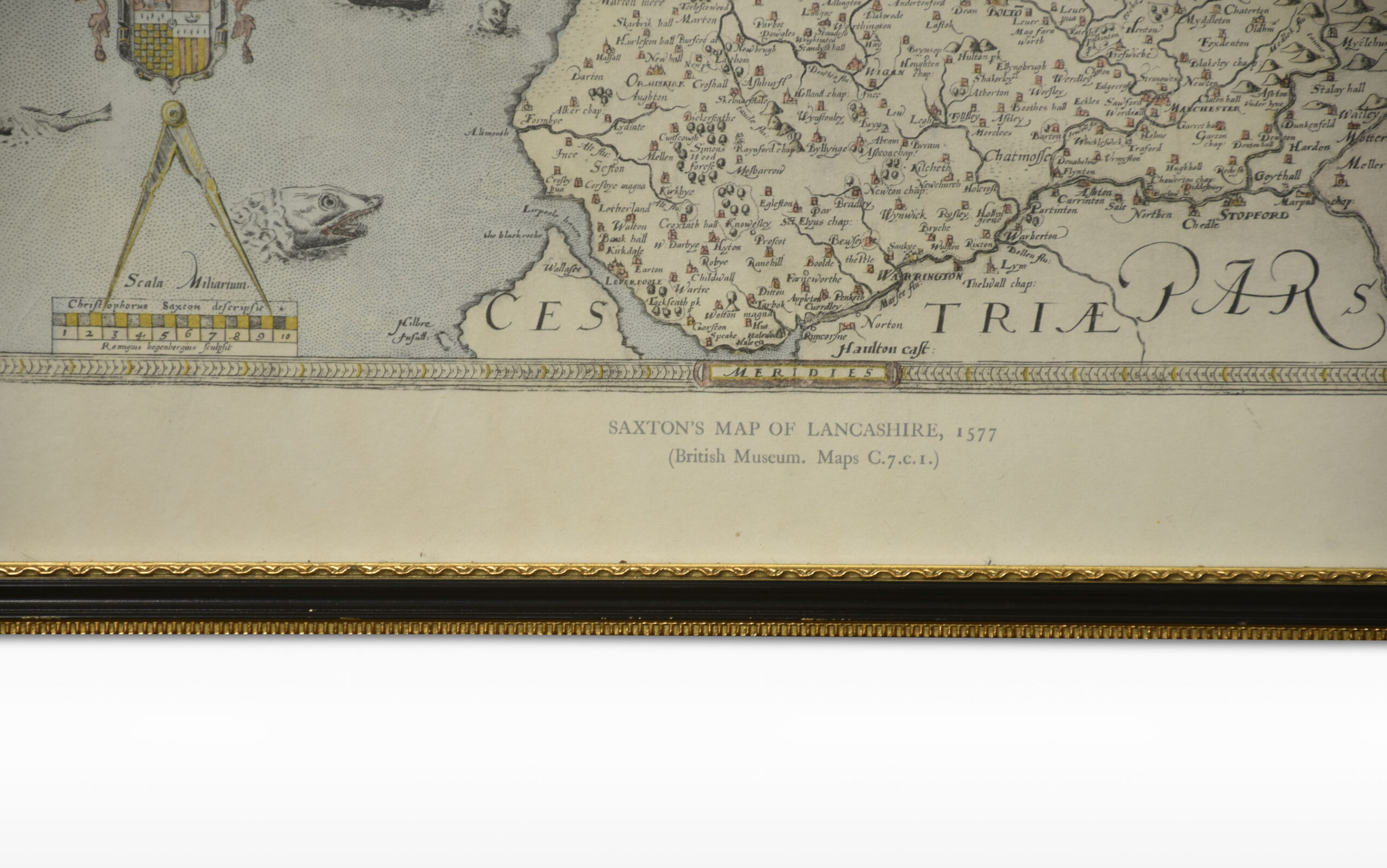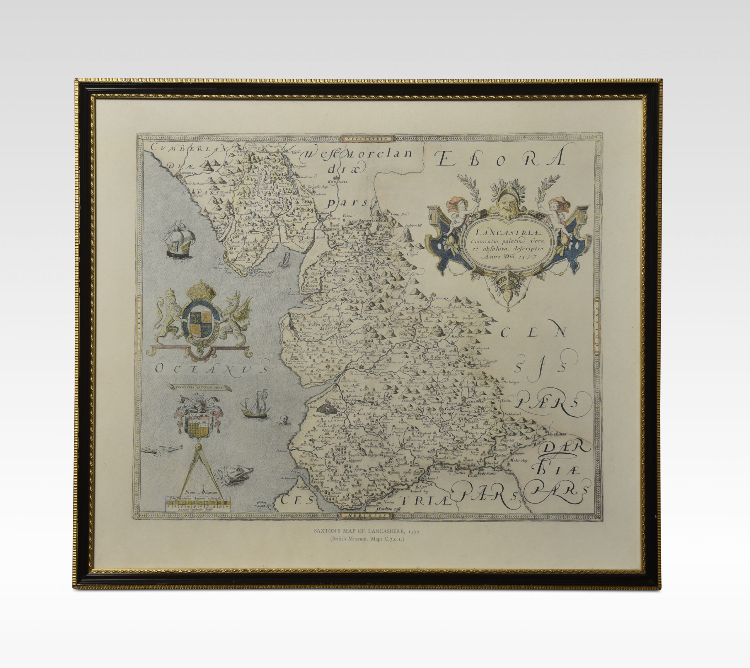 Saxton Map of Lancashire hand coloured. Encased in an ebonised frame.